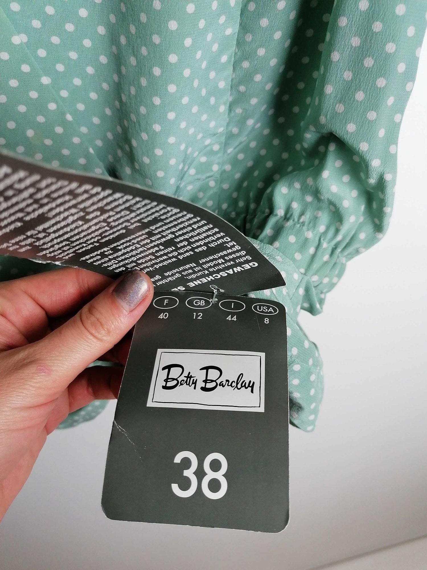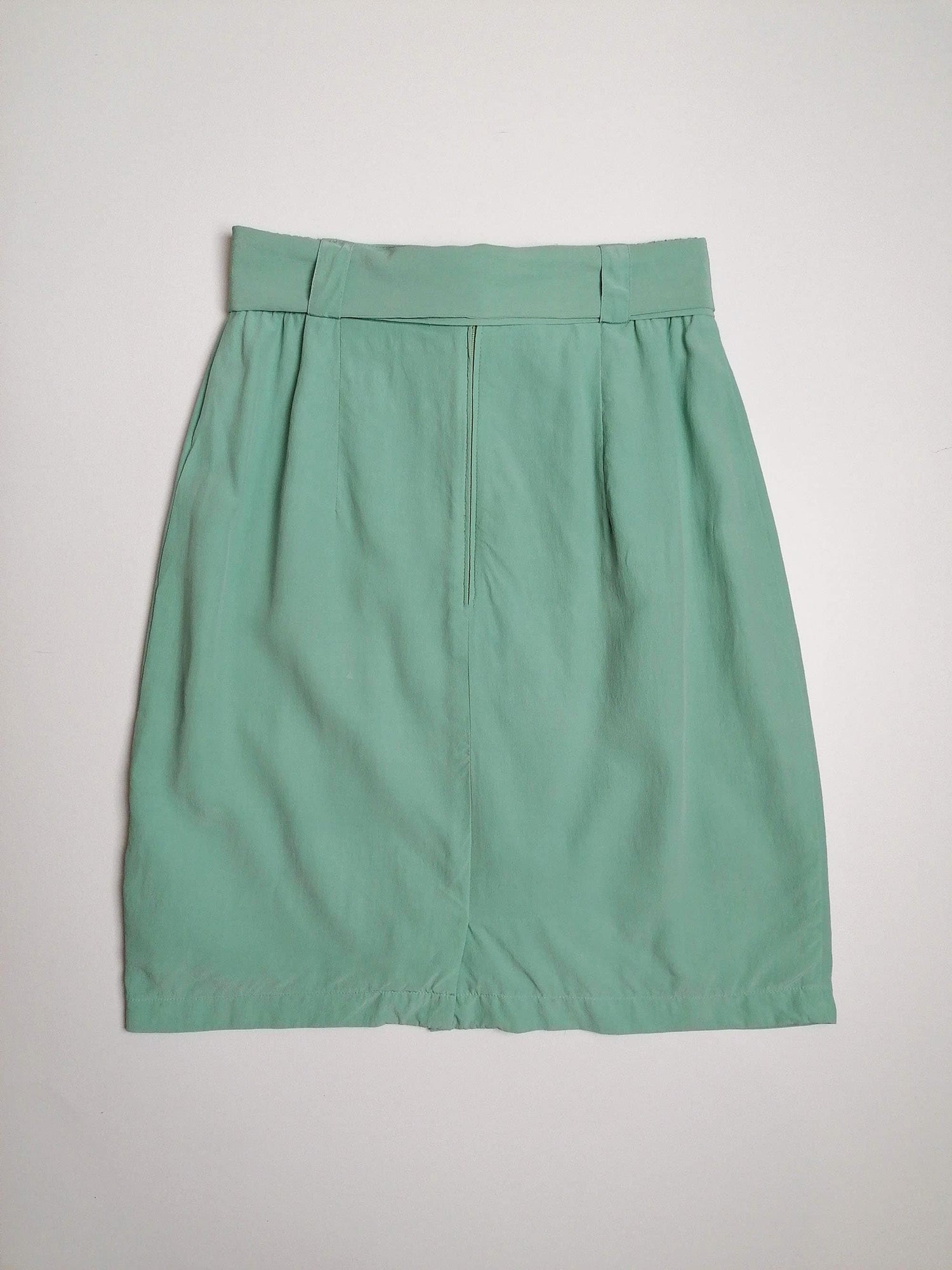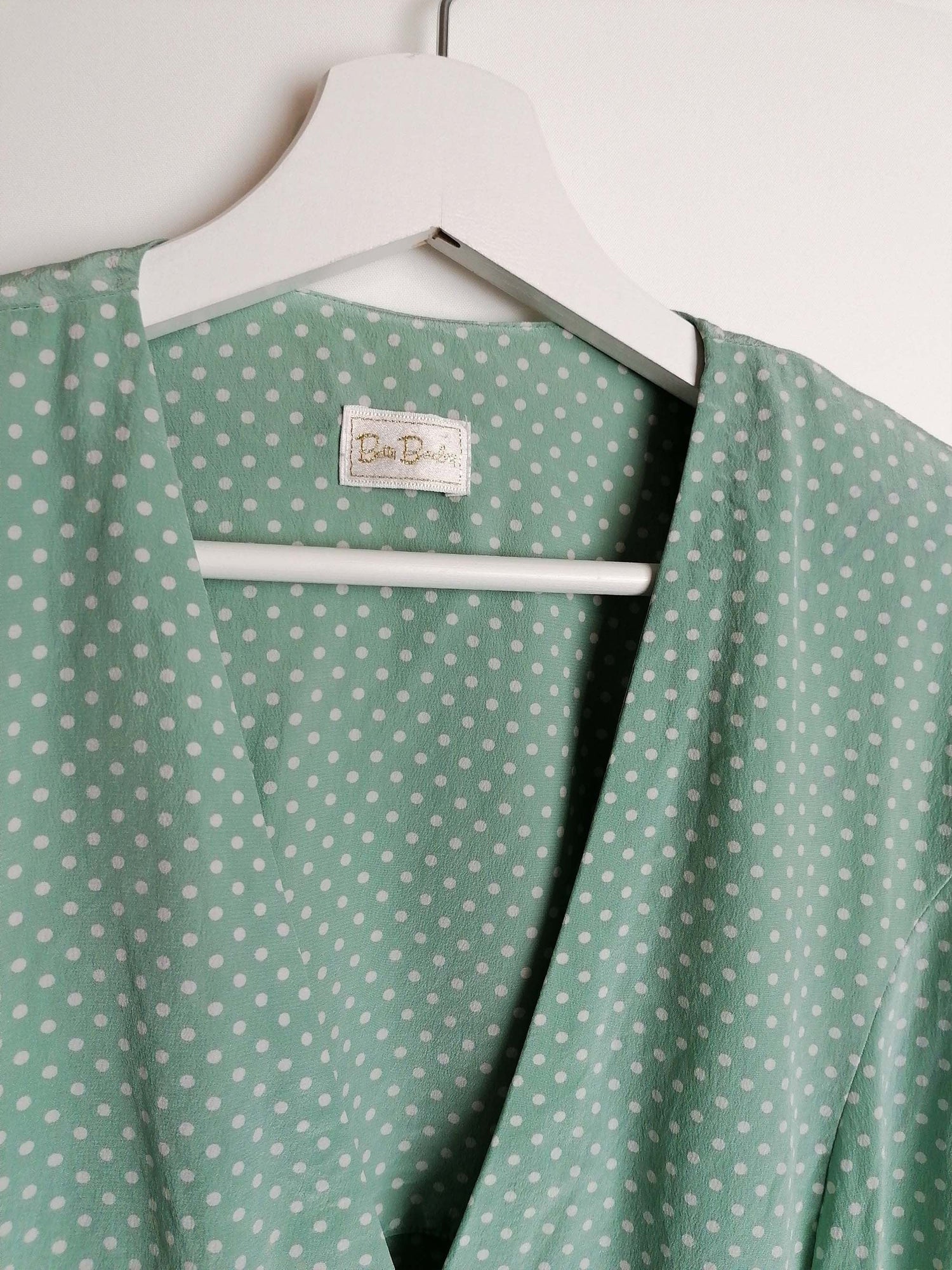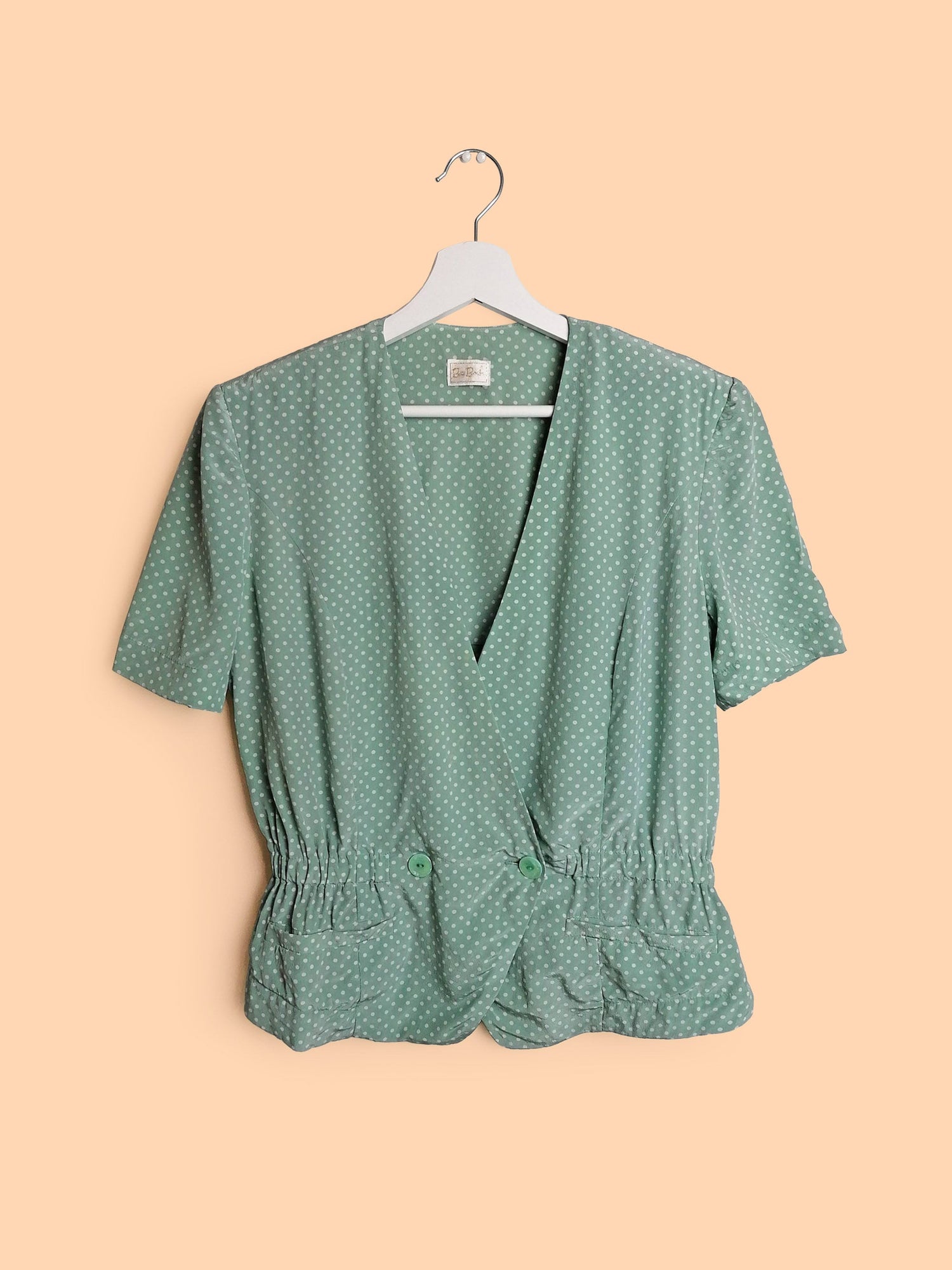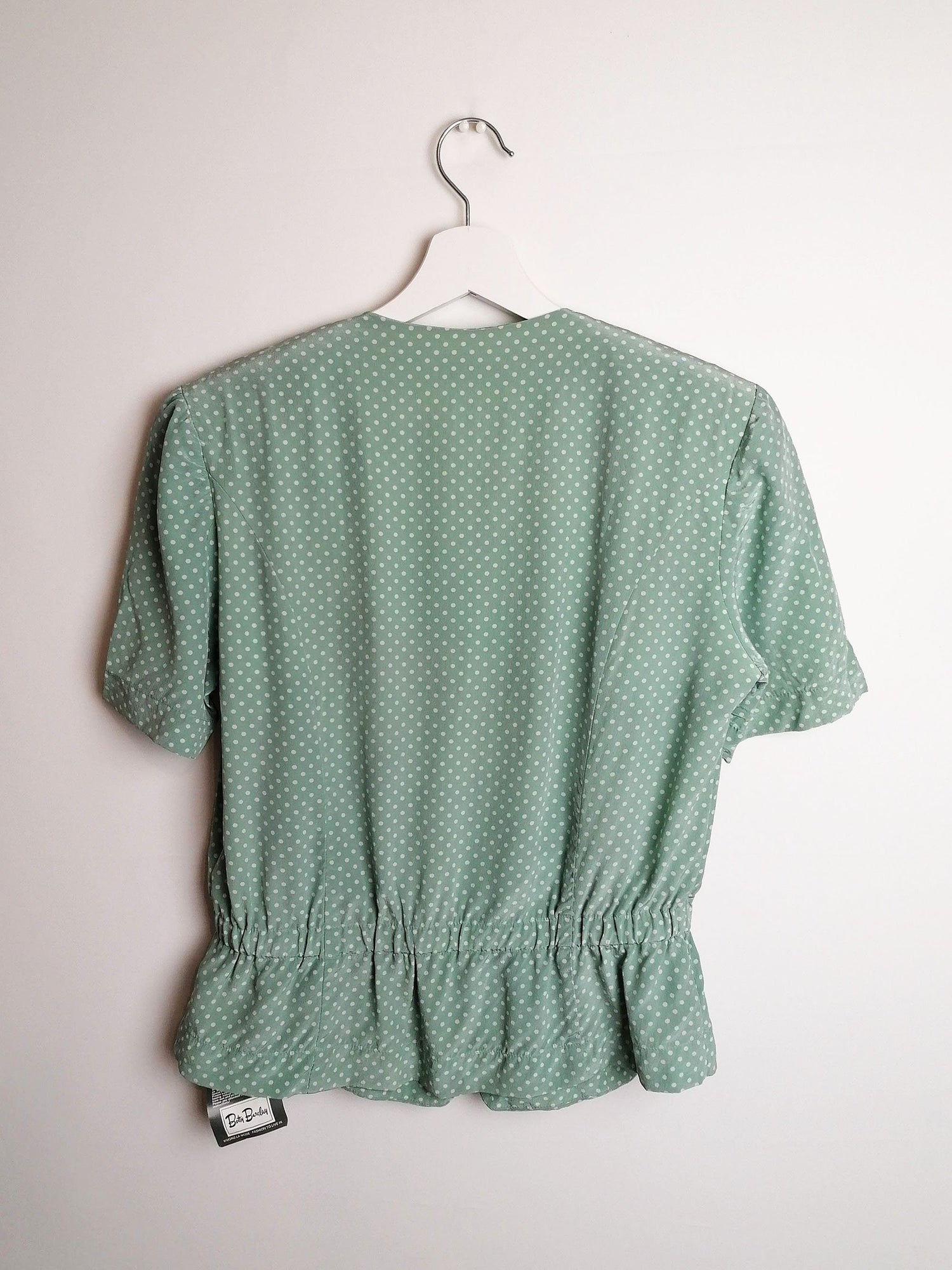 Stunning vintage 80's - 90's Betty Barclay 100% silk set, deadstock, tags still attached. Blazer is a gorgeous sea-foam green with white polka dots, shimmery buttons, skirt is solid. Top is a blazer, elastic waist, padded shoulders. Skirt is high waist, above the knee, has a fabric belt.