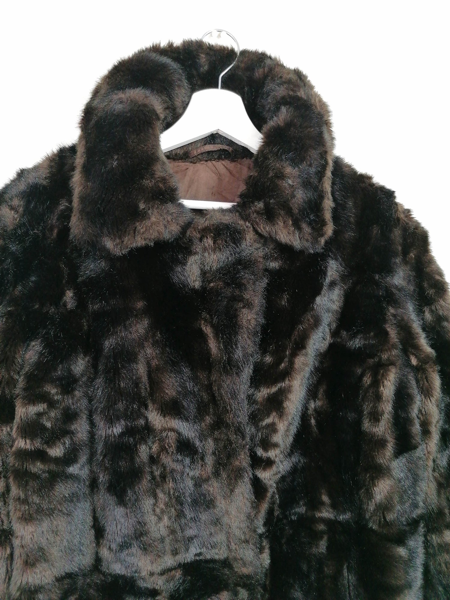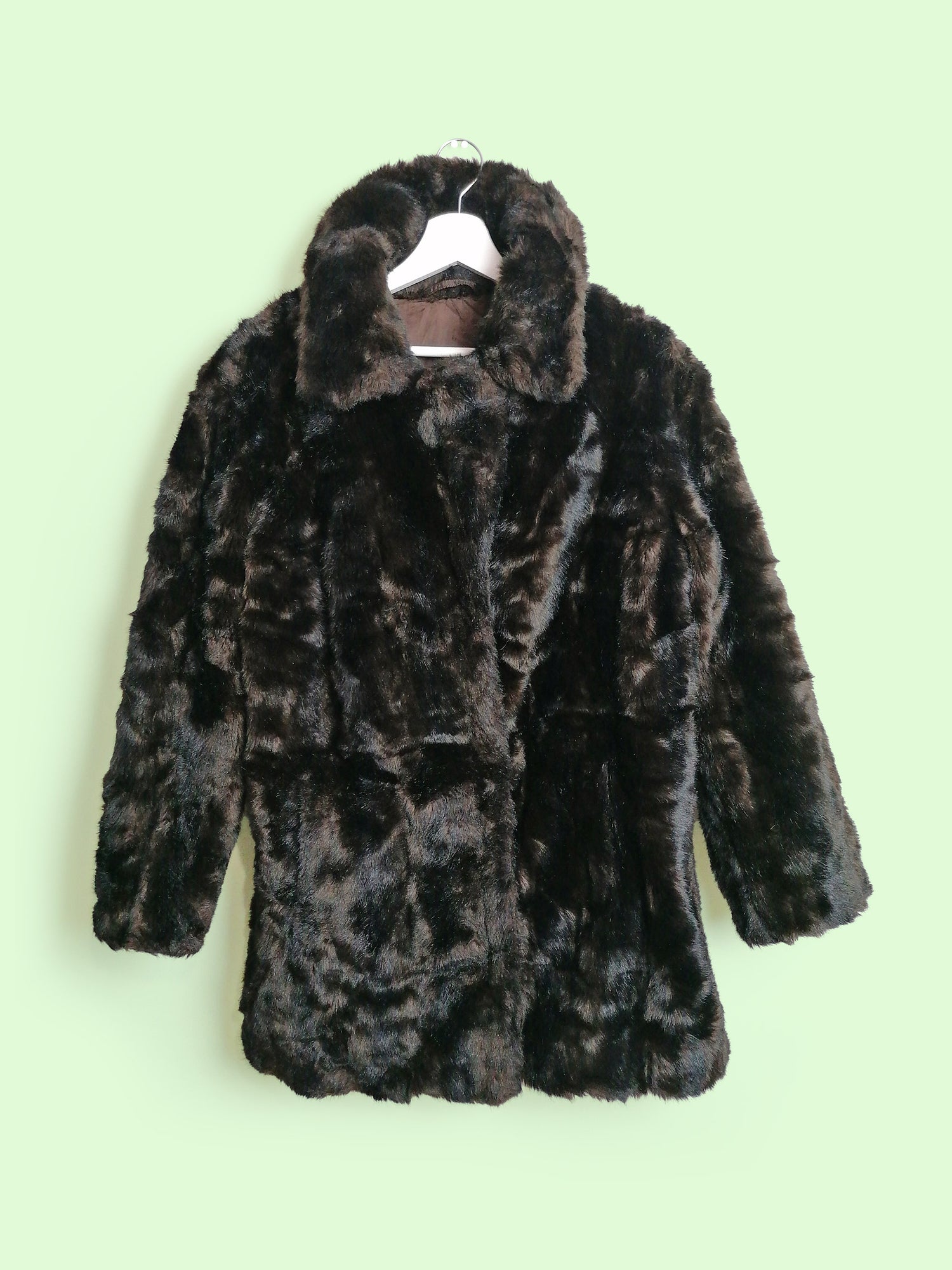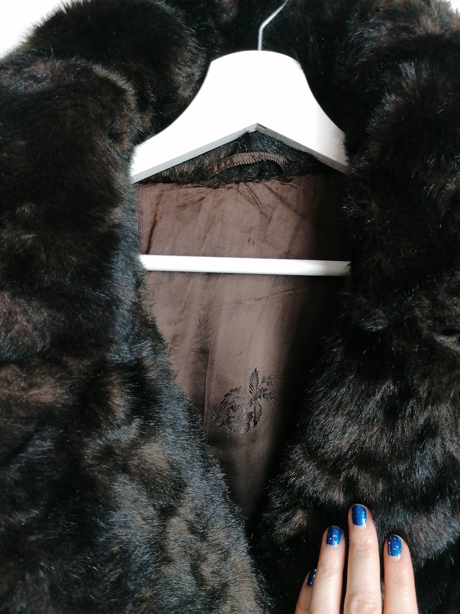 Stunning vintage 80's 90's faux fur coat, dark brown, hook-and-eye closure.