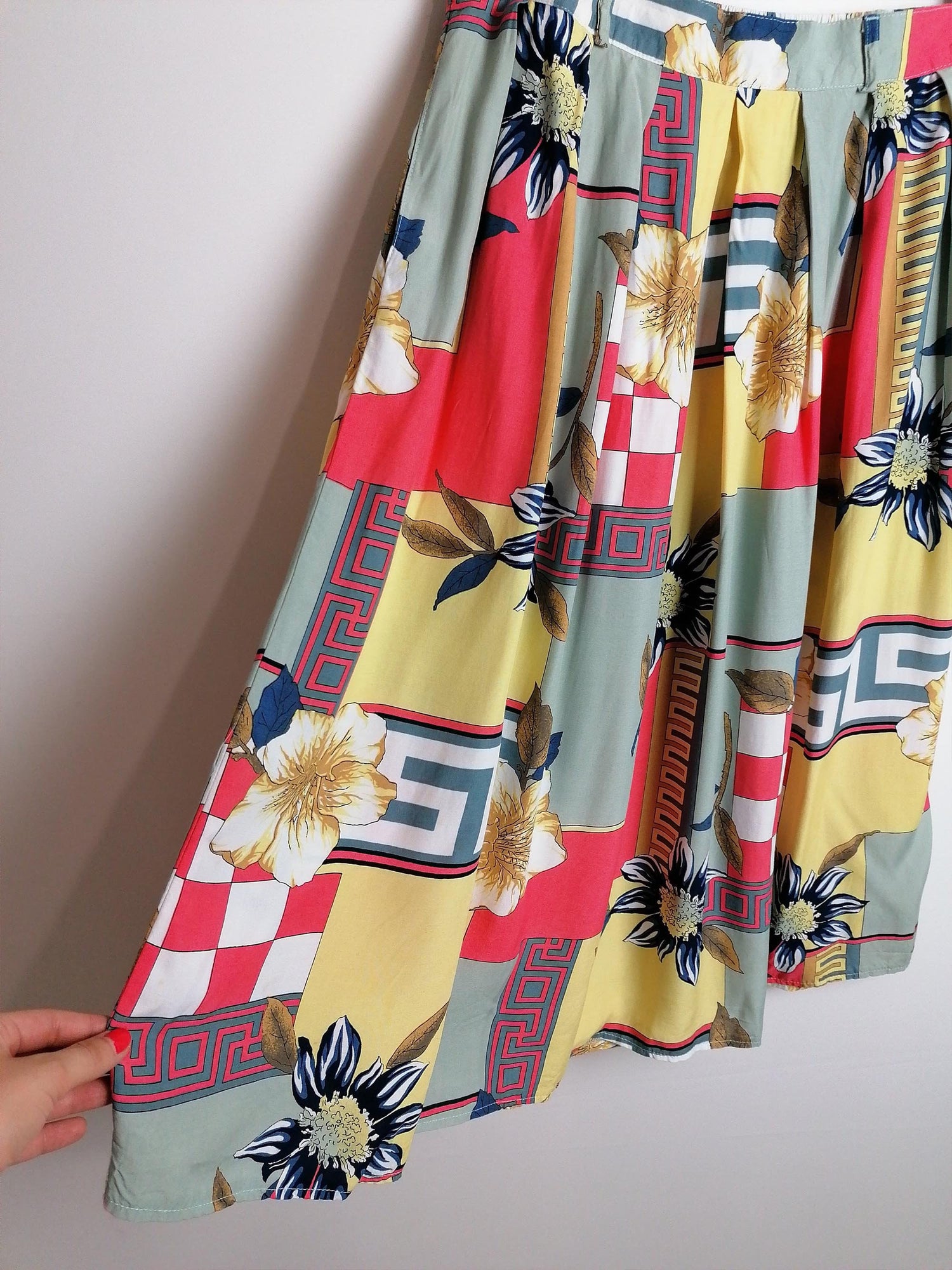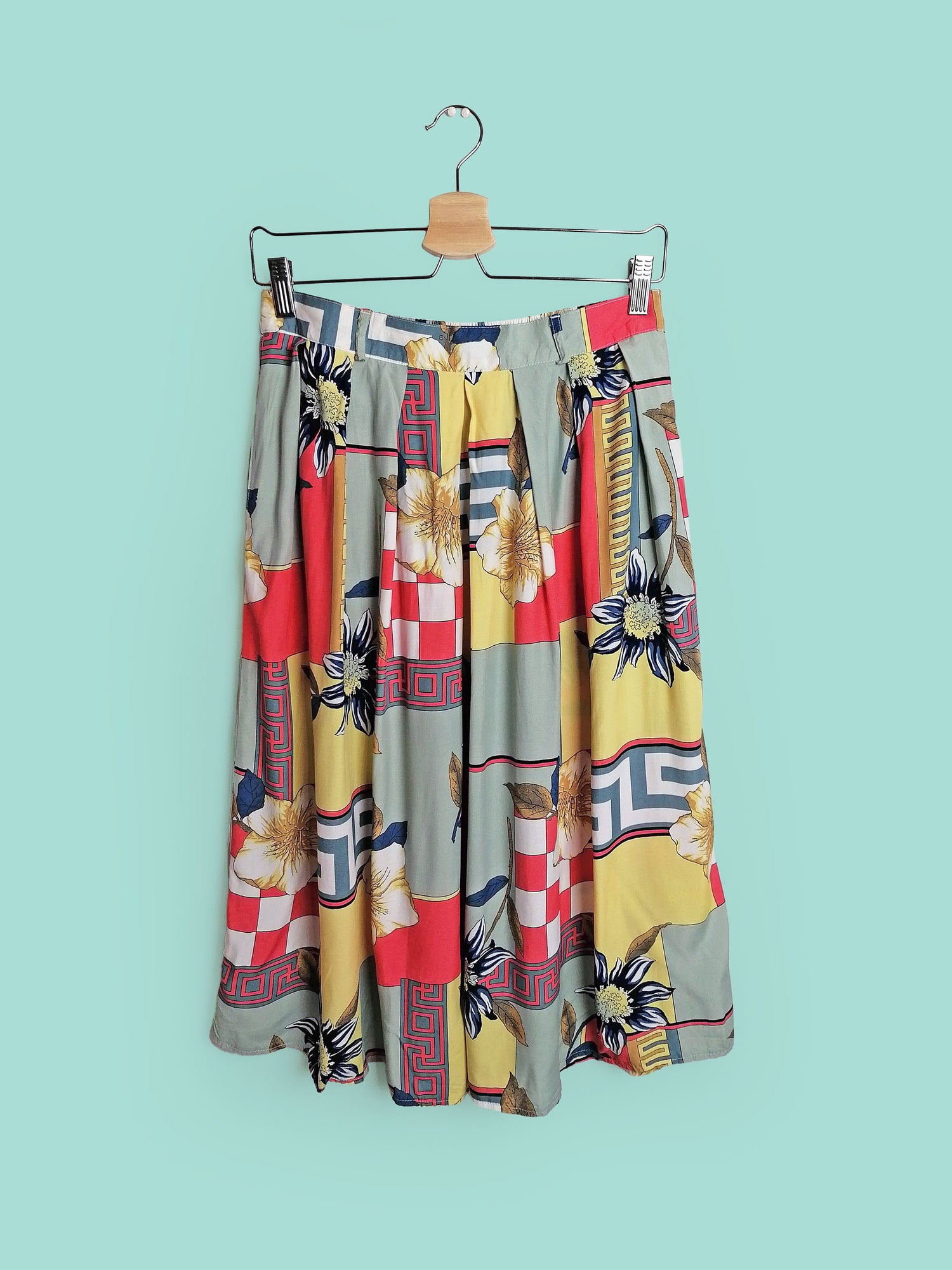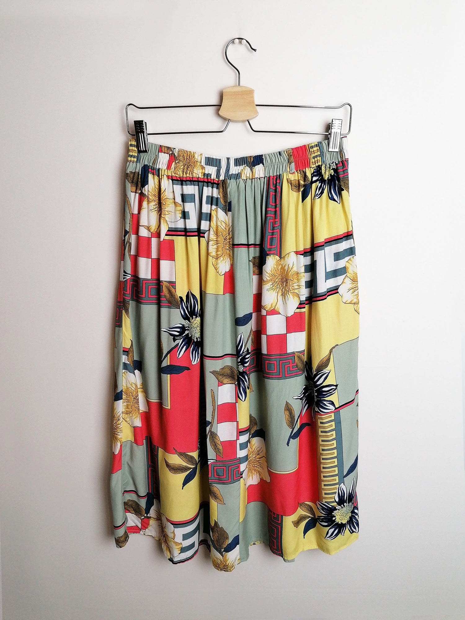 Gorgeous vintage 80's 90's scarf print skirt, light viscose, side pockets, partially elastic waist.
