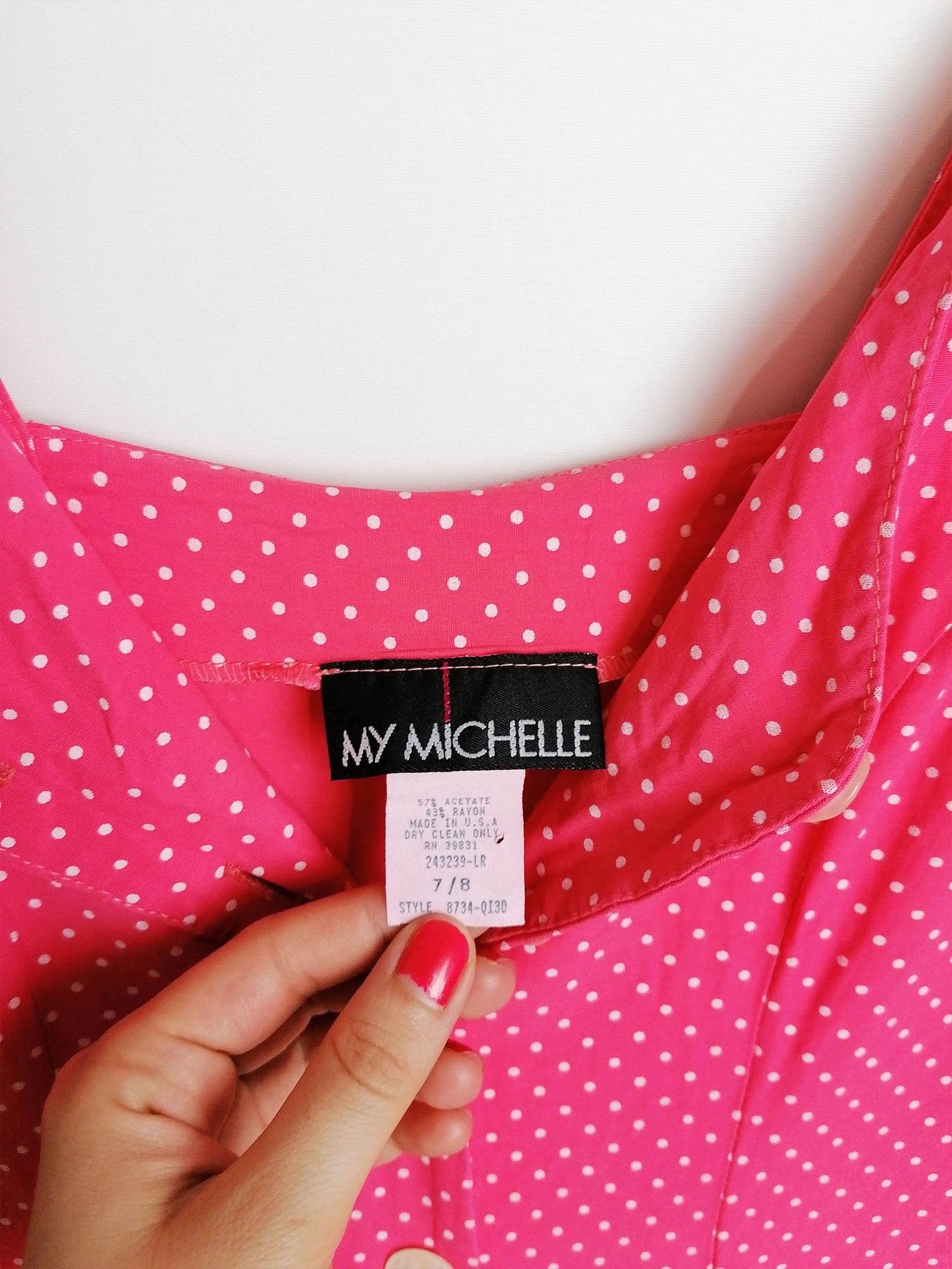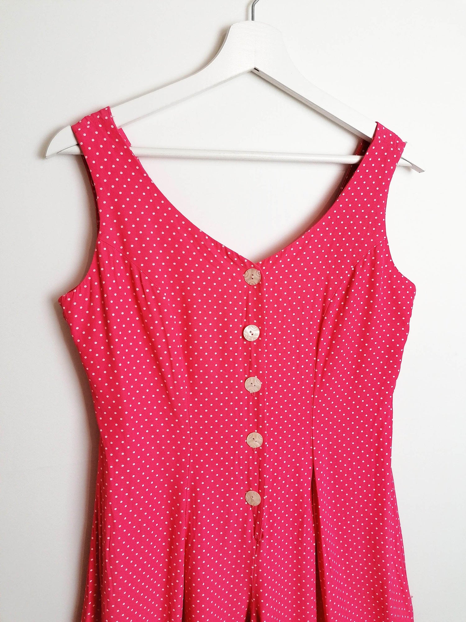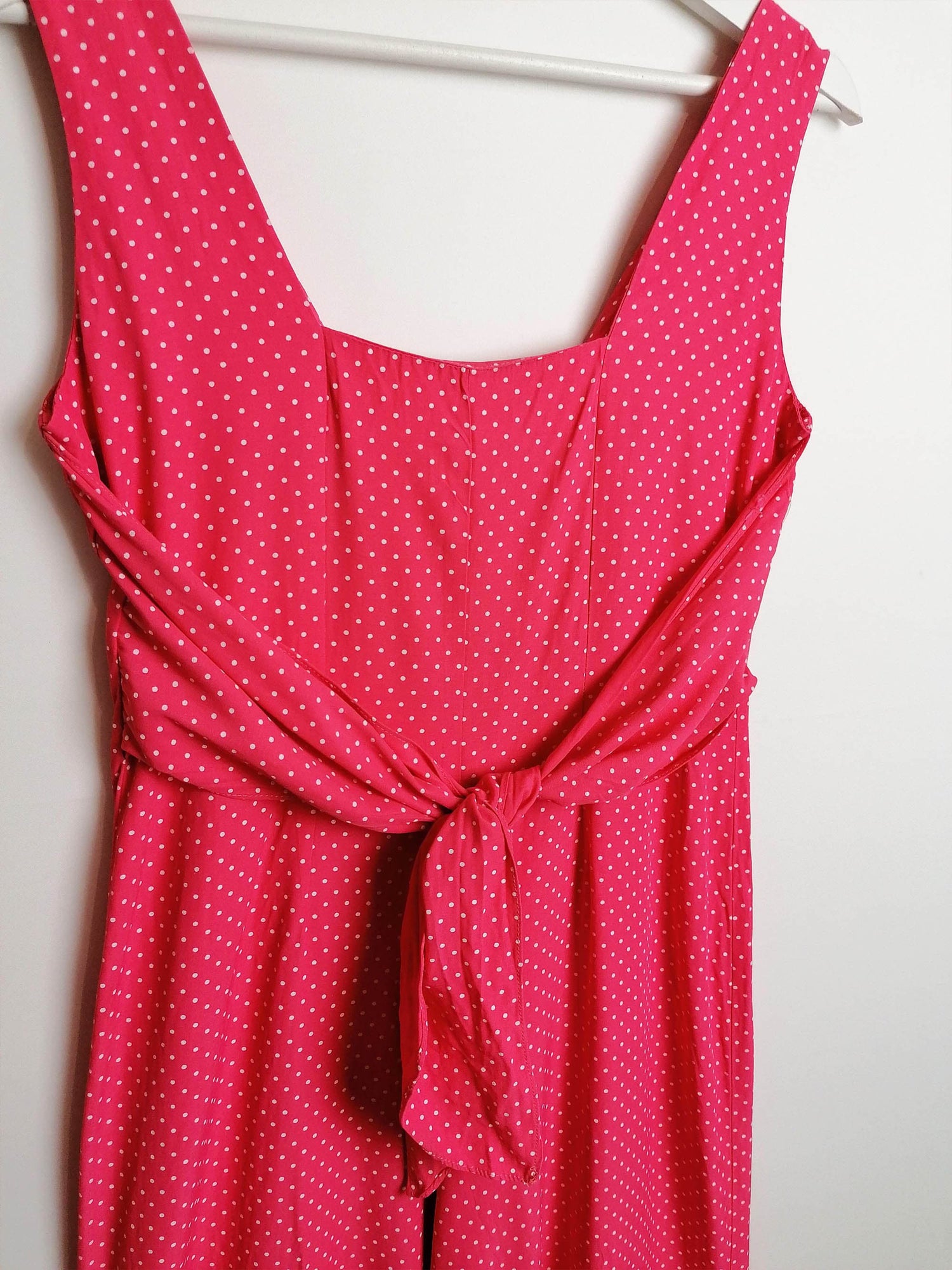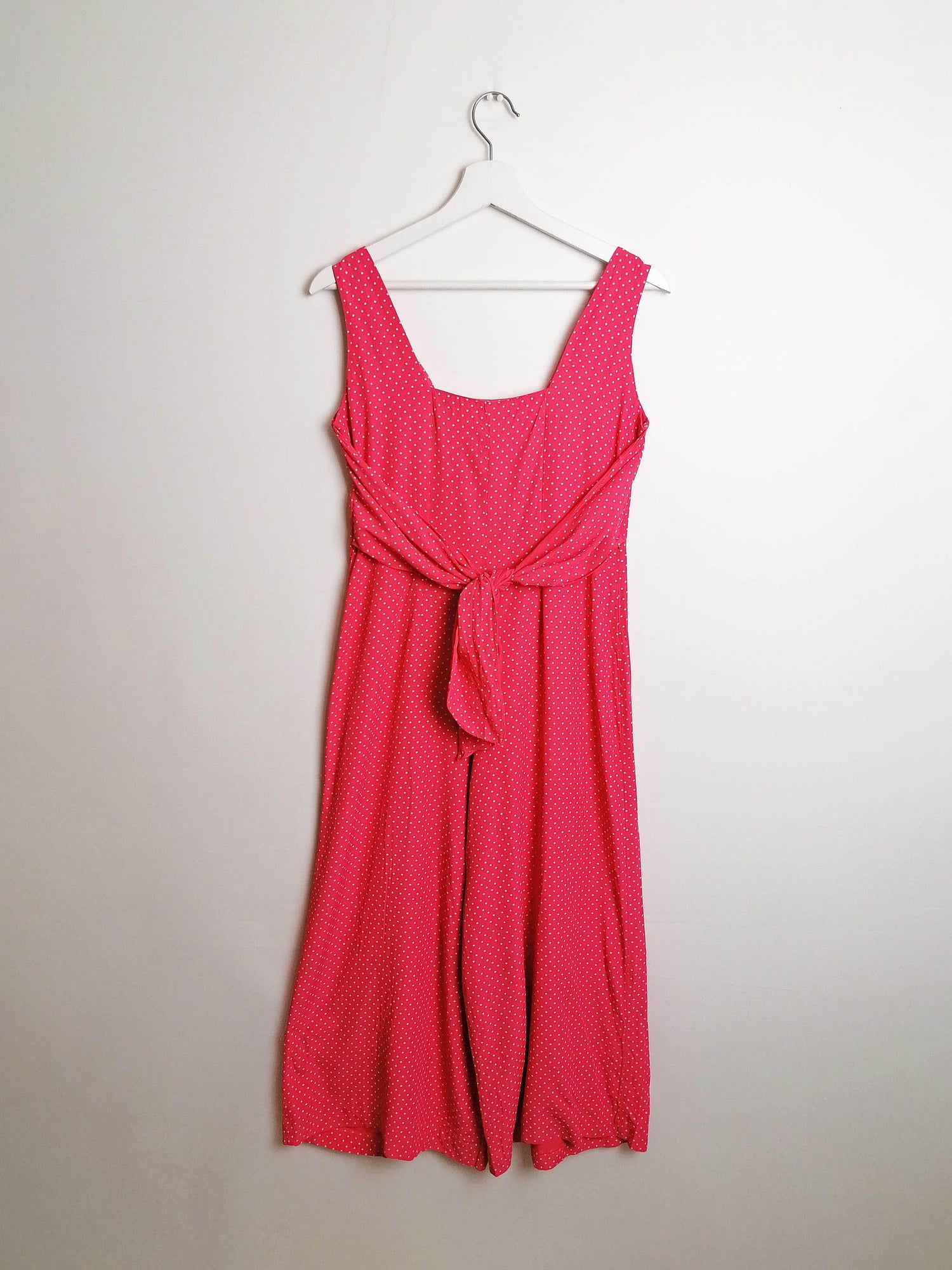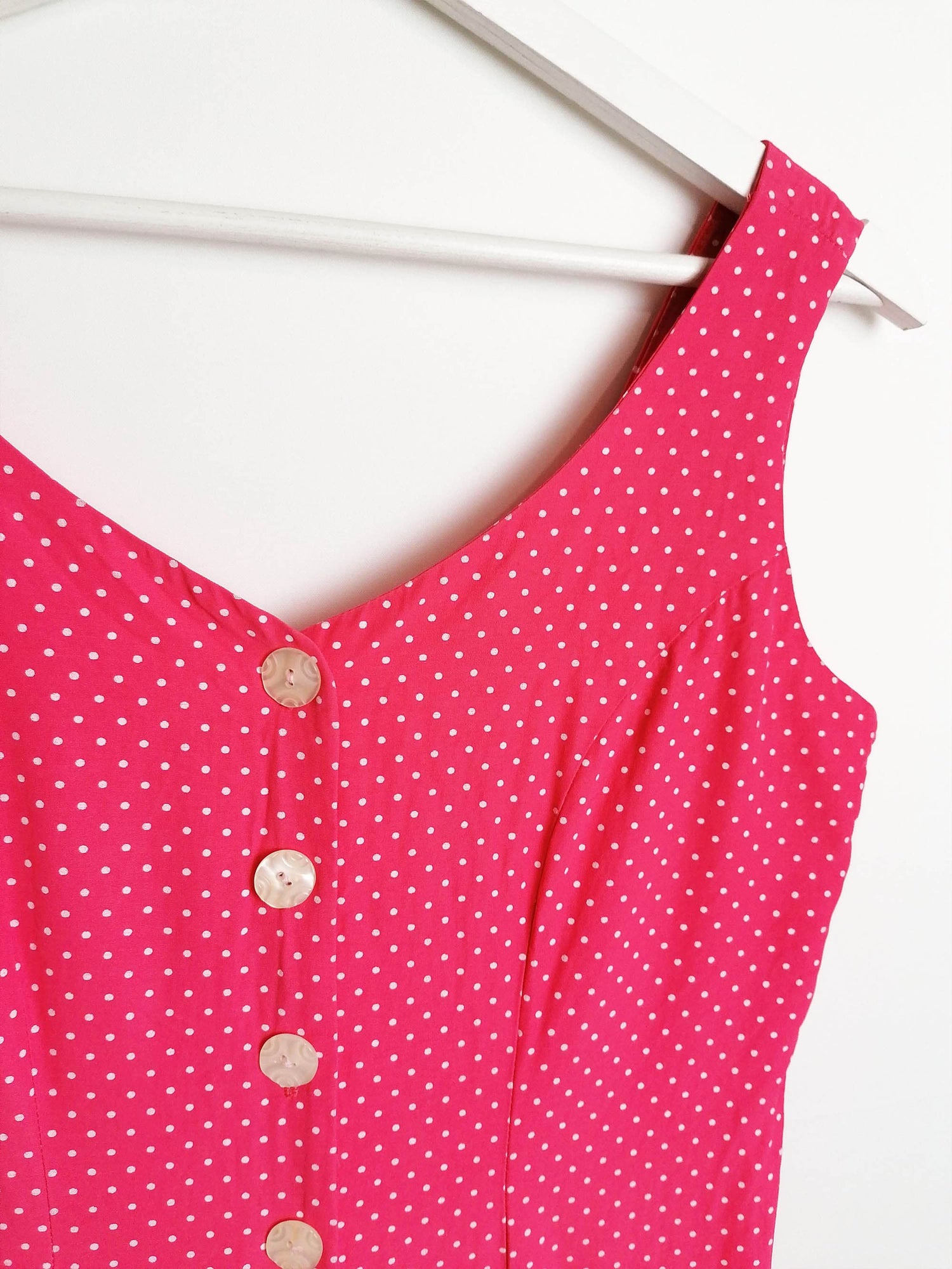 The cutest vintage 90's romper, tiny polka dots on vibrant pink. Front mother-of-pearl buttons, tie-up detail in the back. Brand My Michelle, made in USA.