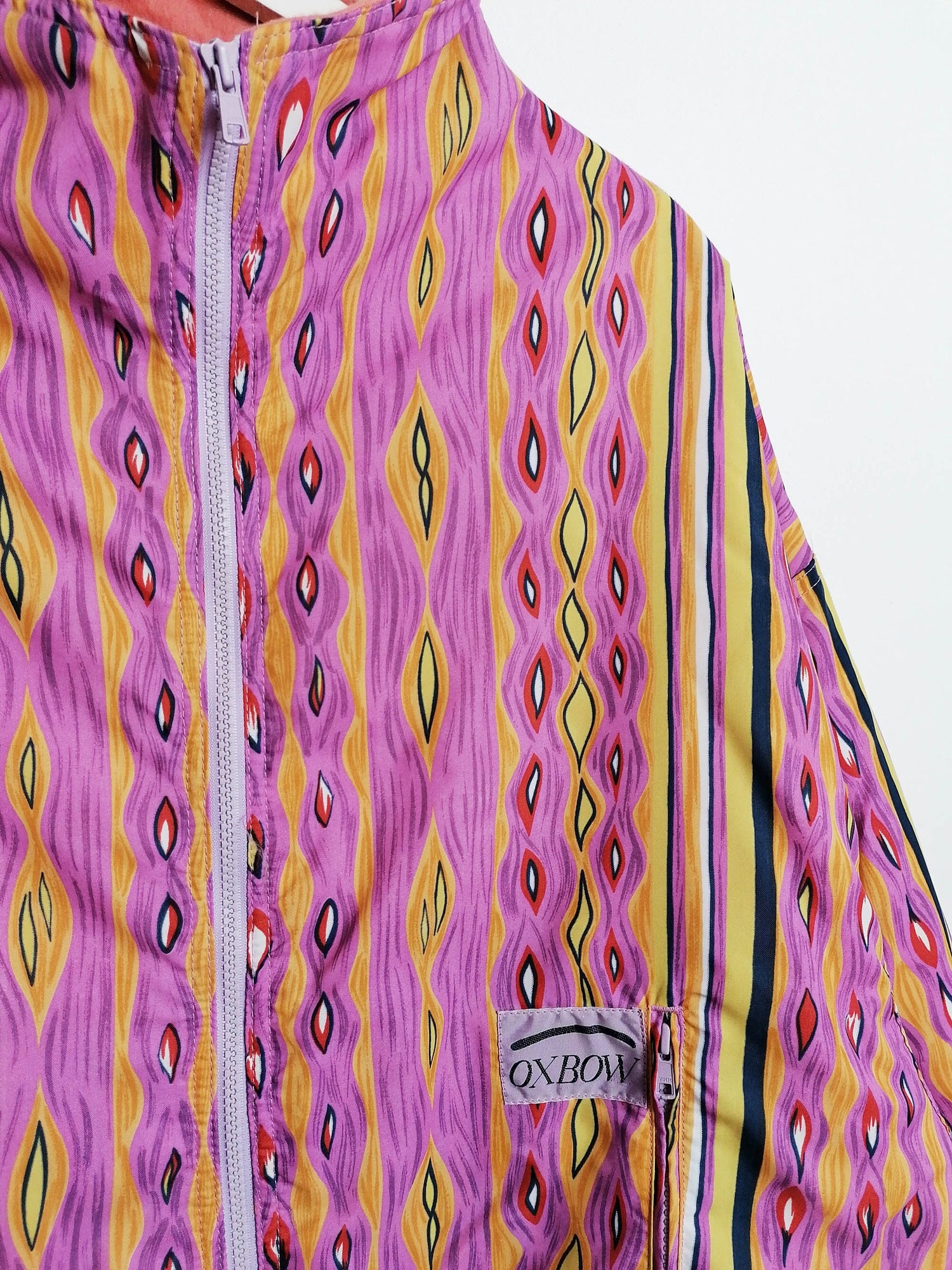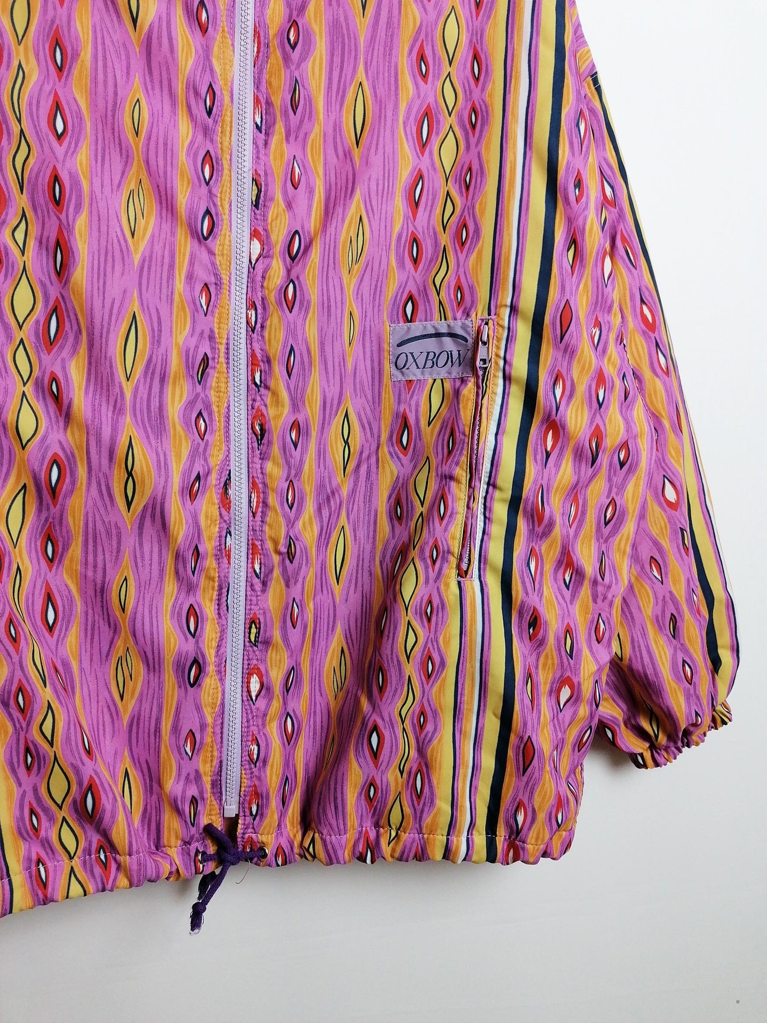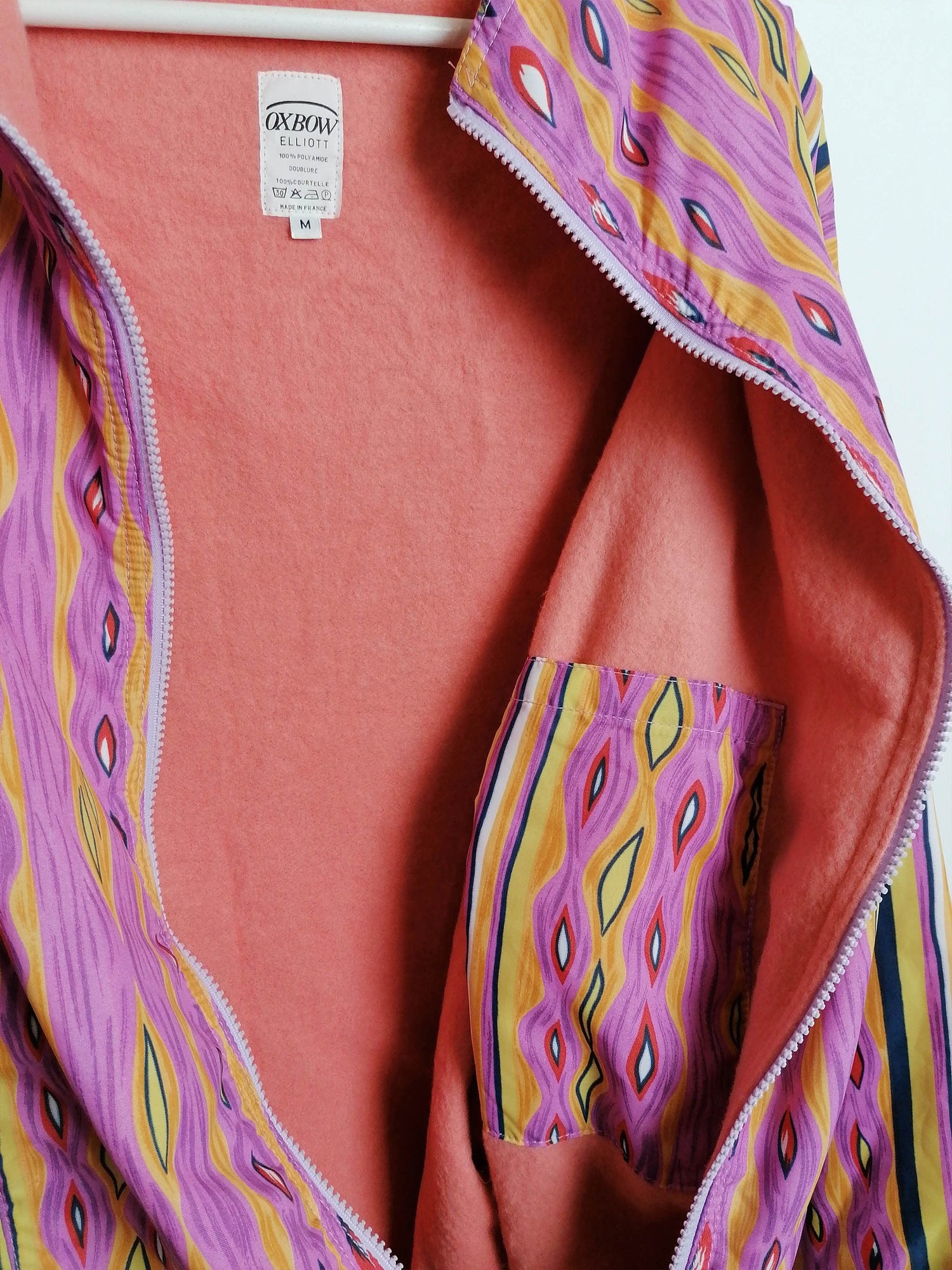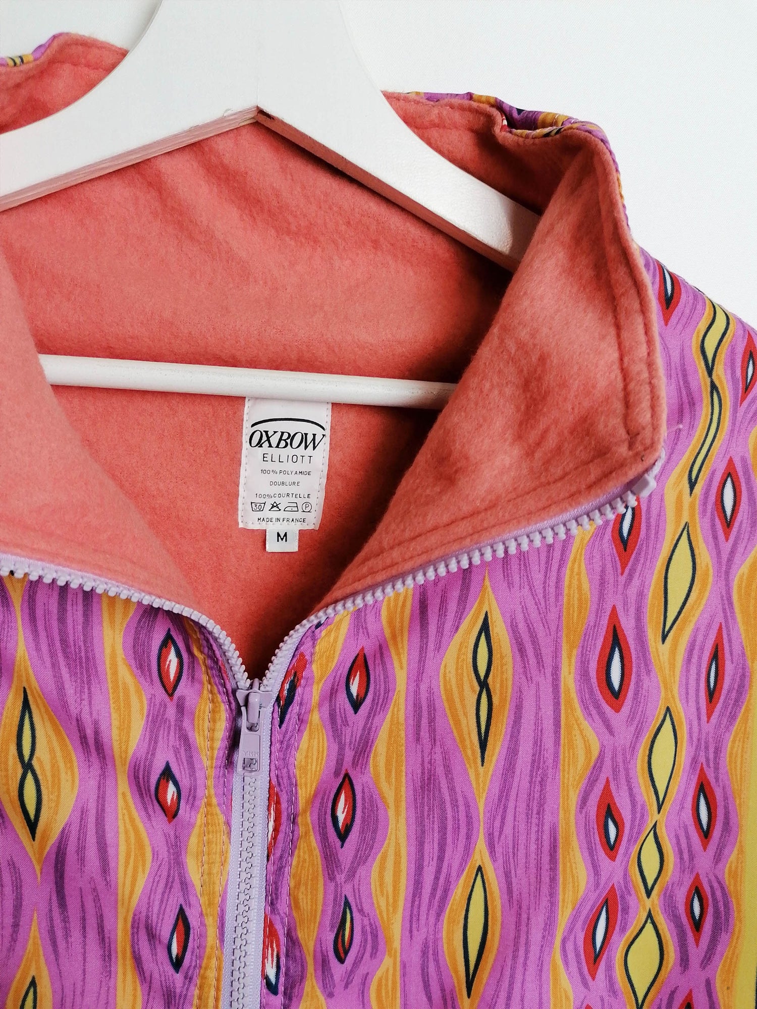 Absolutely stunning vintage 80's 90's OXBOW Surfwear lightweight jacket, fleece lining in coral pink. Wavy 'Elliottr' print.