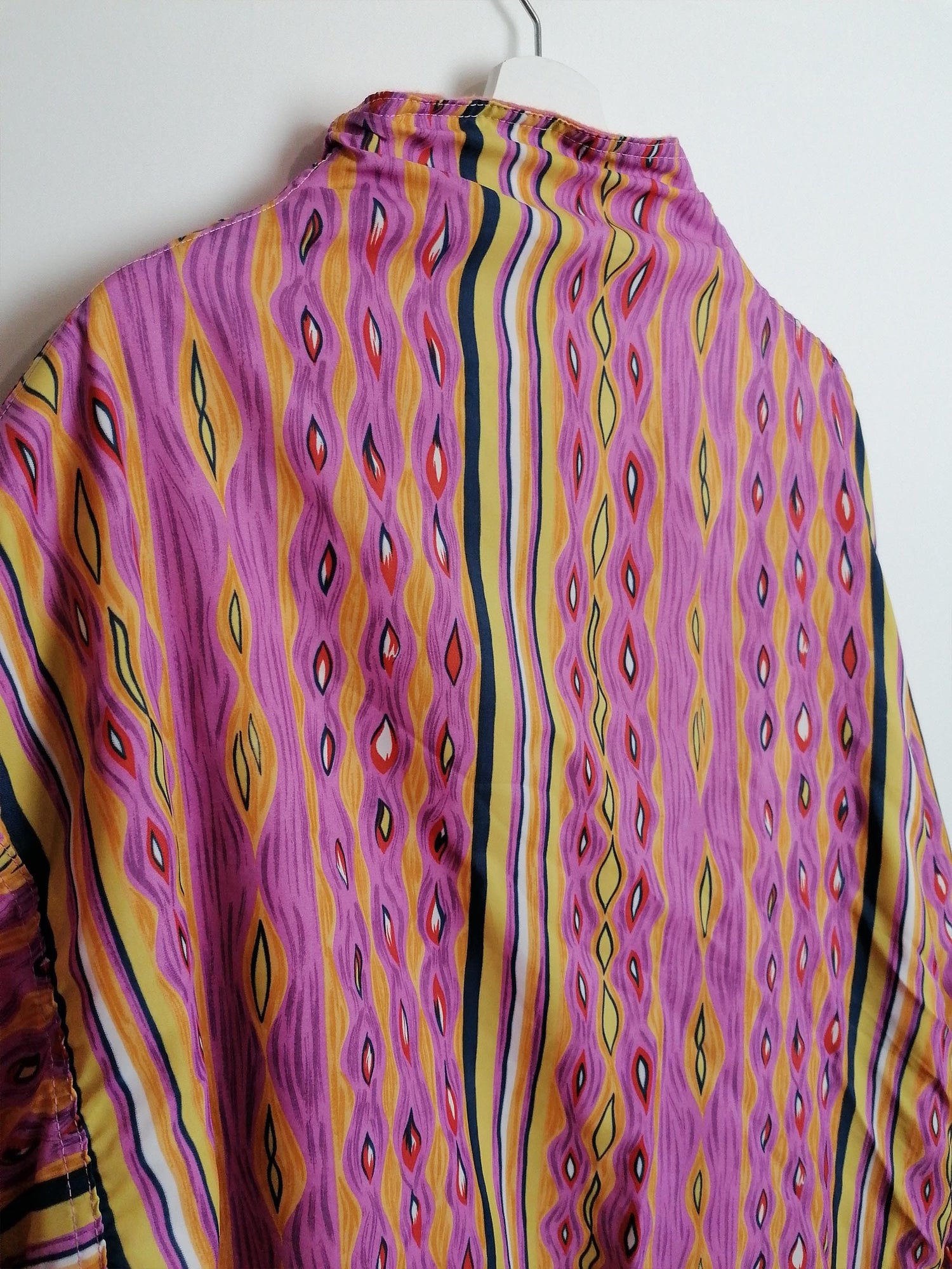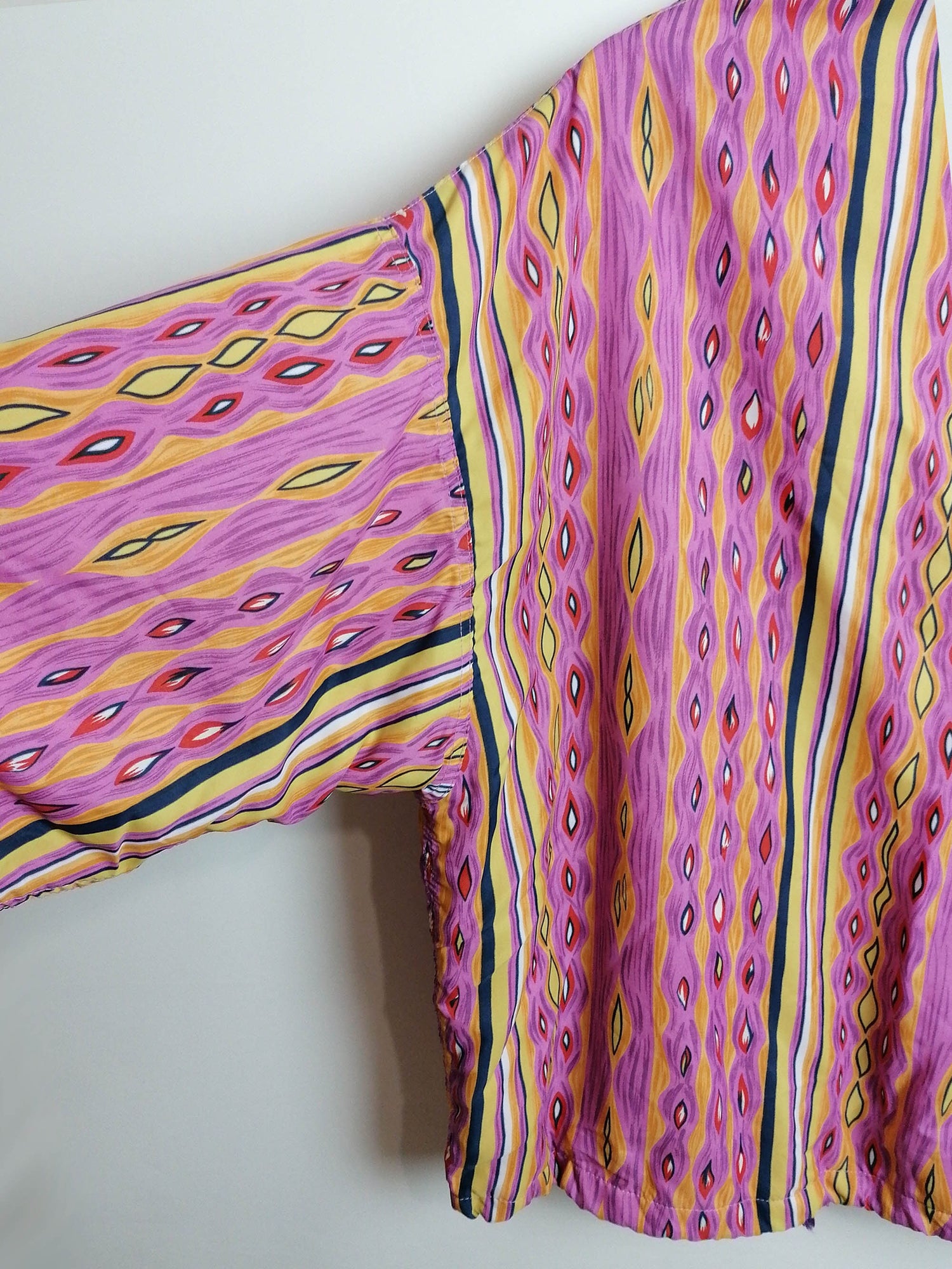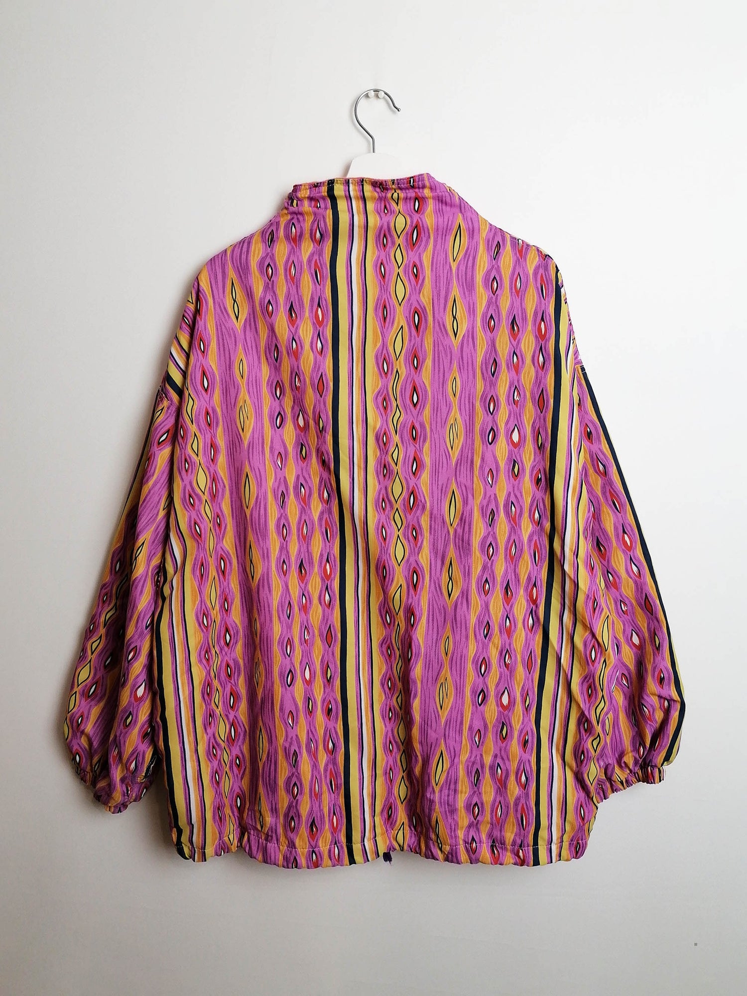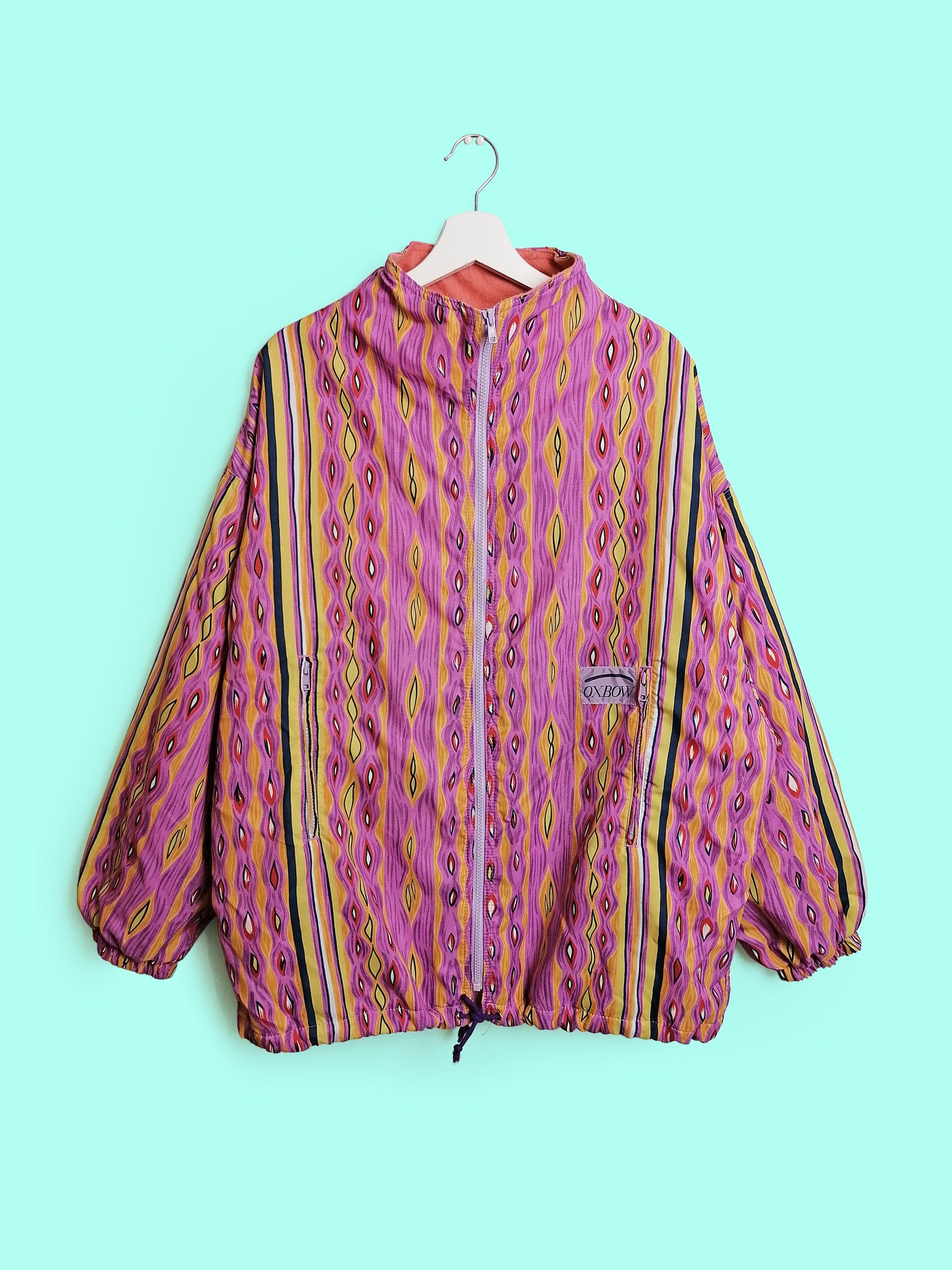 Absolutely stunning vintage 80's 90's OXBOW Surfwear lightweight jacket, fleece lining in coral pink. Wavy 'Elliottr' print.