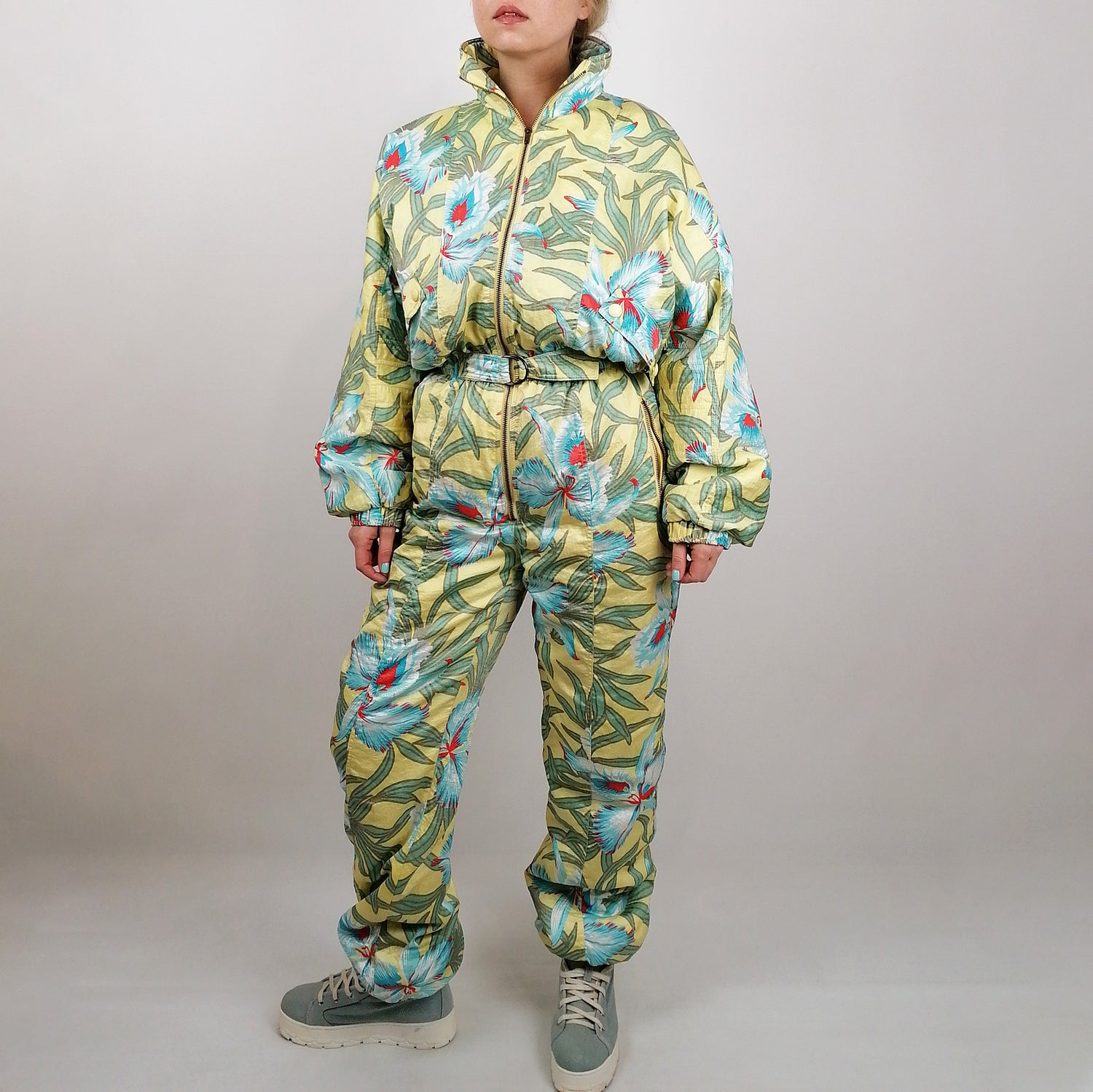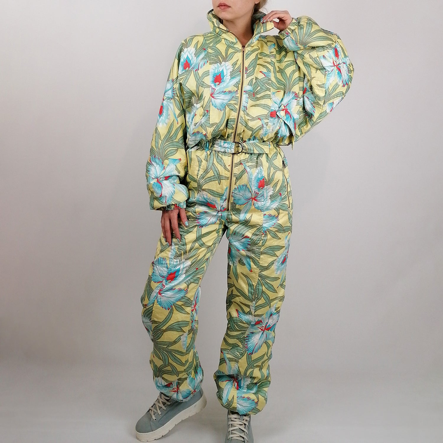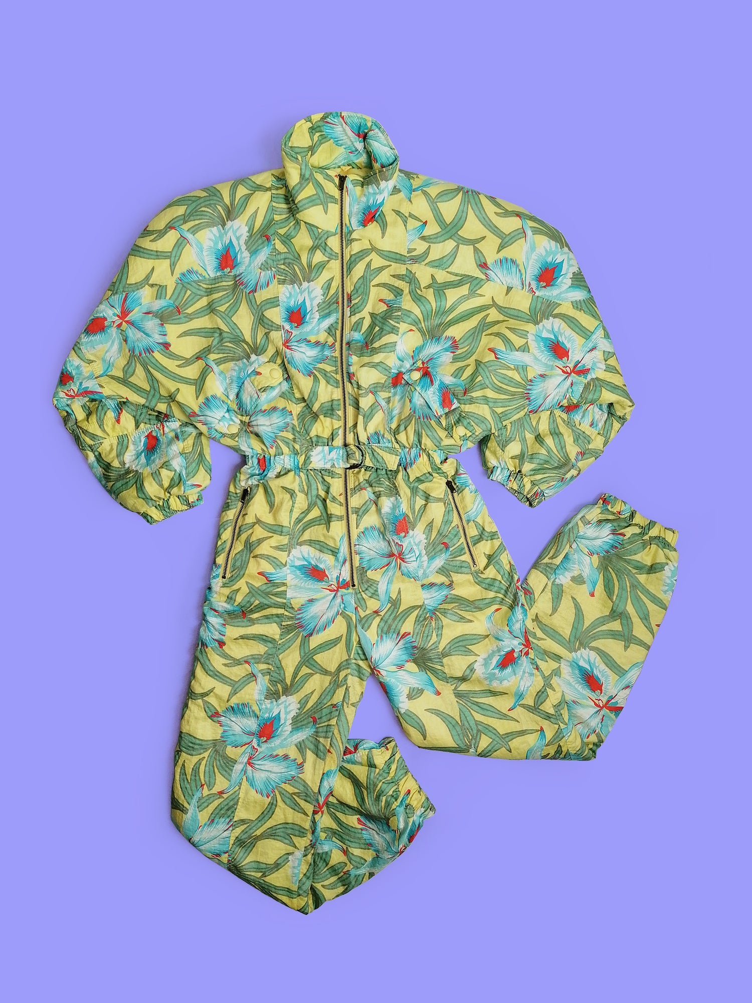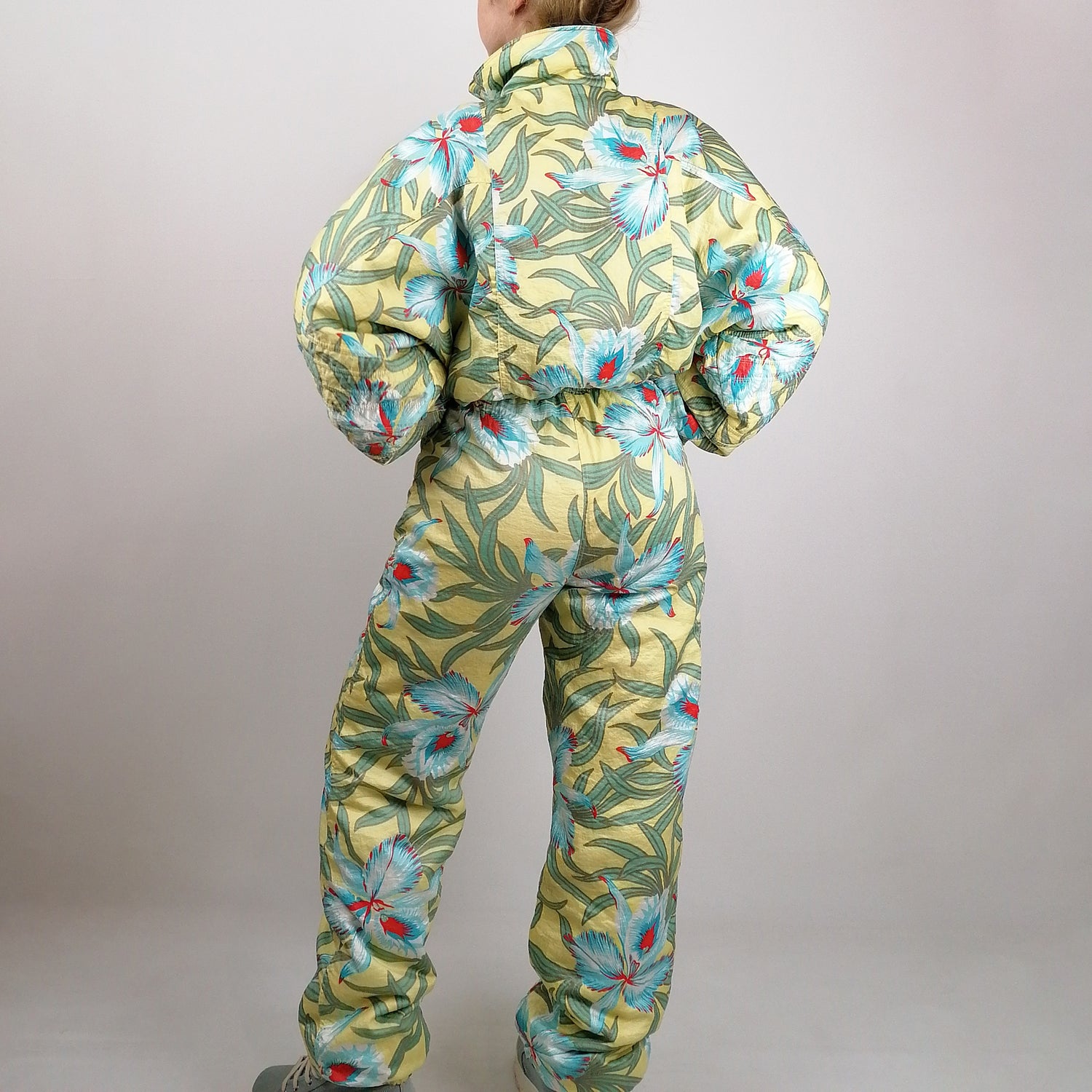 Gorgeous vintage 80's 90's women's ski overalls, beautiful shiny lime yellow, tropical flowers print. Made in Italy.