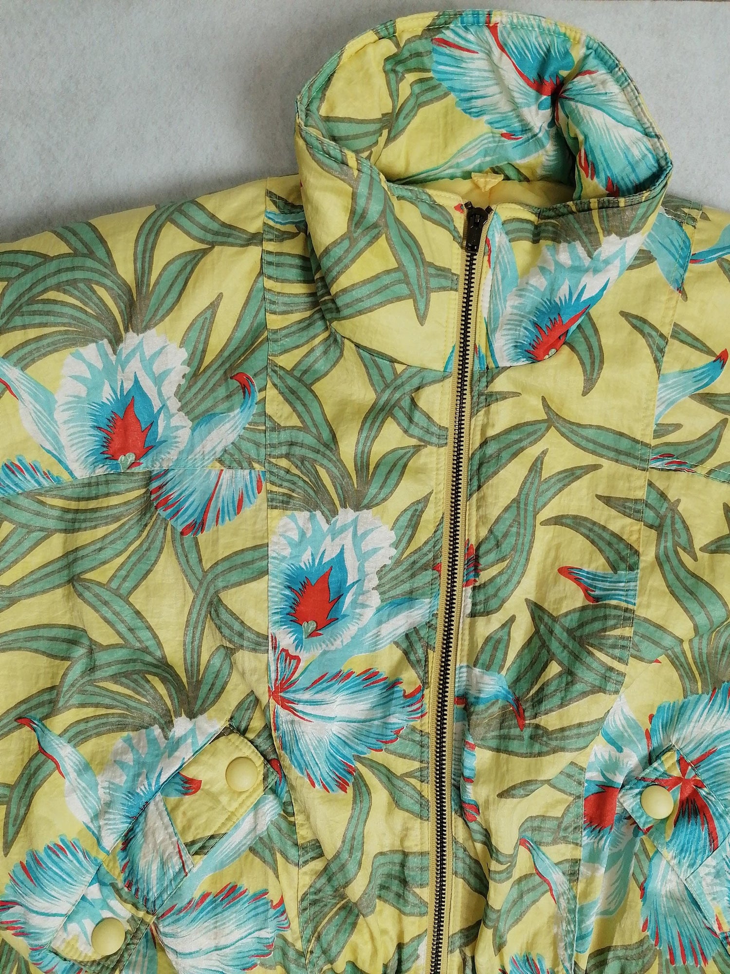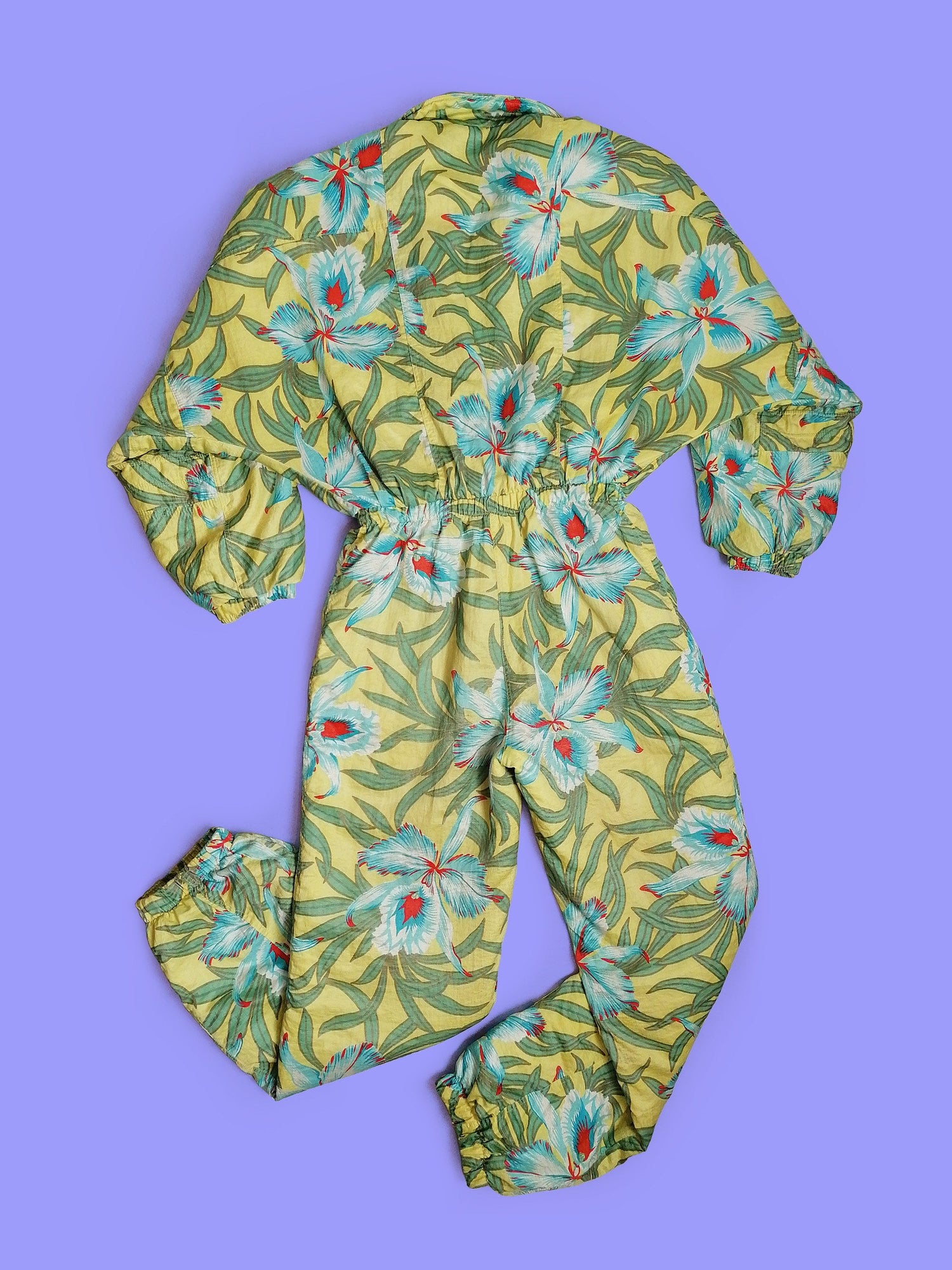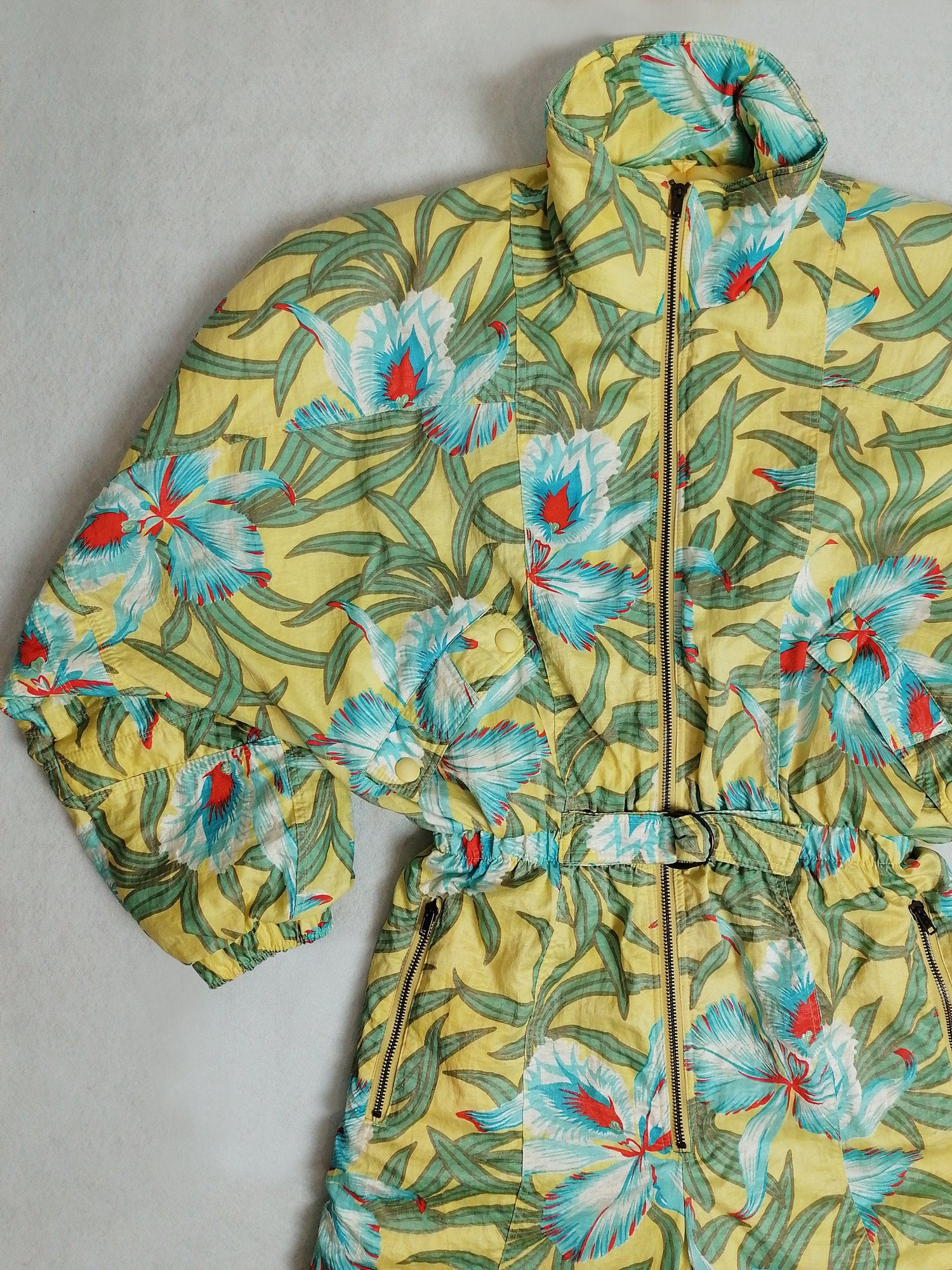 Gorgeous vintage 80's 90's women's ski overalls, beautiful shiny lime yellow, tropical flowers print. Made in Italy.