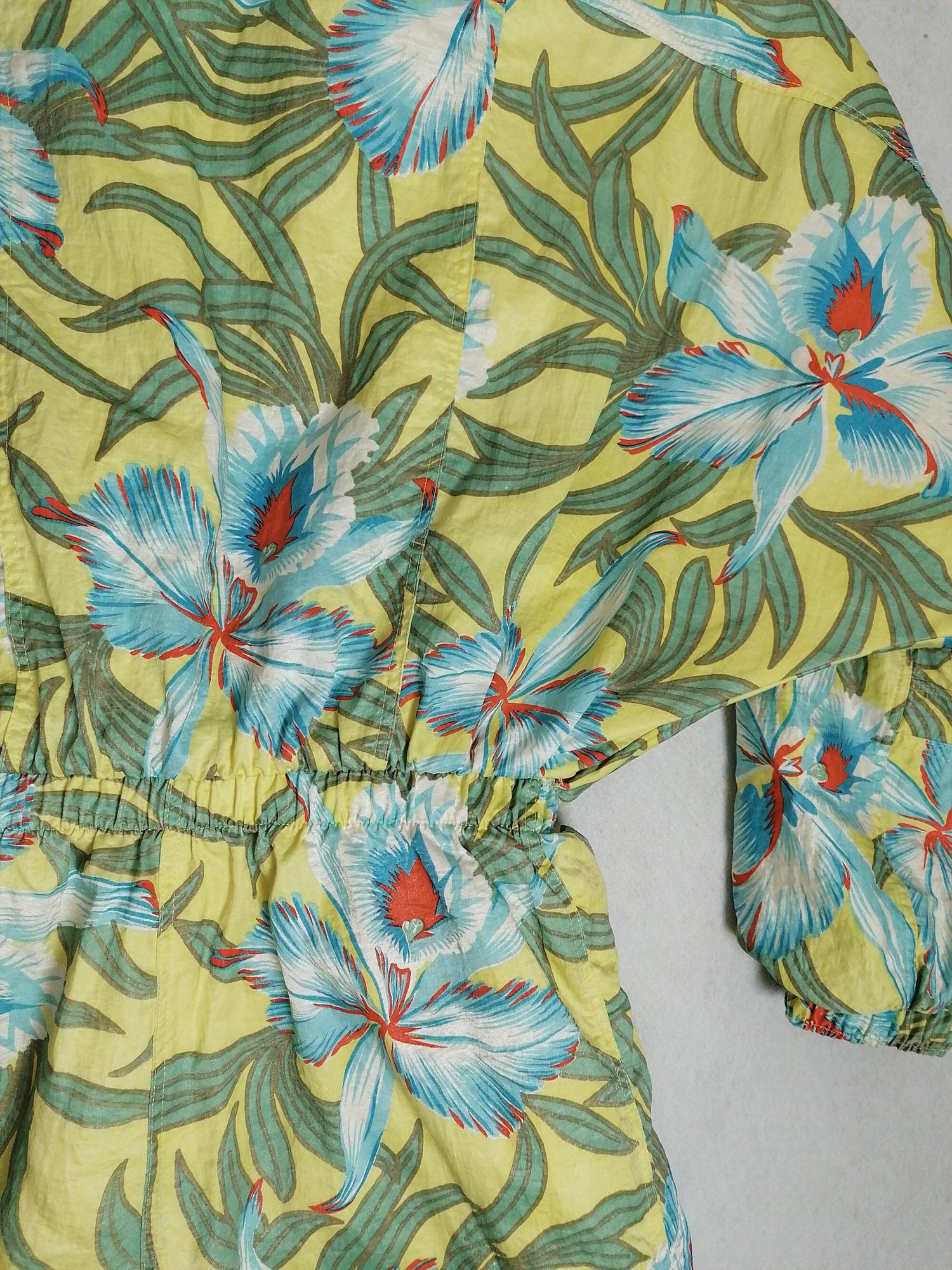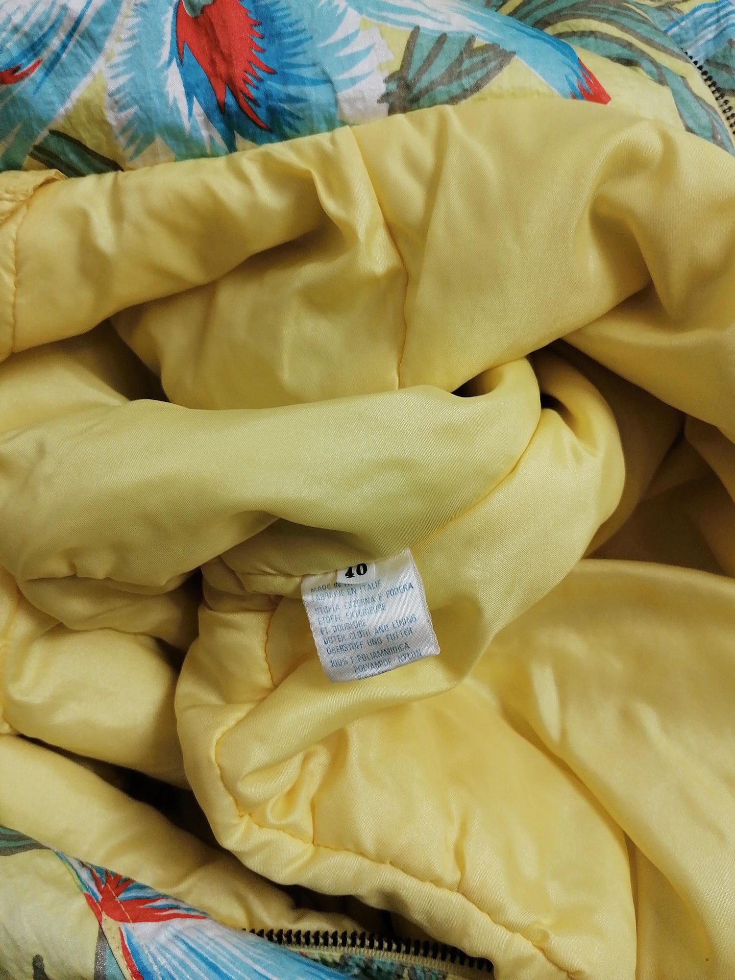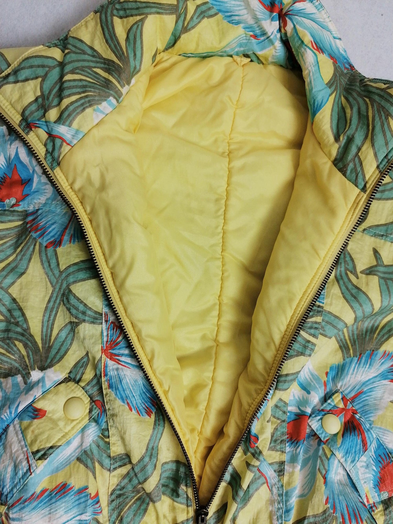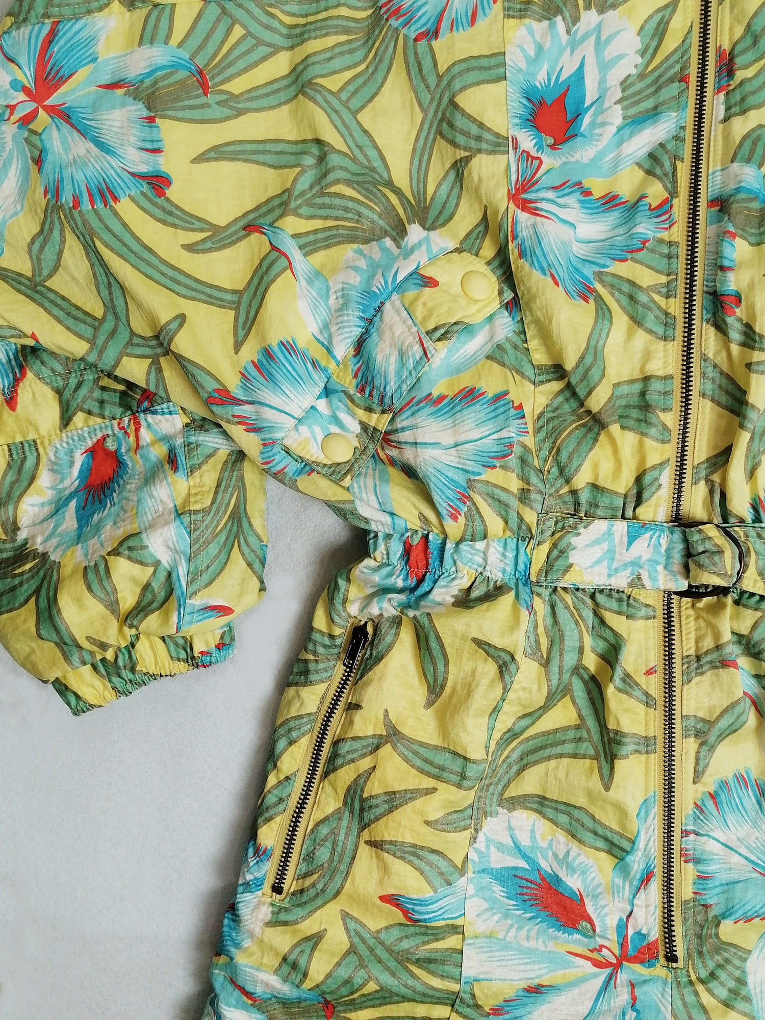 Gorgeous vintage 80's 90's women's ski overalls, beautiful shiny lime yellow, tropical flowers print. Made in Italy.