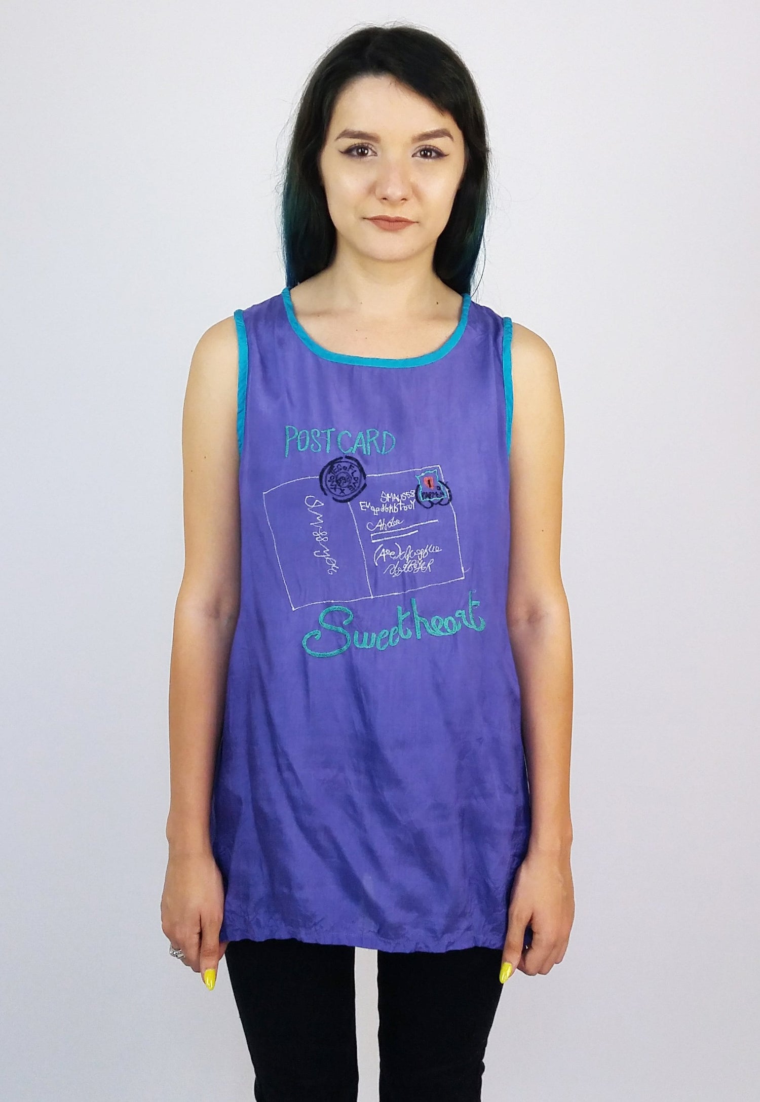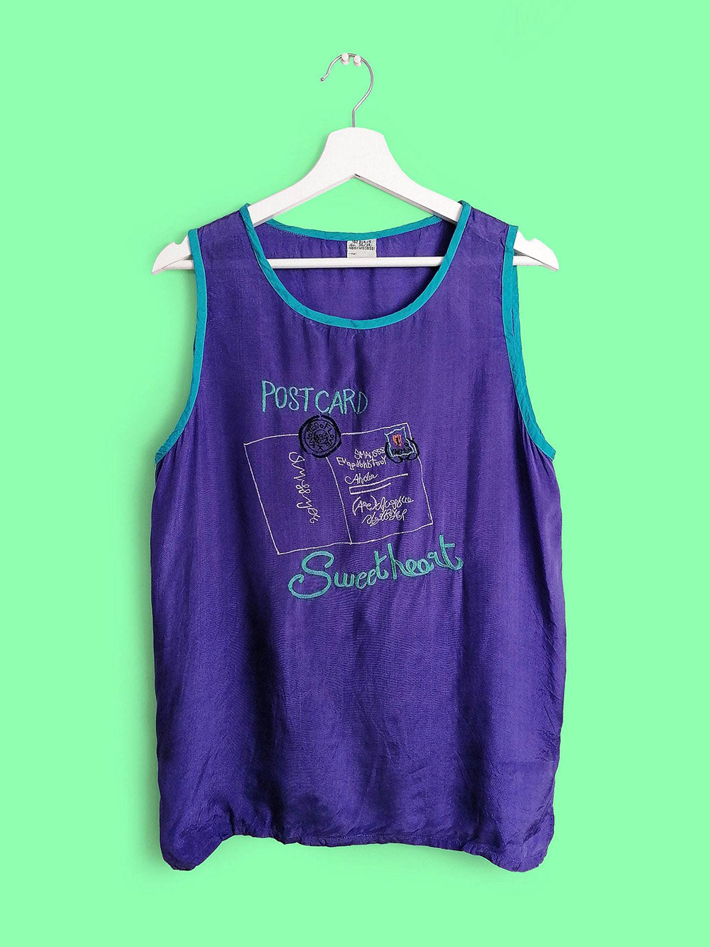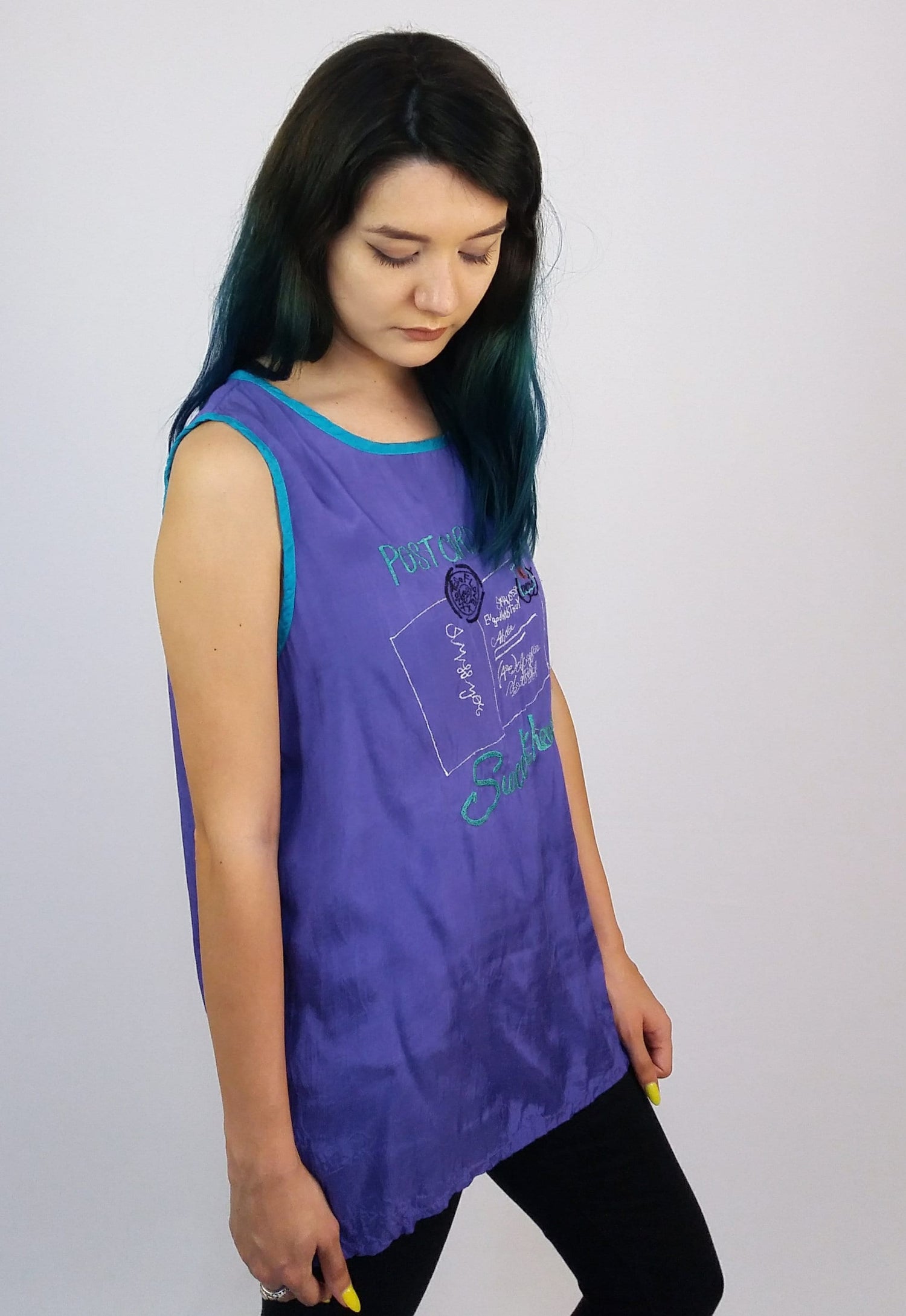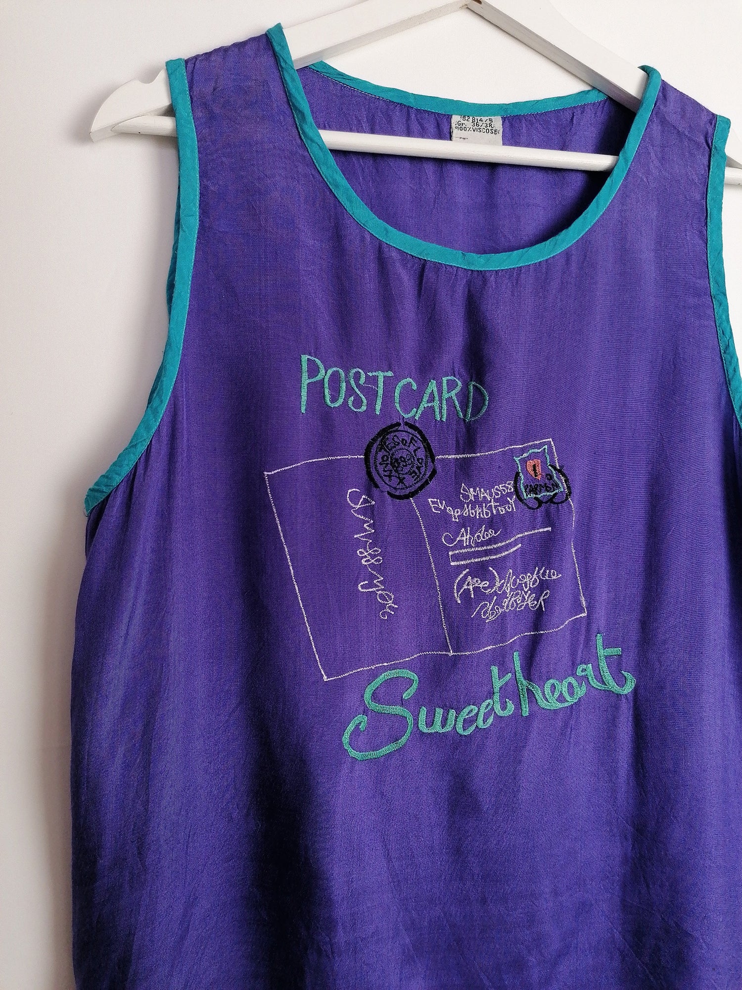 Vintage 80's perfect summer tank top, postcard embroidery, breezy viscose fabric. Vibrant purple with blue trim and details.