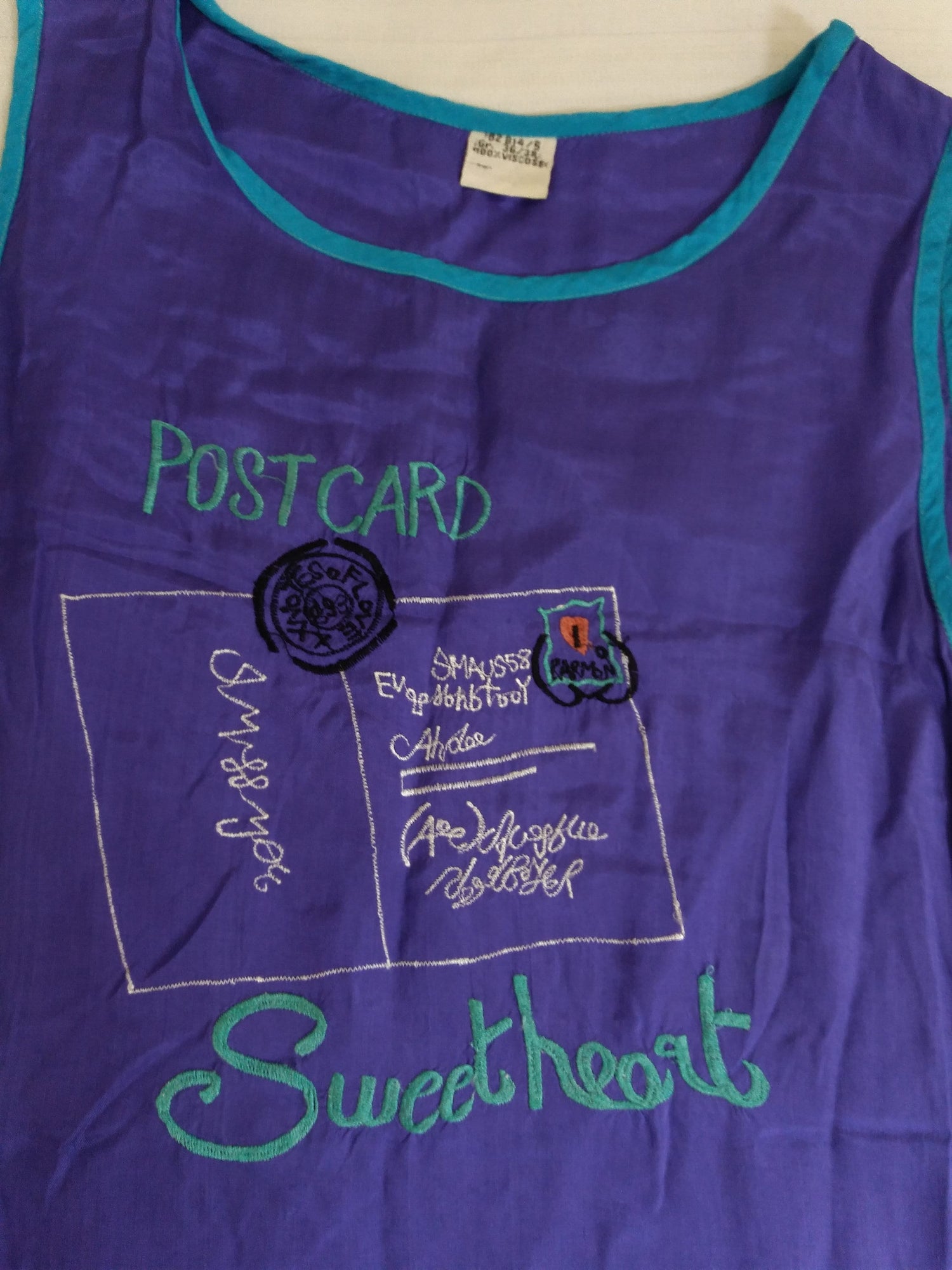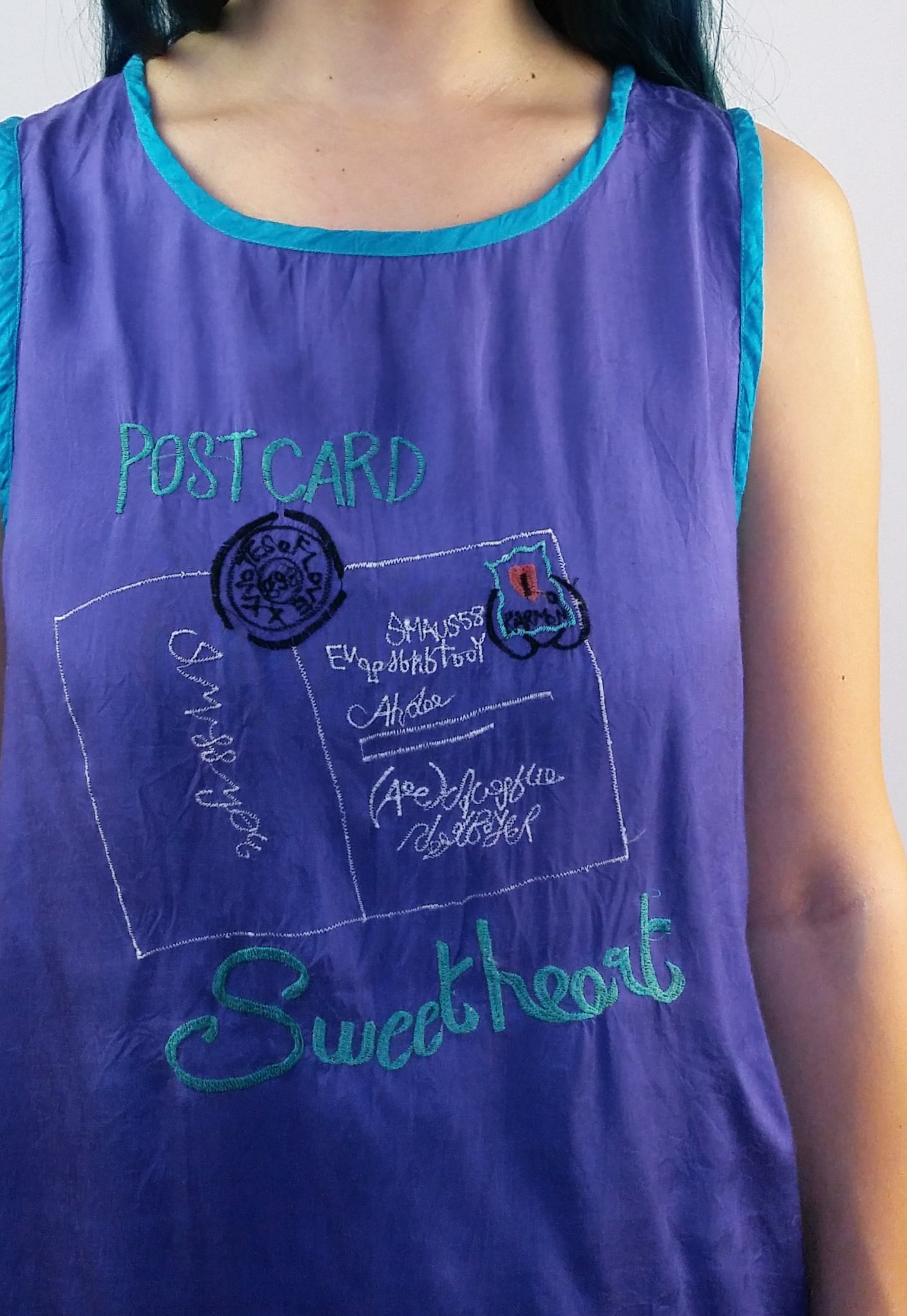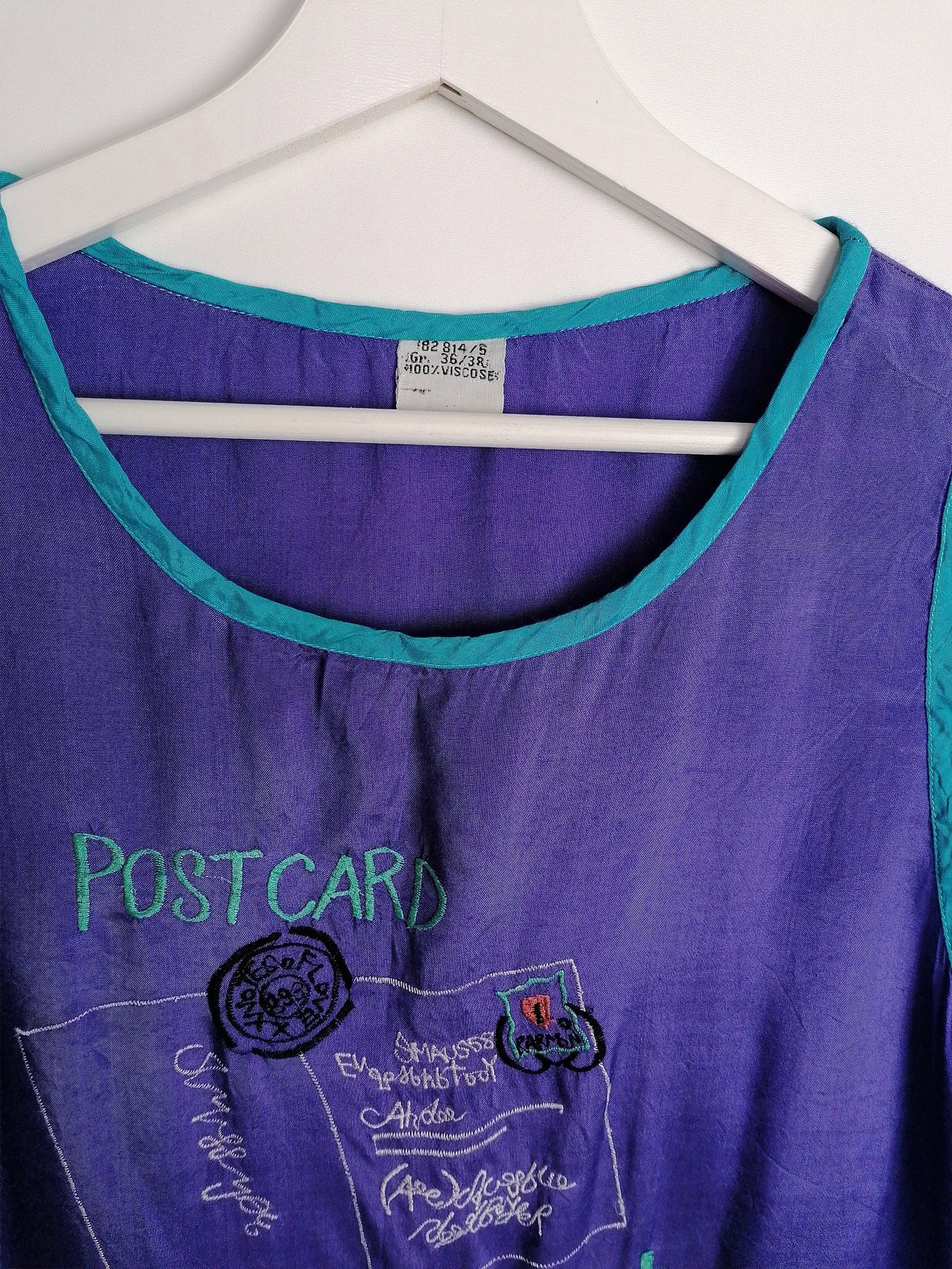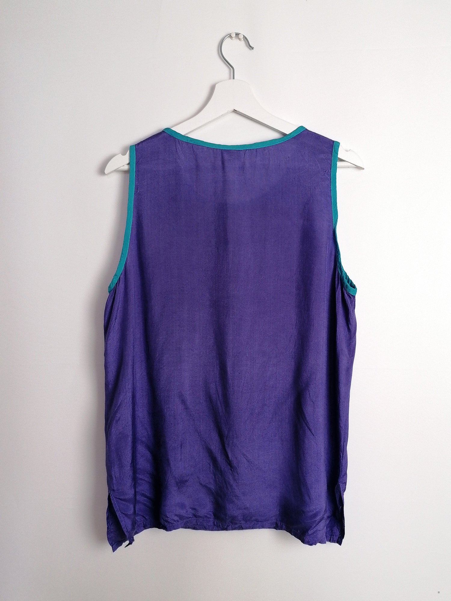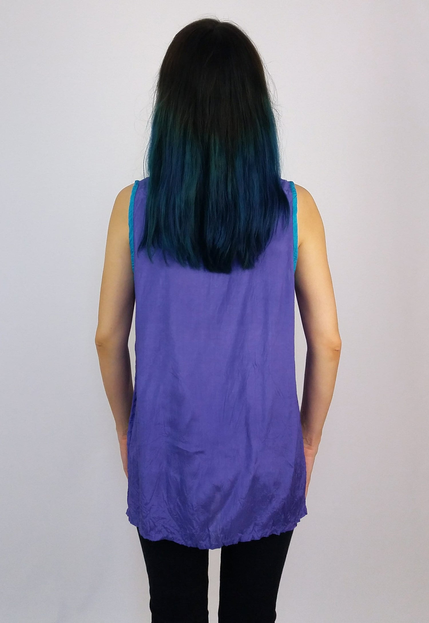 Vintage 80's perfect summer tank top, postcard embroidery, breezy viscose fabric. Vibrant purple with blue trim and details.