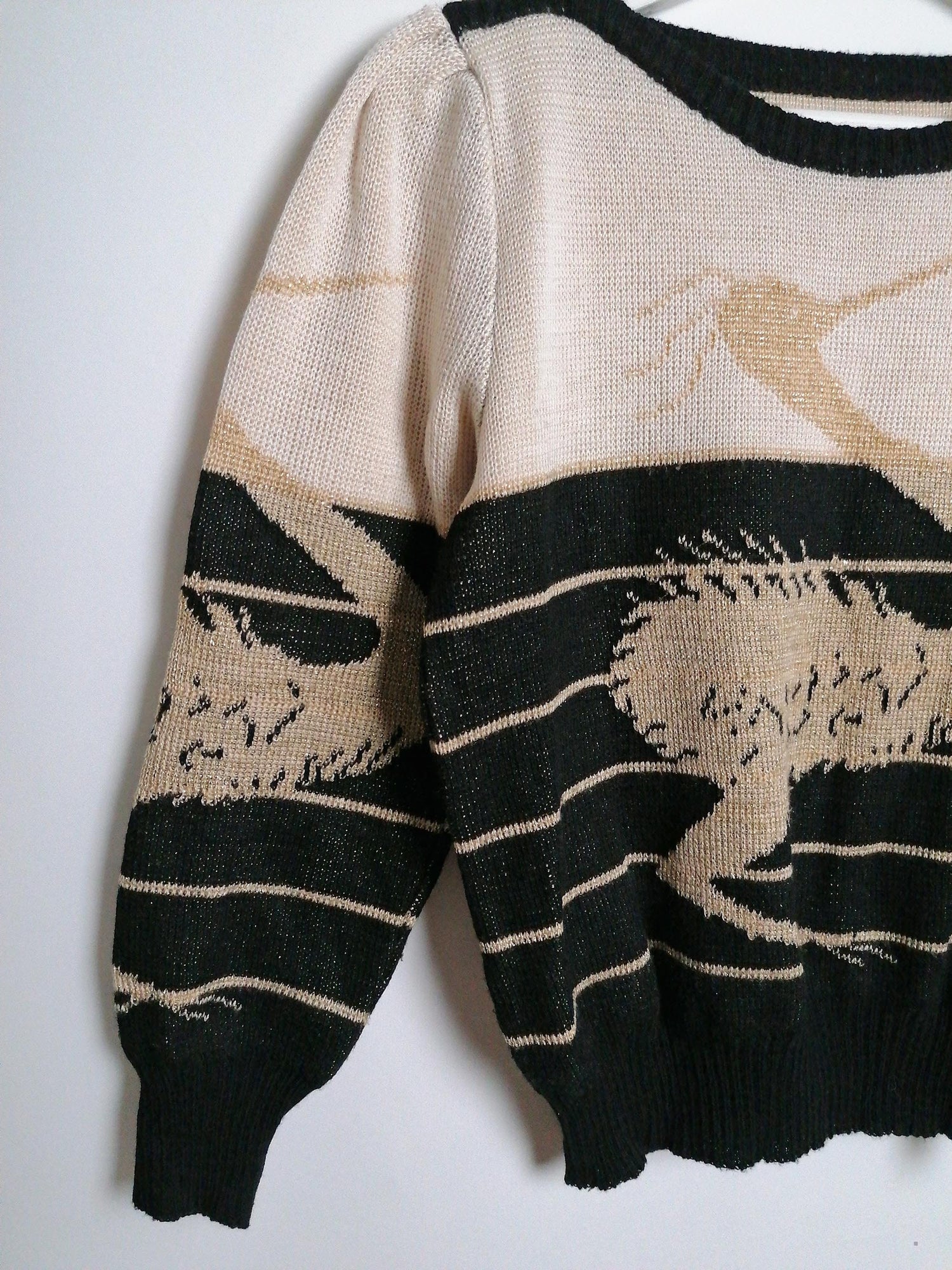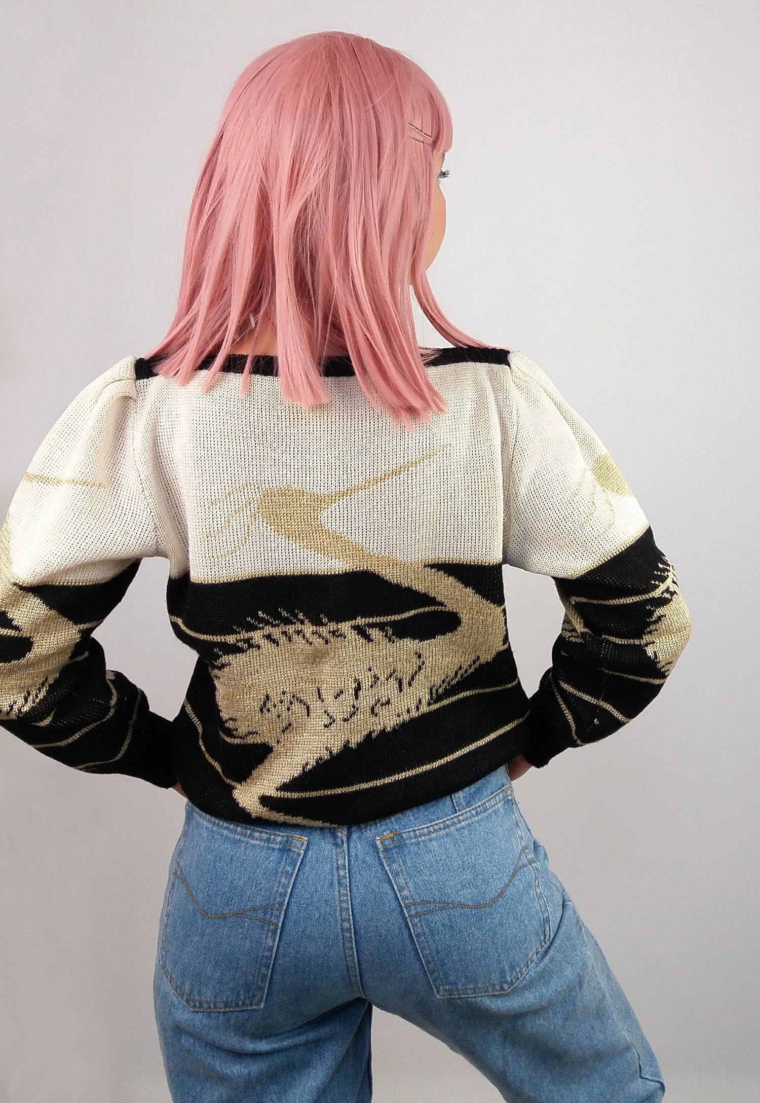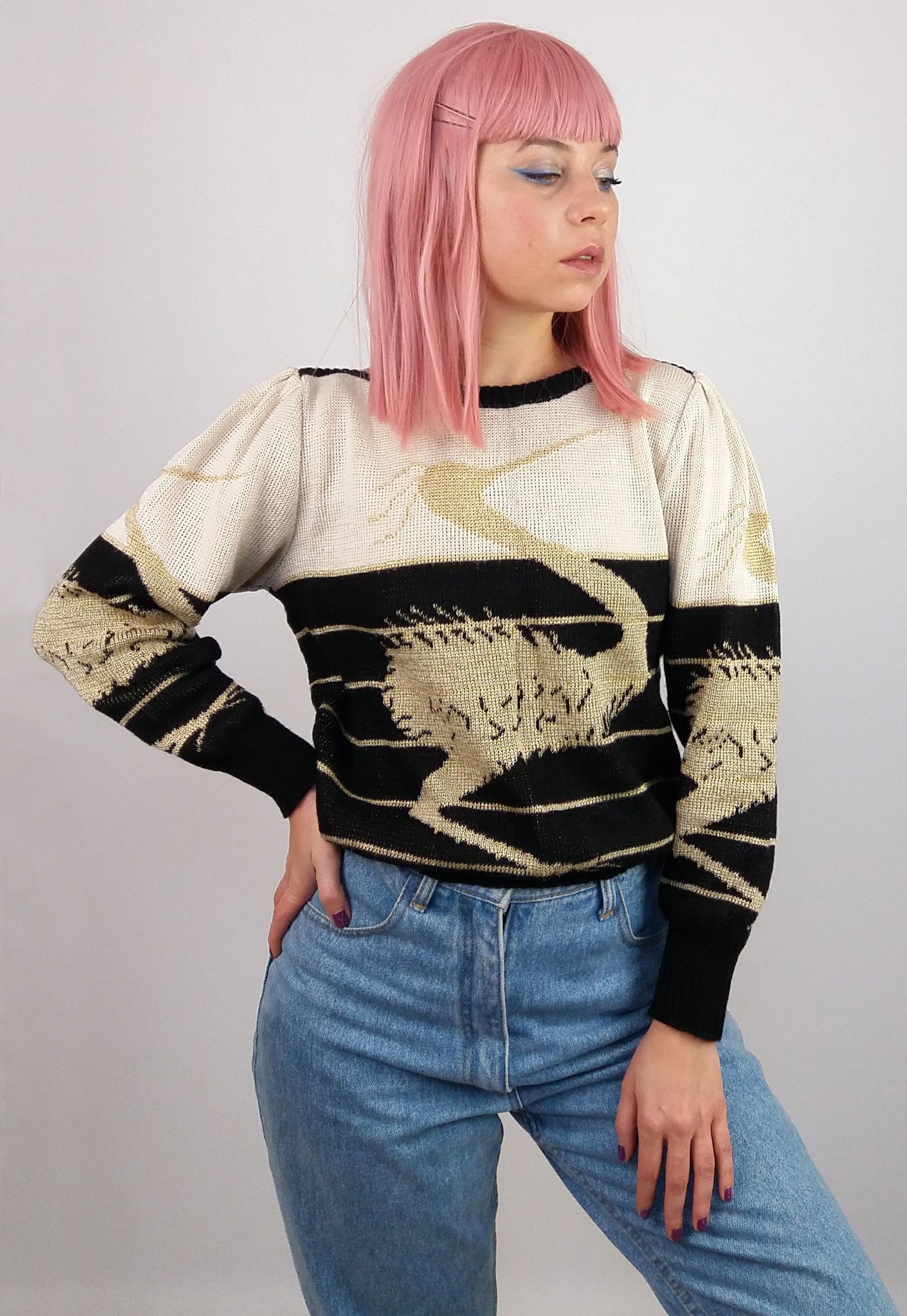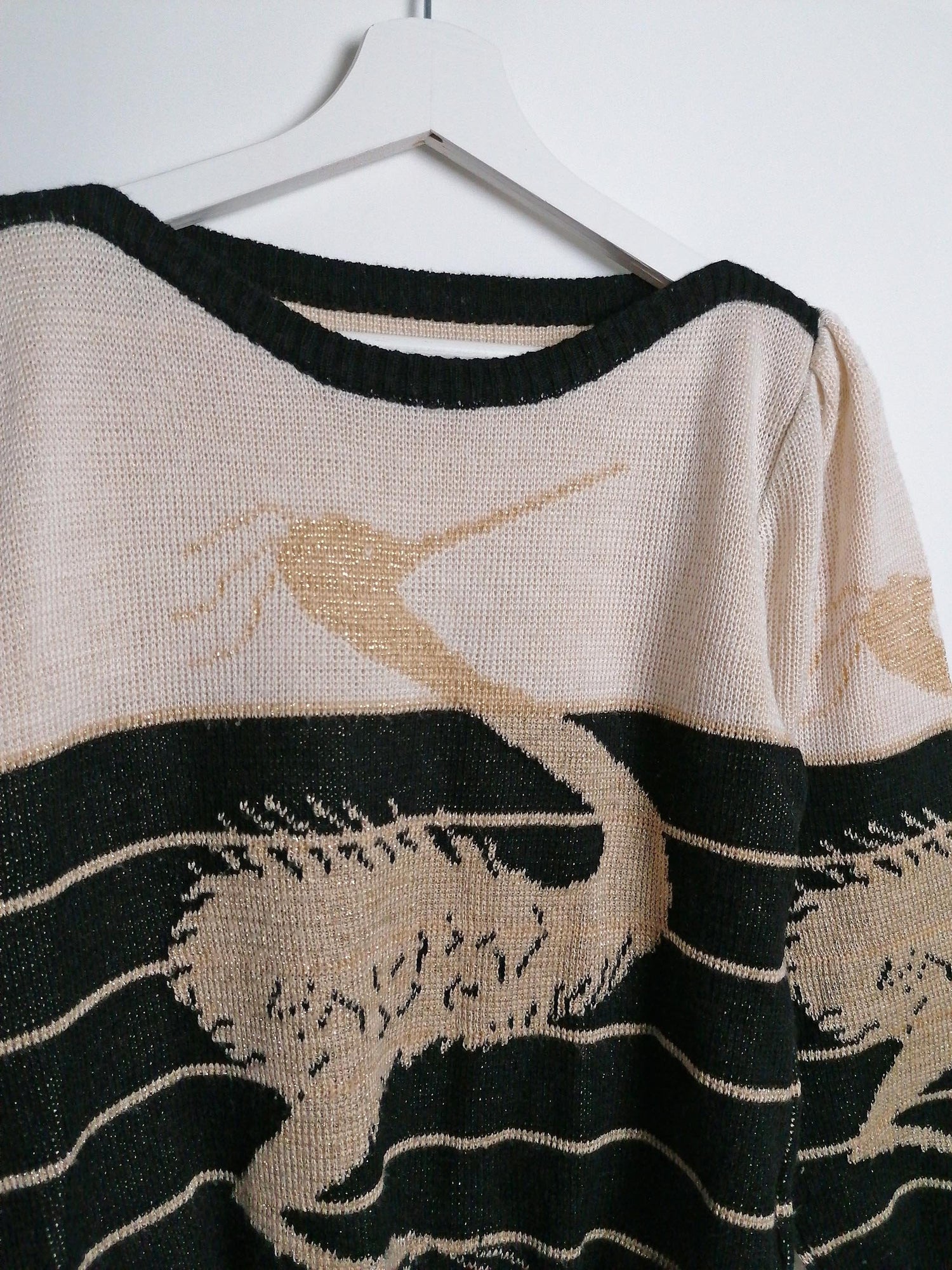 Beautiful 80's vintage knit jumper, crane pattern in gold, cream and black.