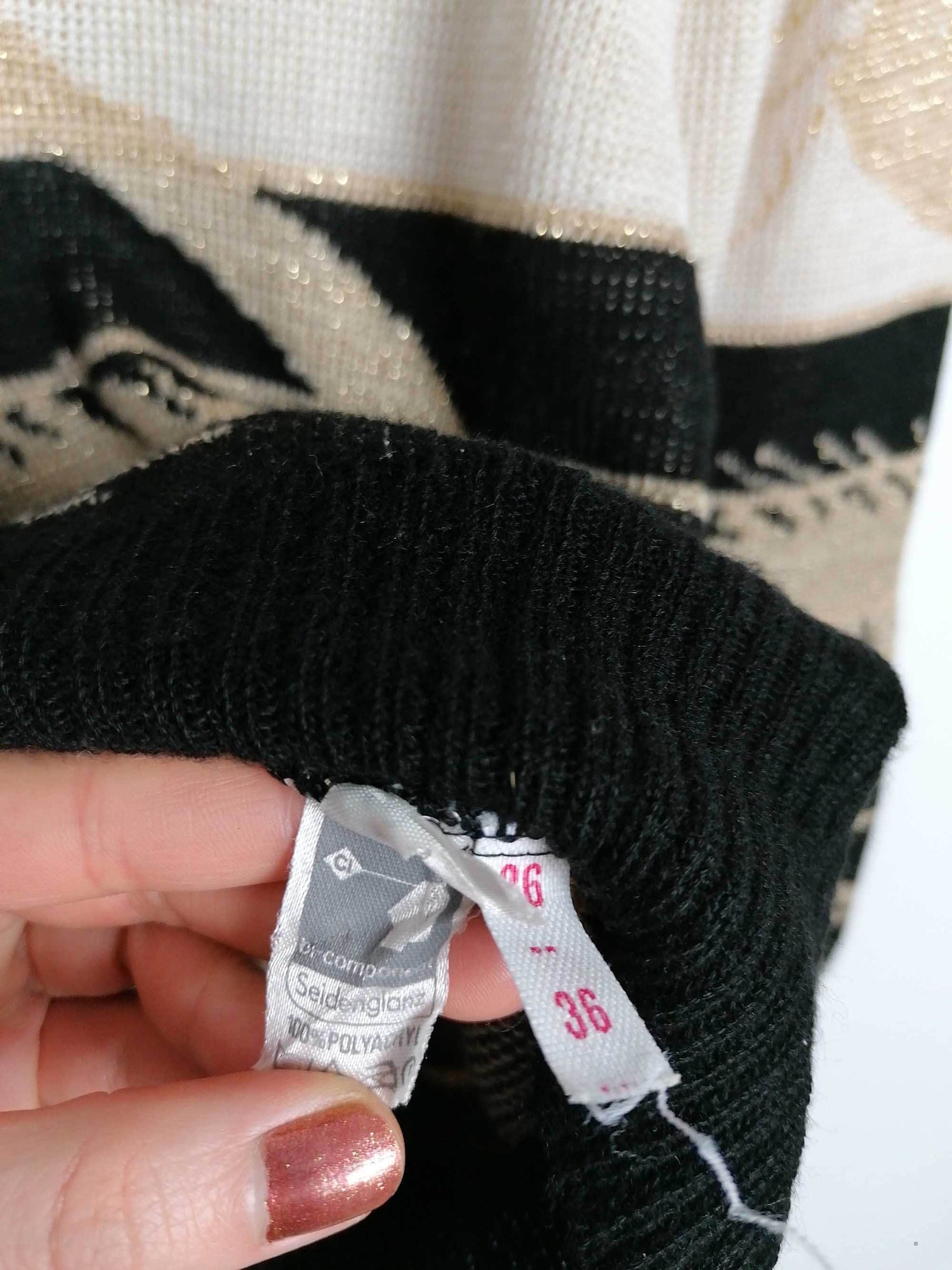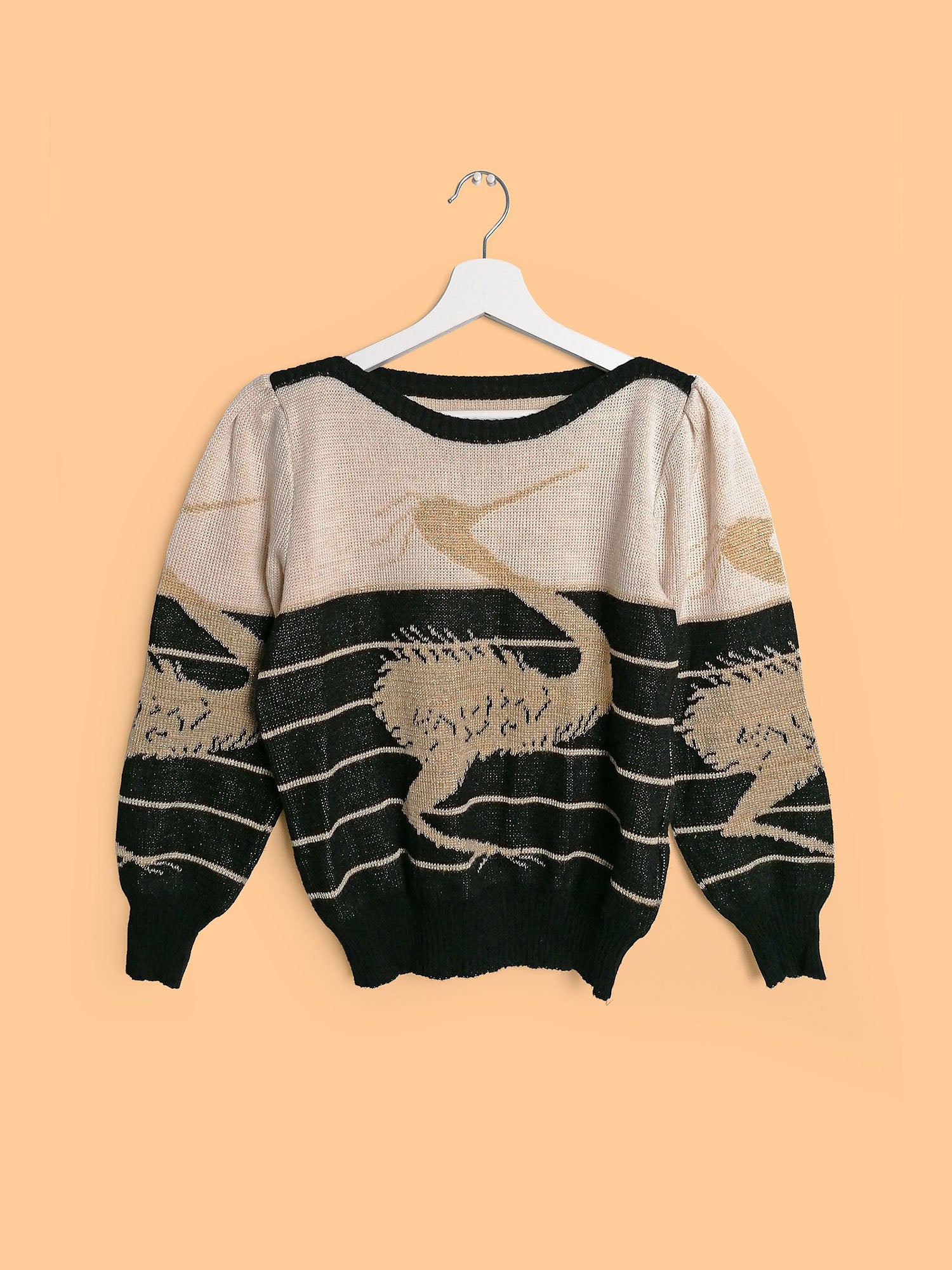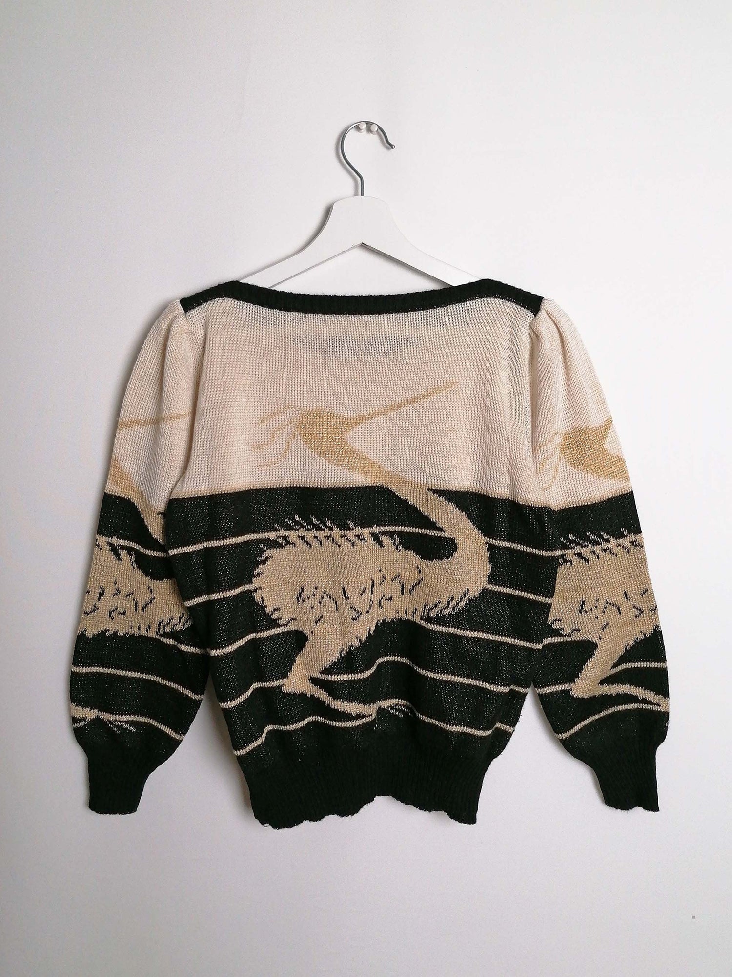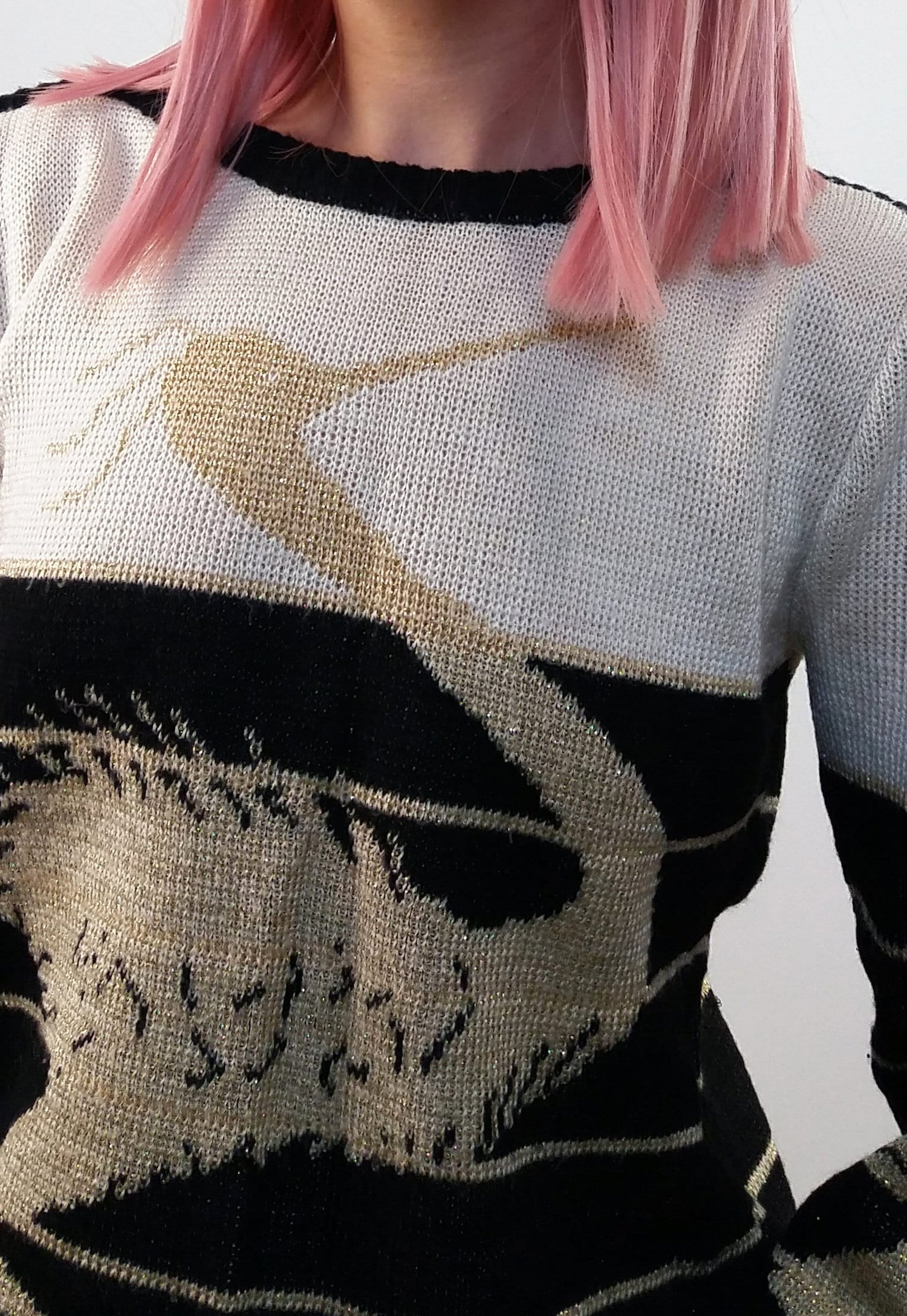 Beautiful 80's vintage knit jumper, crane pattern in gold, cream and black.