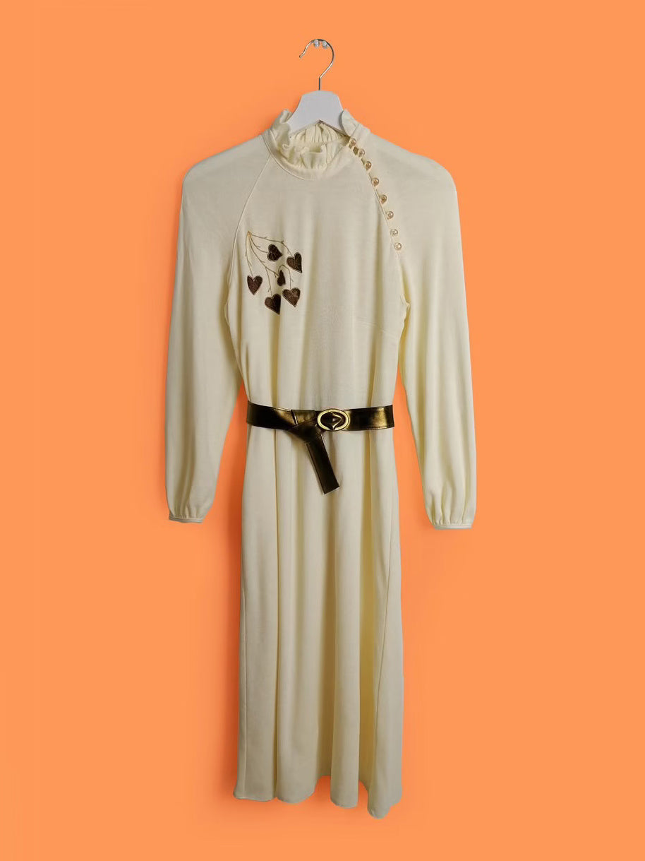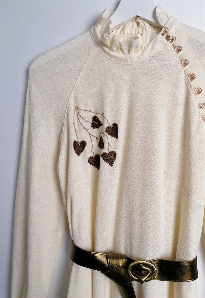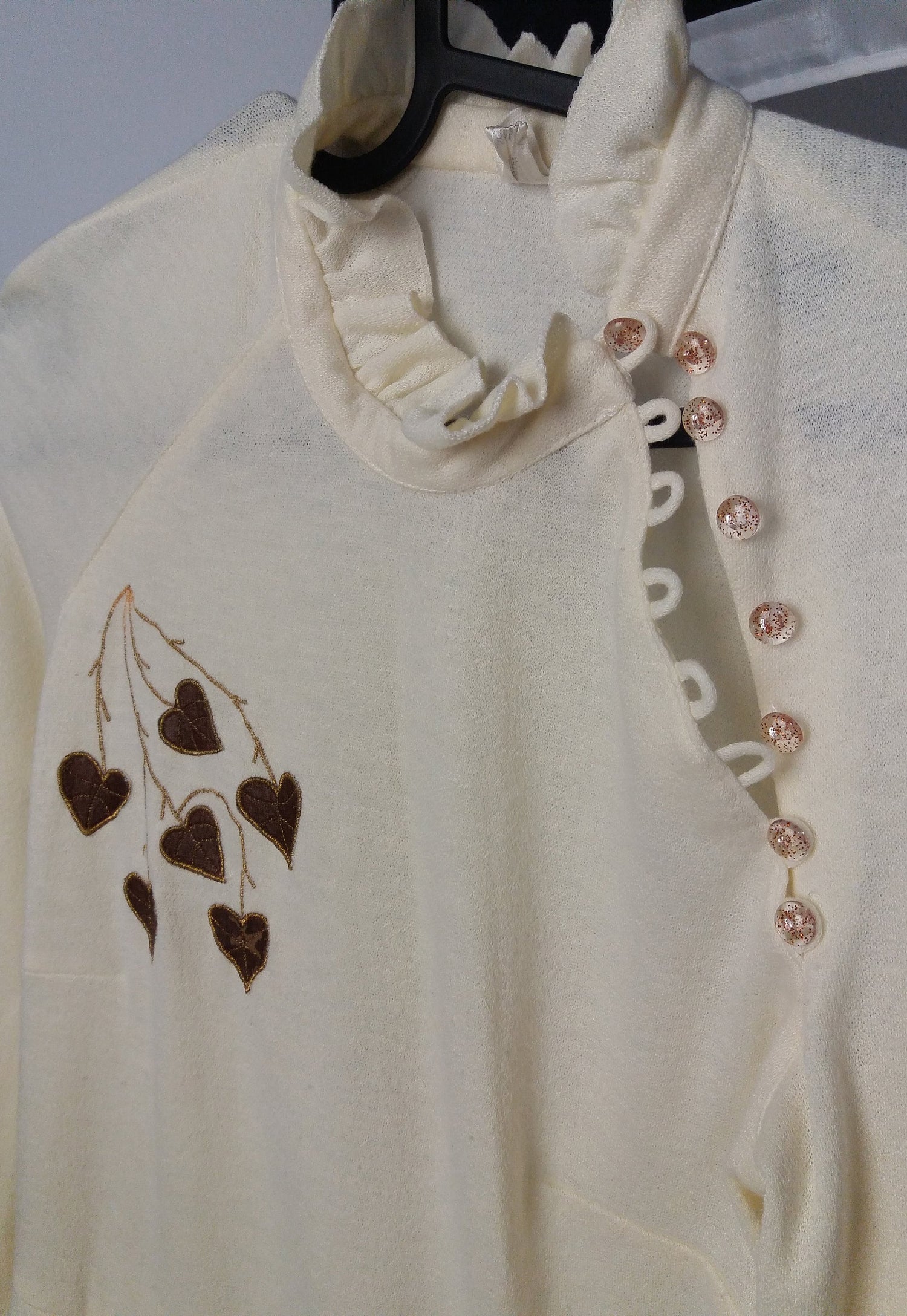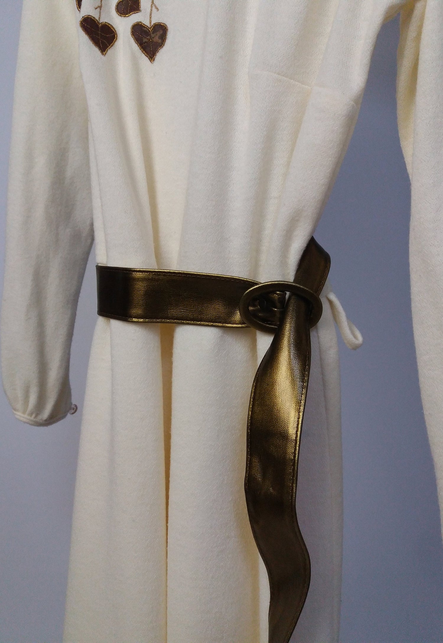 Amazing 80's soft knit dress, angora, polyamide and polyester blend. Beautiful autumn leaves gold embroidery, glitter buttons. It comes with a beautiful belt.