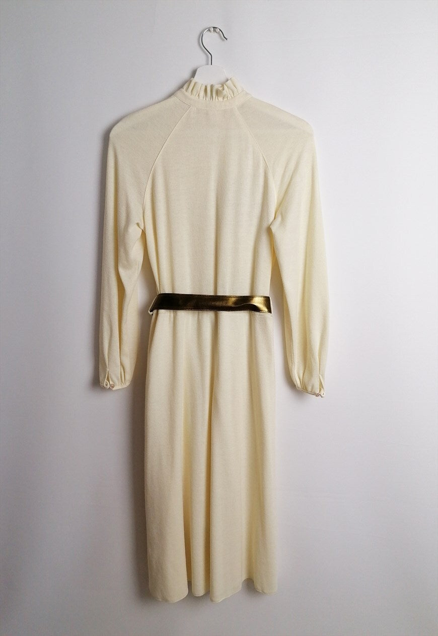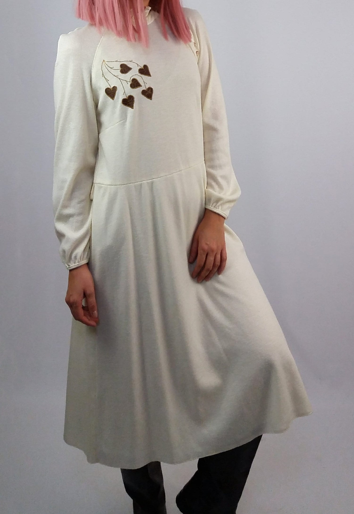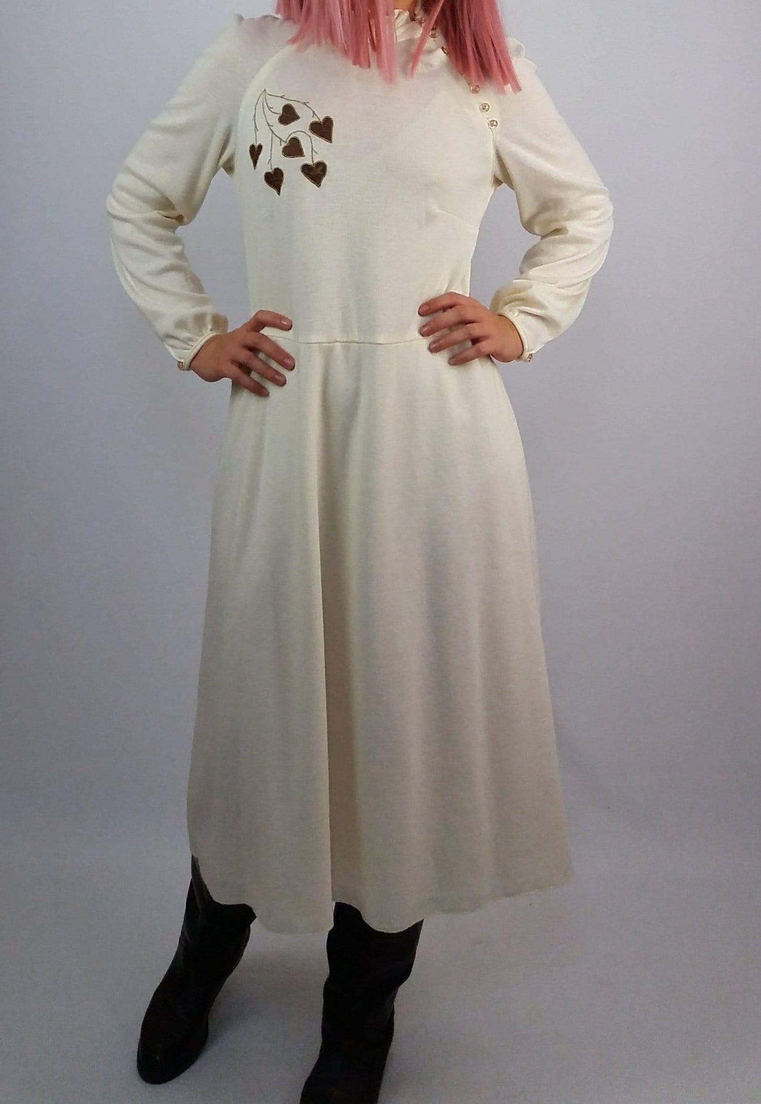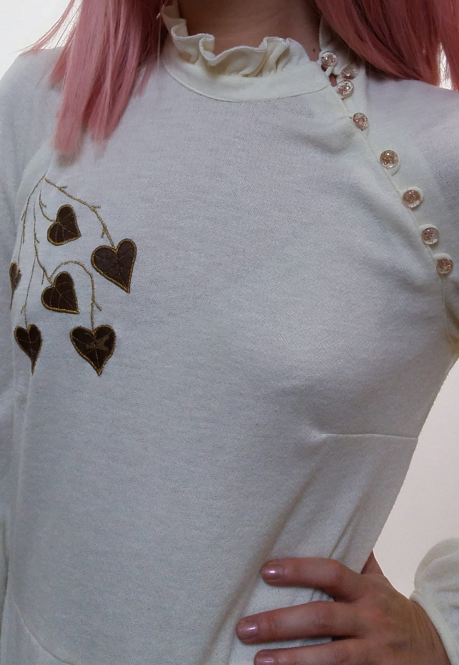Amazing 80's soft knit dress, angora, polyamide and polyester blend. Beautiful autumn leaves gold embroidery, glitter buttons. It comes with a beautiful belt.