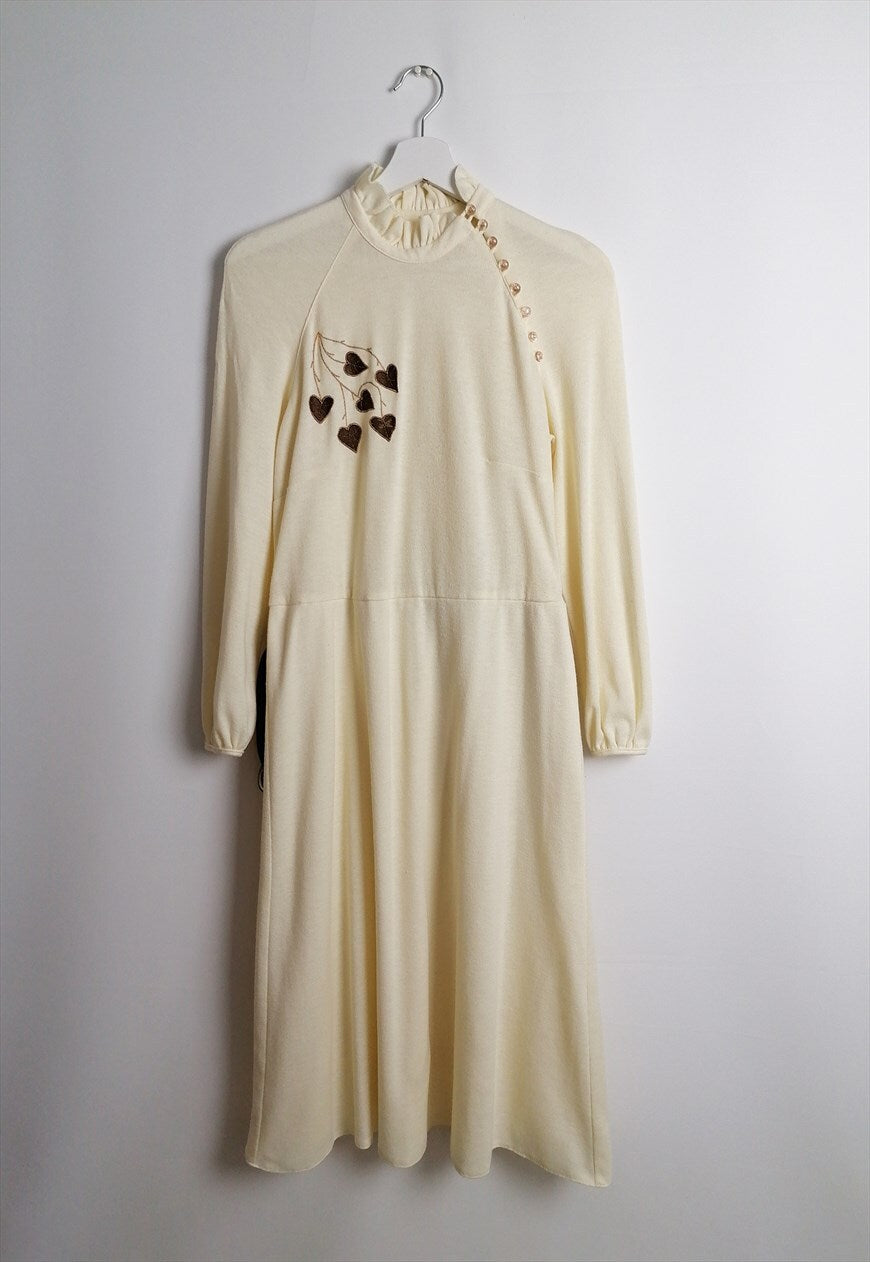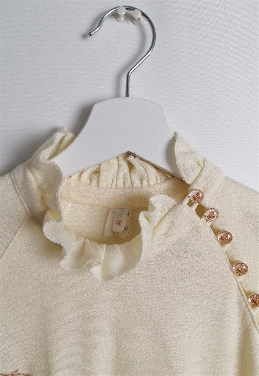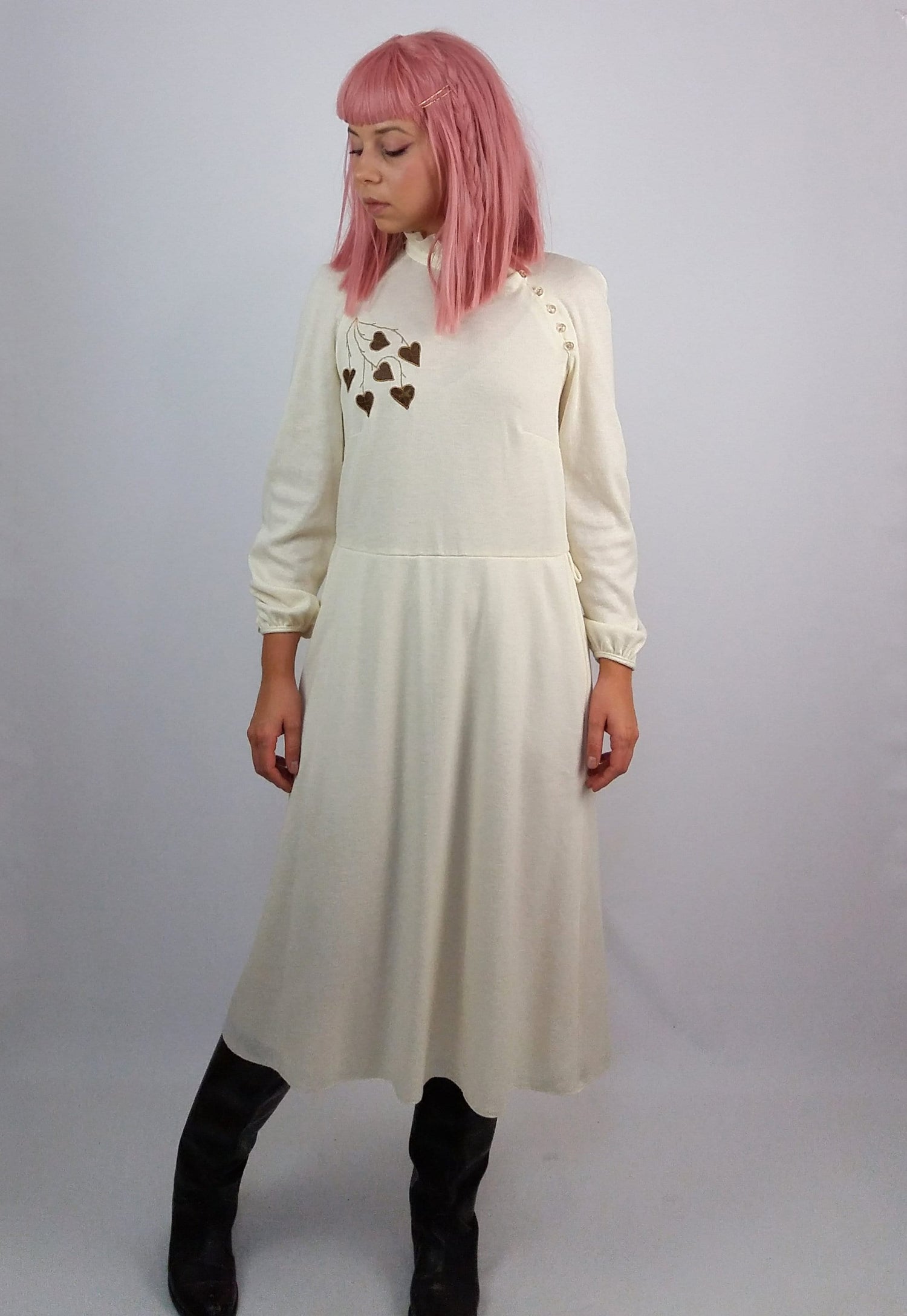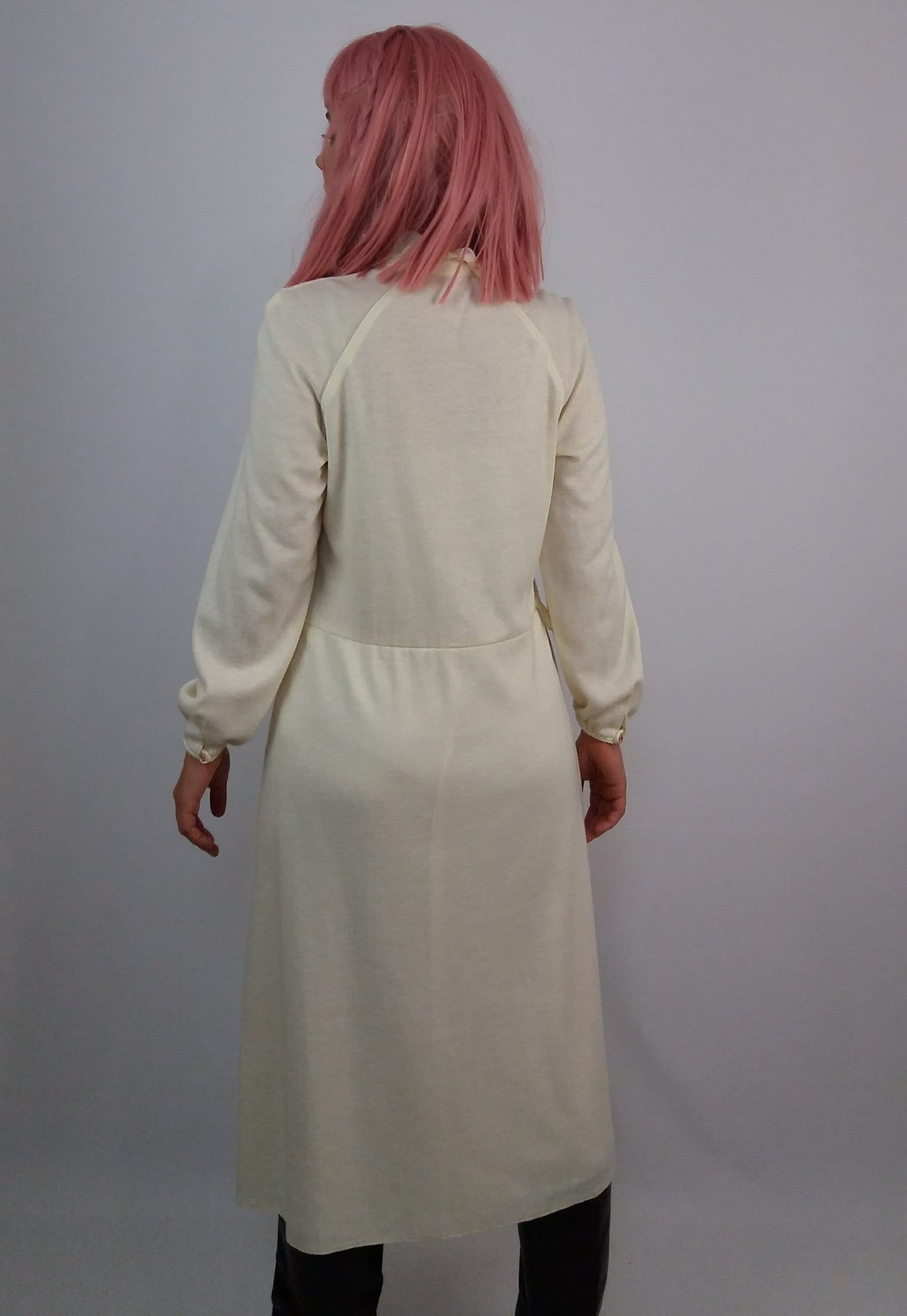 Amazing 80's soft knit dress, angora, polyamide and polyester blend. Beautiful autumn leaves gold embroidery, glitter buttons. It comes with a beautiful belt.