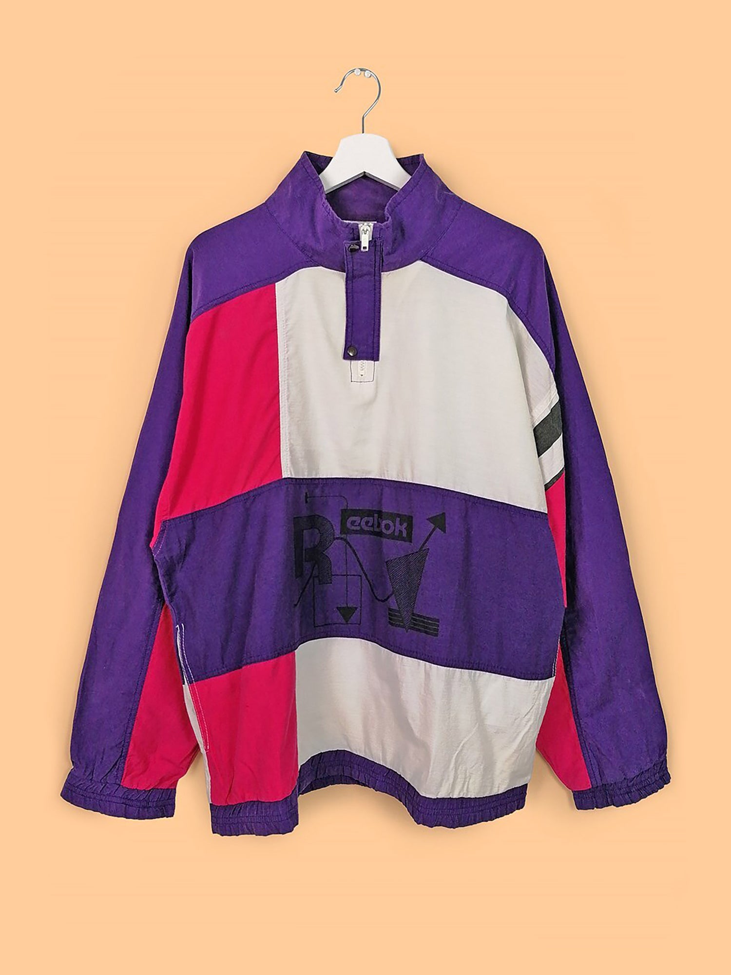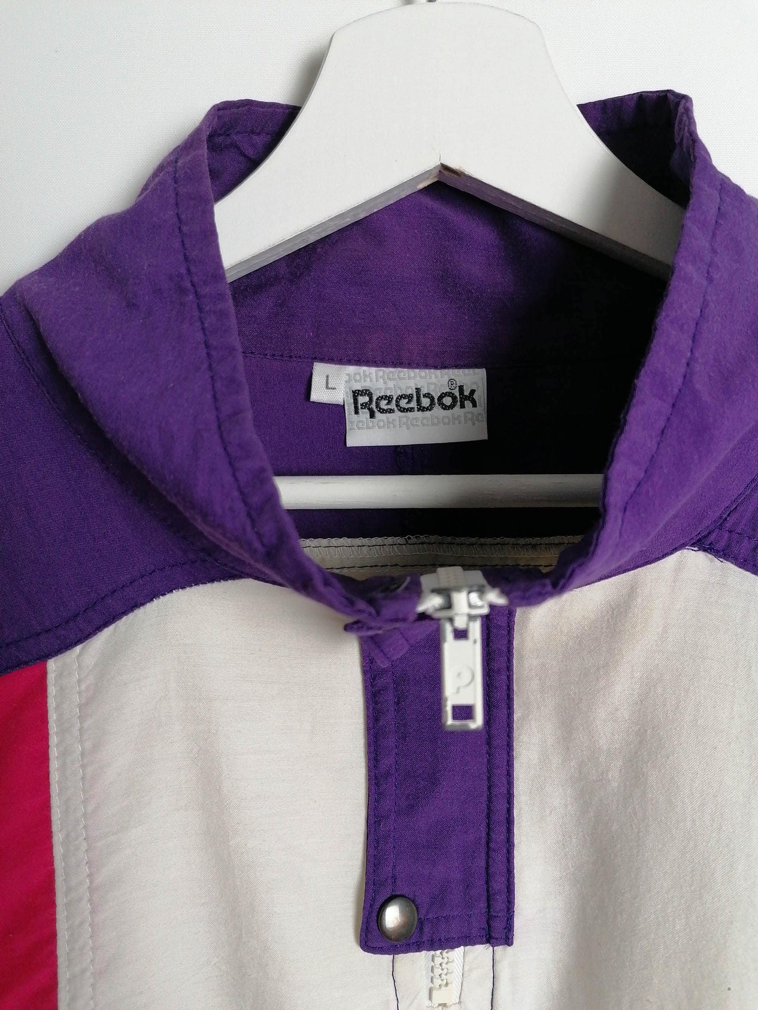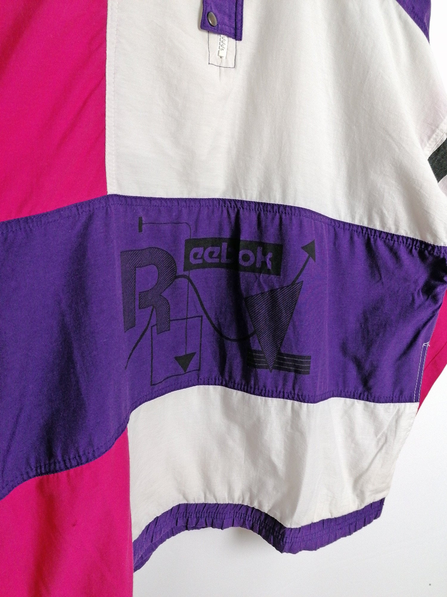 Gorgeous rare vintage 80's REEBOK long sleeve top, cotton, paper-thin, slightly sheer. Side pockets, 1/4 zipper, retro graphic logo on front.