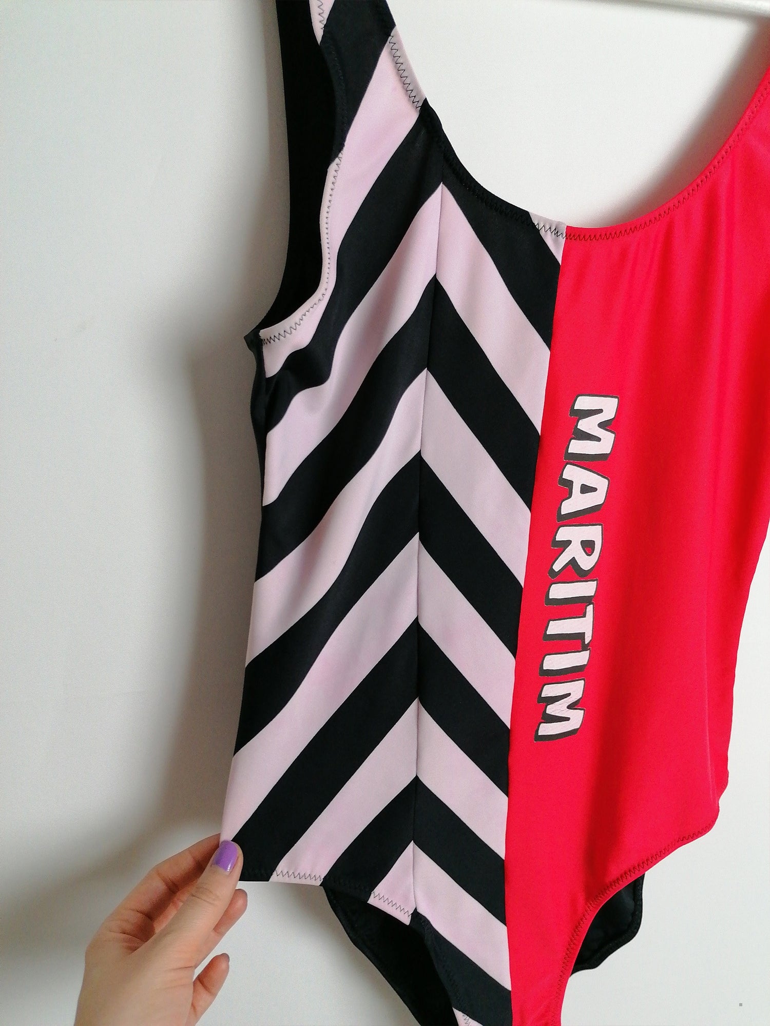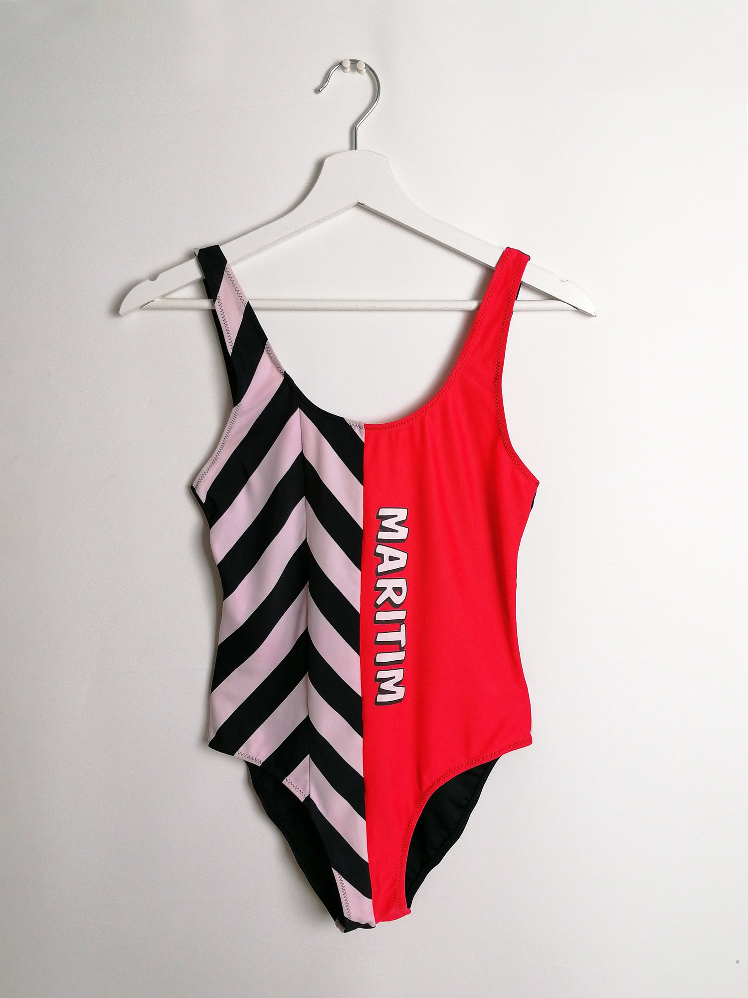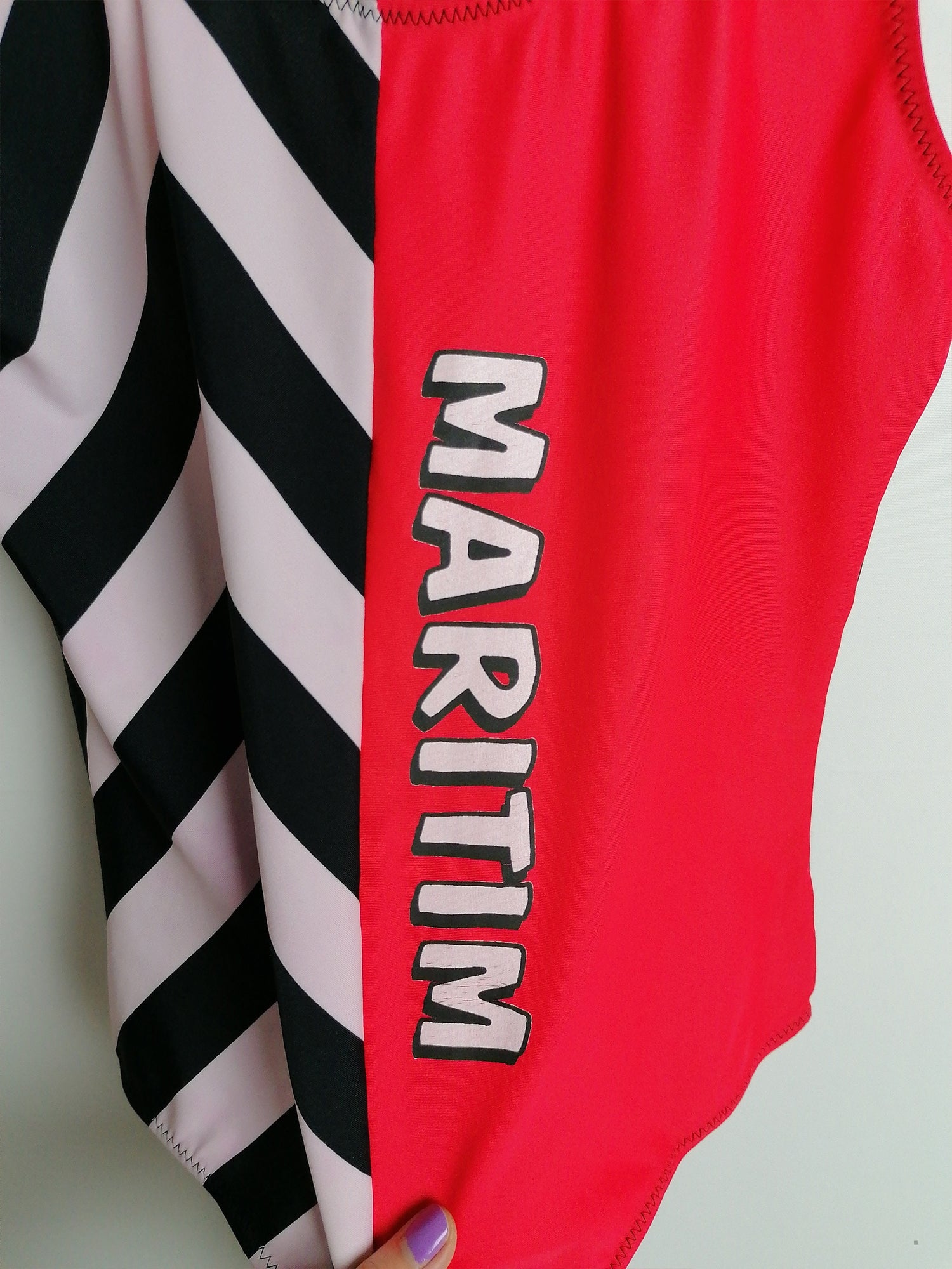 Gorgeous vintage 80's retro one-piece swimsuit, black with white and red and Maritim logo.
