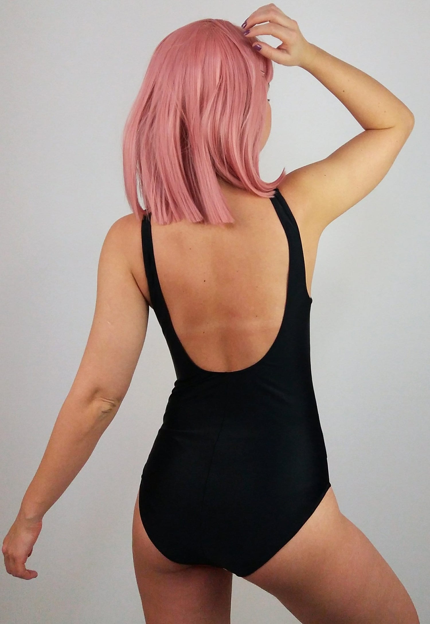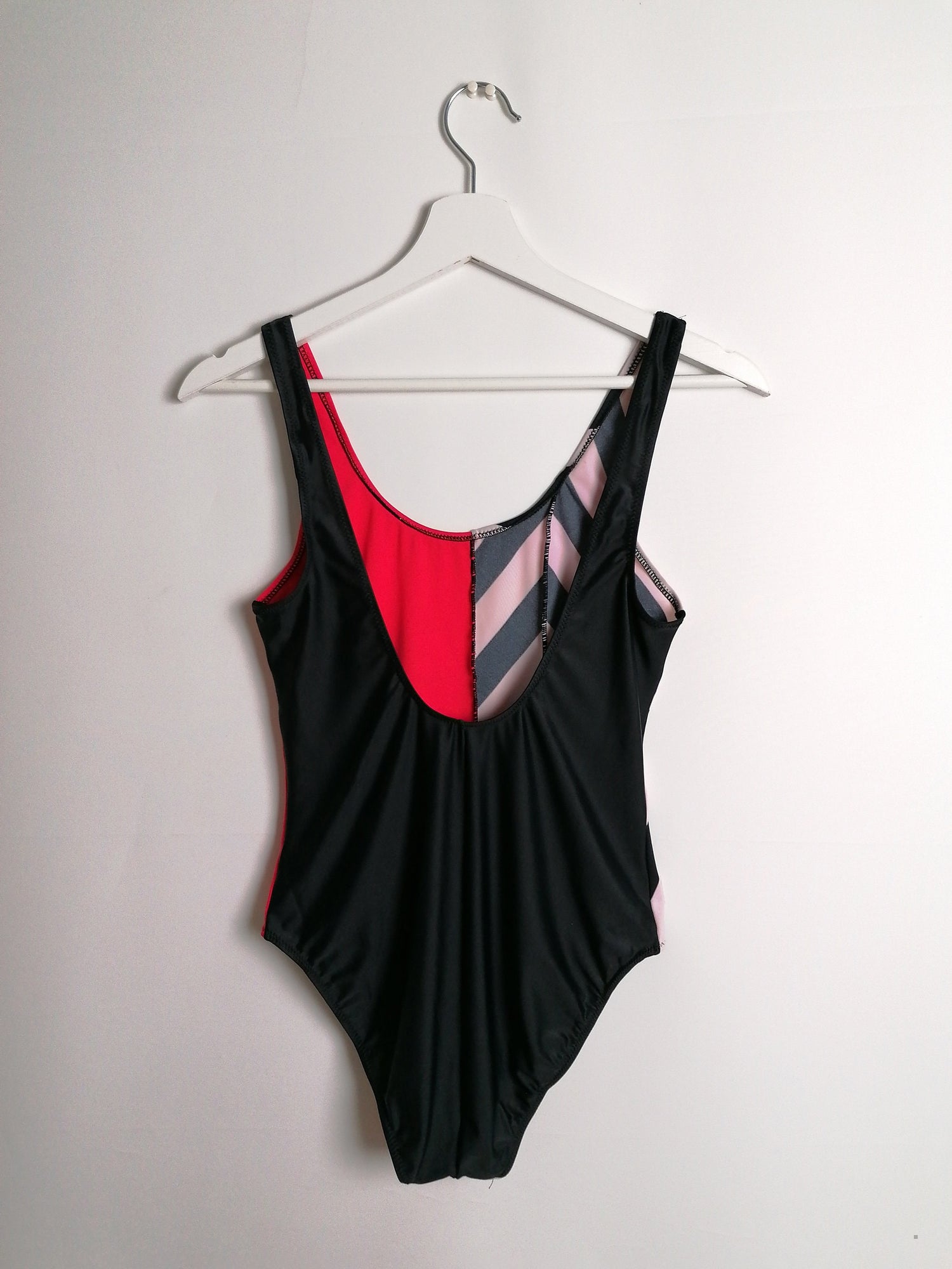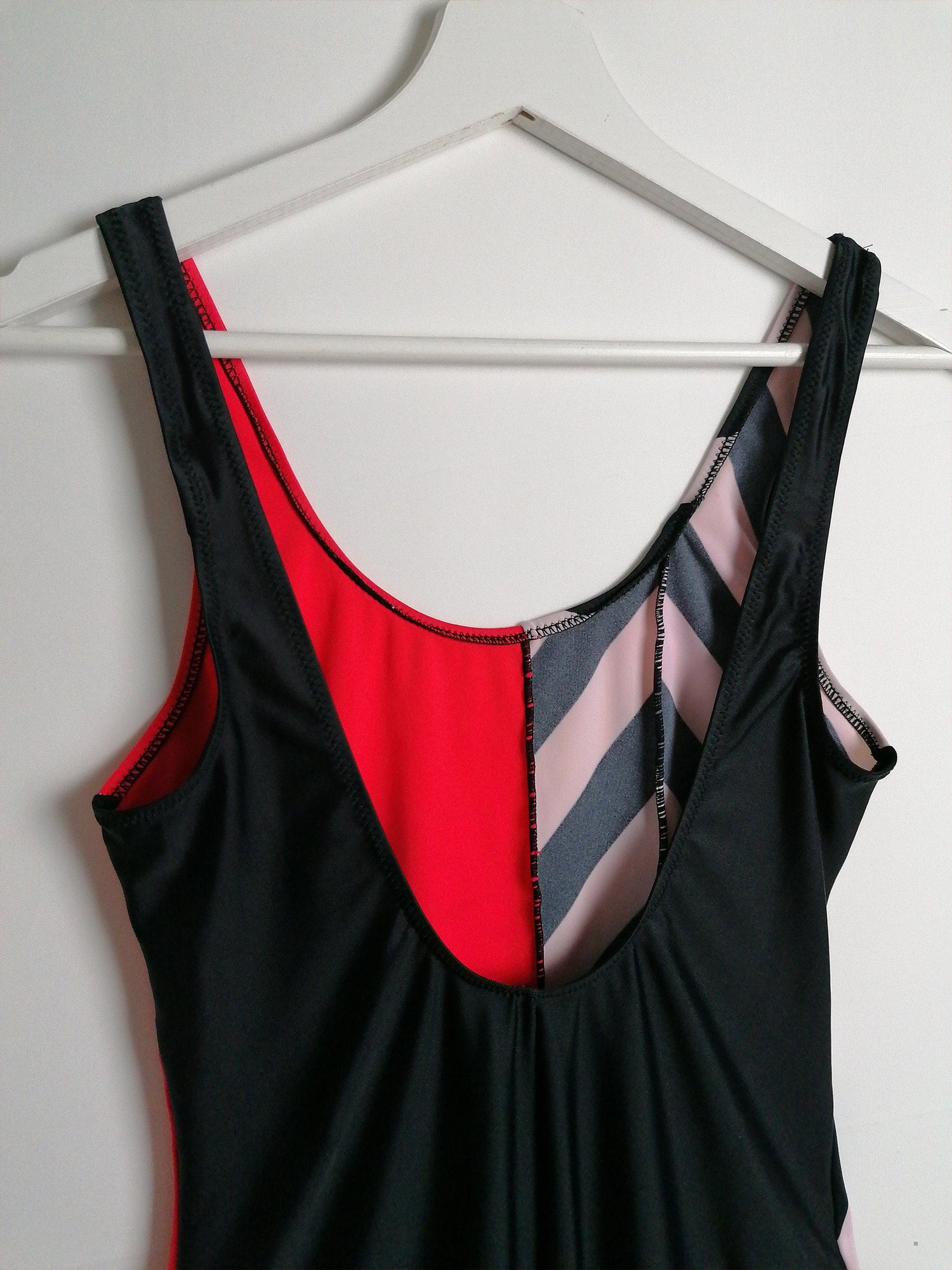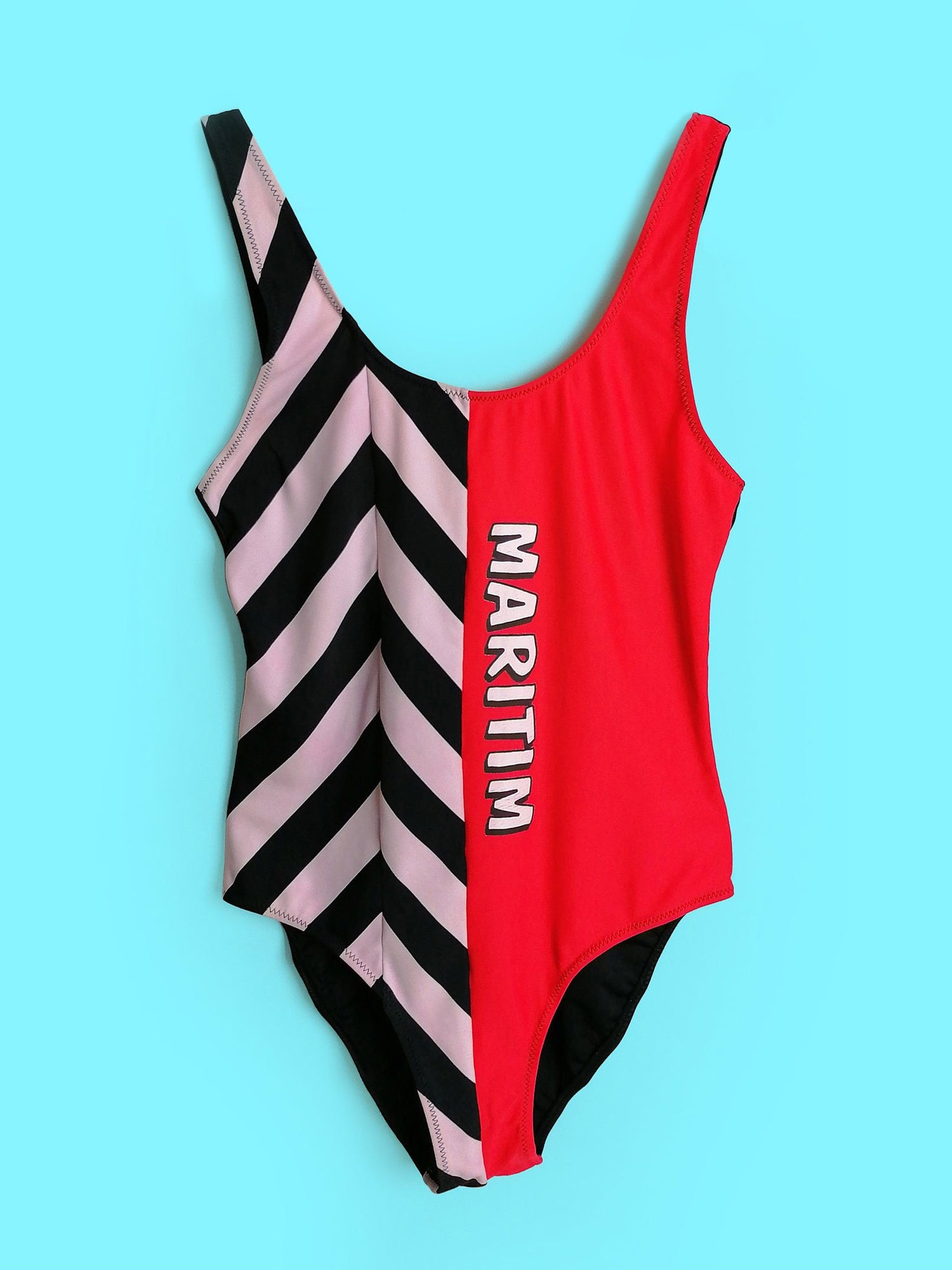 Gorgeous vintage 80's retro one-piece swimsuit, black with white and red and Maritim logo.