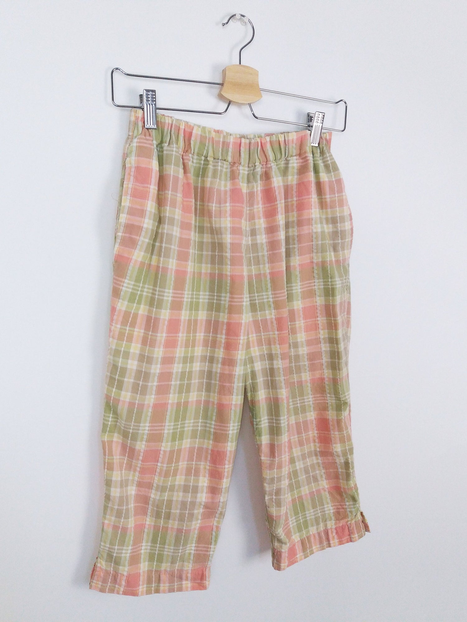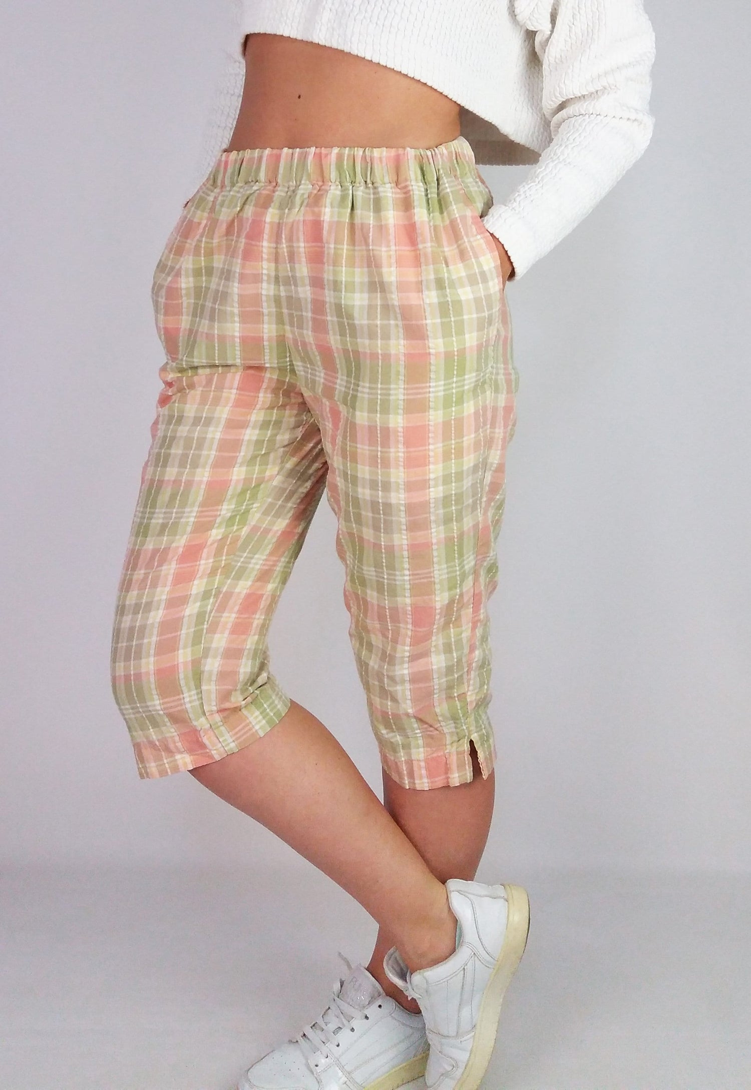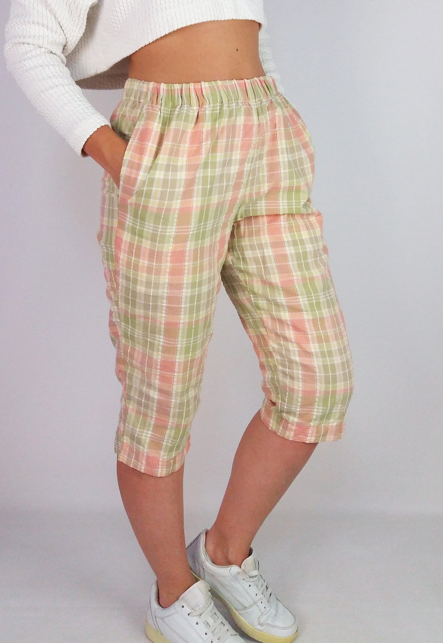 Gorgeous 80's 90's plaid patter capris, elastic waist, side pockets.