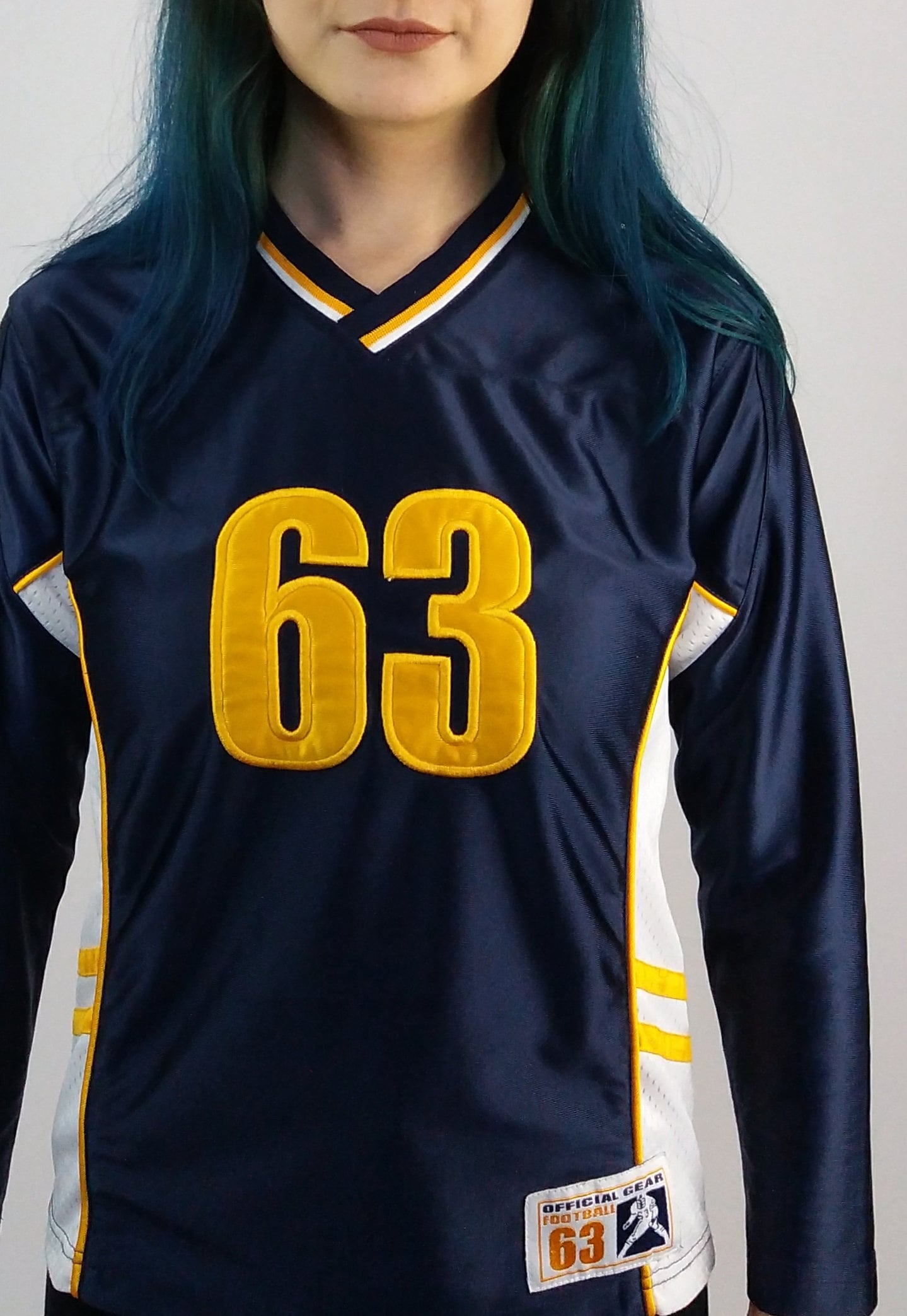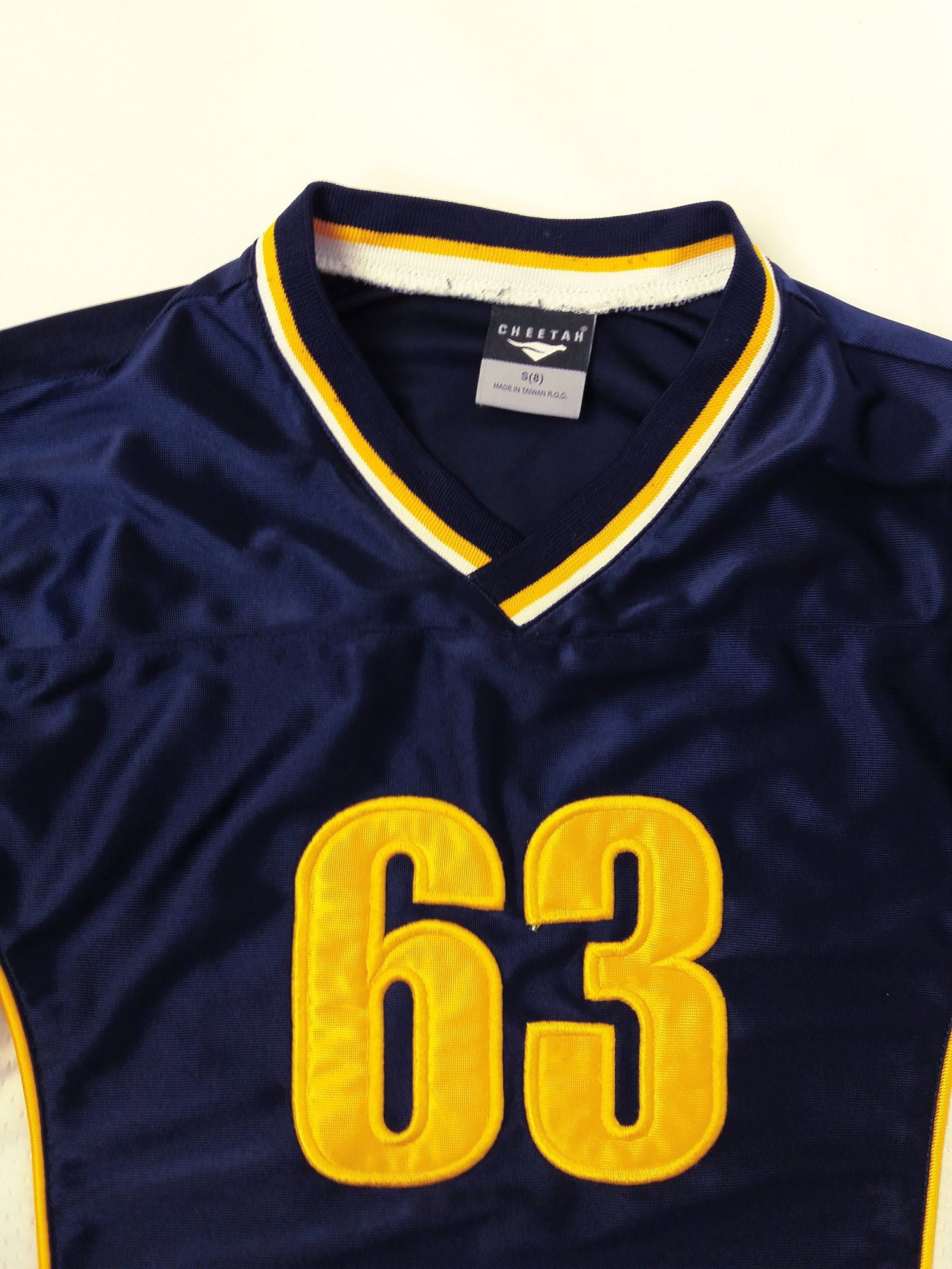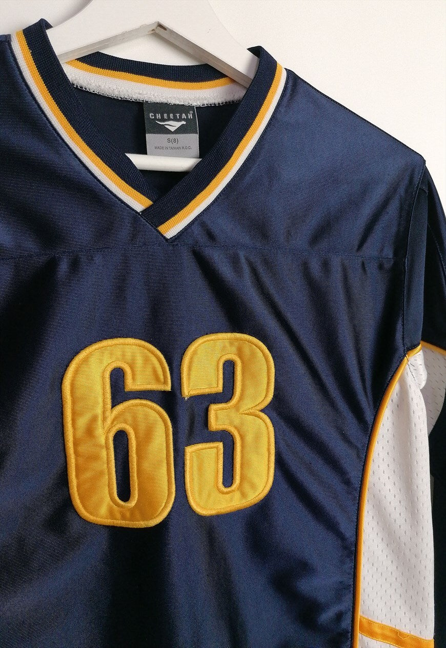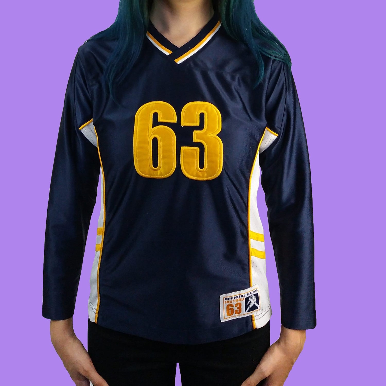 Vintage 90's jersey top, 3/4 sleeves, number 63 patch, navy, white and yellow.