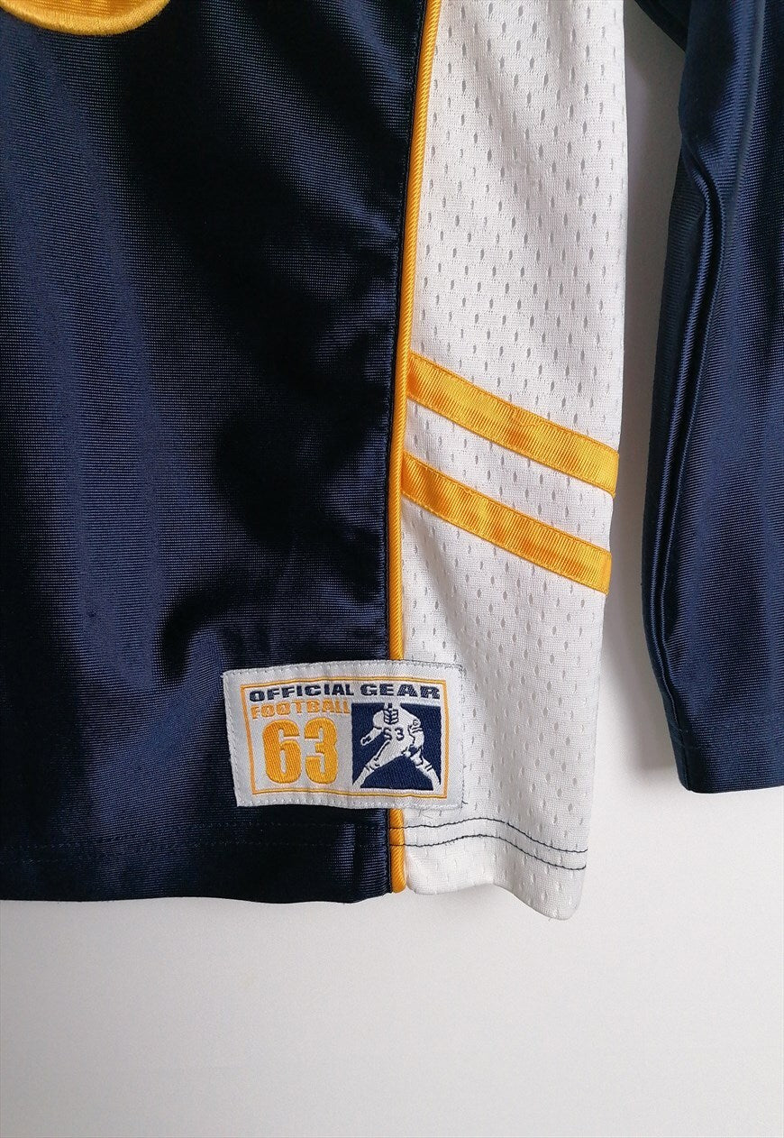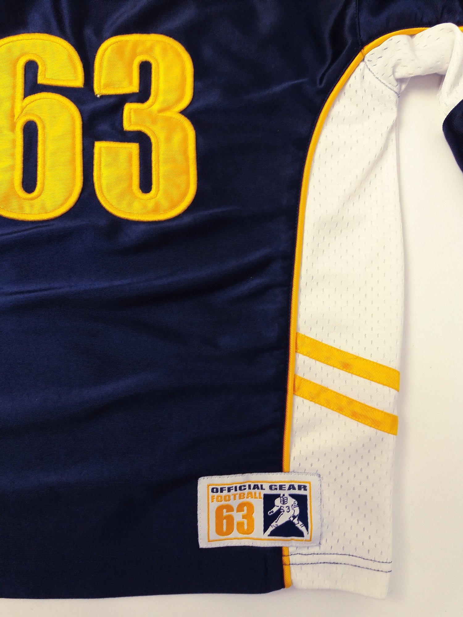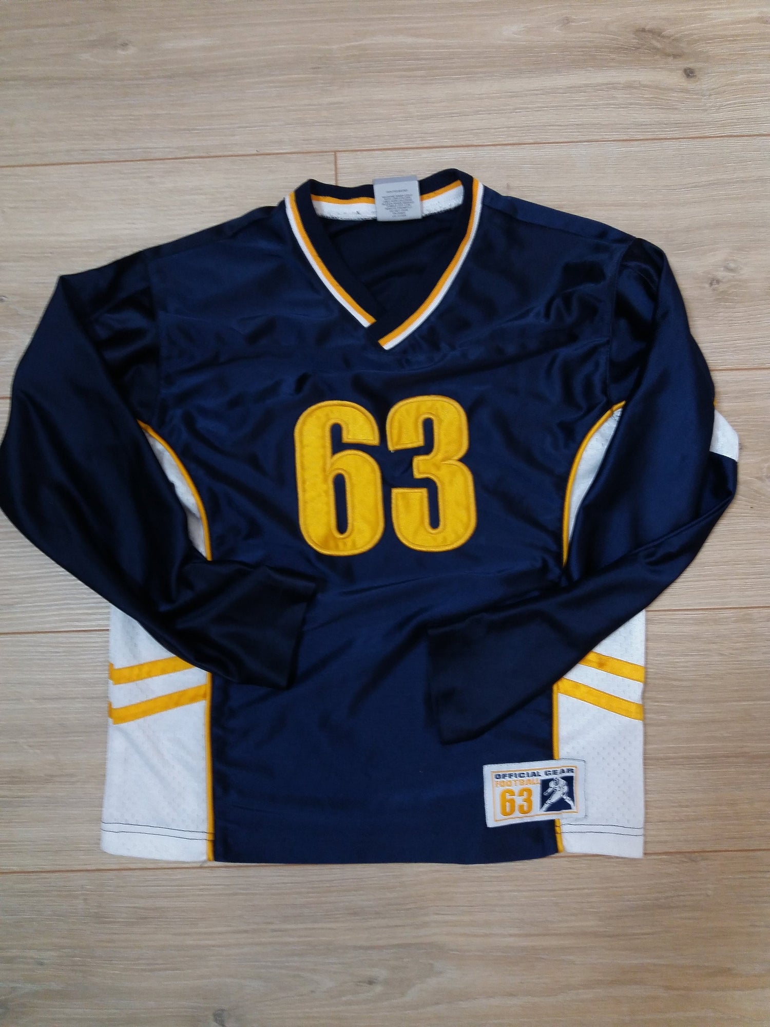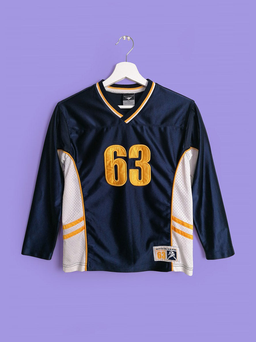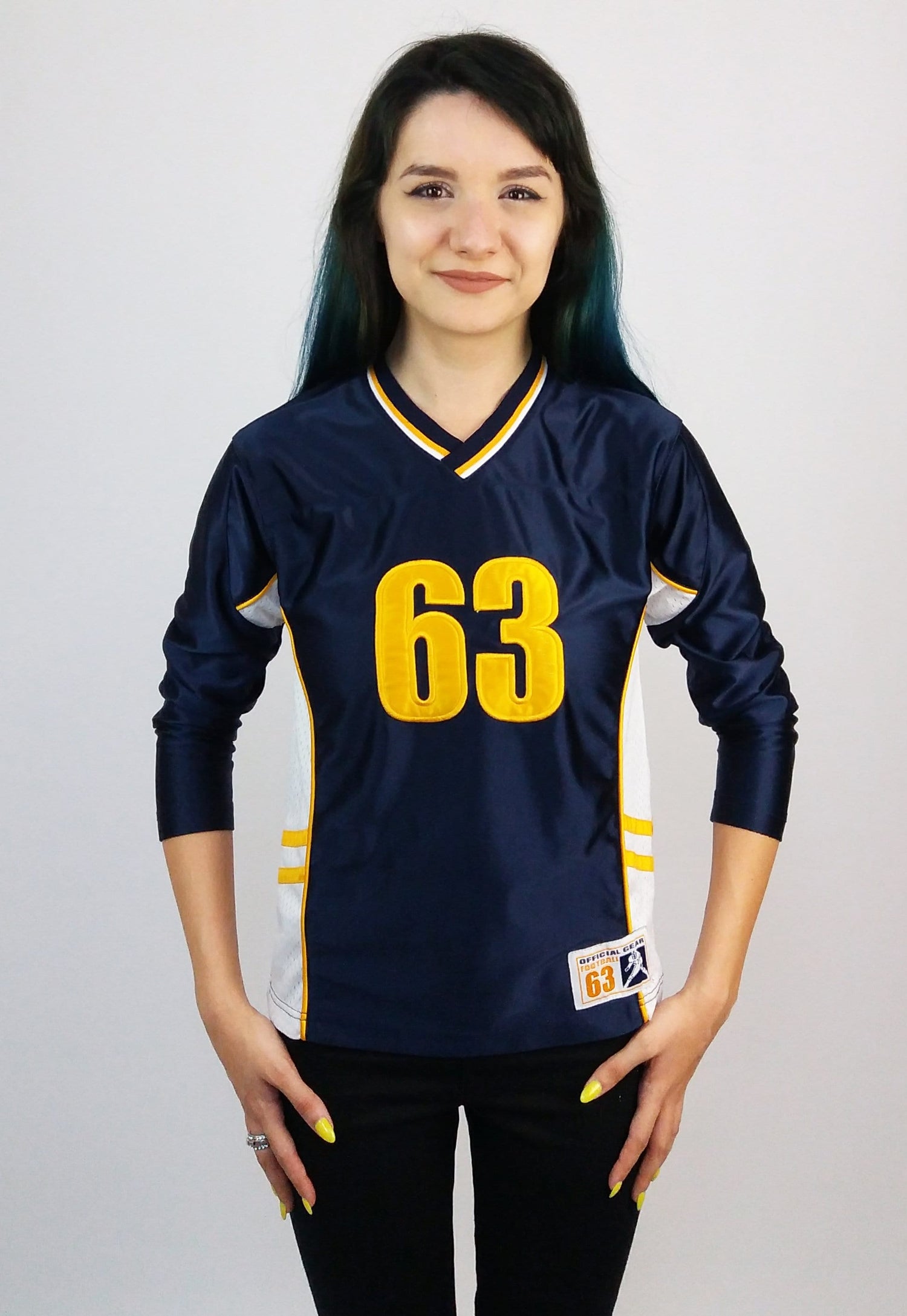 Vintage 90's jersey top, 3/4 sleeves, number 63 patch, navy, white and yellow.