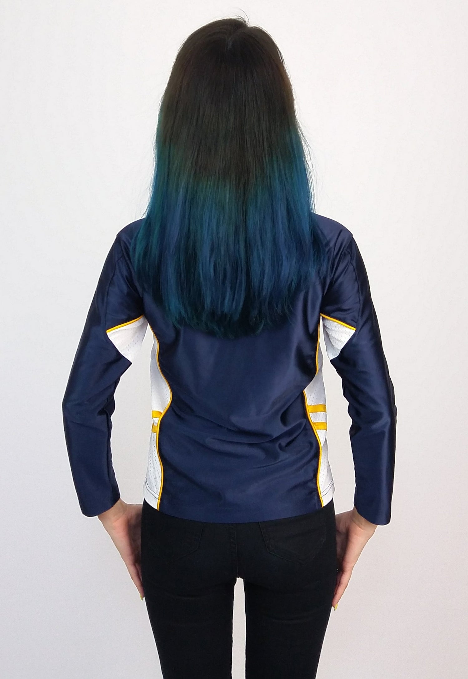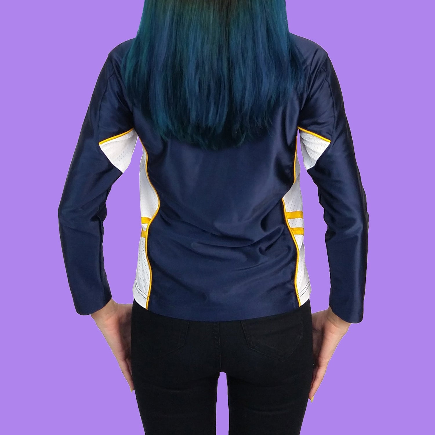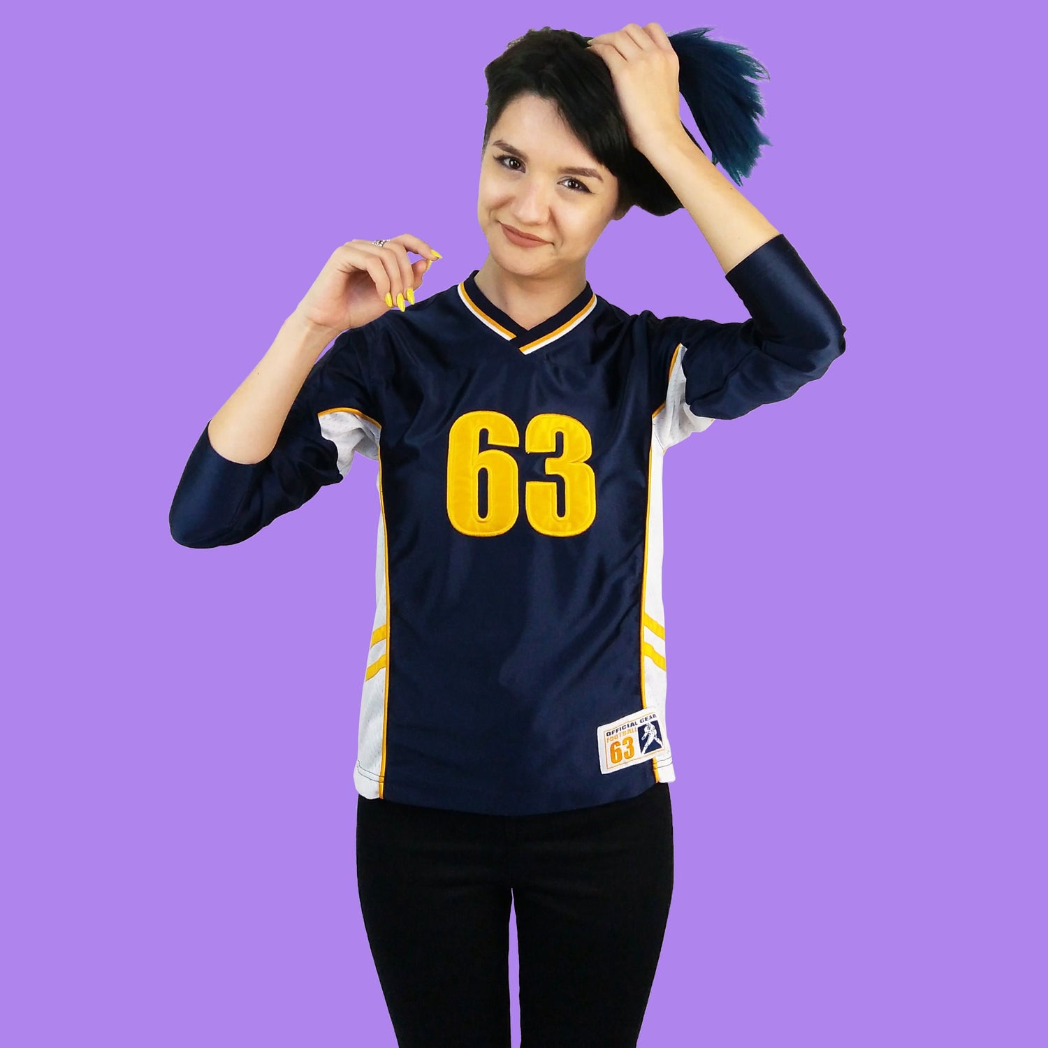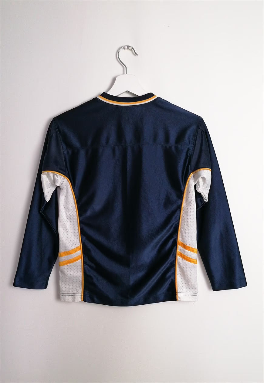 Vintage 90's jersey top, 3/4 sleeves, number 63 patch, navy, white and yellow.