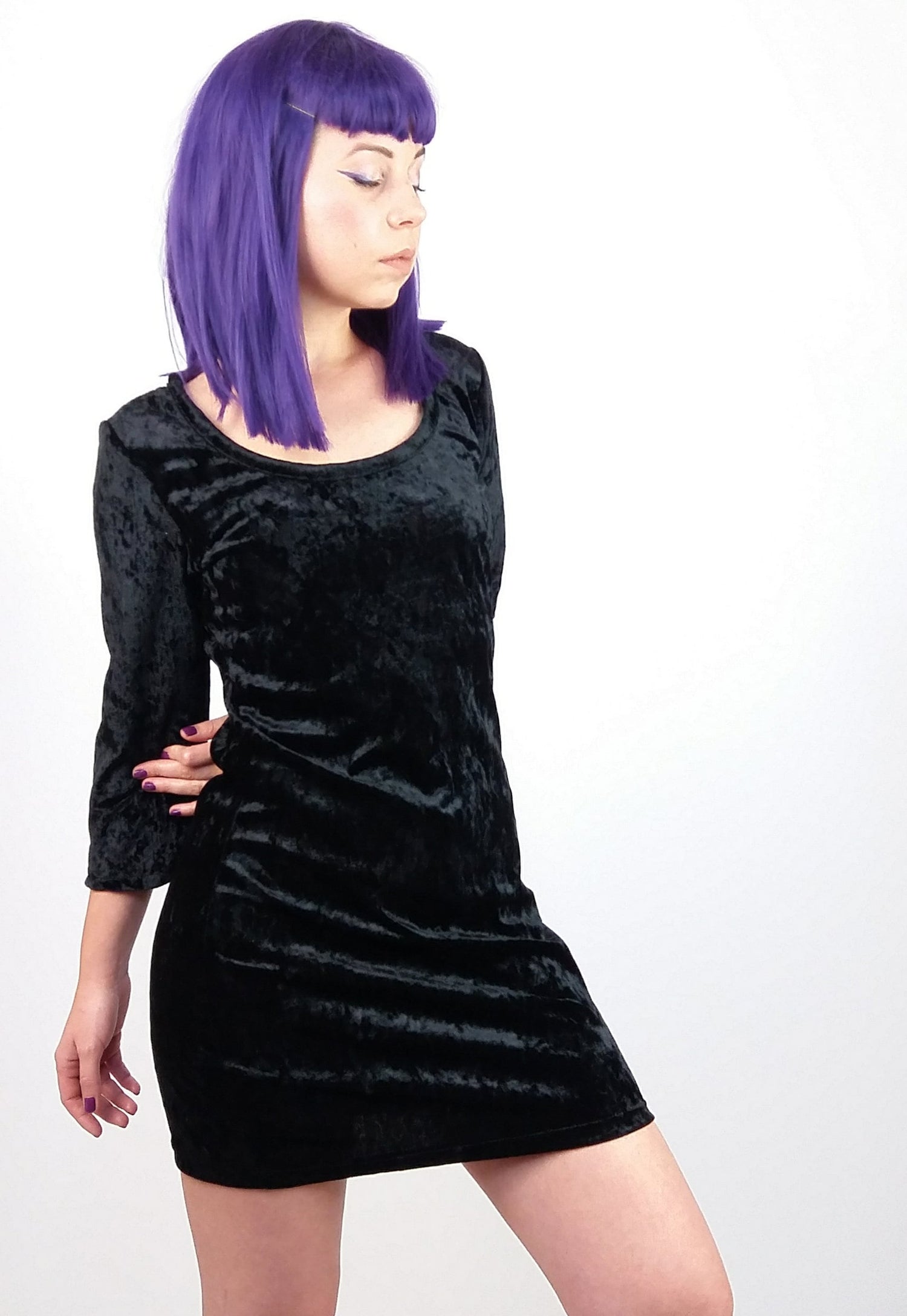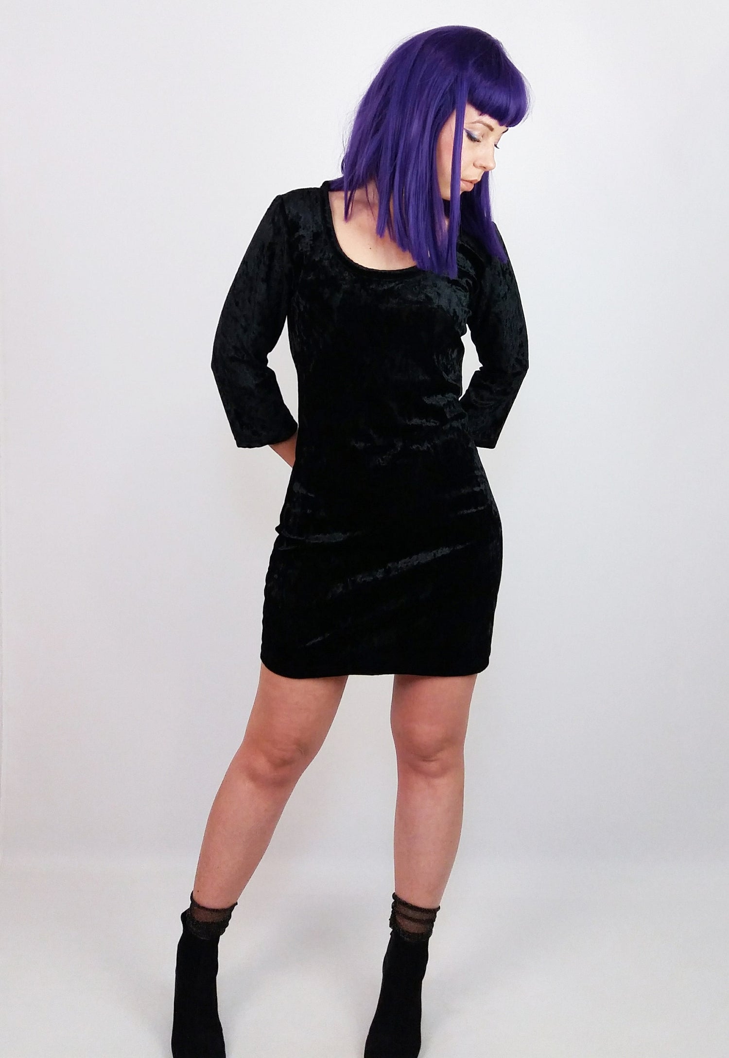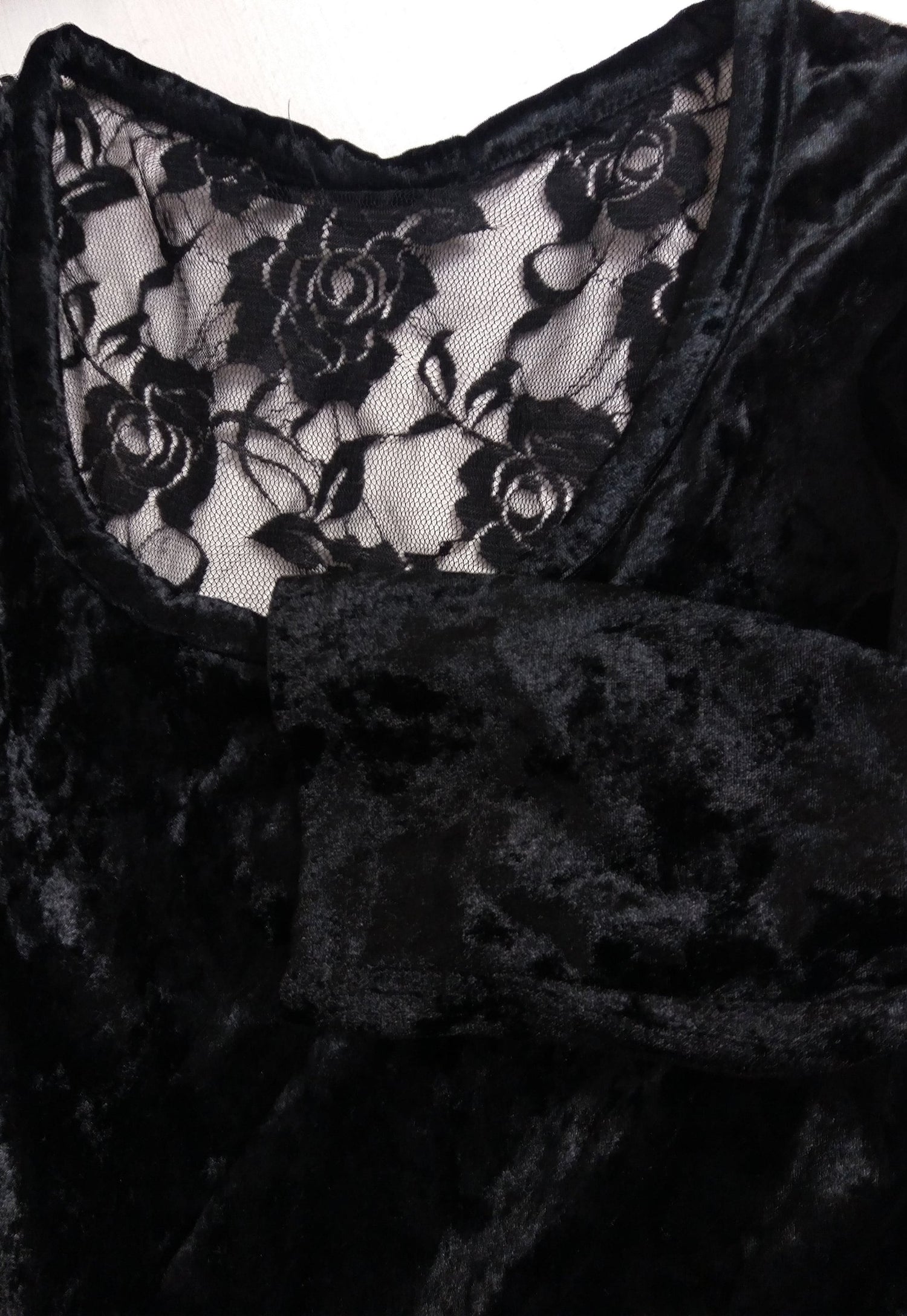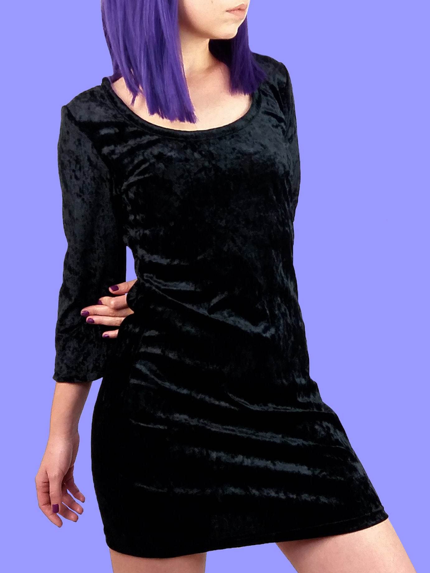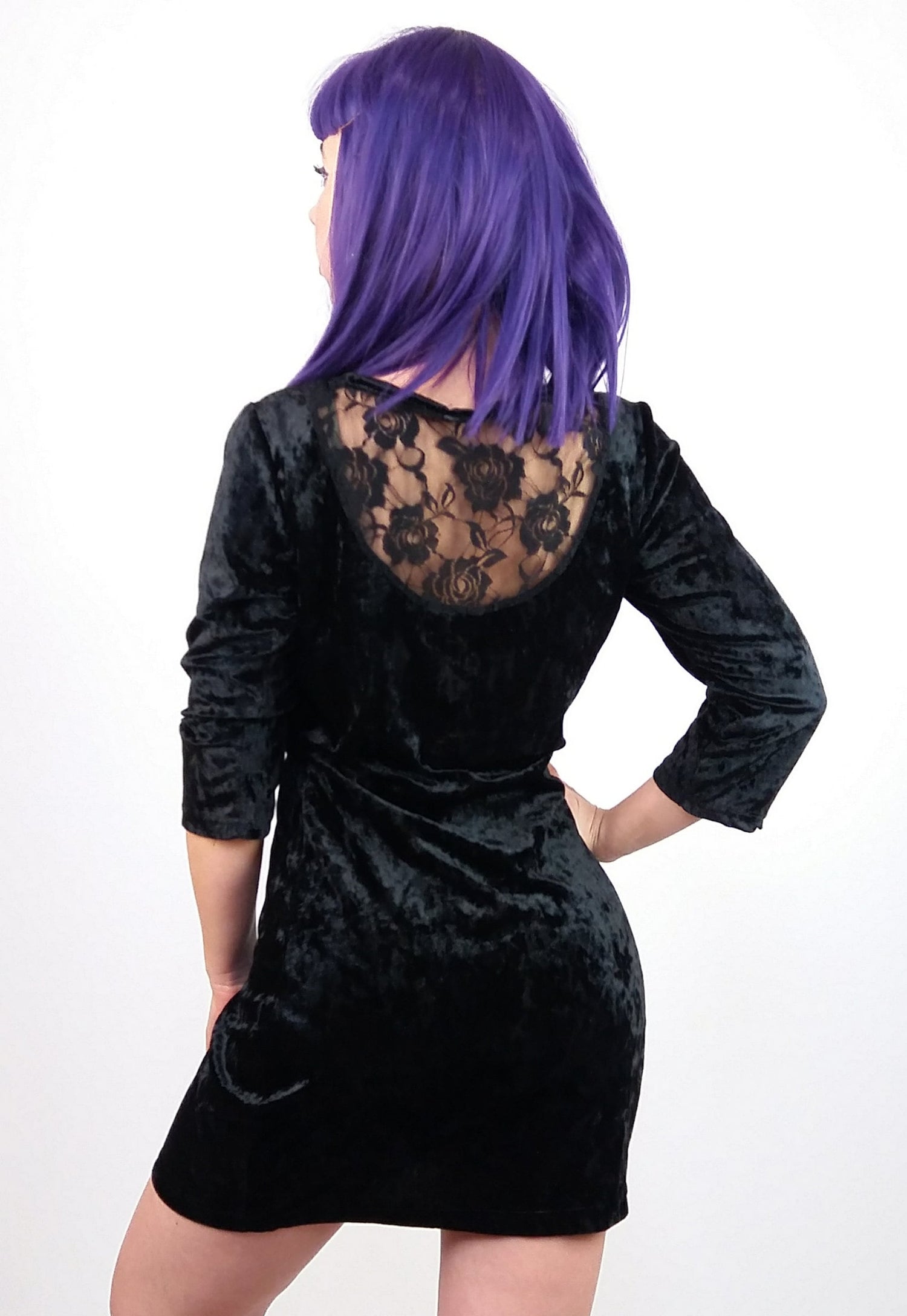 Y2K Black Velour Mini Dress Lace Back - size S-M