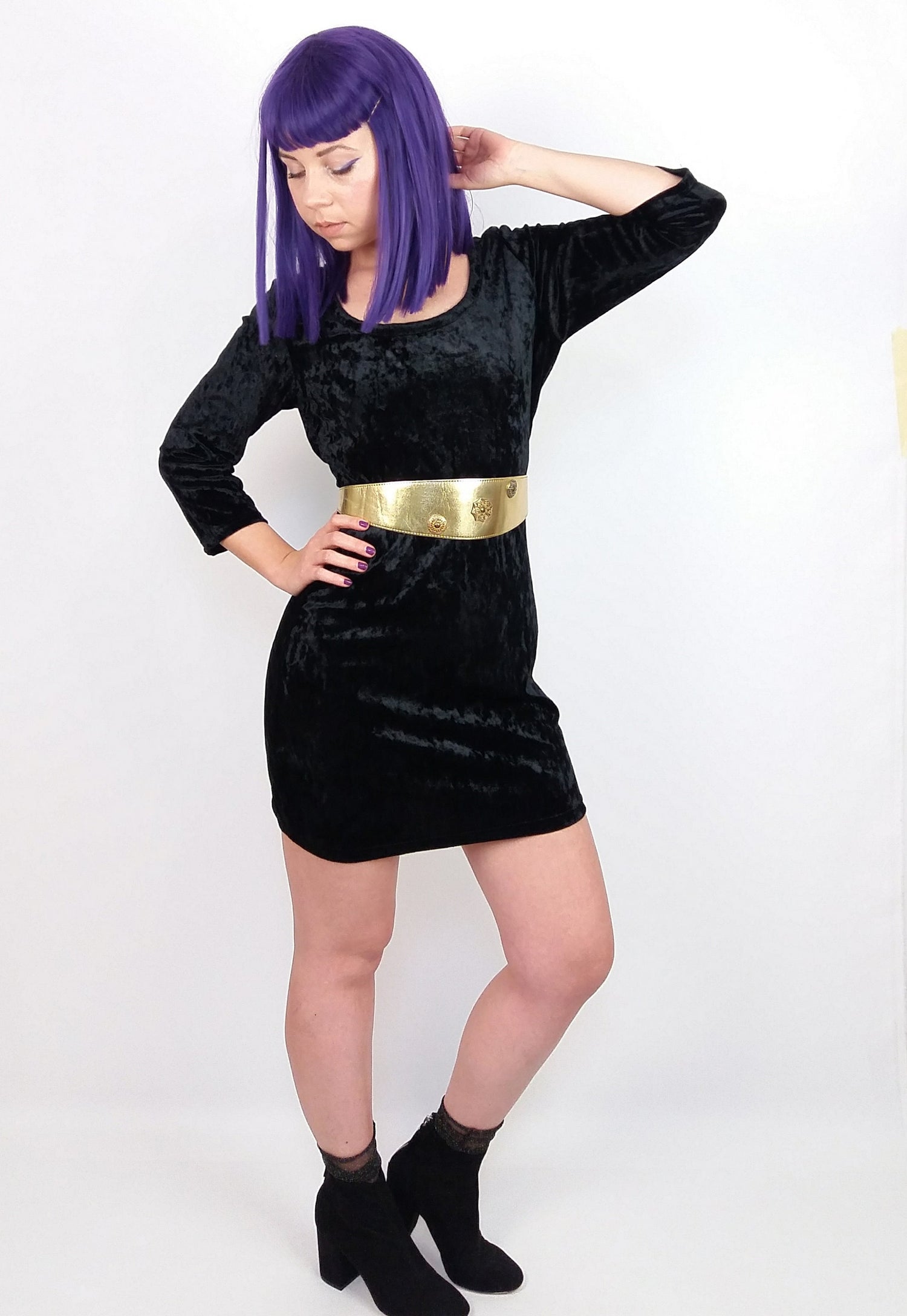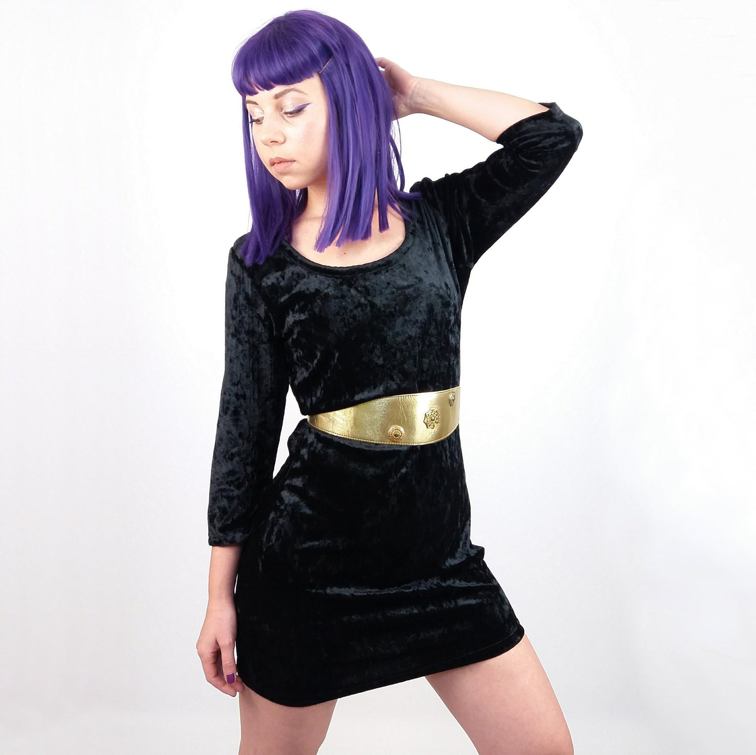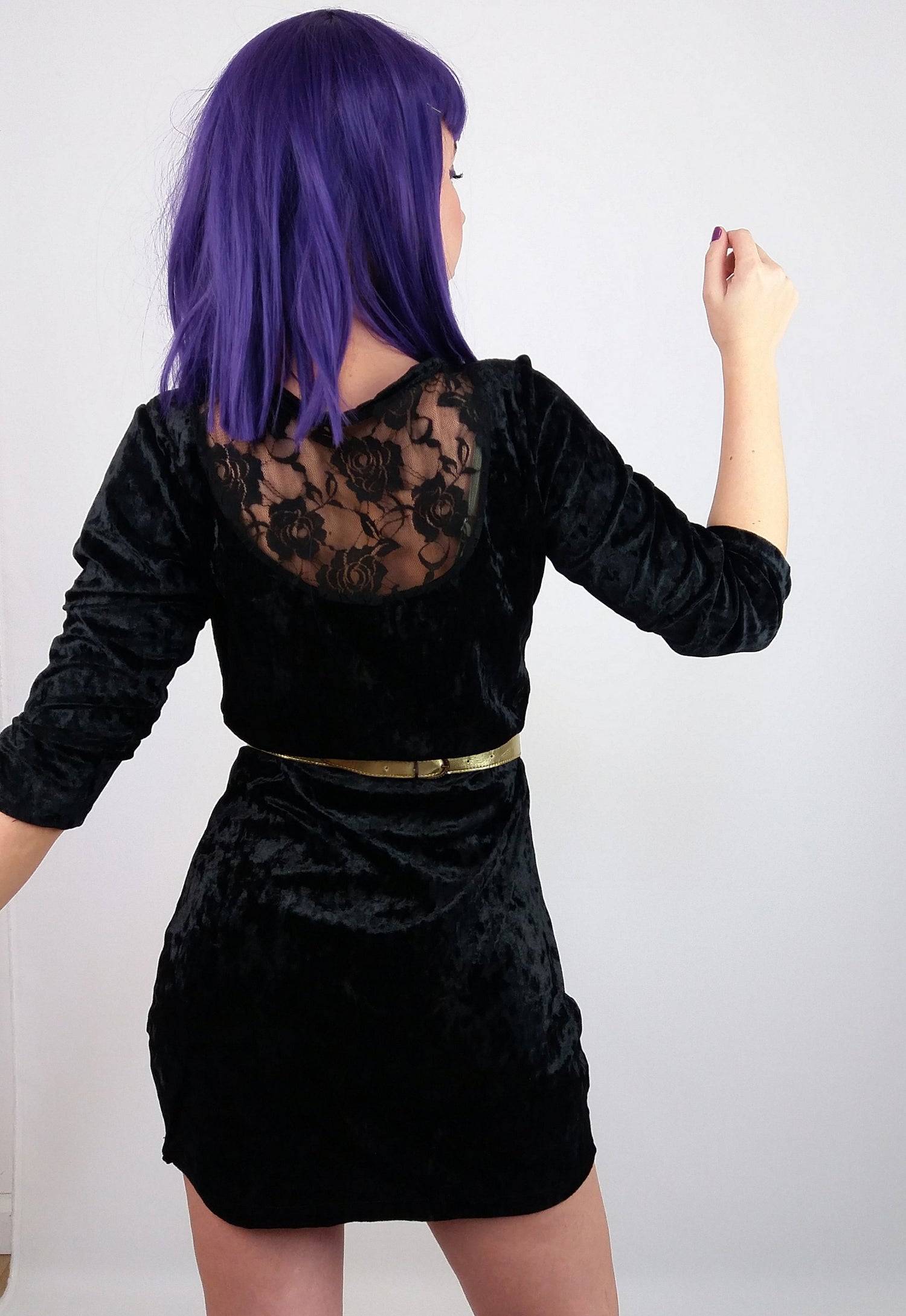 Body-flattering velour mini dress, stretch fabric, lace back detail. Belt not included.