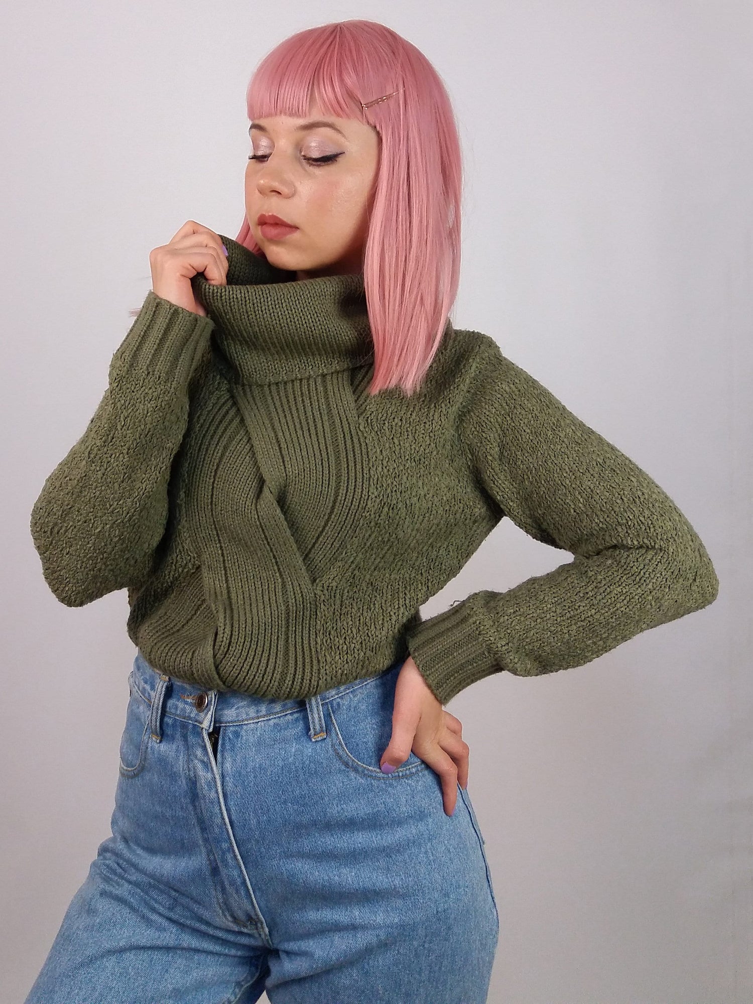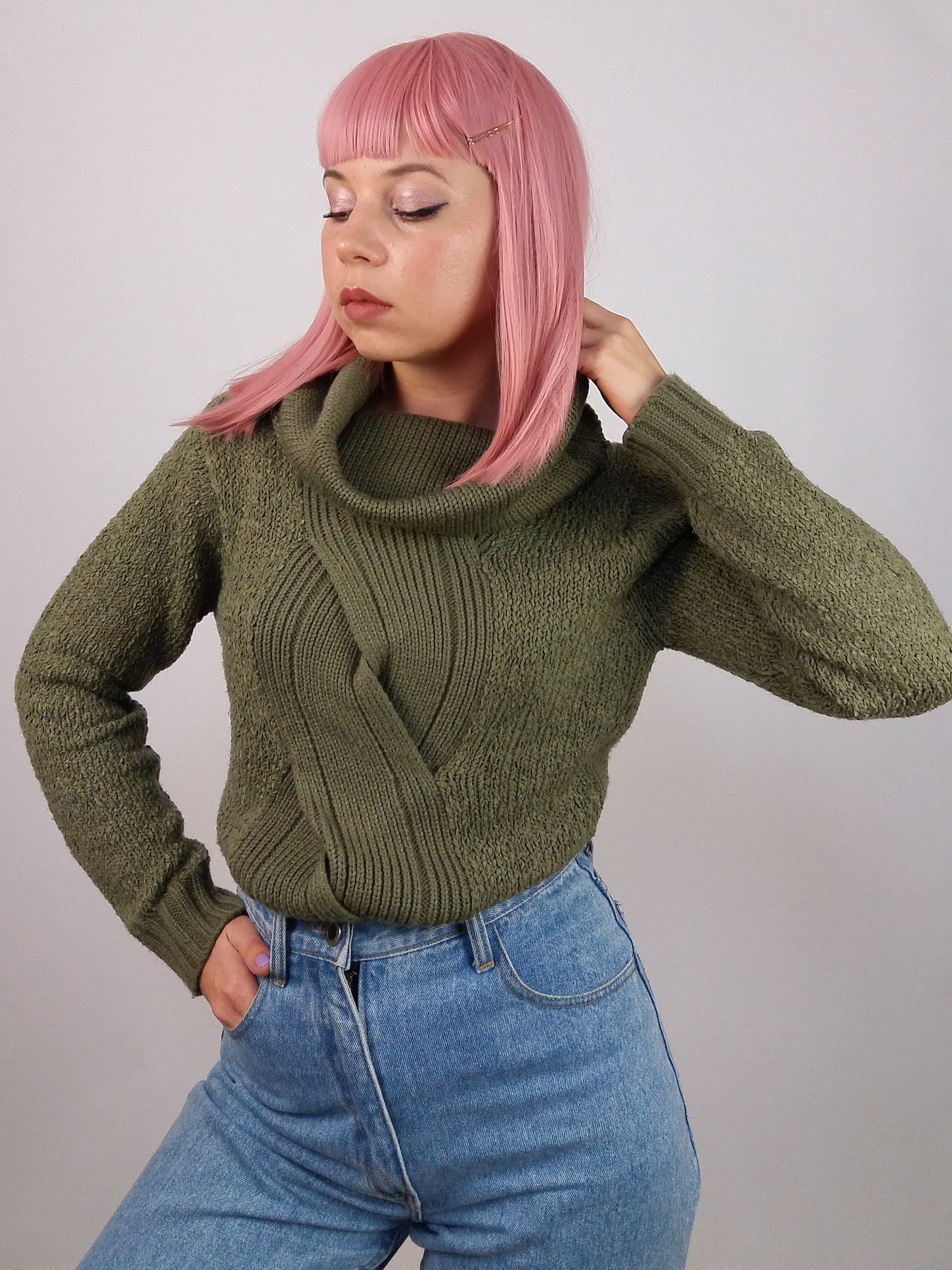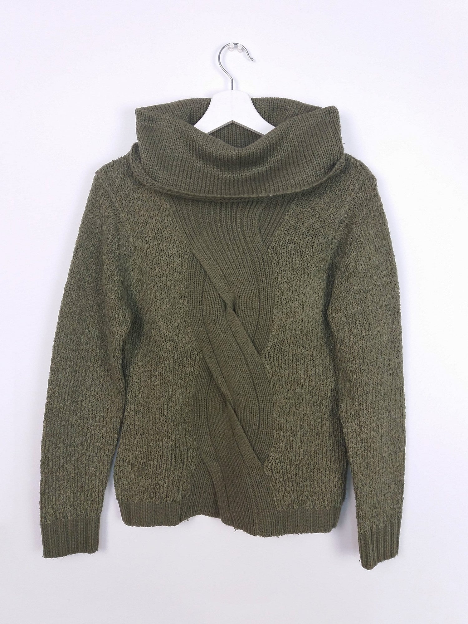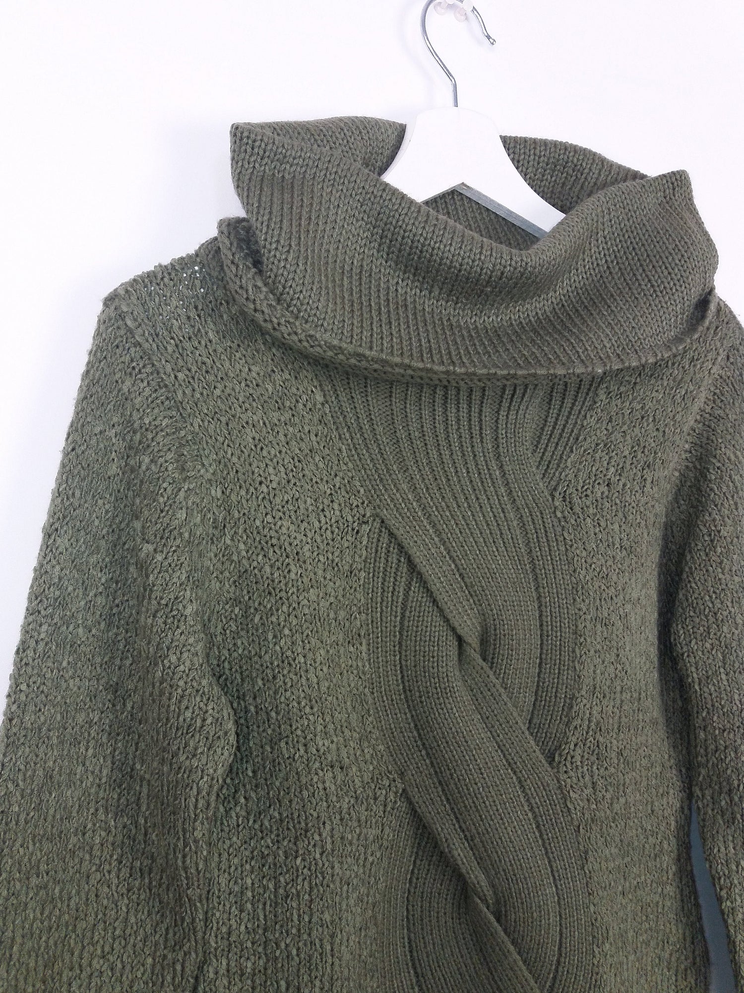 Cable Knit Large Cowl Neck Sweater Olive Green ~ size S-M