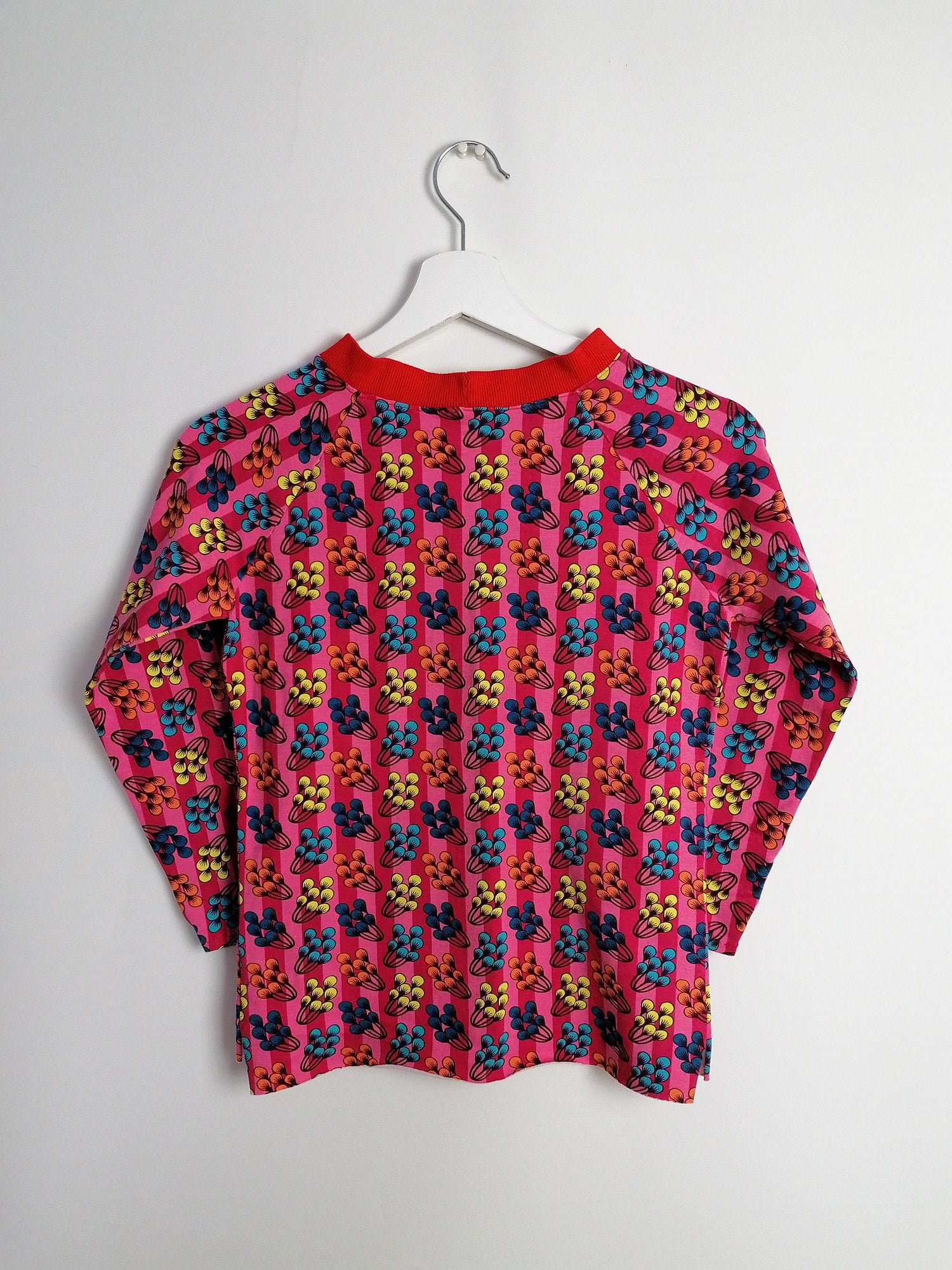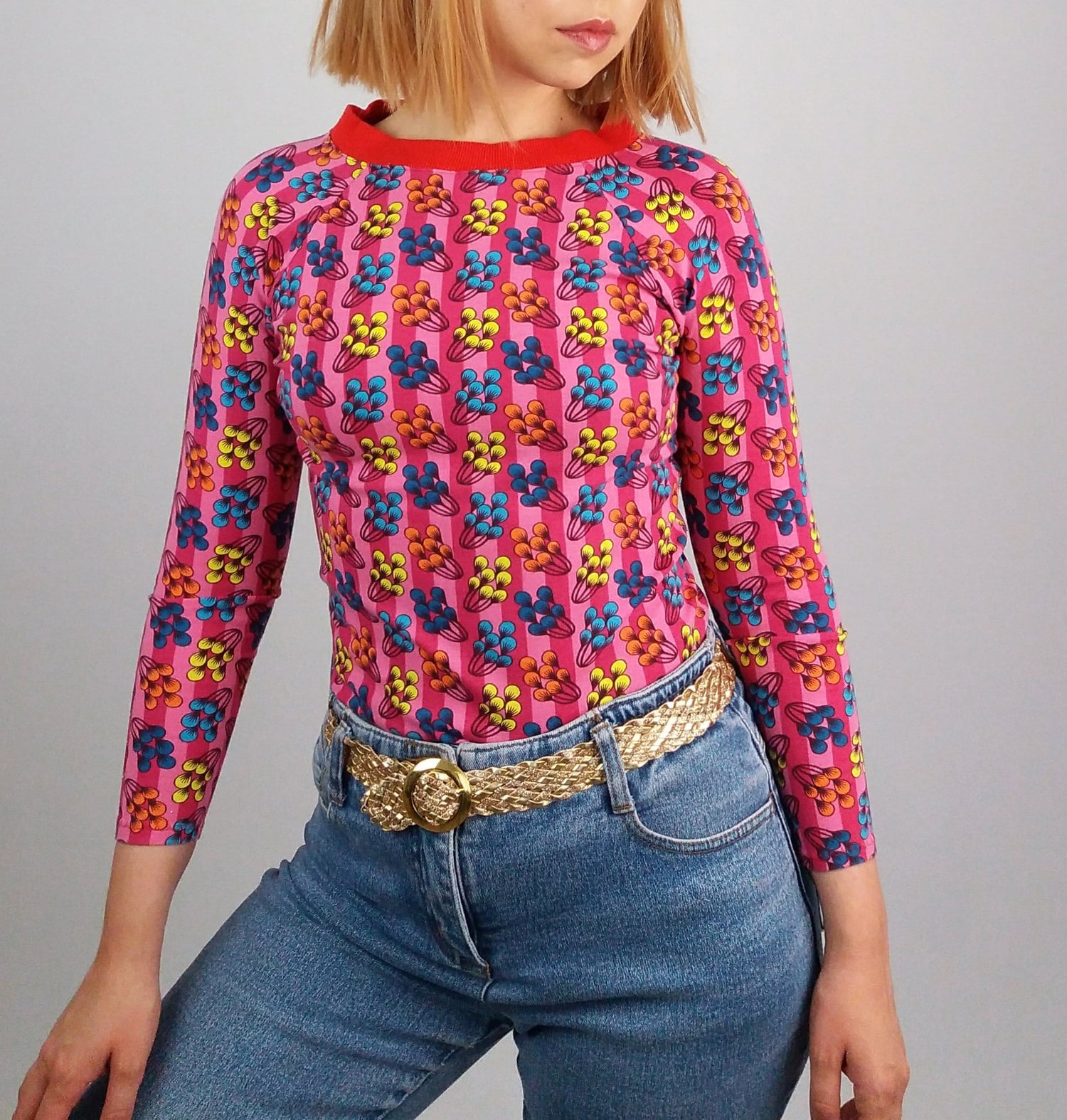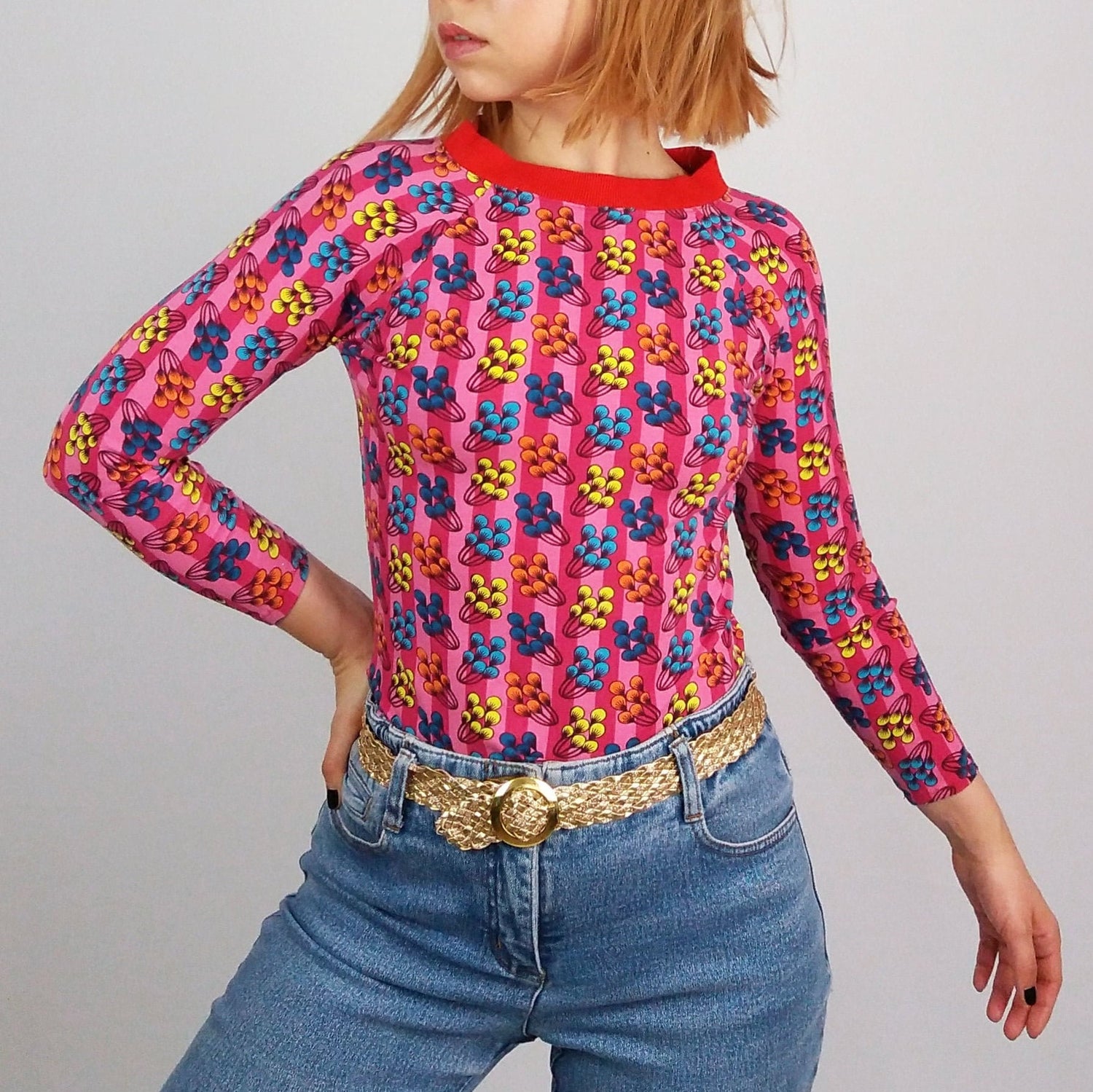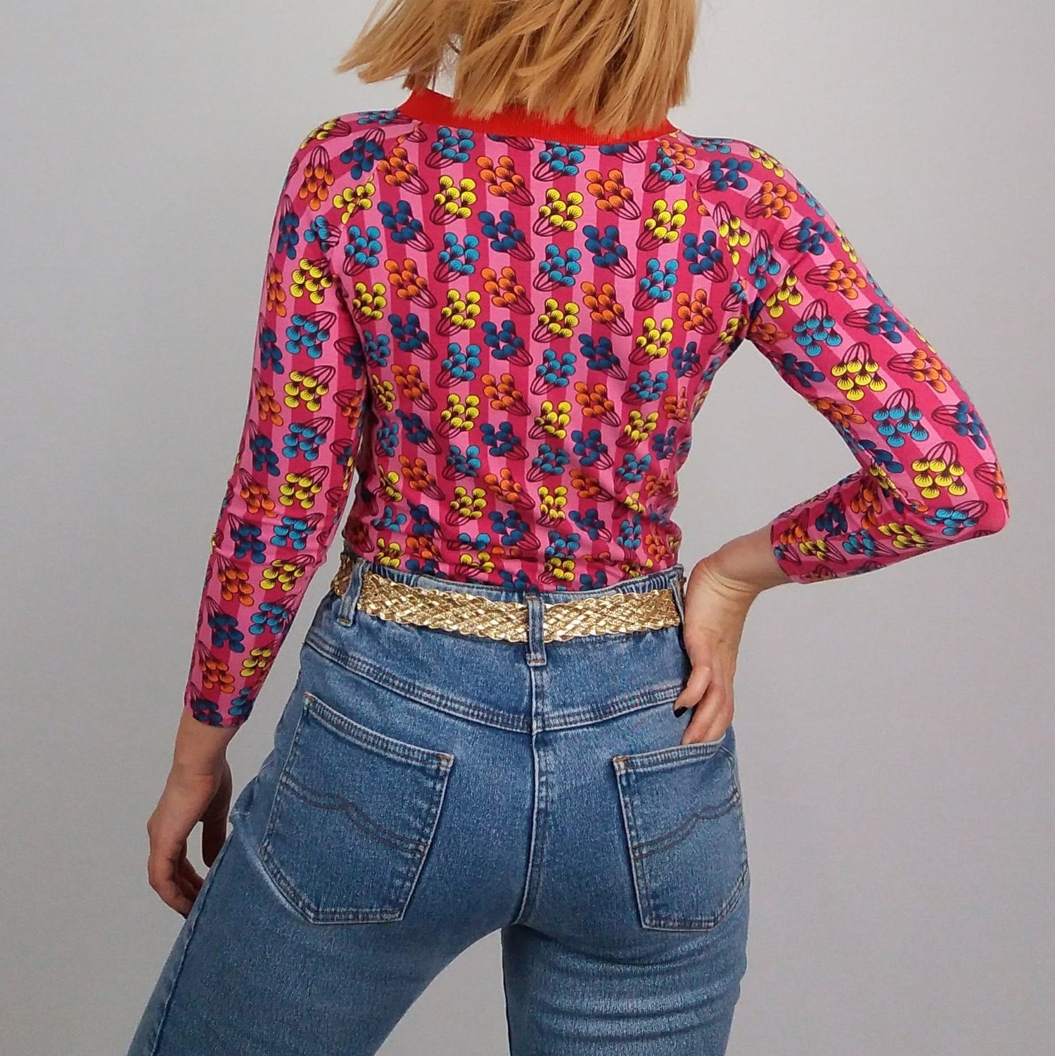 Gorgeous handmade vintage top, stretch cotton, red cotton knit collar, raw hem.