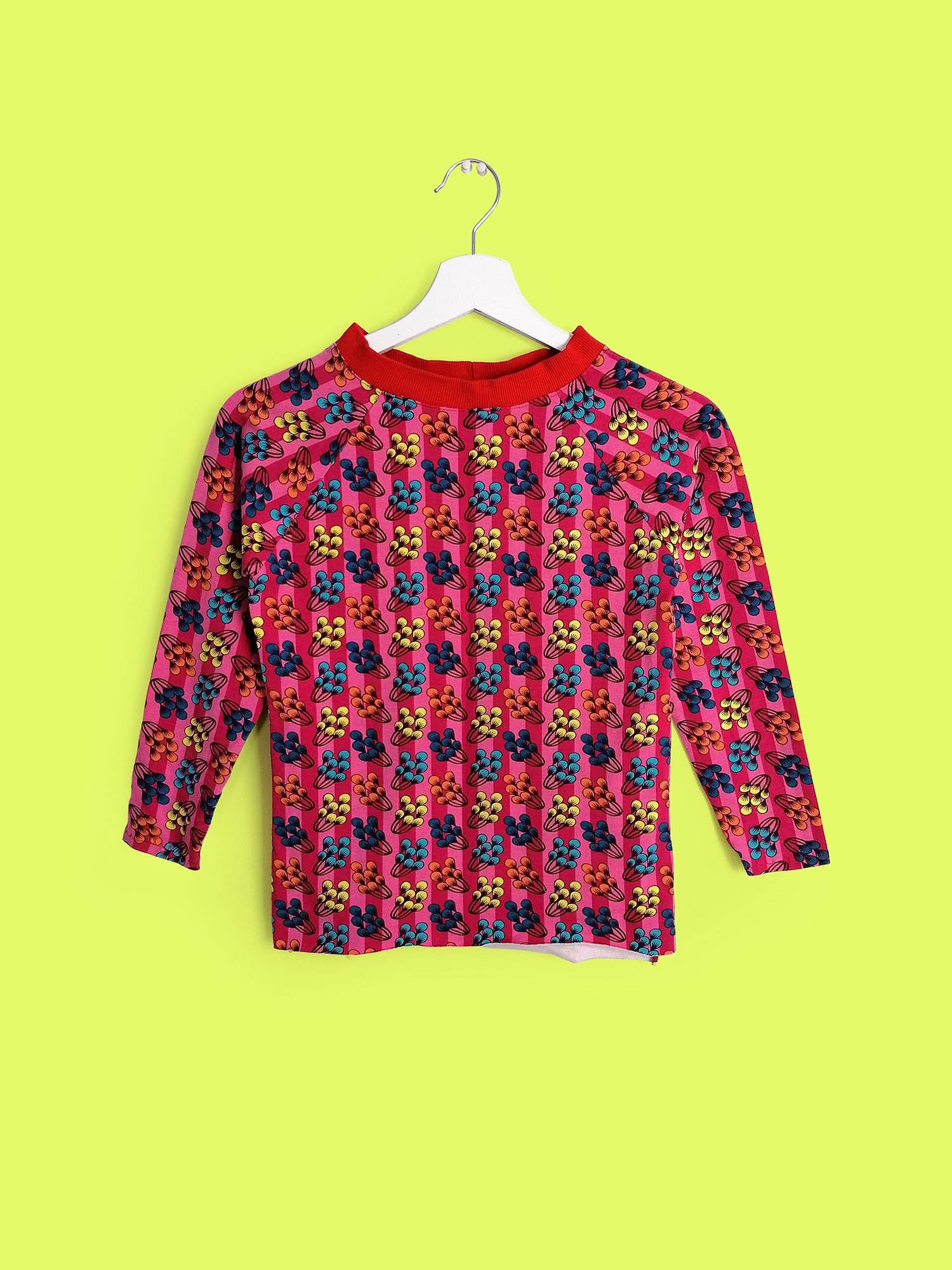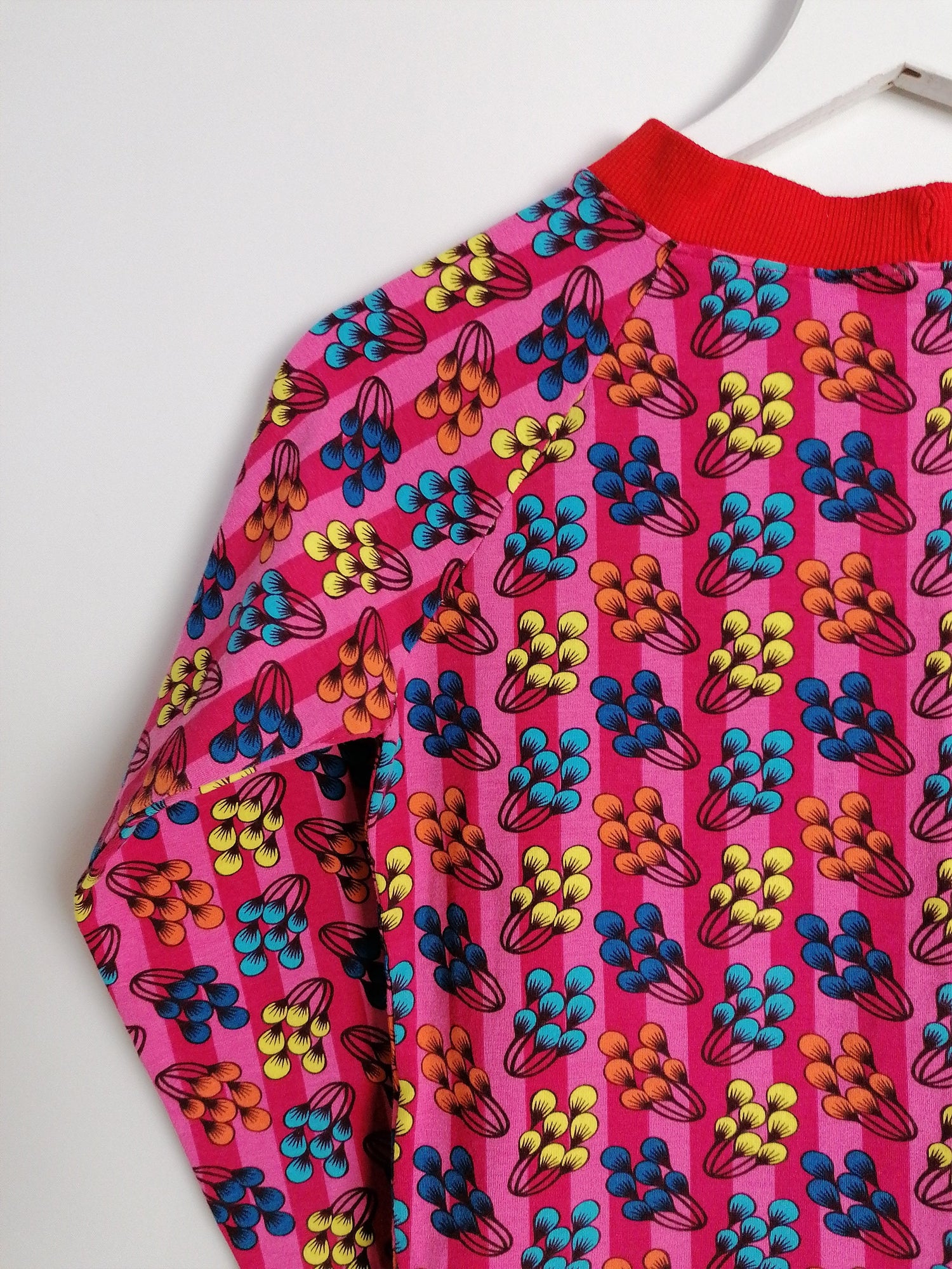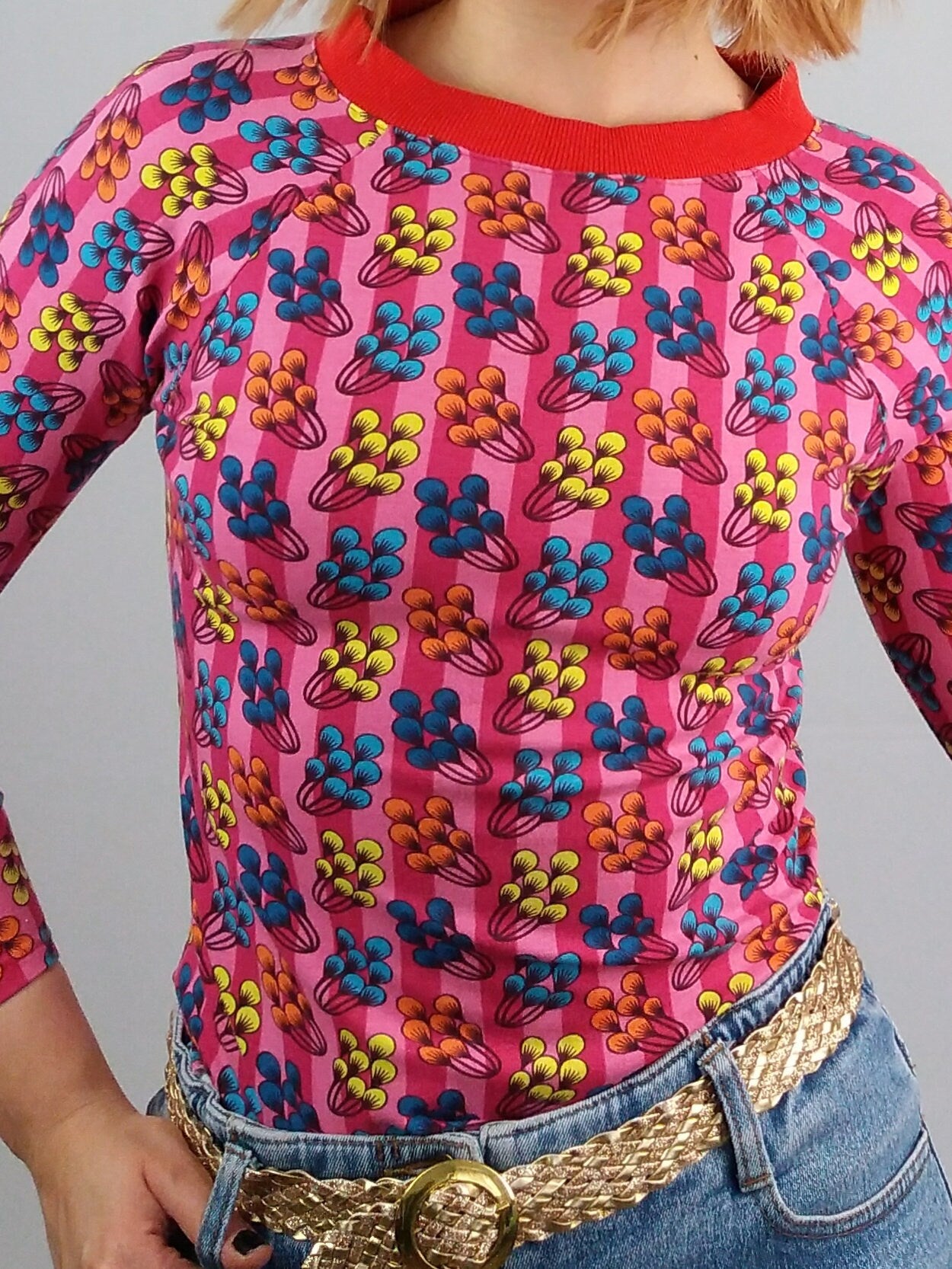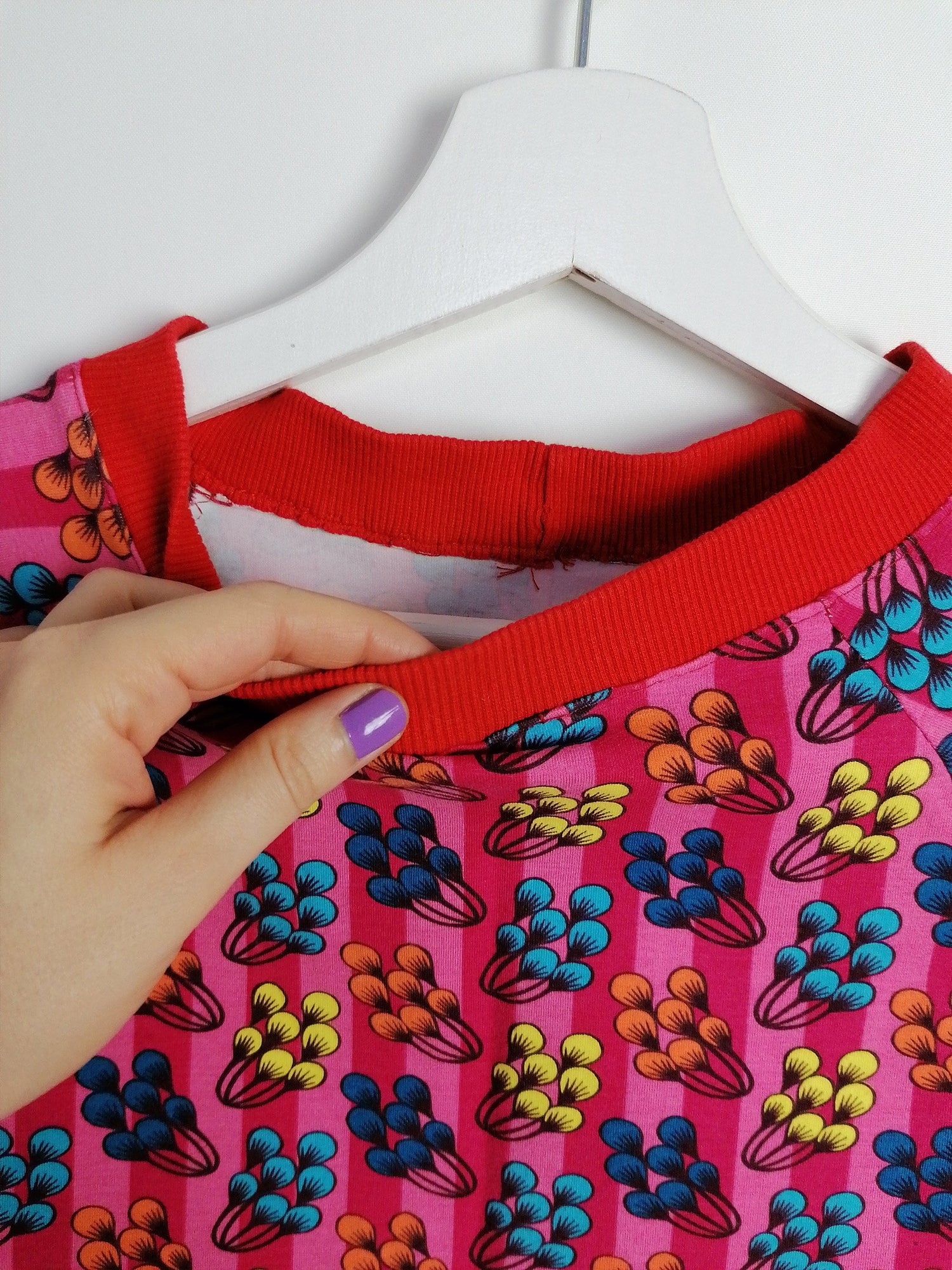 Gorgeous handmade vintage top, stretch cotton, red cotton knit collar, raw hem.