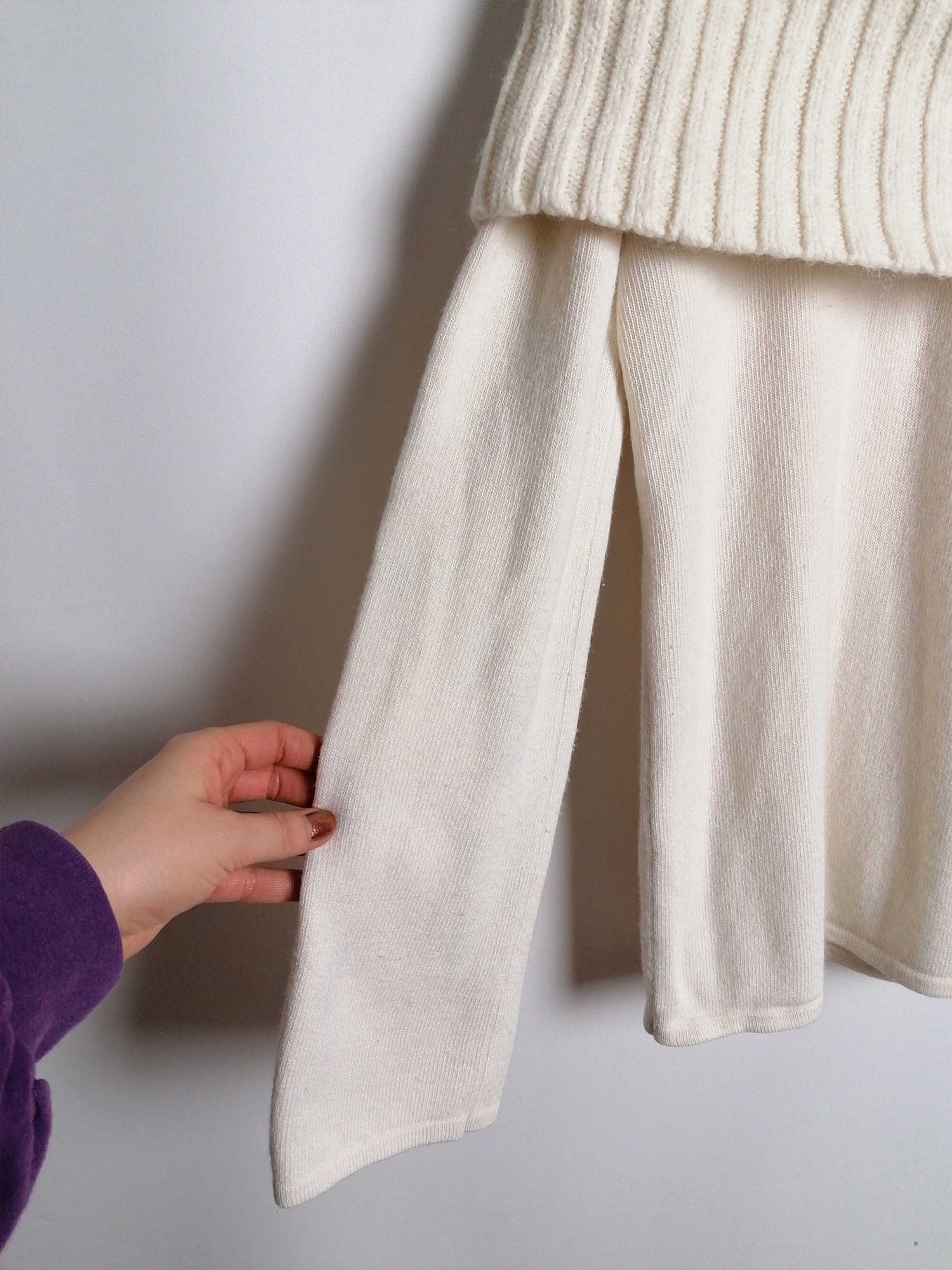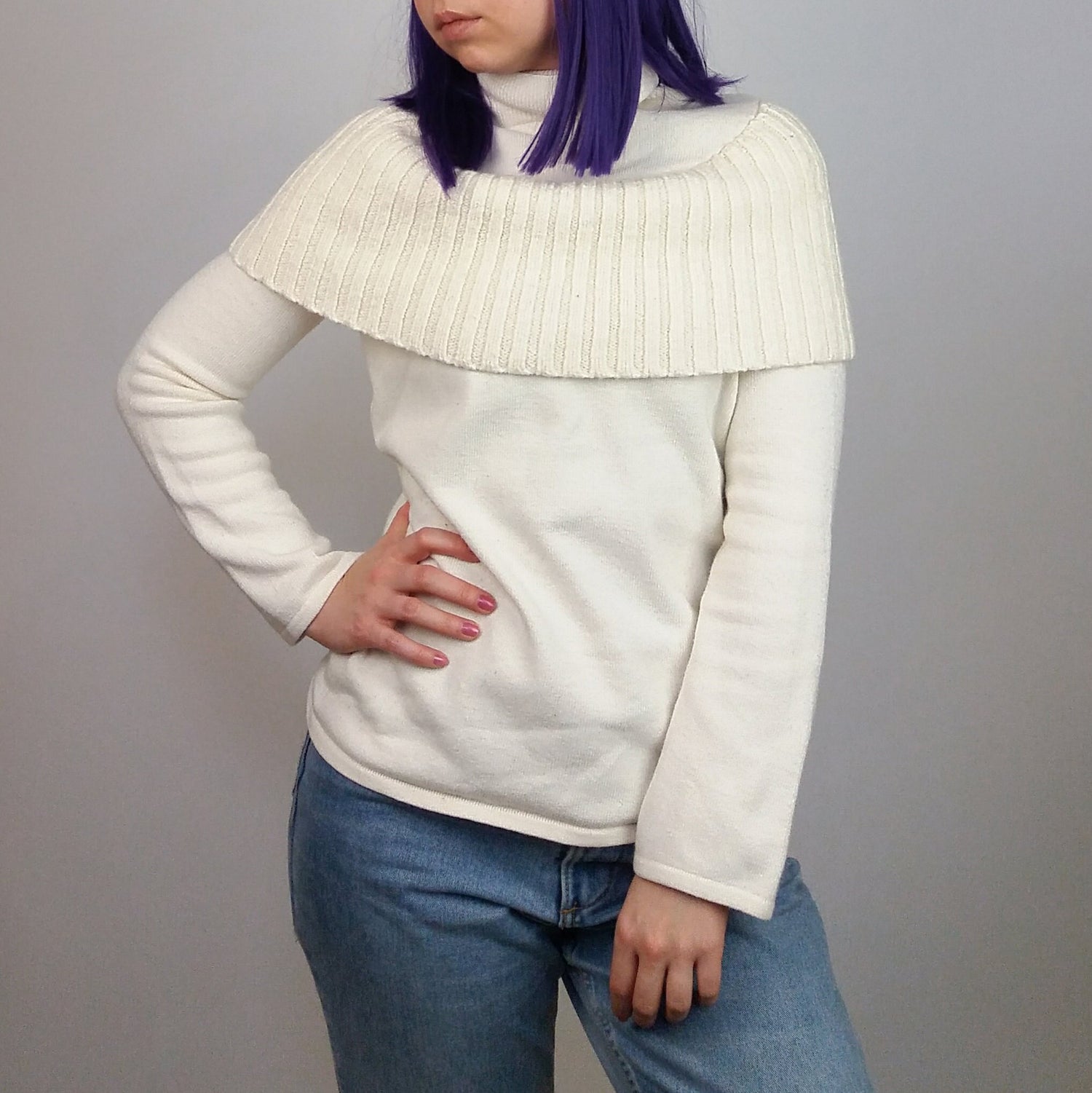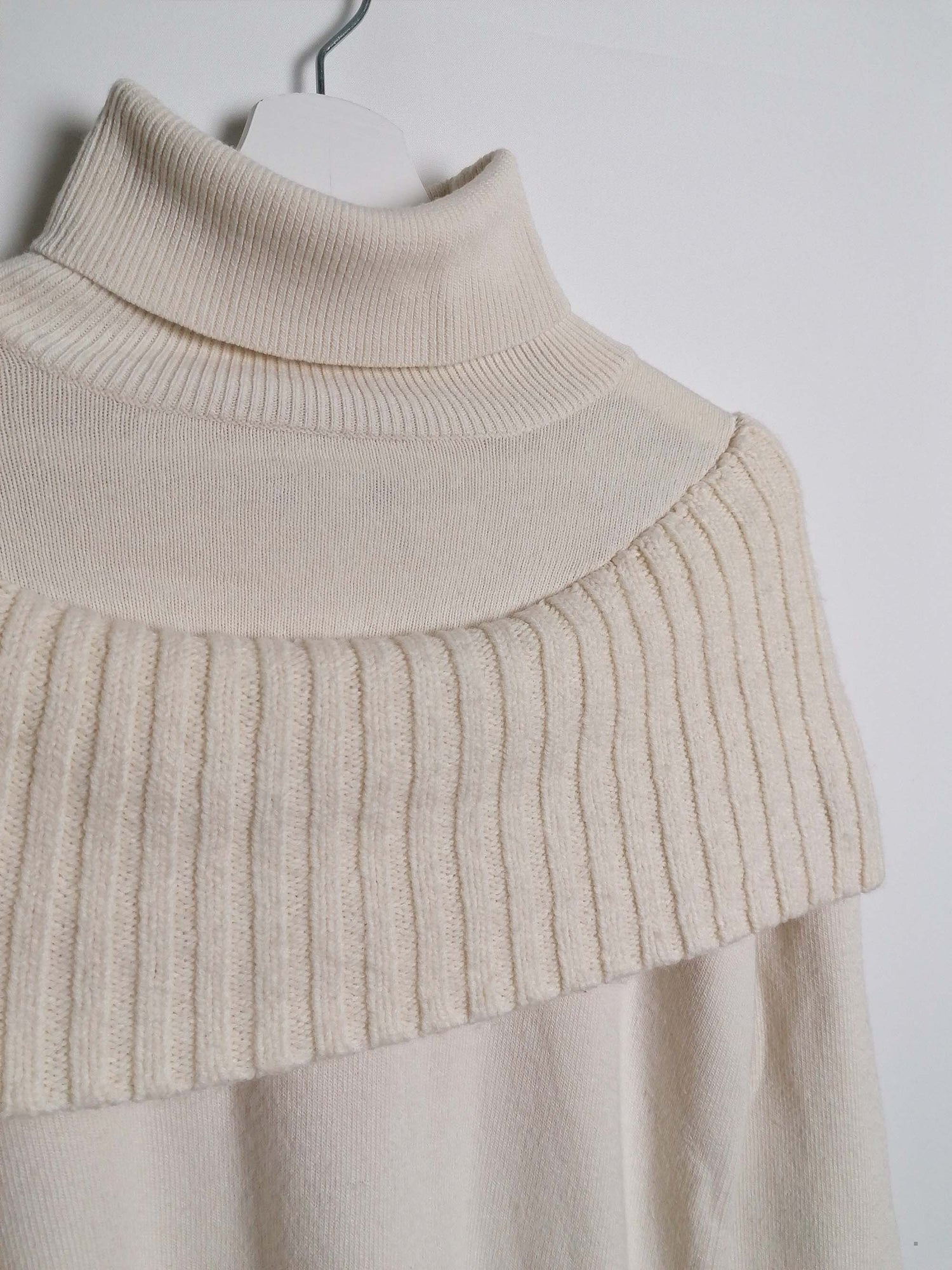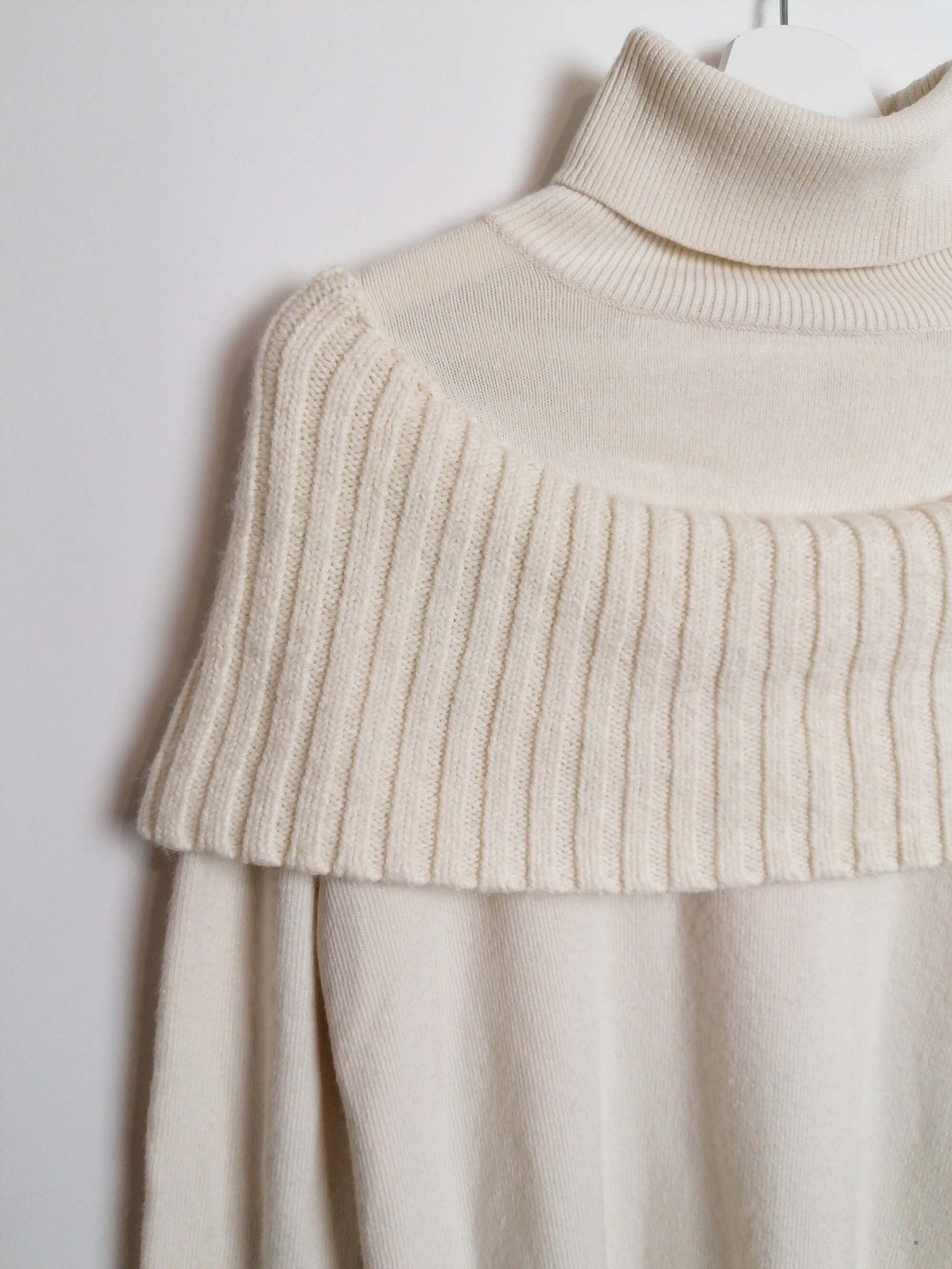 Gorgeous 90's vintage MANGO turtleneck jumper, buttery-white colour, beautiful faux off-the shoulder collar in heavy knit wool. Slightly flared sleeves, unique cut.