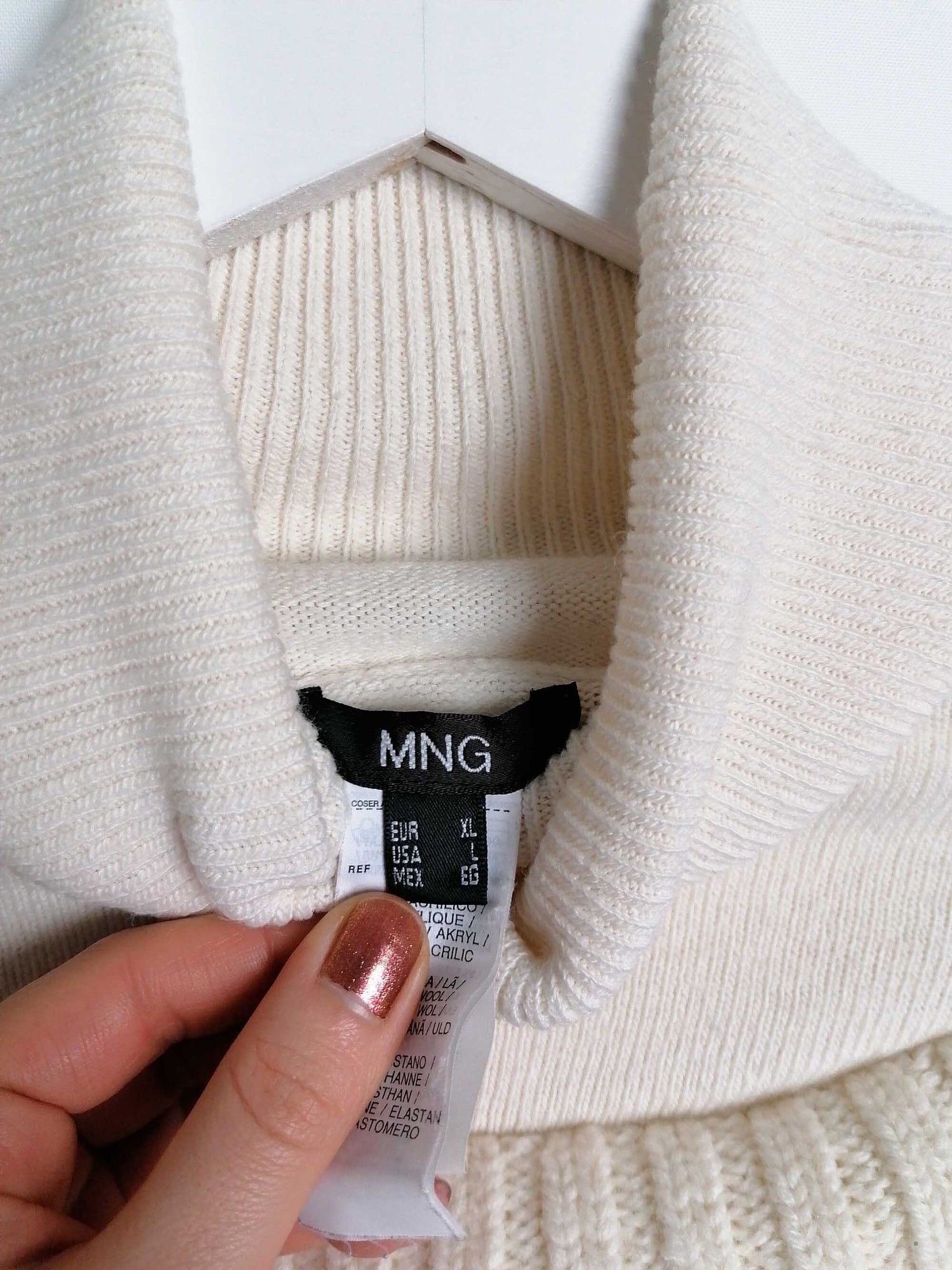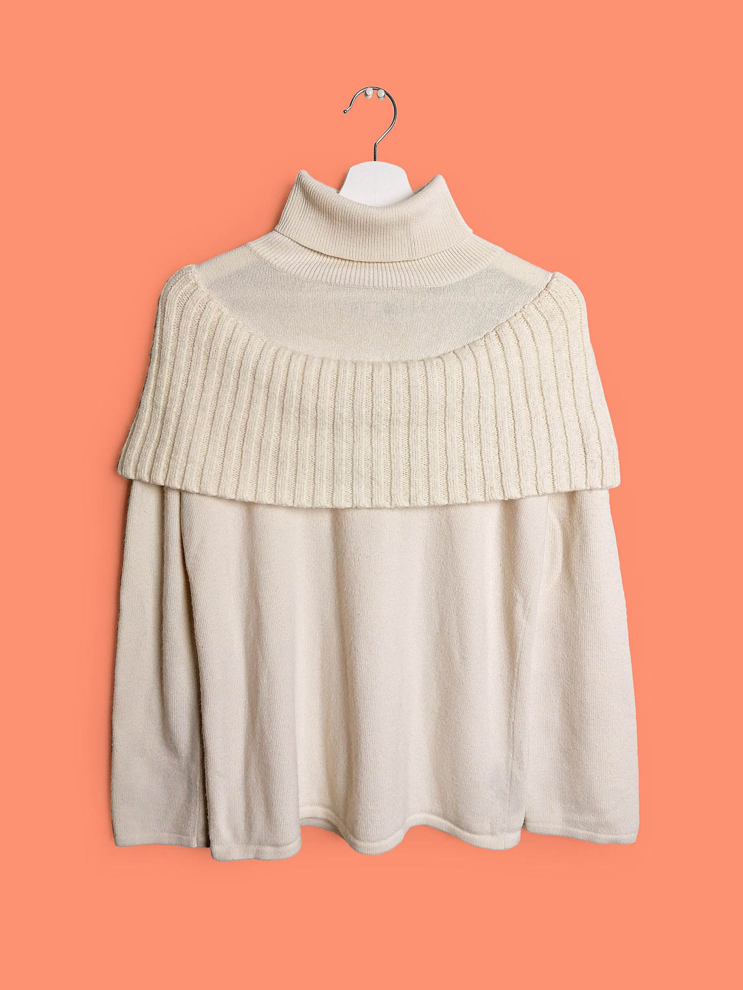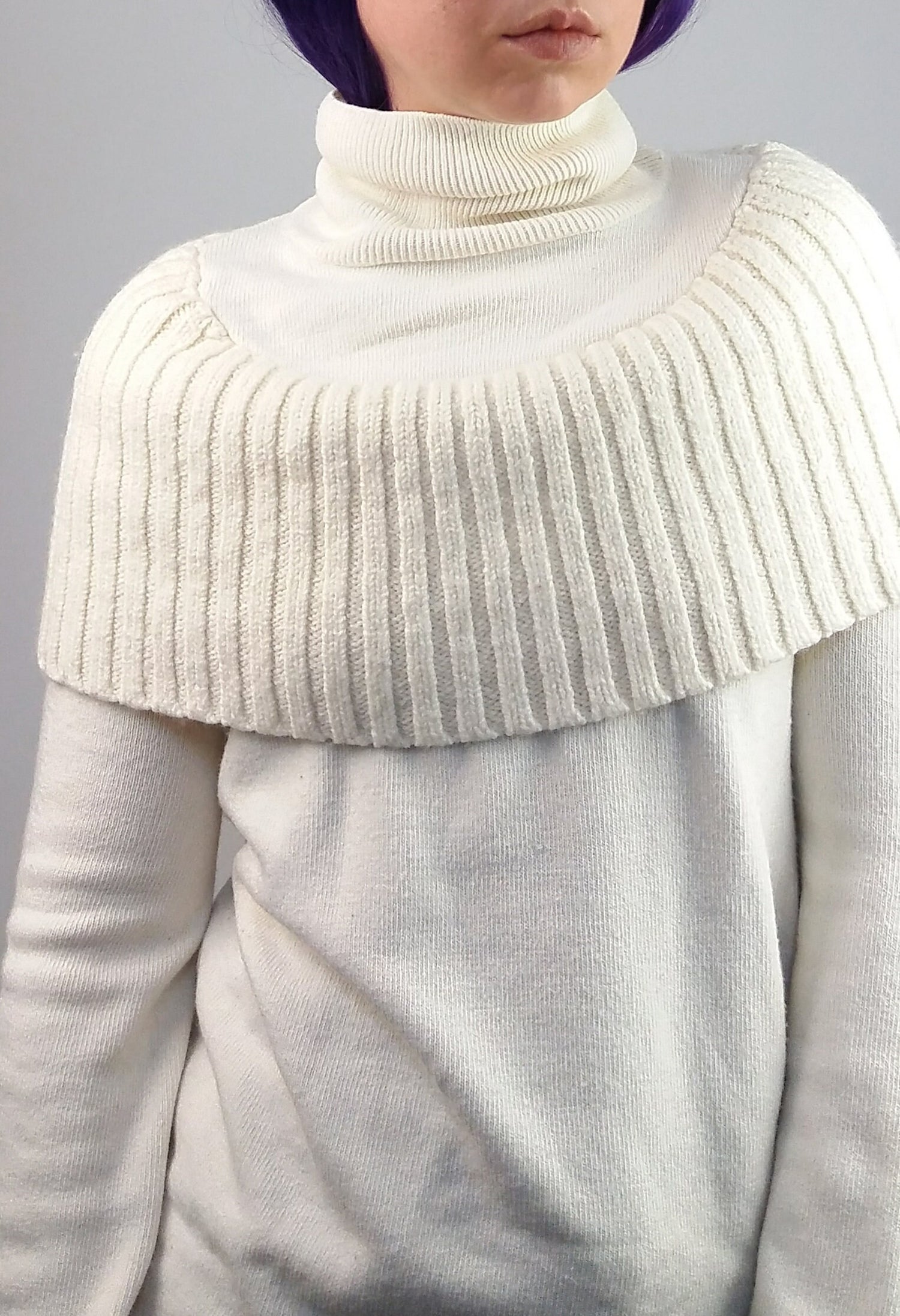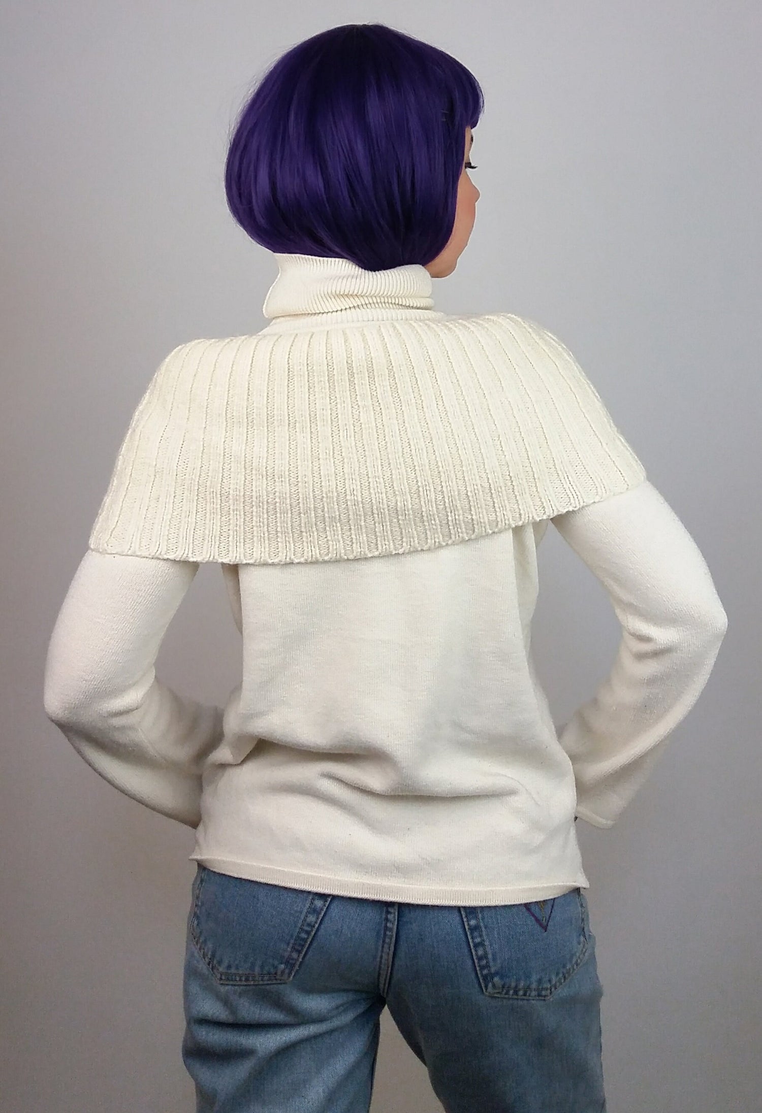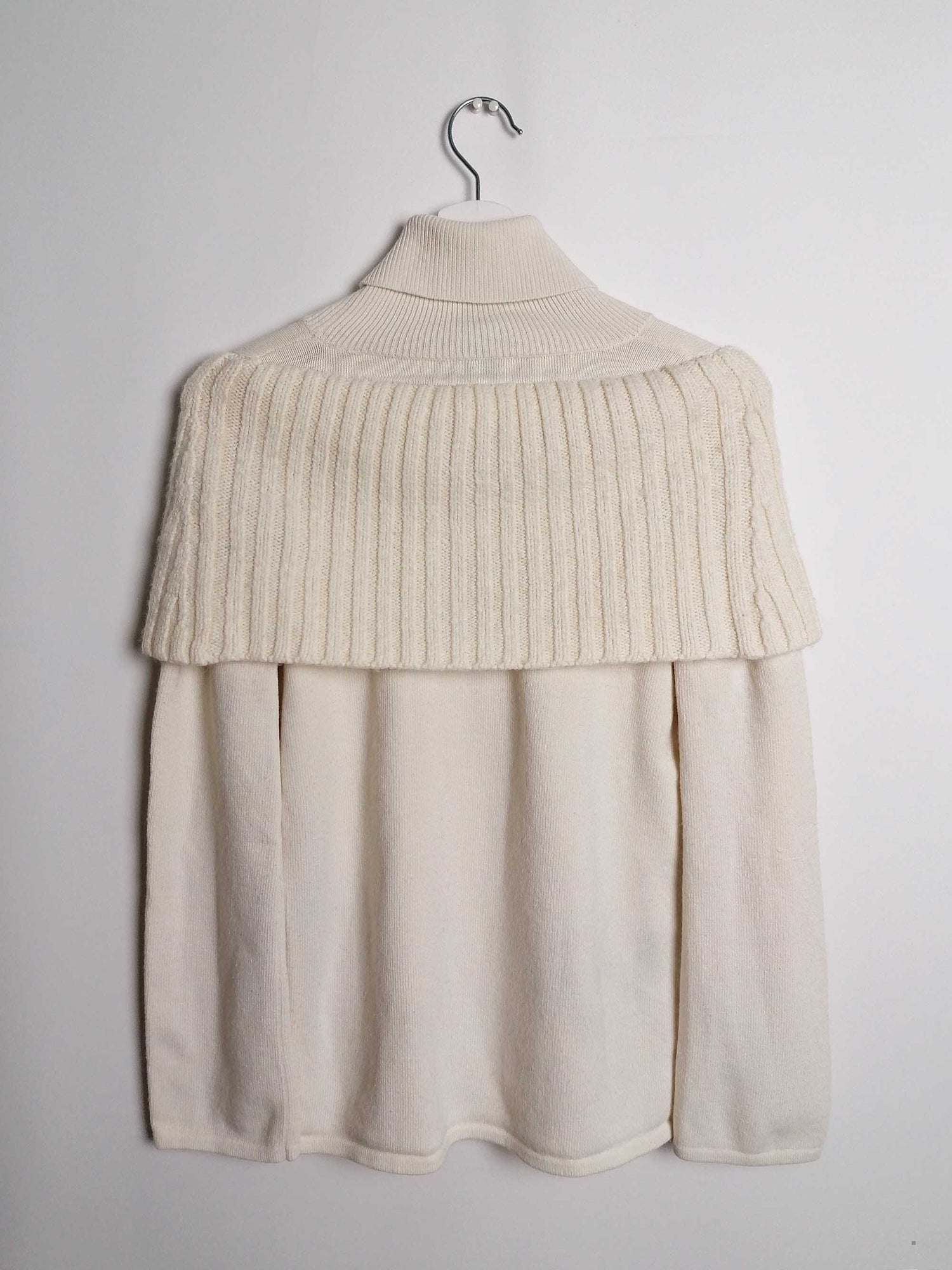 Gorgeous 90's vintage MANGO turtleneck jumper, buttery-white colour, beautiful faux off-the shoulder collar in heavy knit wool. Slightly flared sleeves, unique cut.