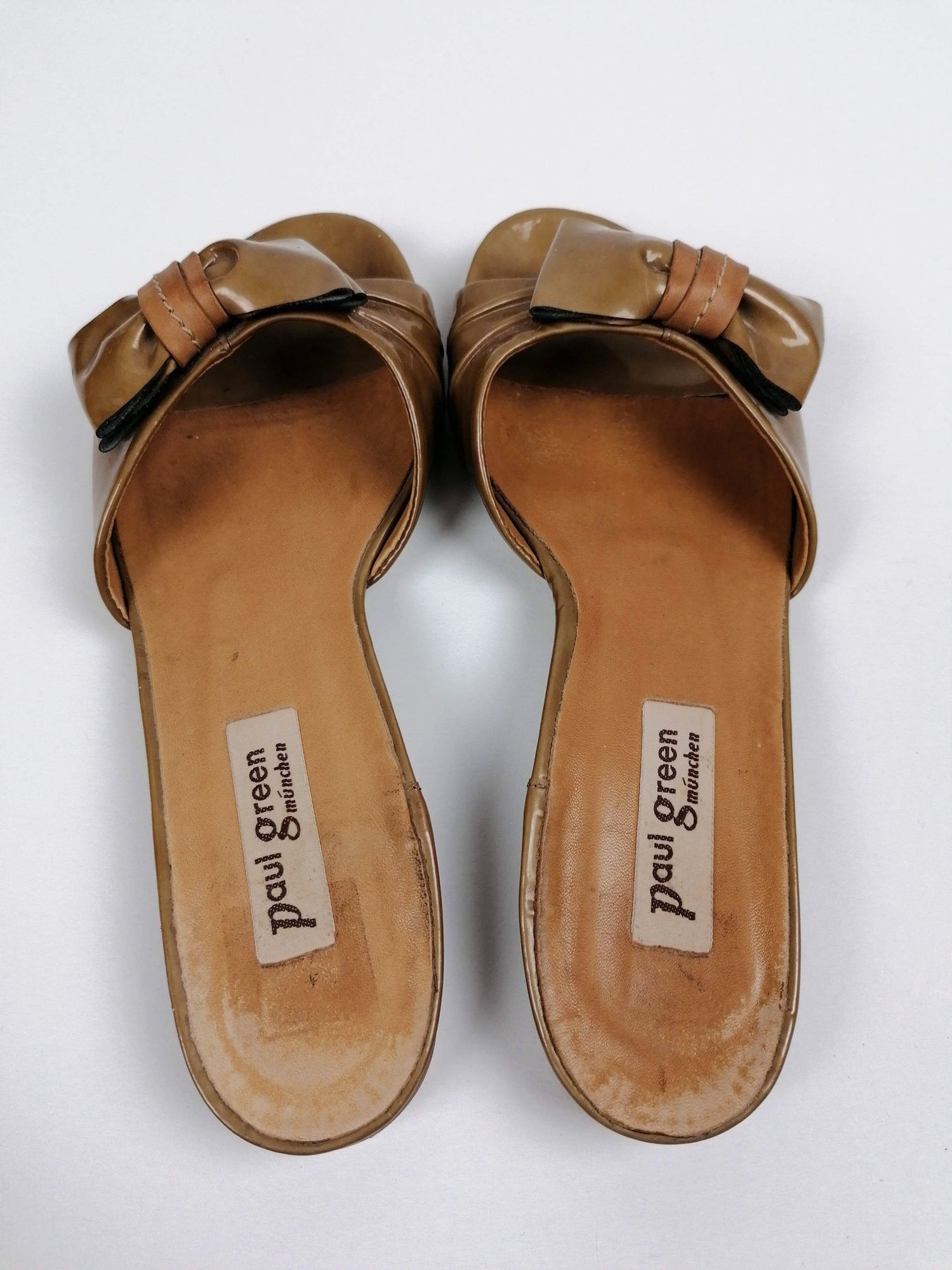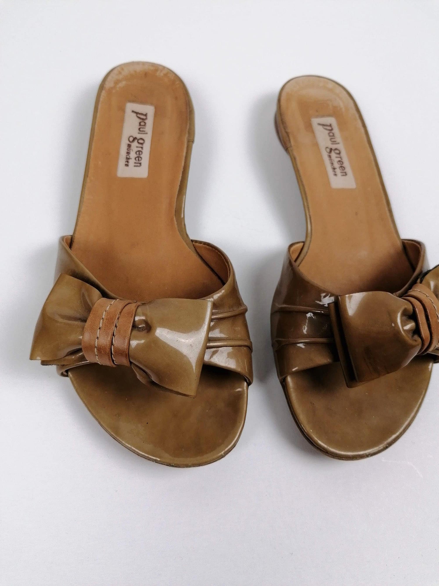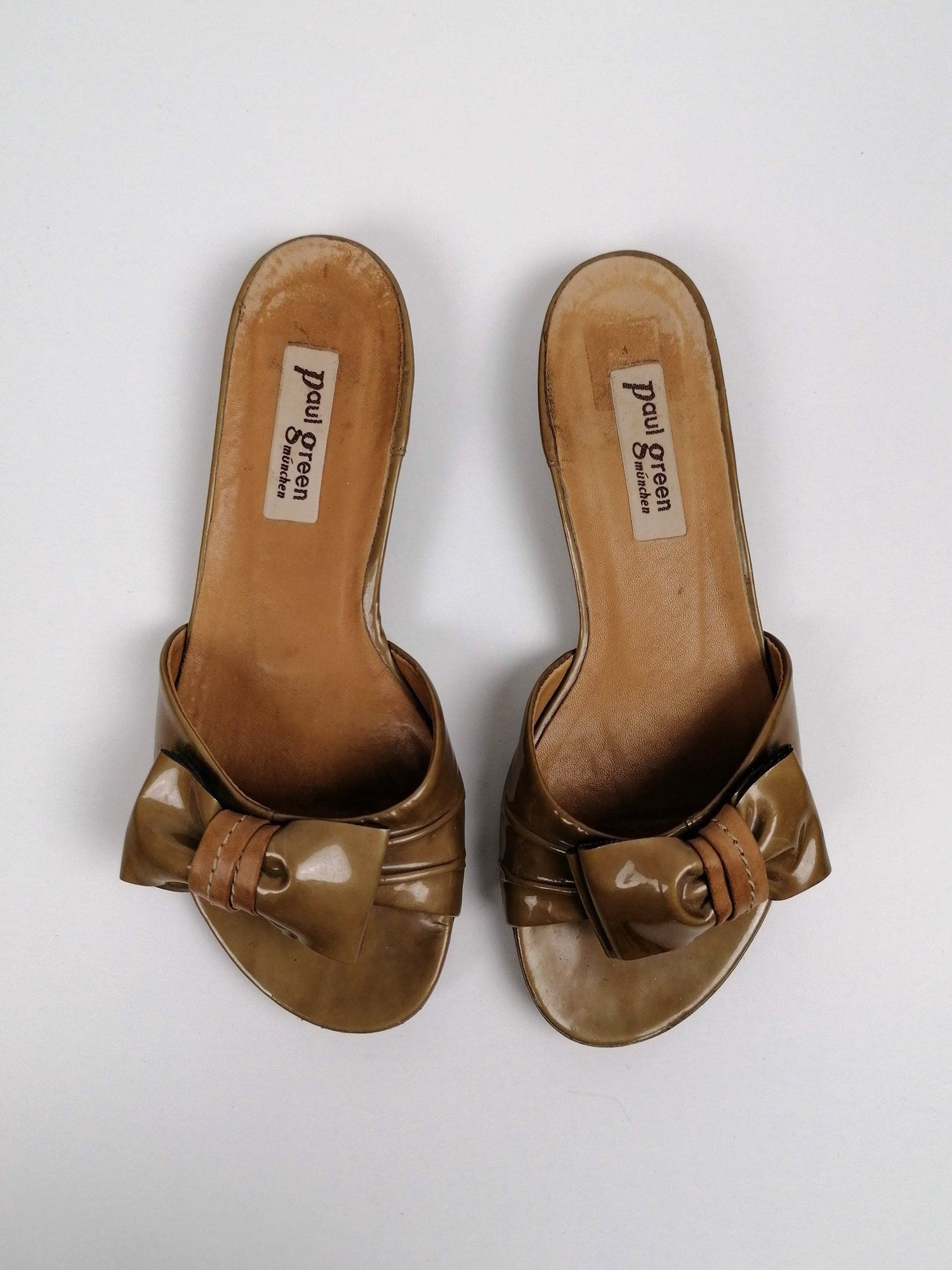 Beautiful vintage Paul Green Munchen shiny patent leather slides, made in Austria. Genuine leather, bow detail.