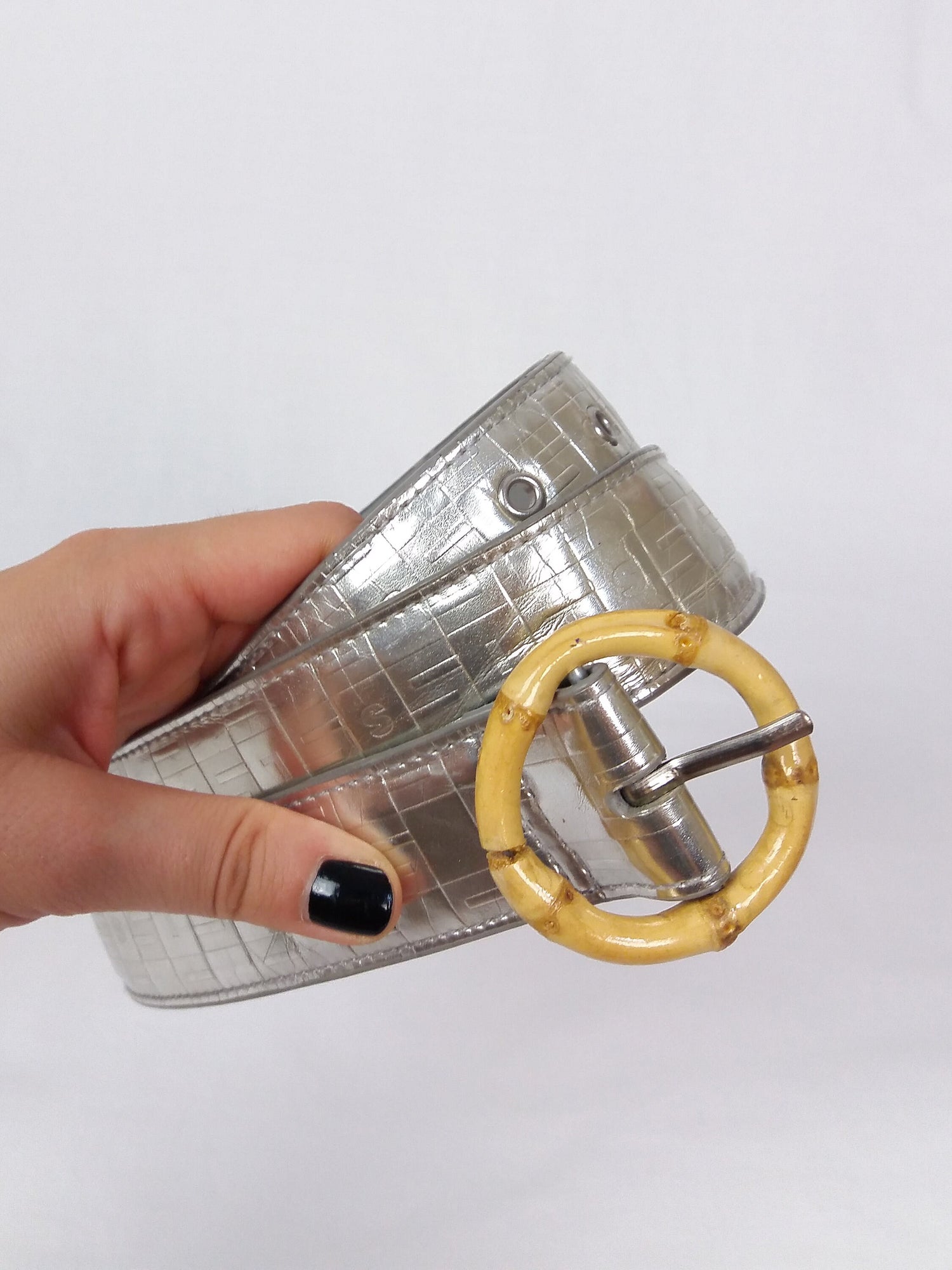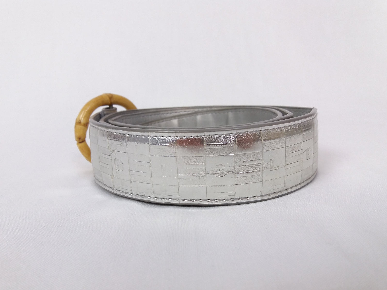 Gorgeous vintage 90's SISLEY belt, silver finish, embossed pattern and spell-out logo, bamboo buckle.