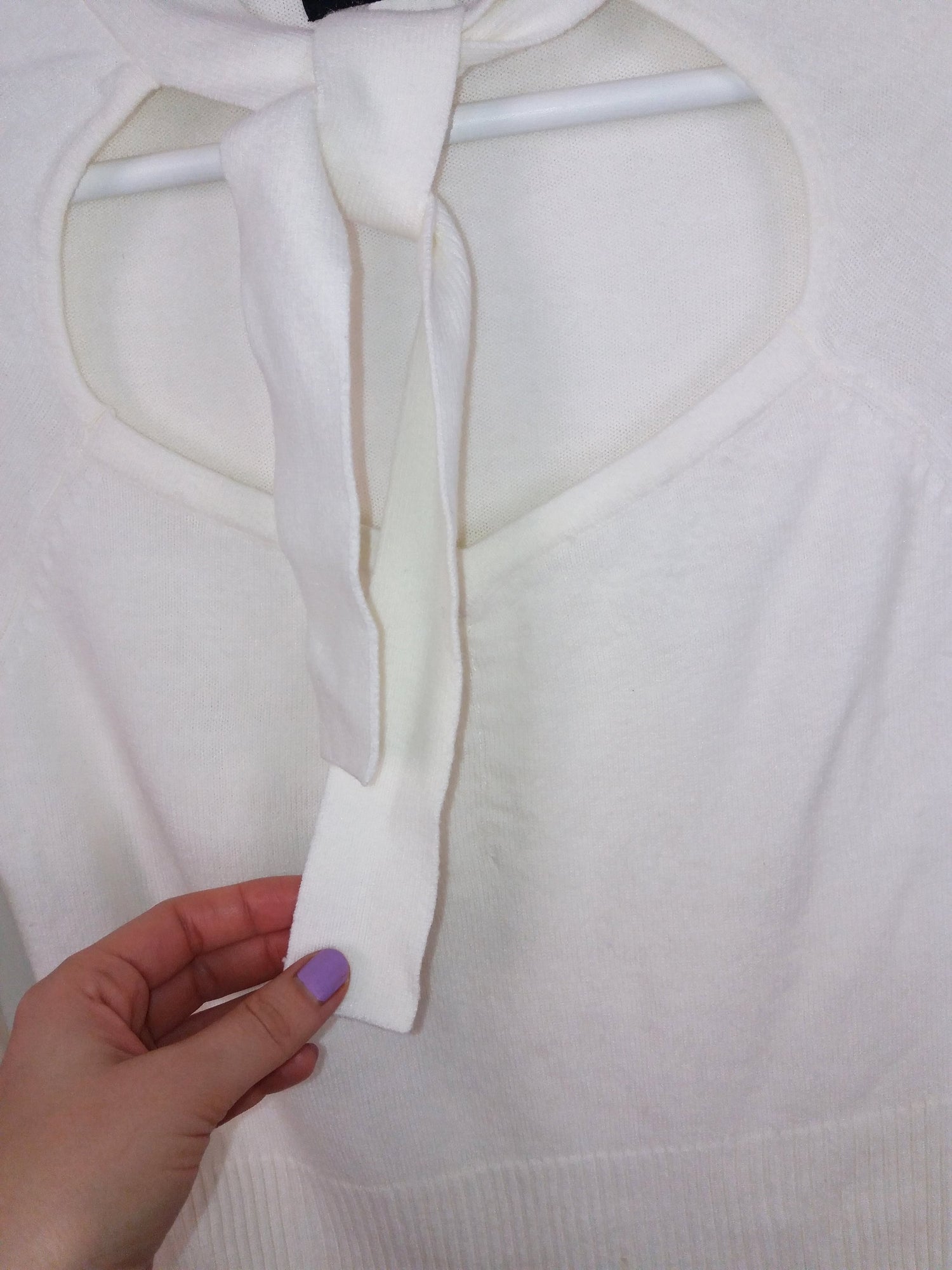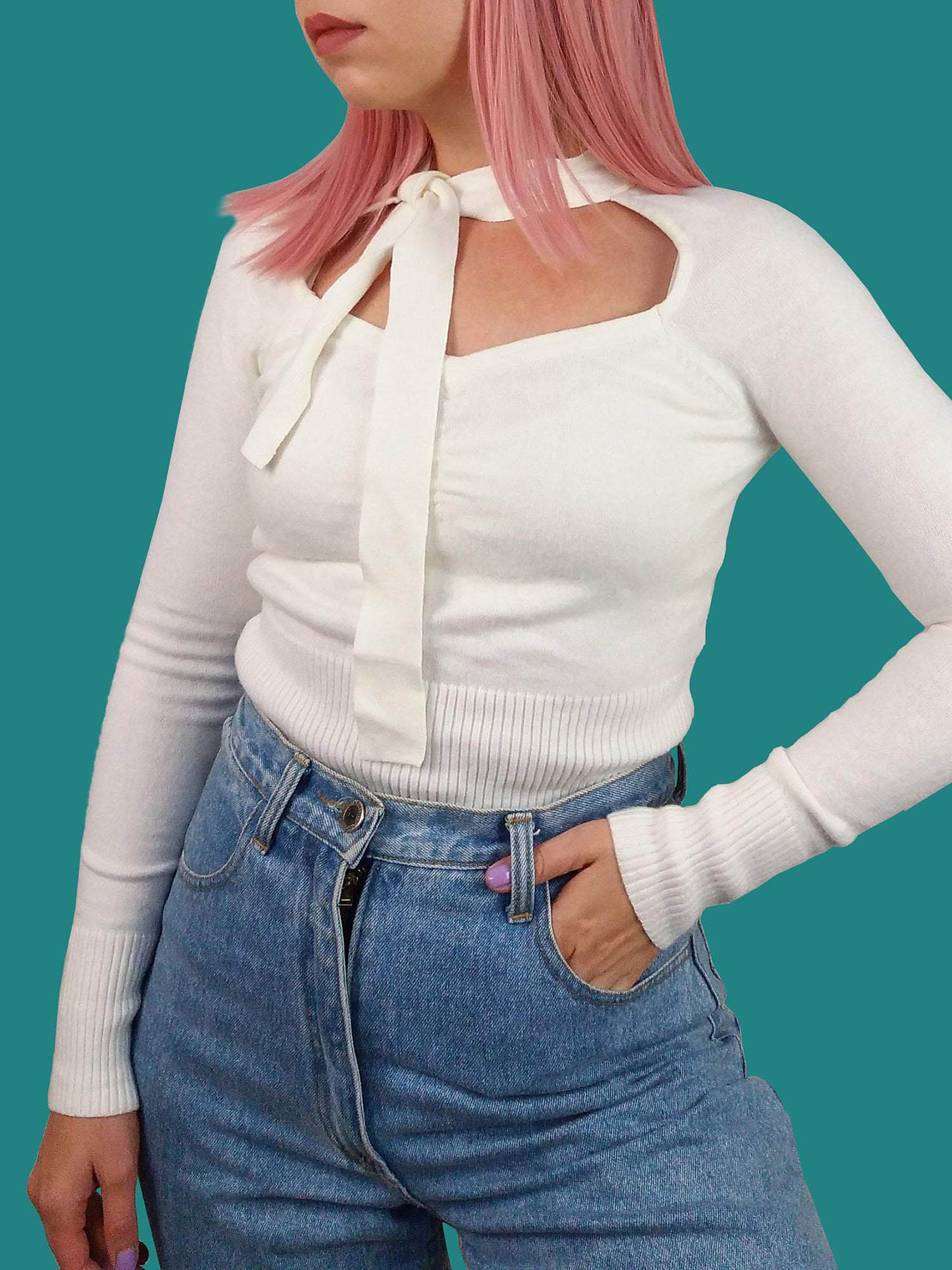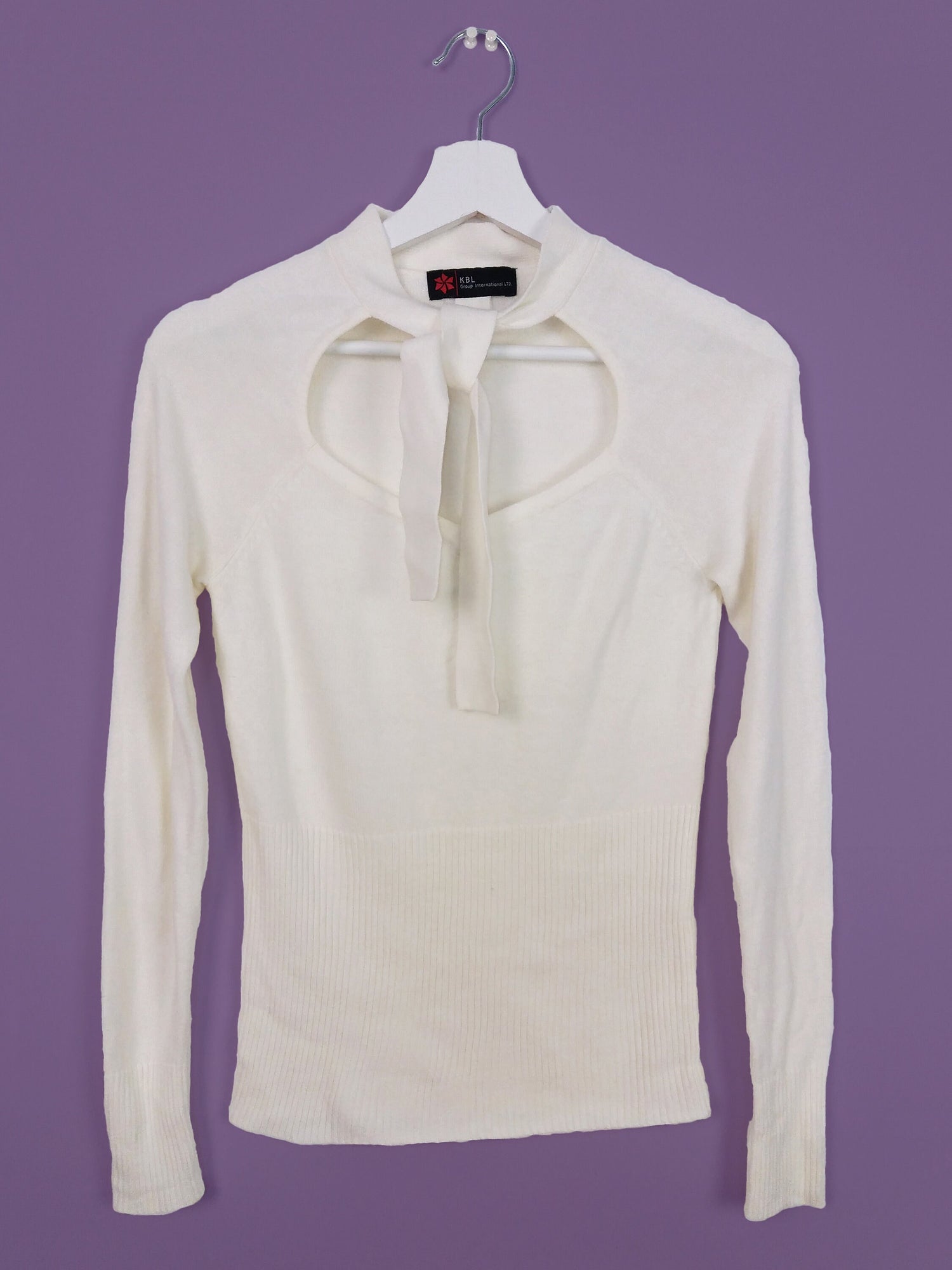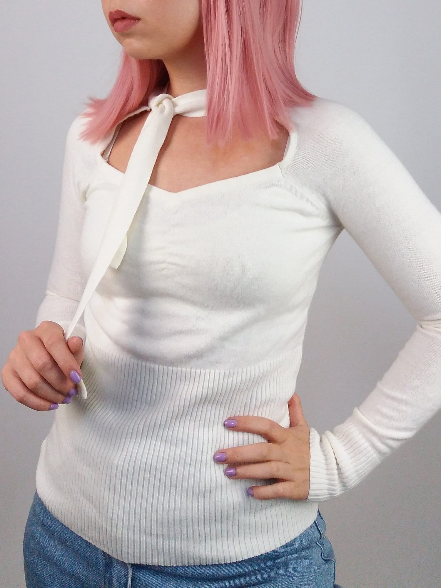 Vintage 90's minimalist white knit sweater with neck tie detail. Brand KBL.