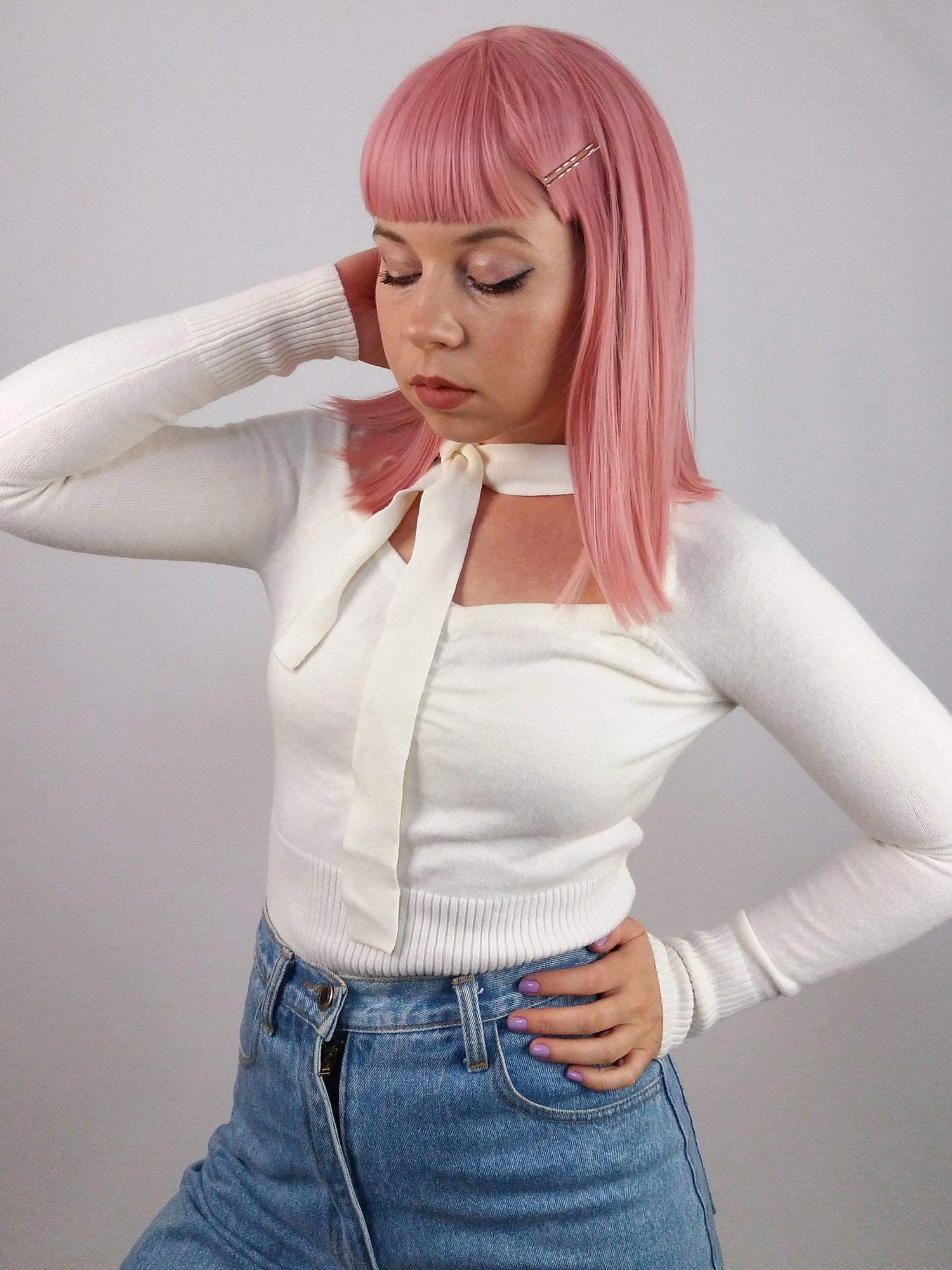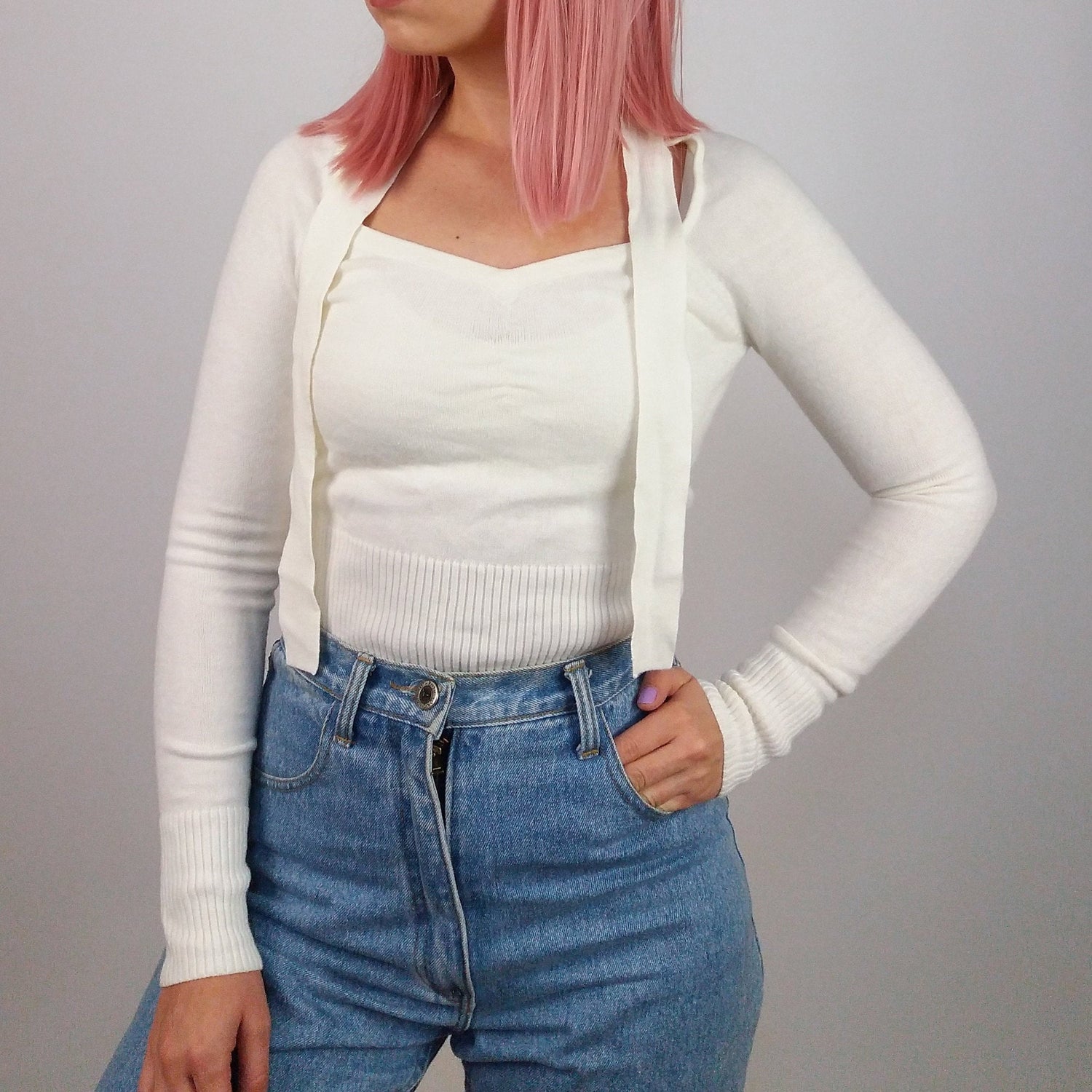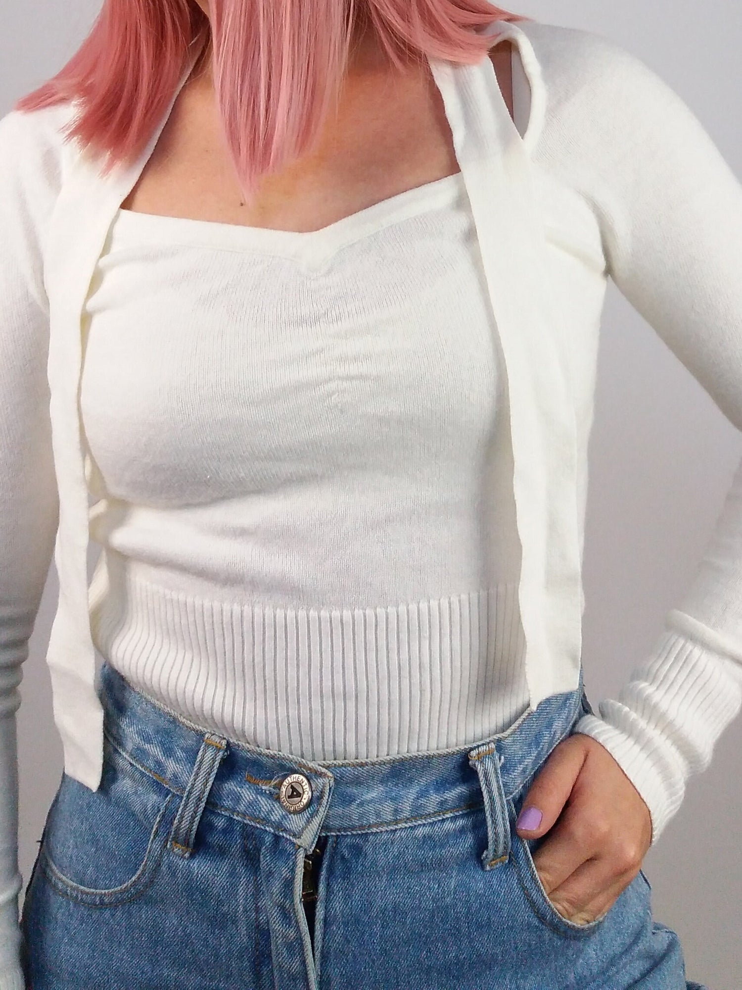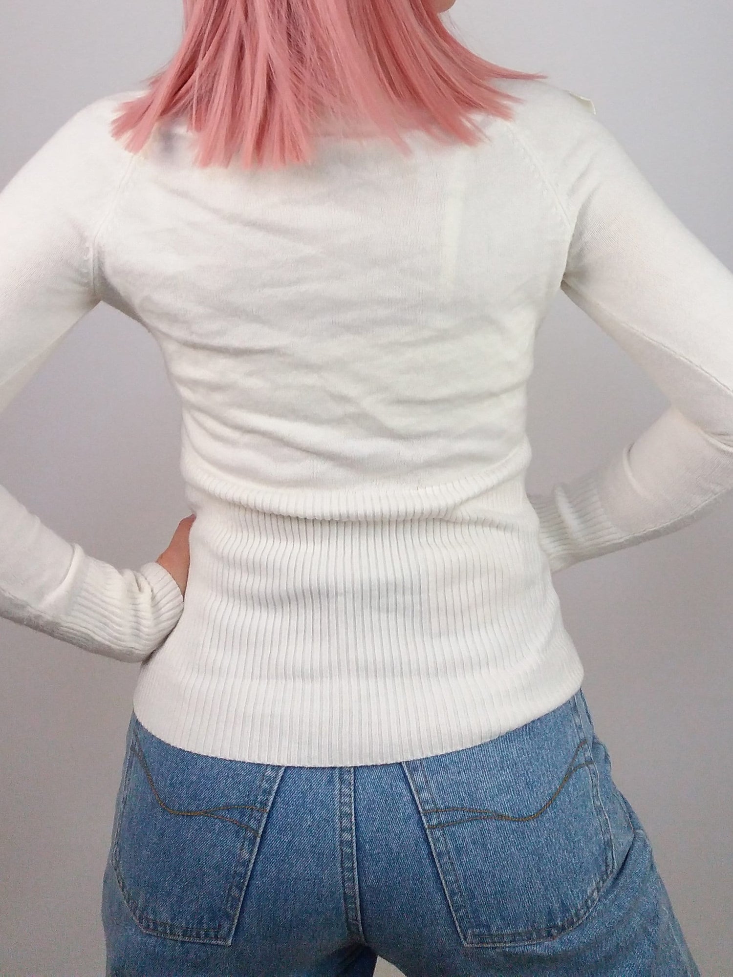 Vintage 90's minimalist white knit sweater with neck tie detail. Brand KBL.