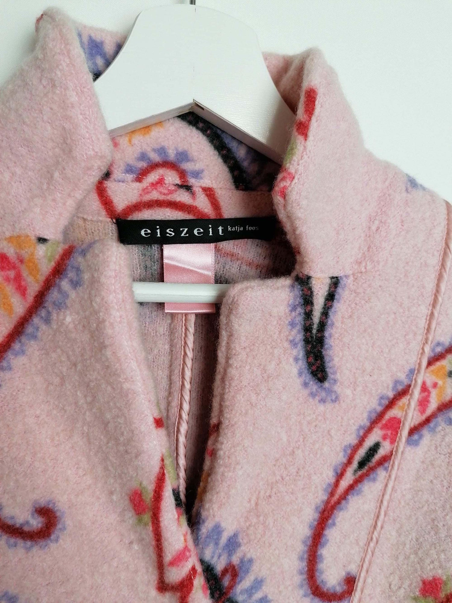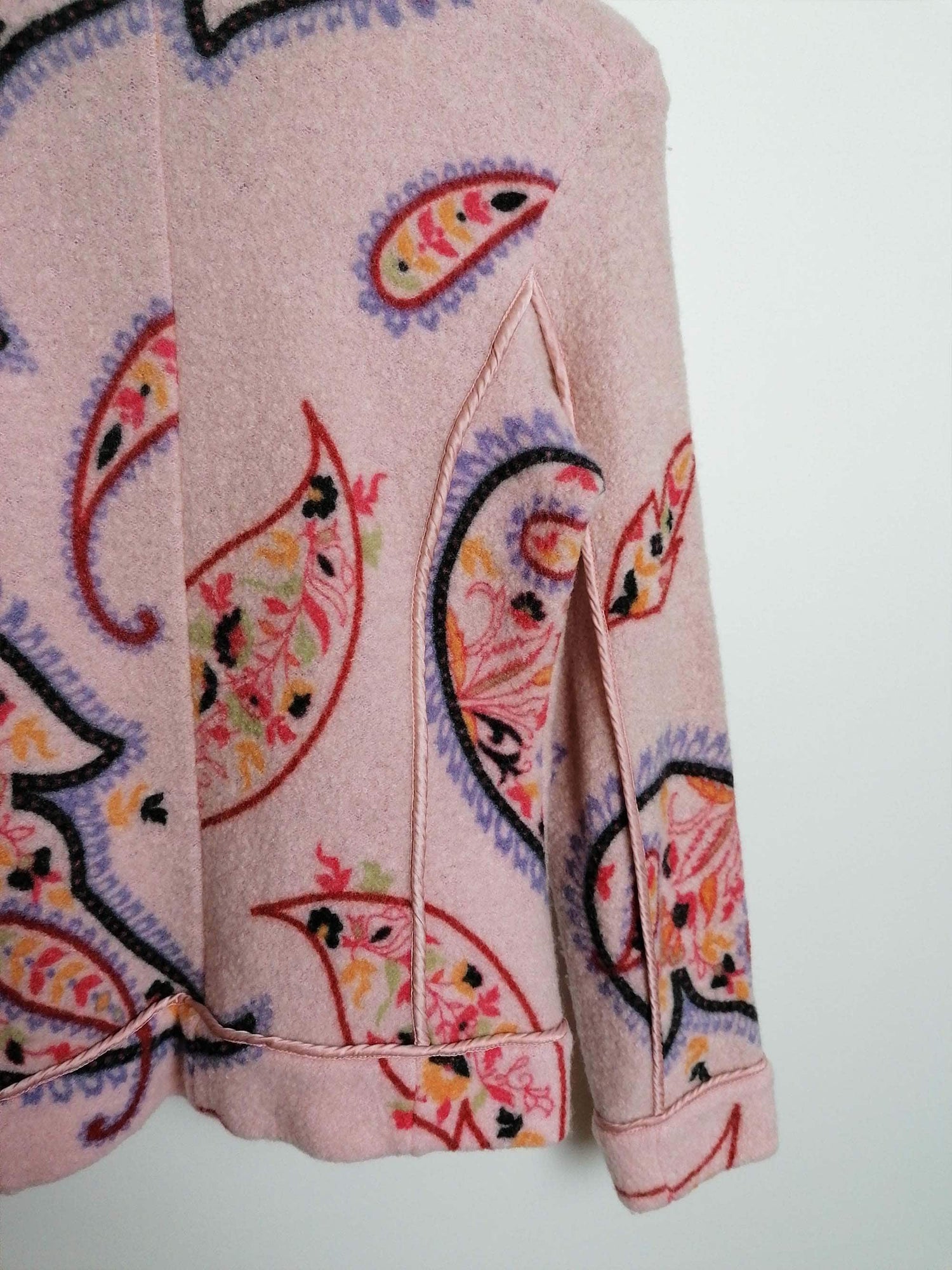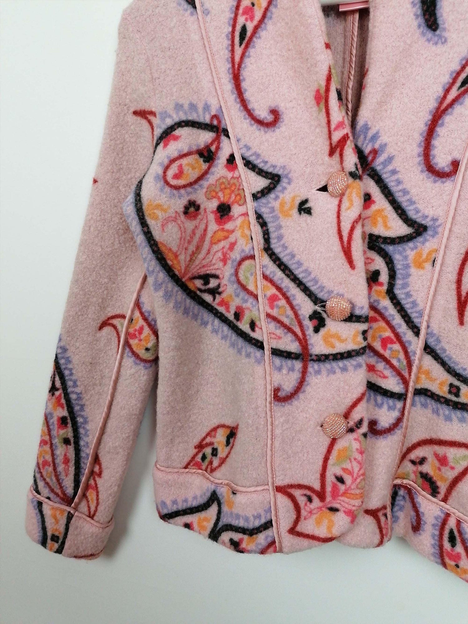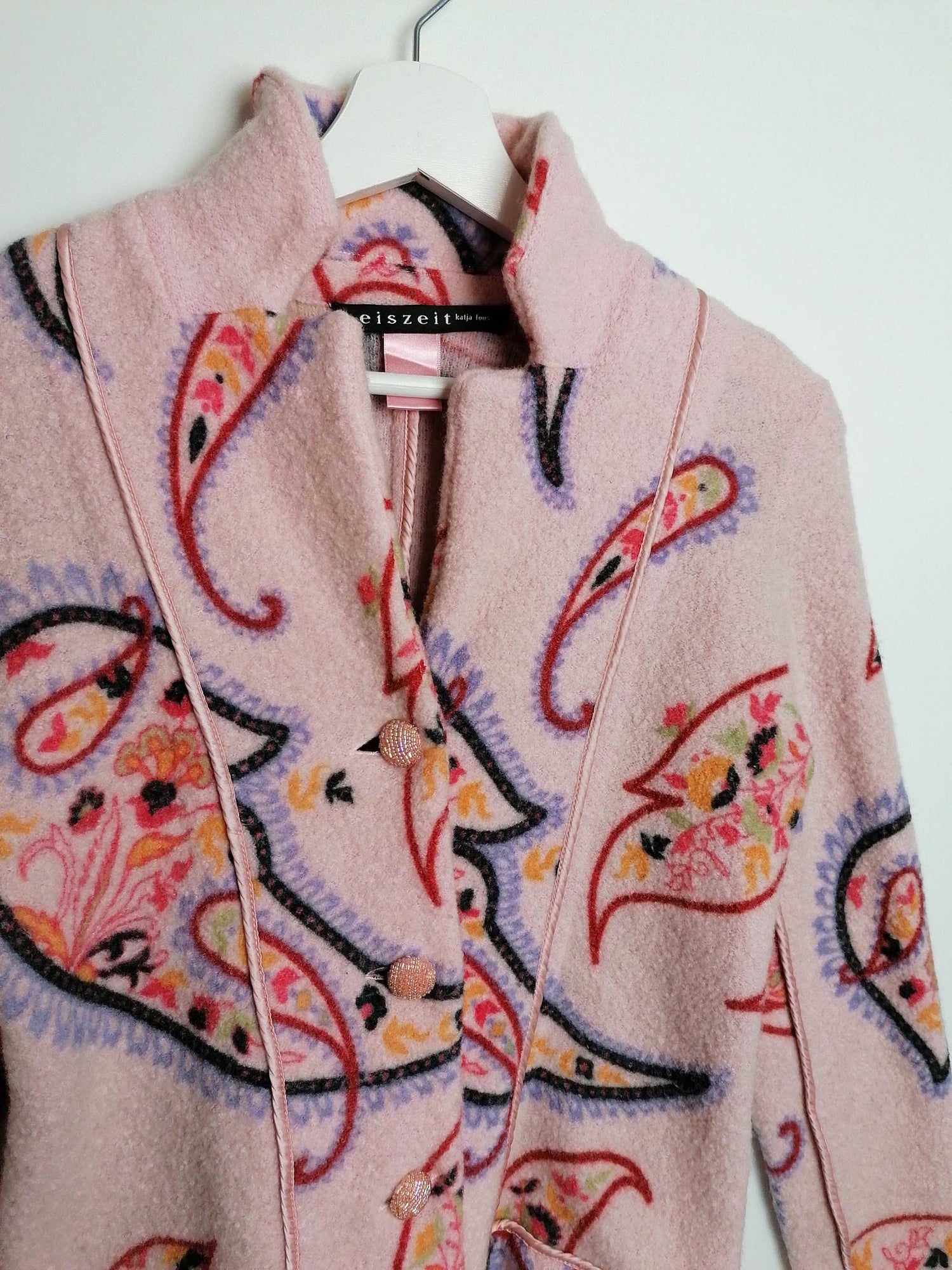 Gorgeous EISZEIT by Katja Foos blazer jacket, wool blend, soft and warm. Dusty pink with large paisley pattern, a beautiful piece for colder weather.