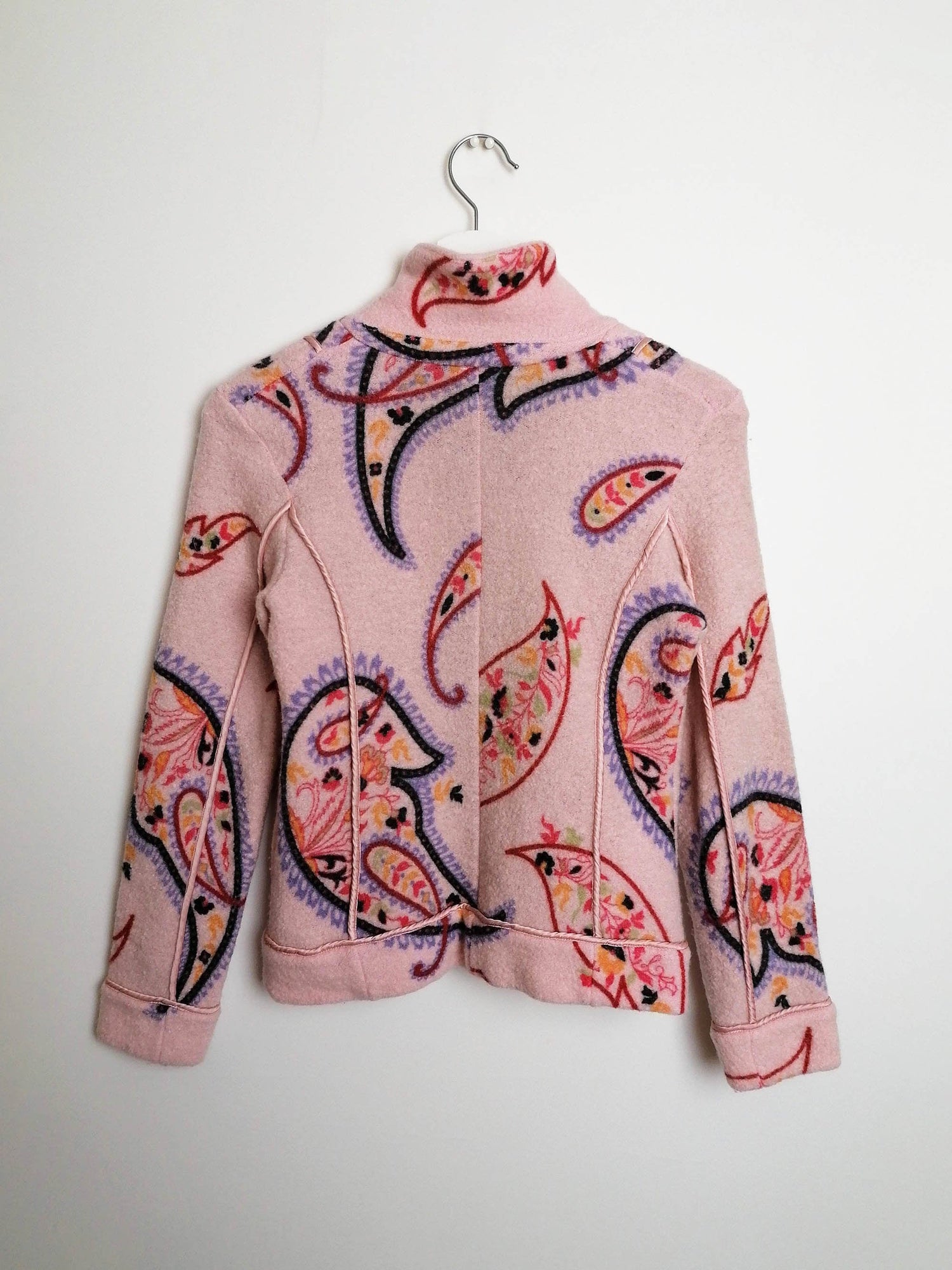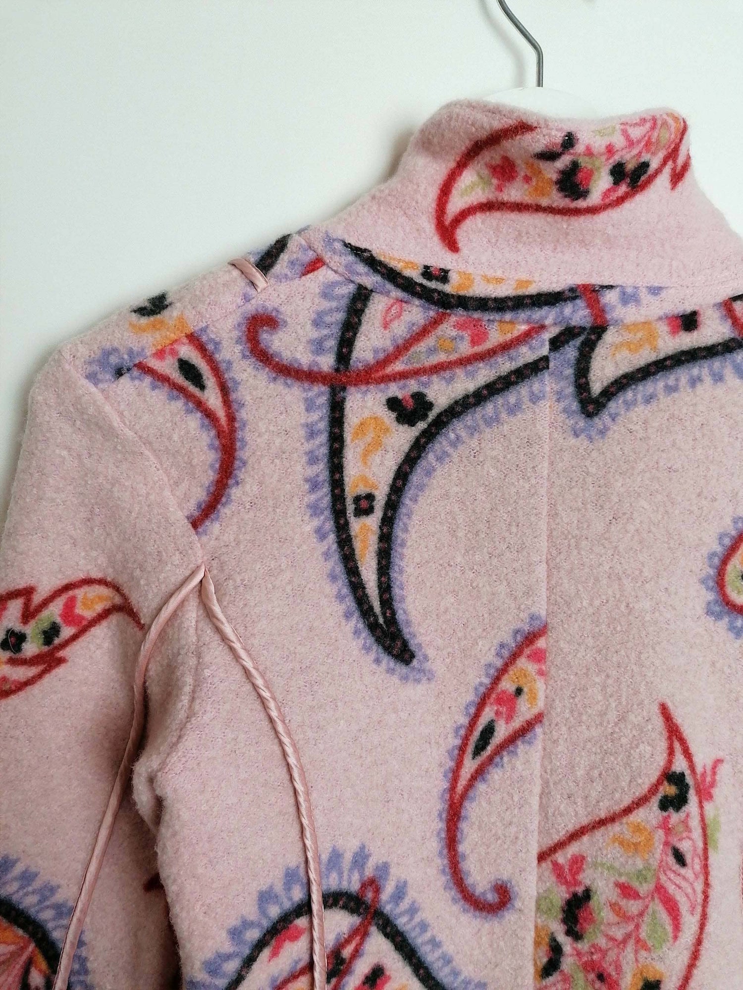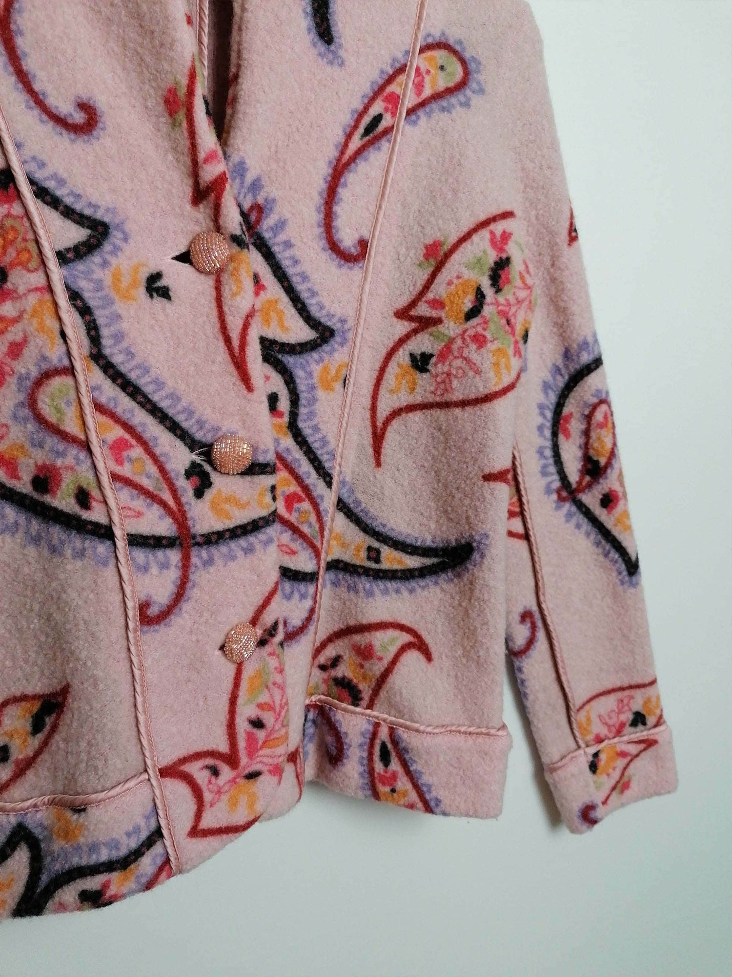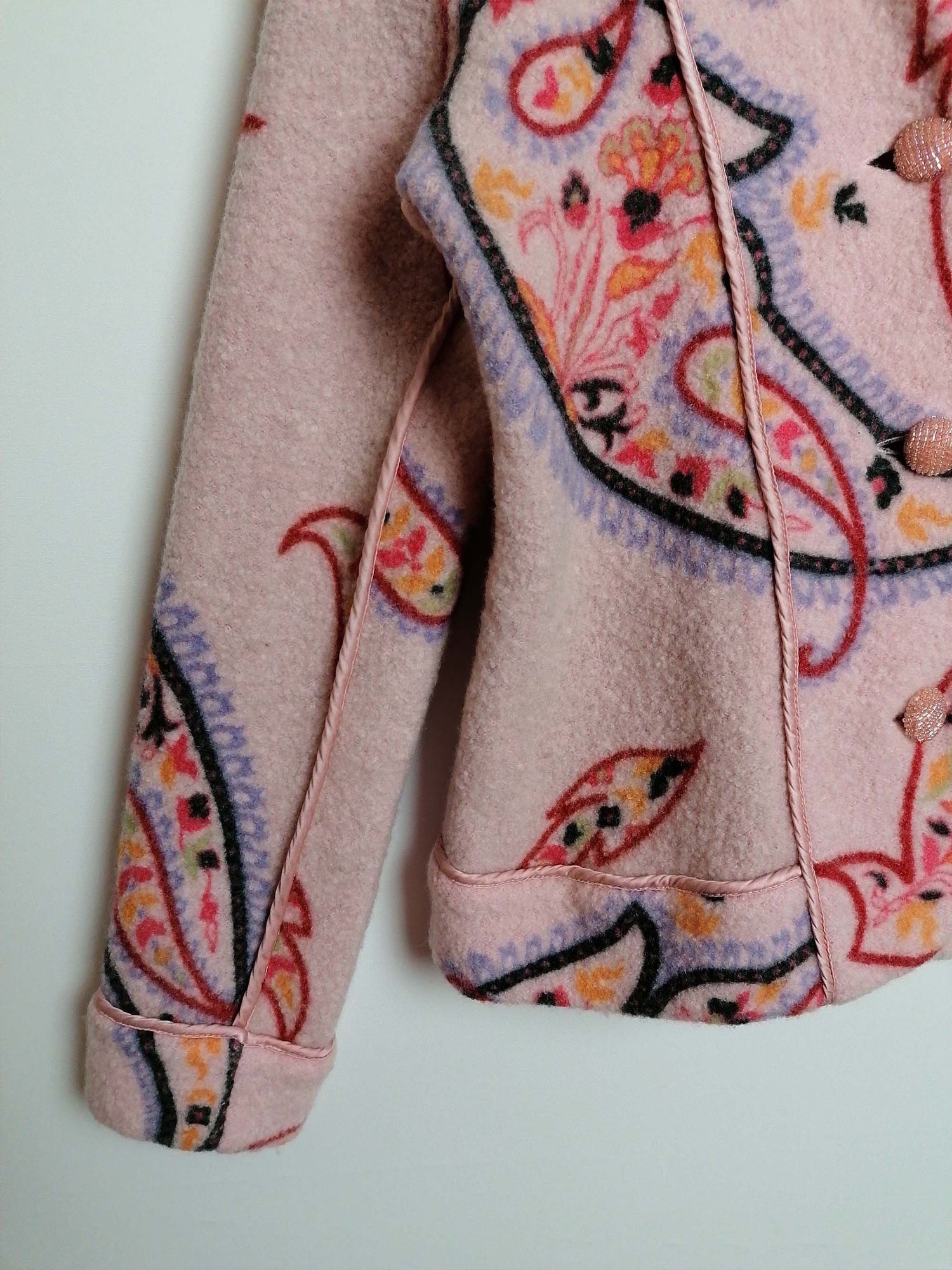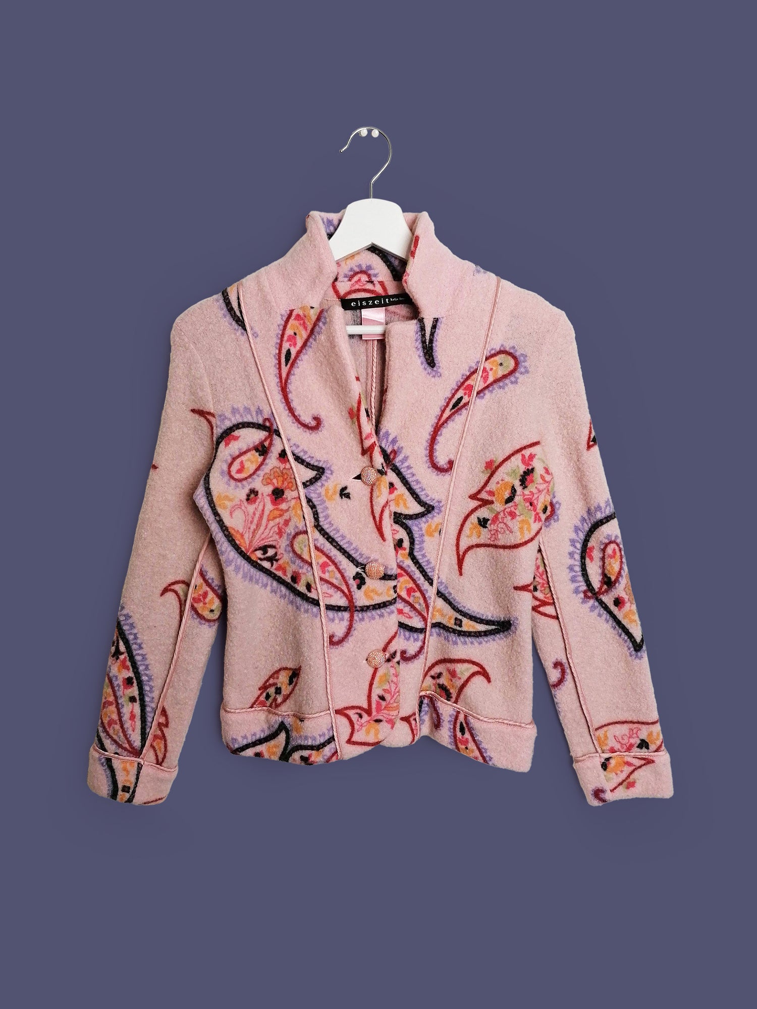 Gorgeous EISZEIT by Katja Foos blazer jacket, wool blend, soft and warm. Dusty pink with large paisley pattern, a beautiful piece for colder weather.