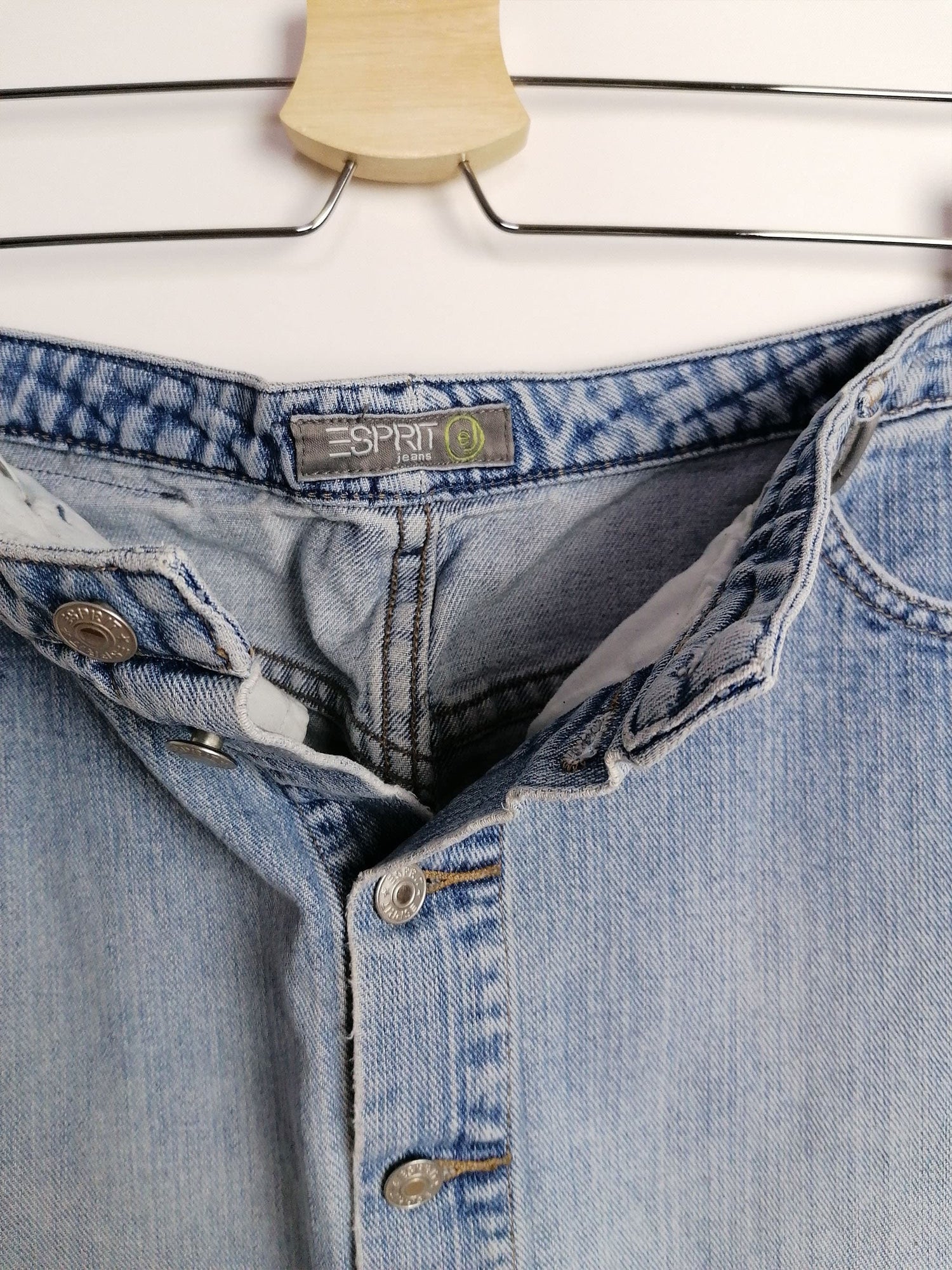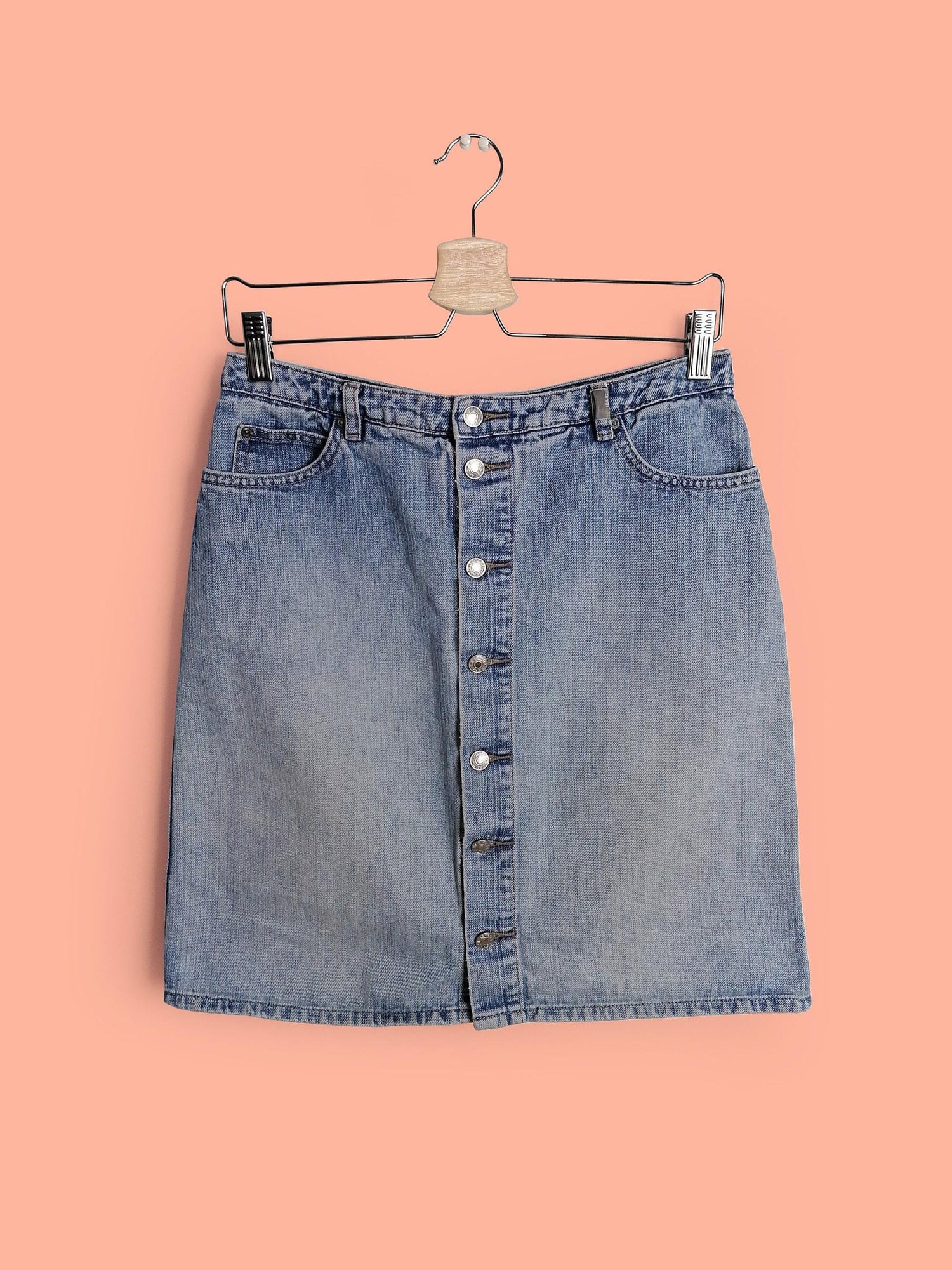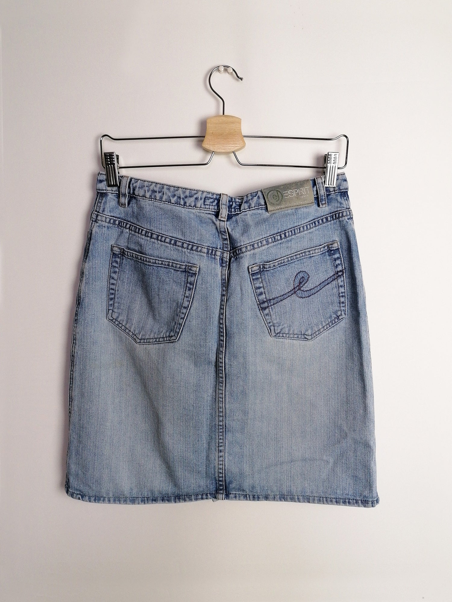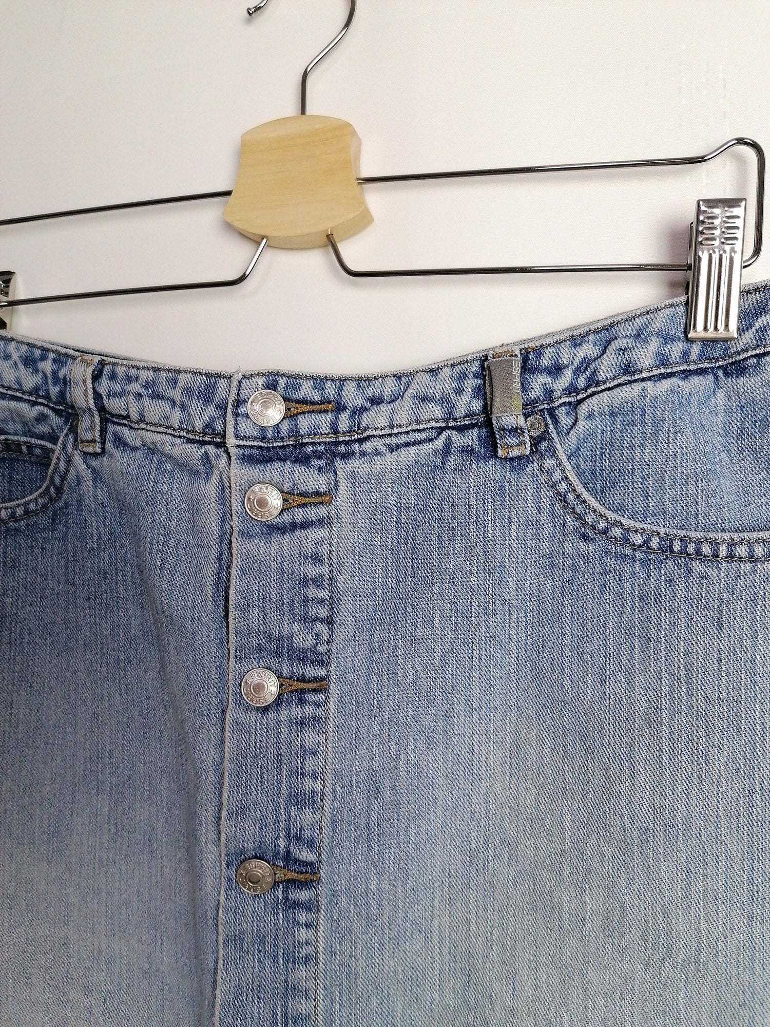 Gorgeous 90's Esprit denim skirt, front buttons. Quality denim, light stonewash.