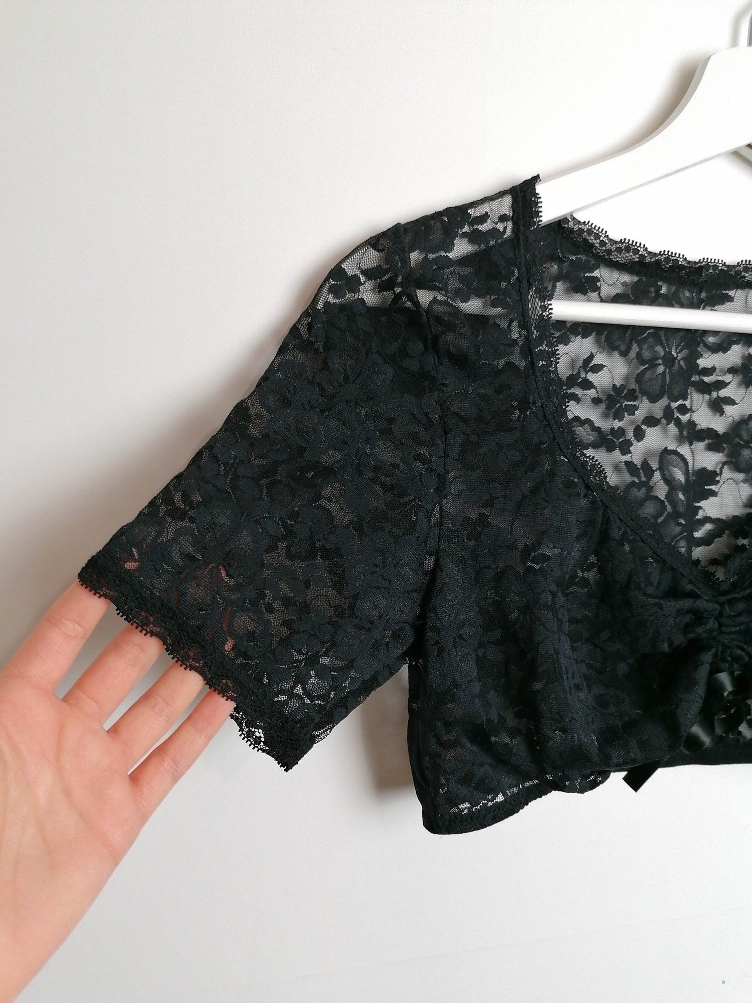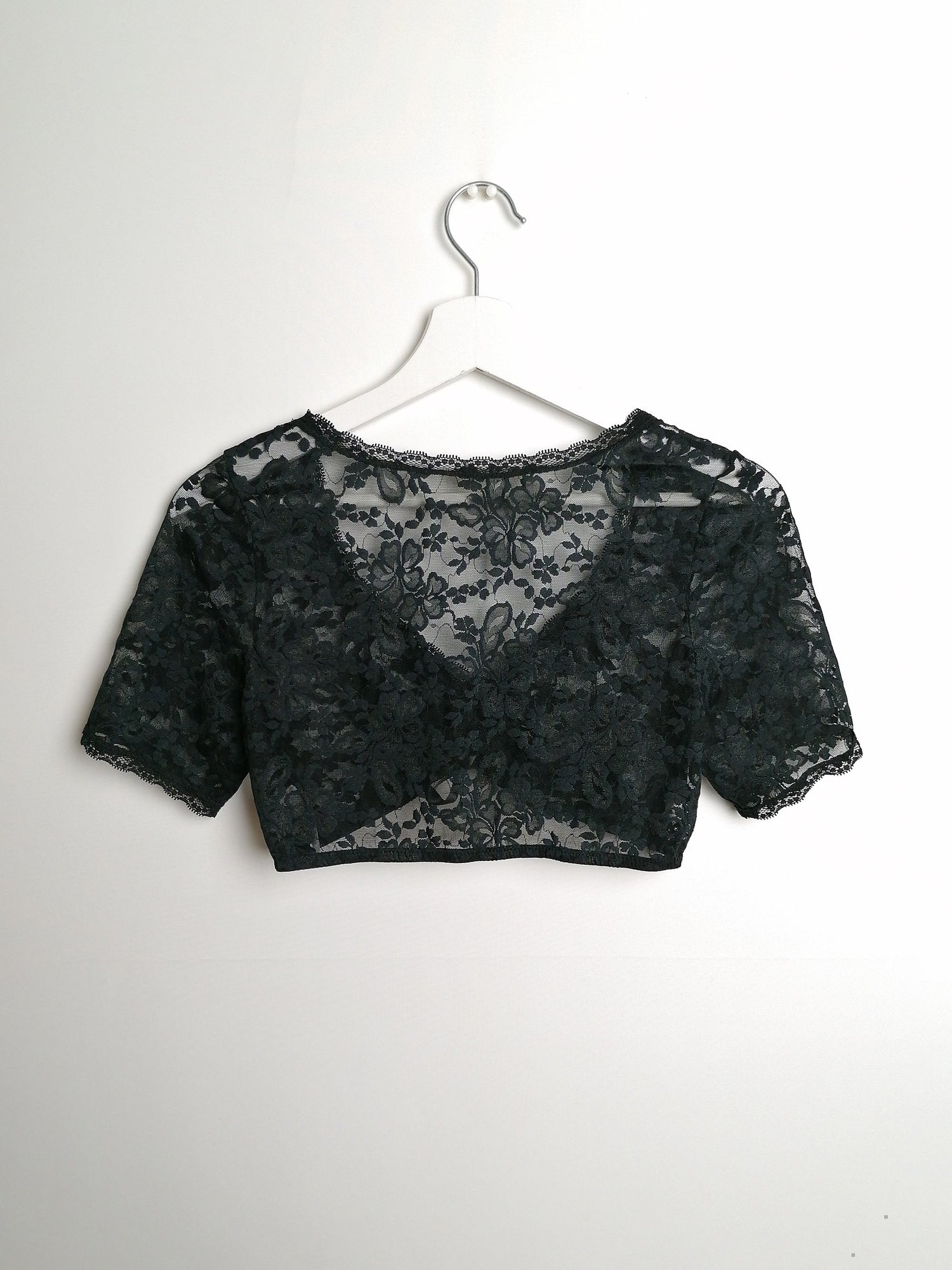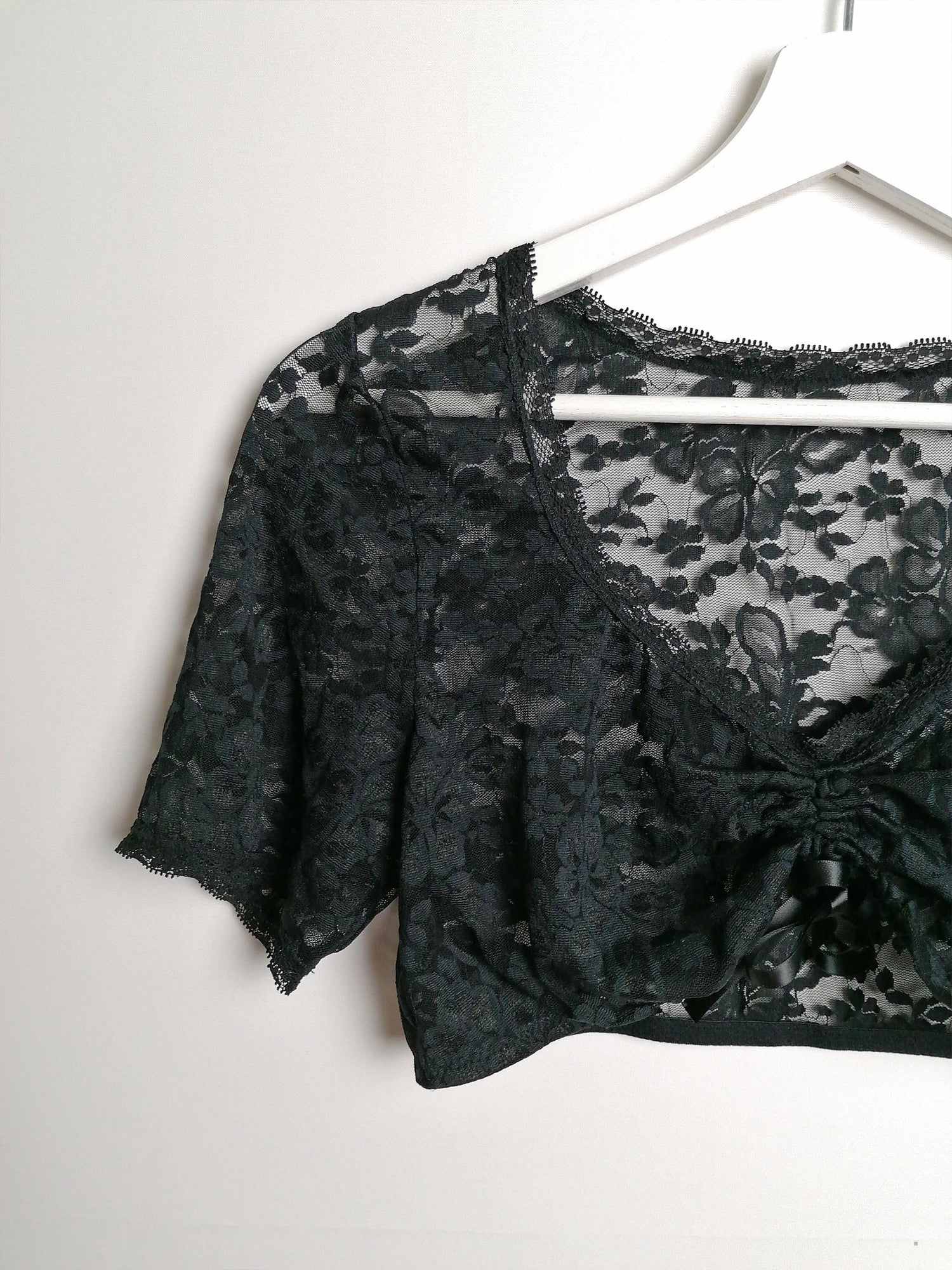 Beautiful black lace crop top, stretch fabric, elastic under-bust, adjustable front. Polyamide and elastane.