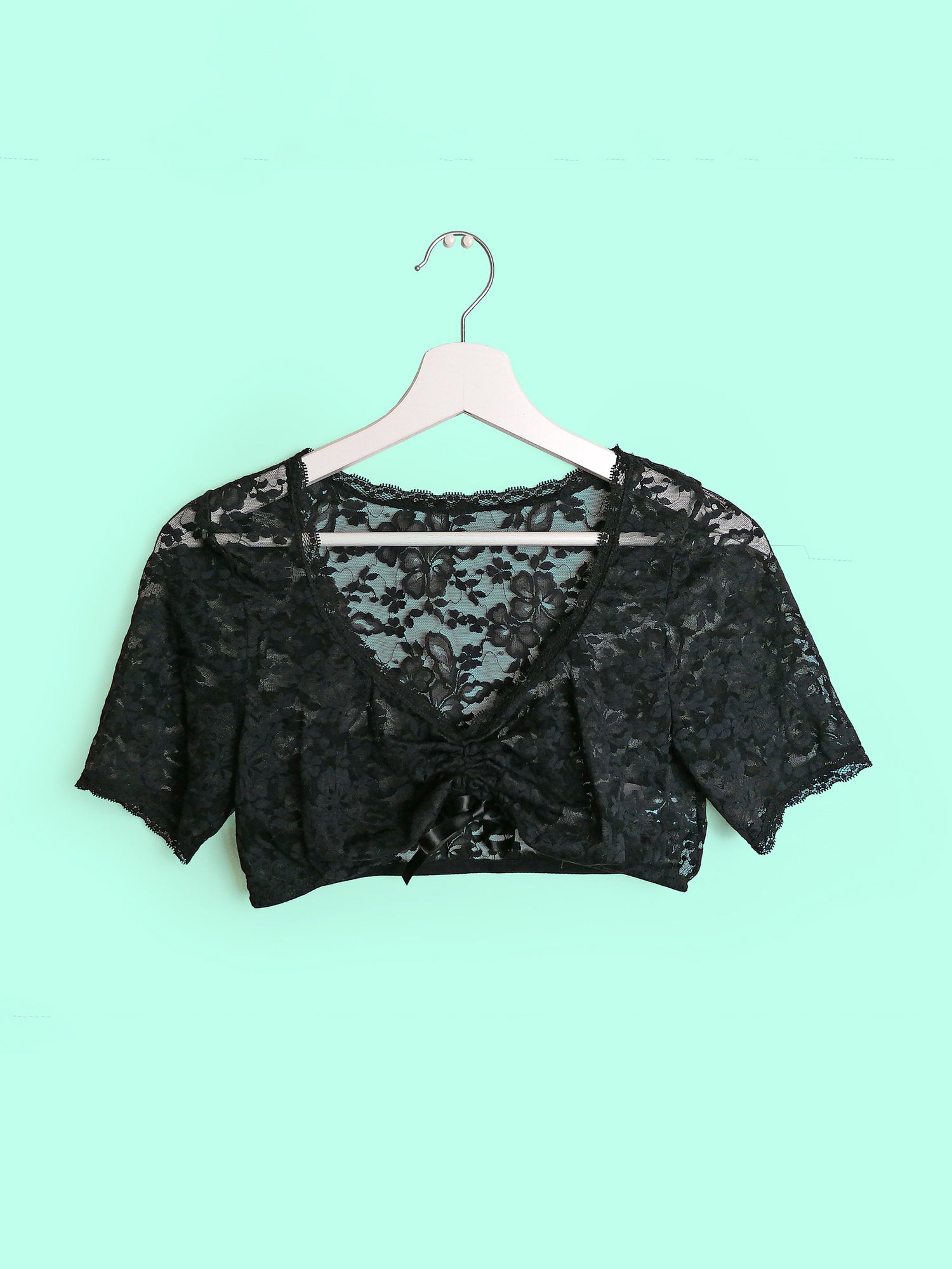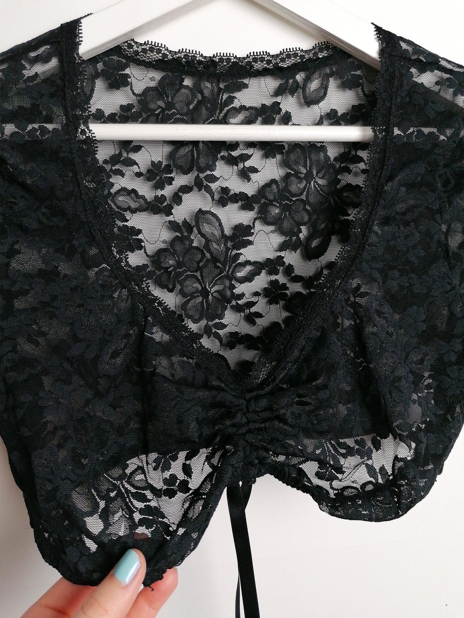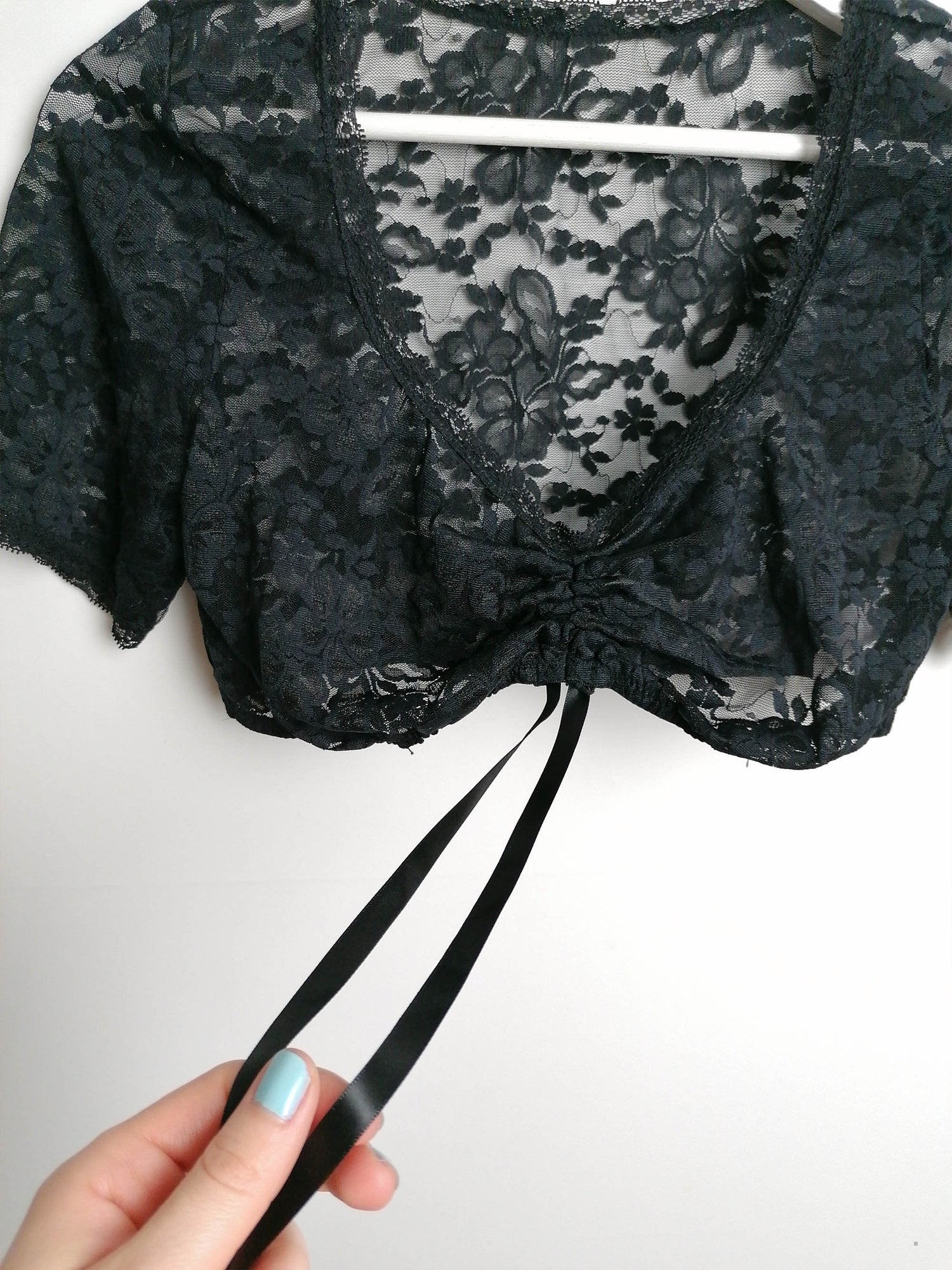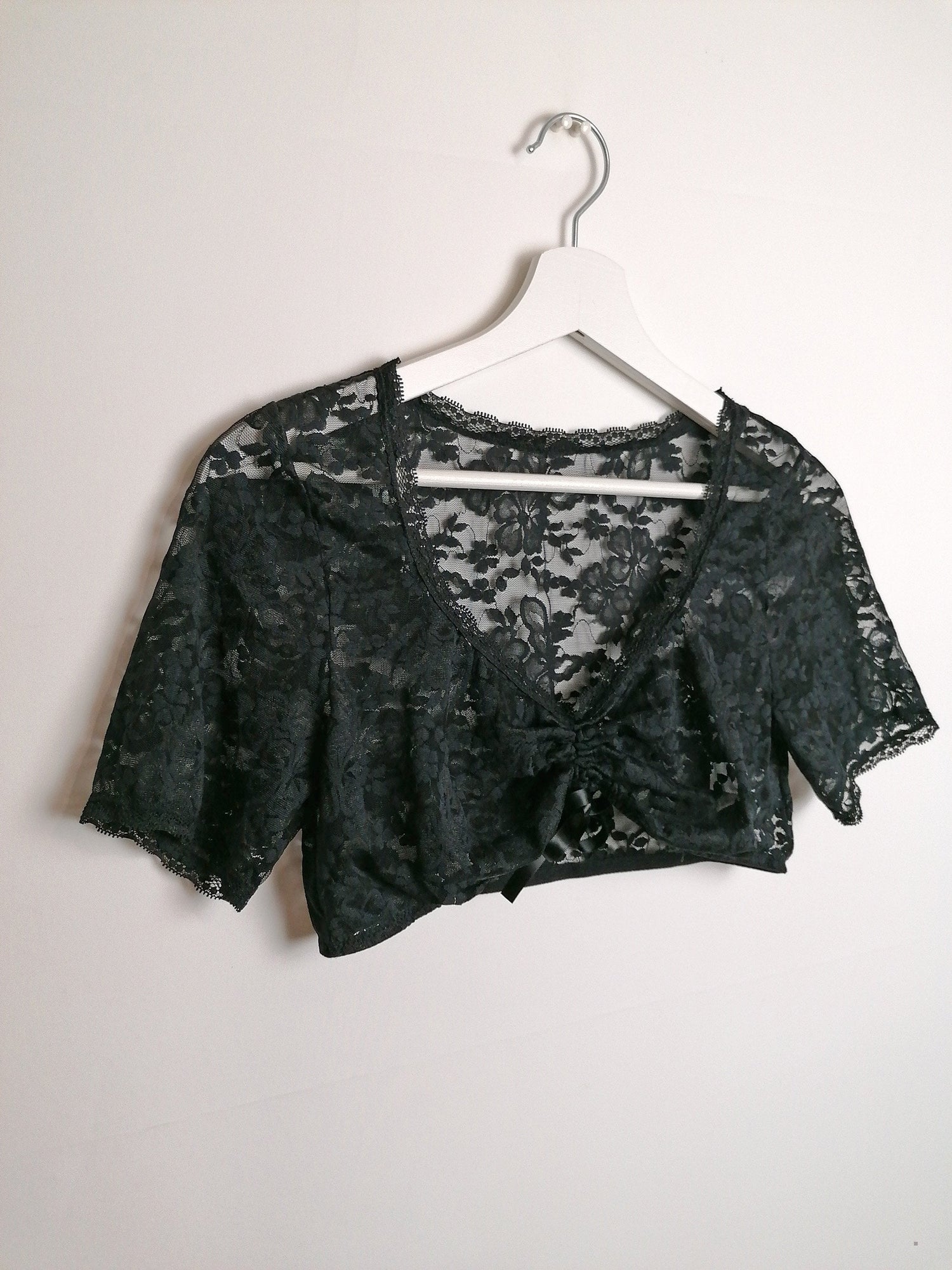 Beautiful black lace crop top, stretch fabric, elastic under-bust, adjustable front. Polyamide and elastane.