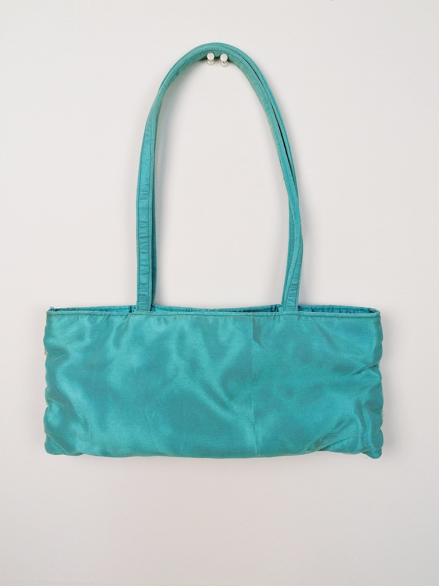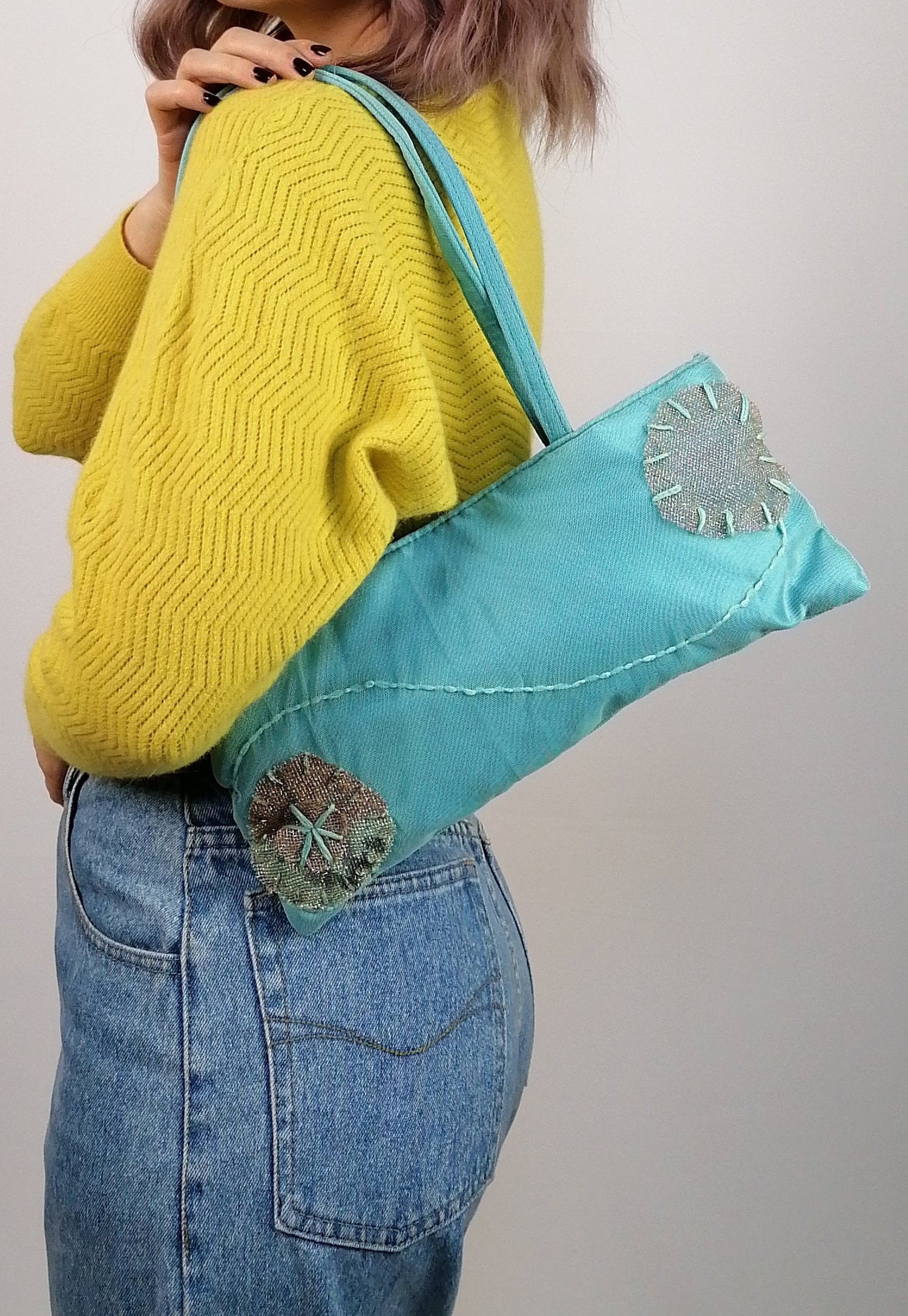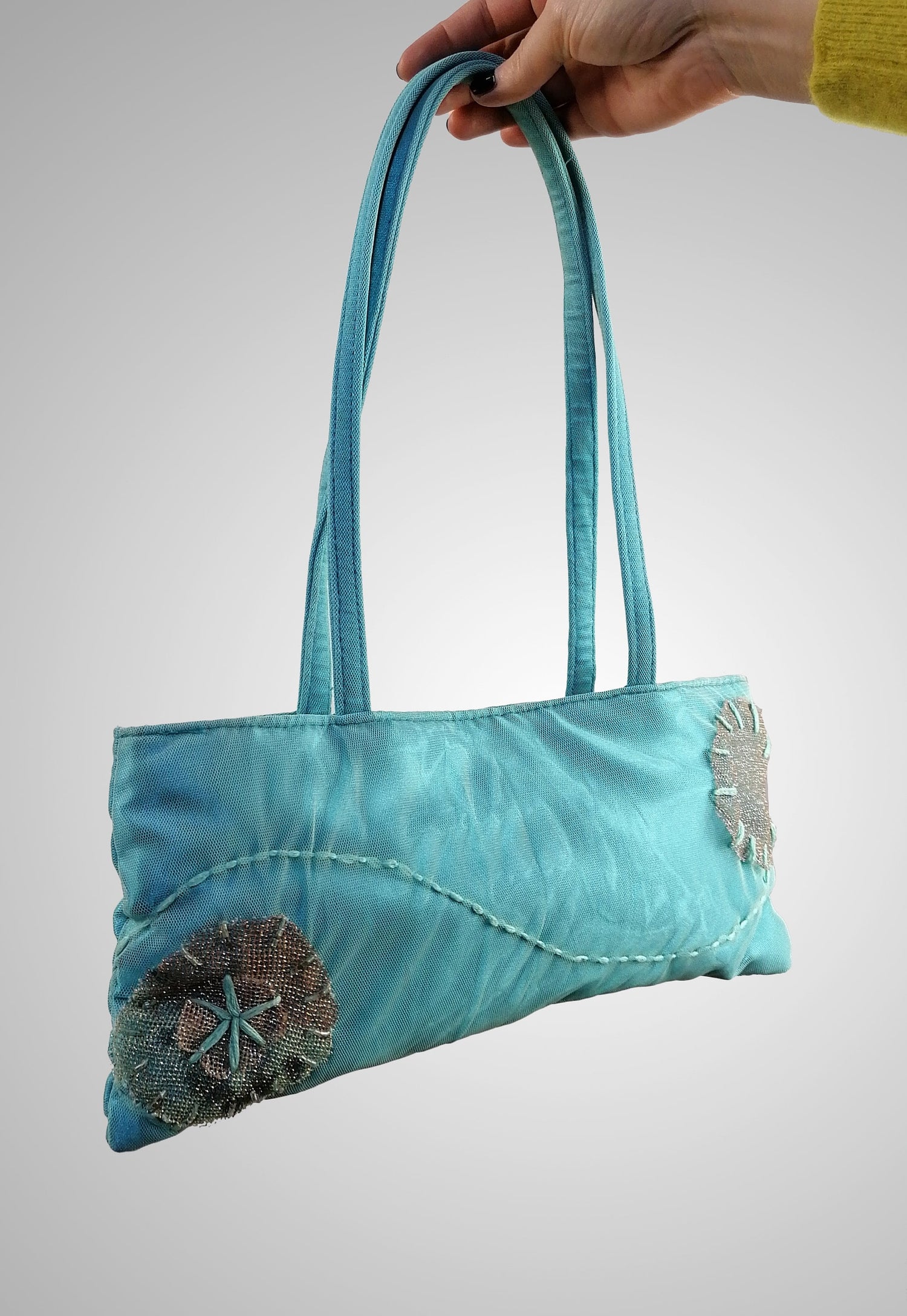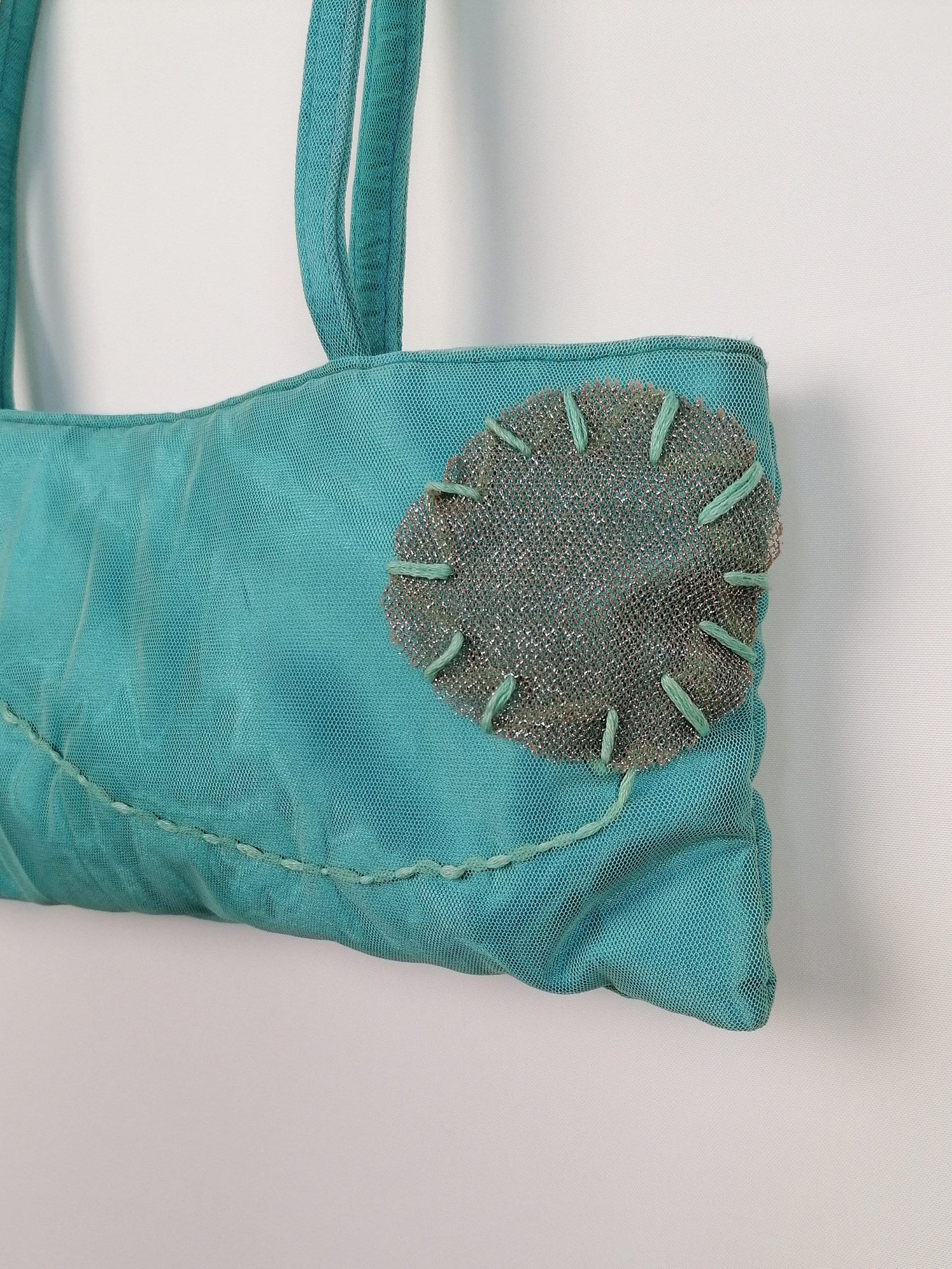 Beautiful vintage 90's Y2K small rectangular party bag, light blue satin with mesh and embellishments, adorable!
