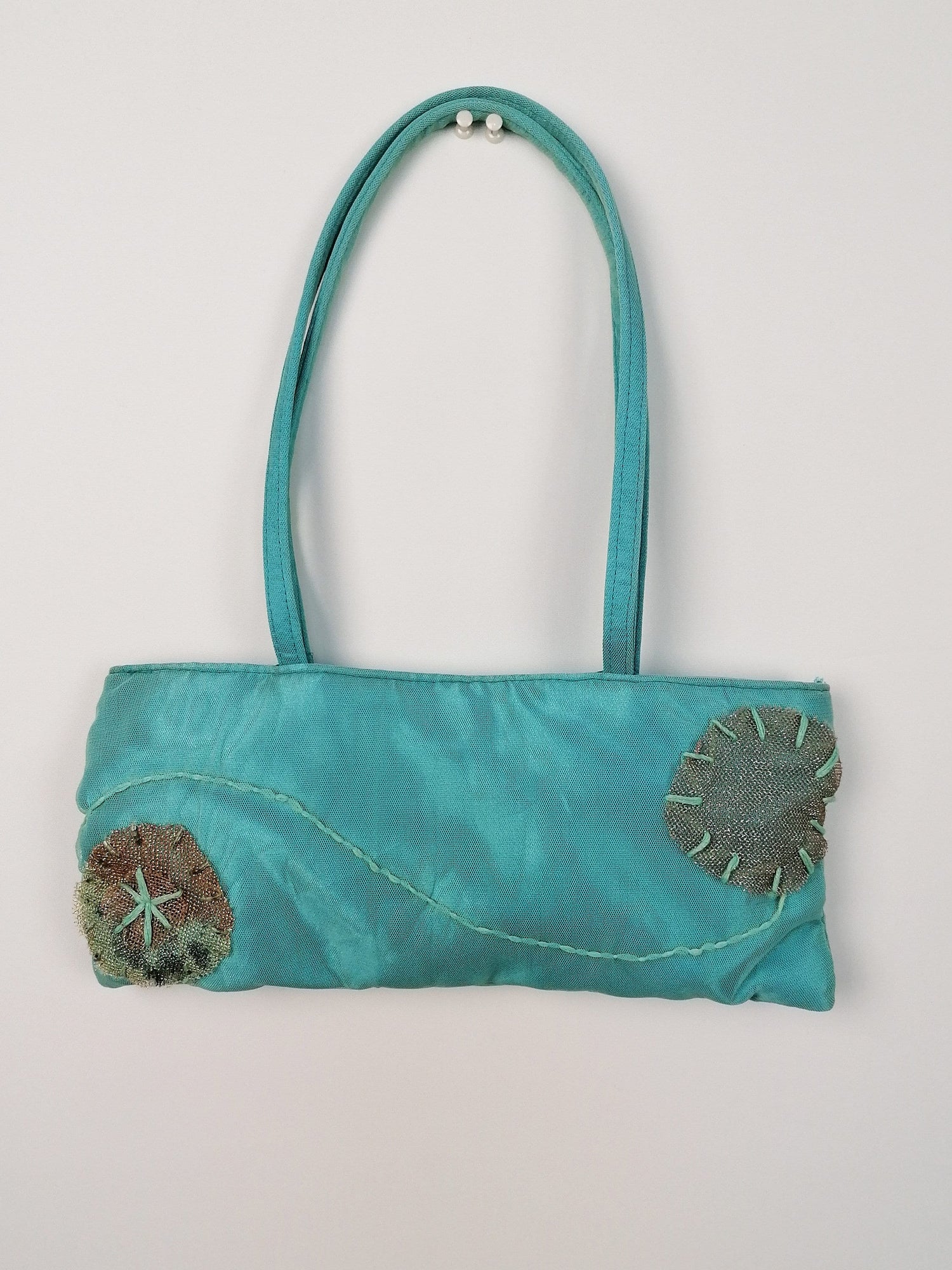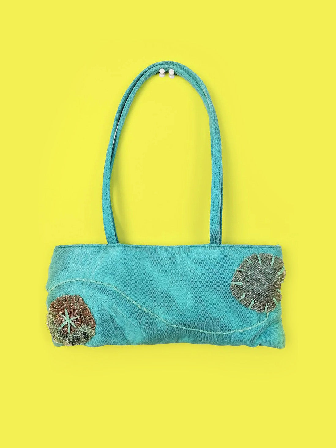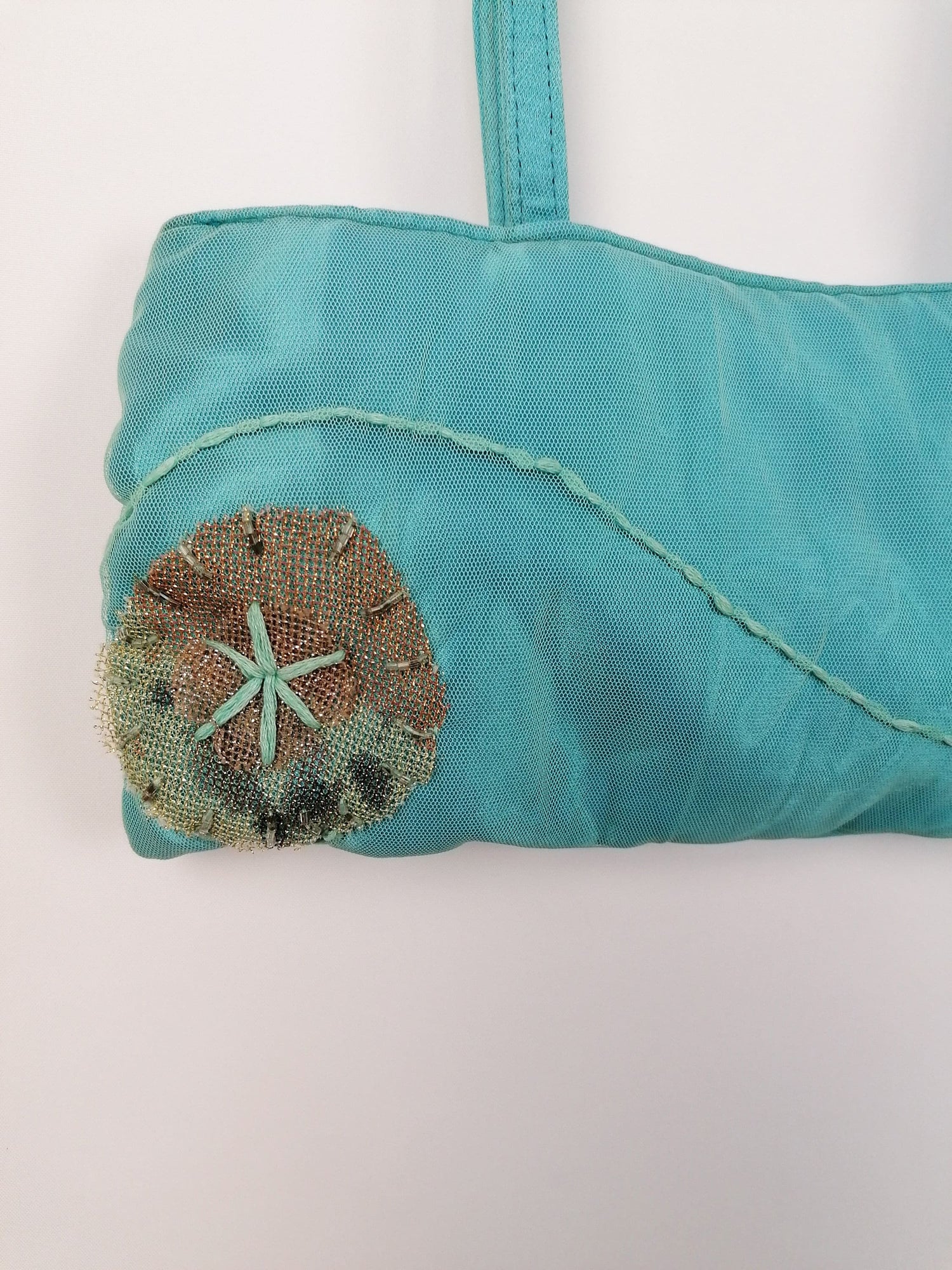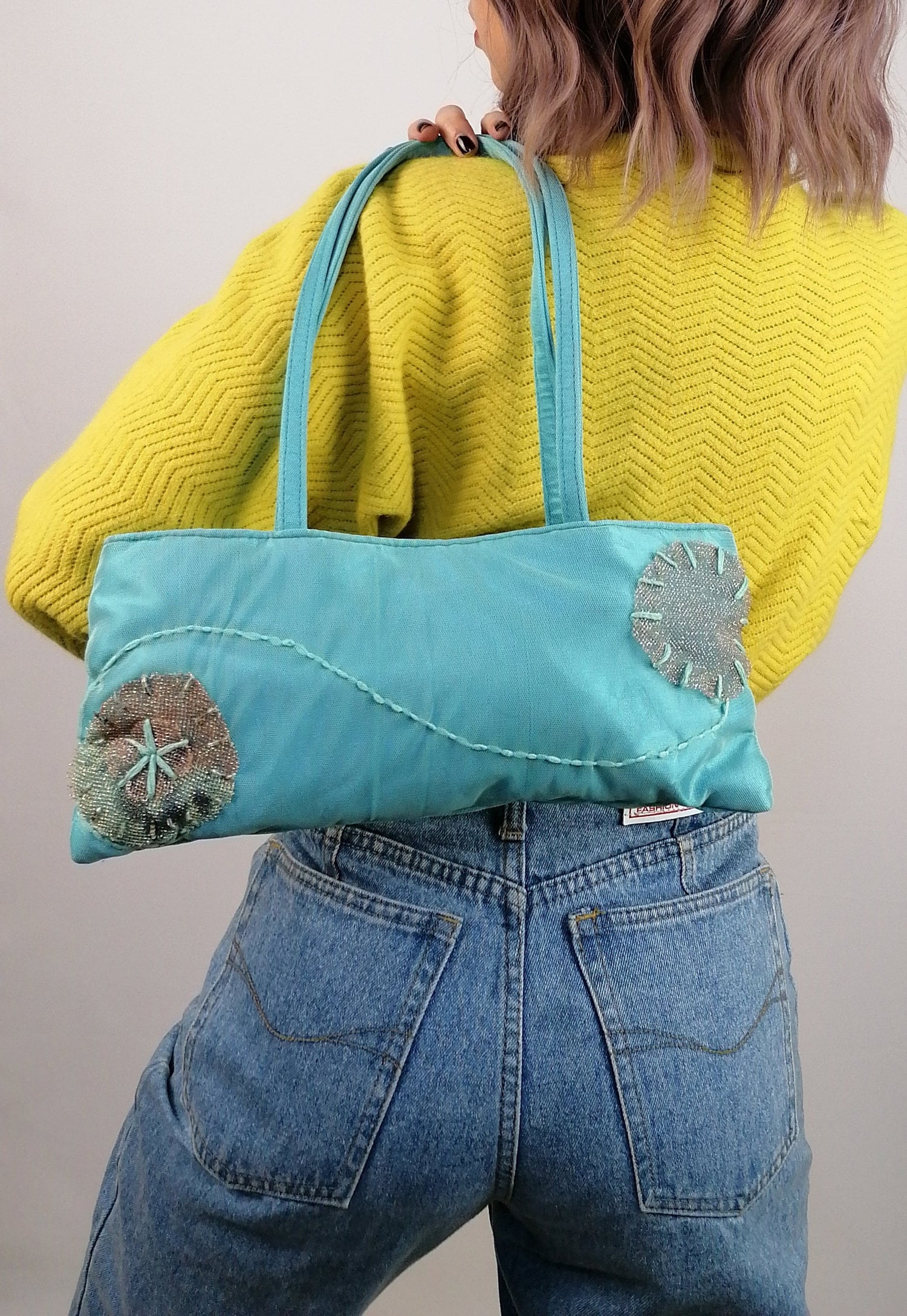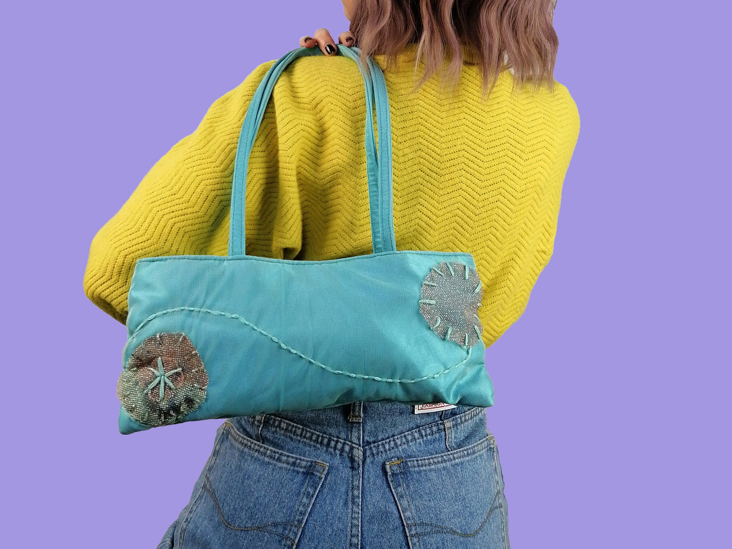 Beautiful vintage 90's Y2K small rectangular party bag, light blue satin with mesh and embellishments, adorable!