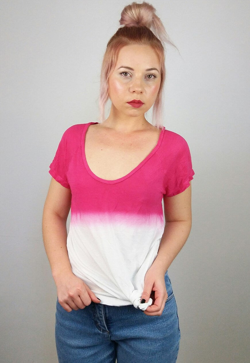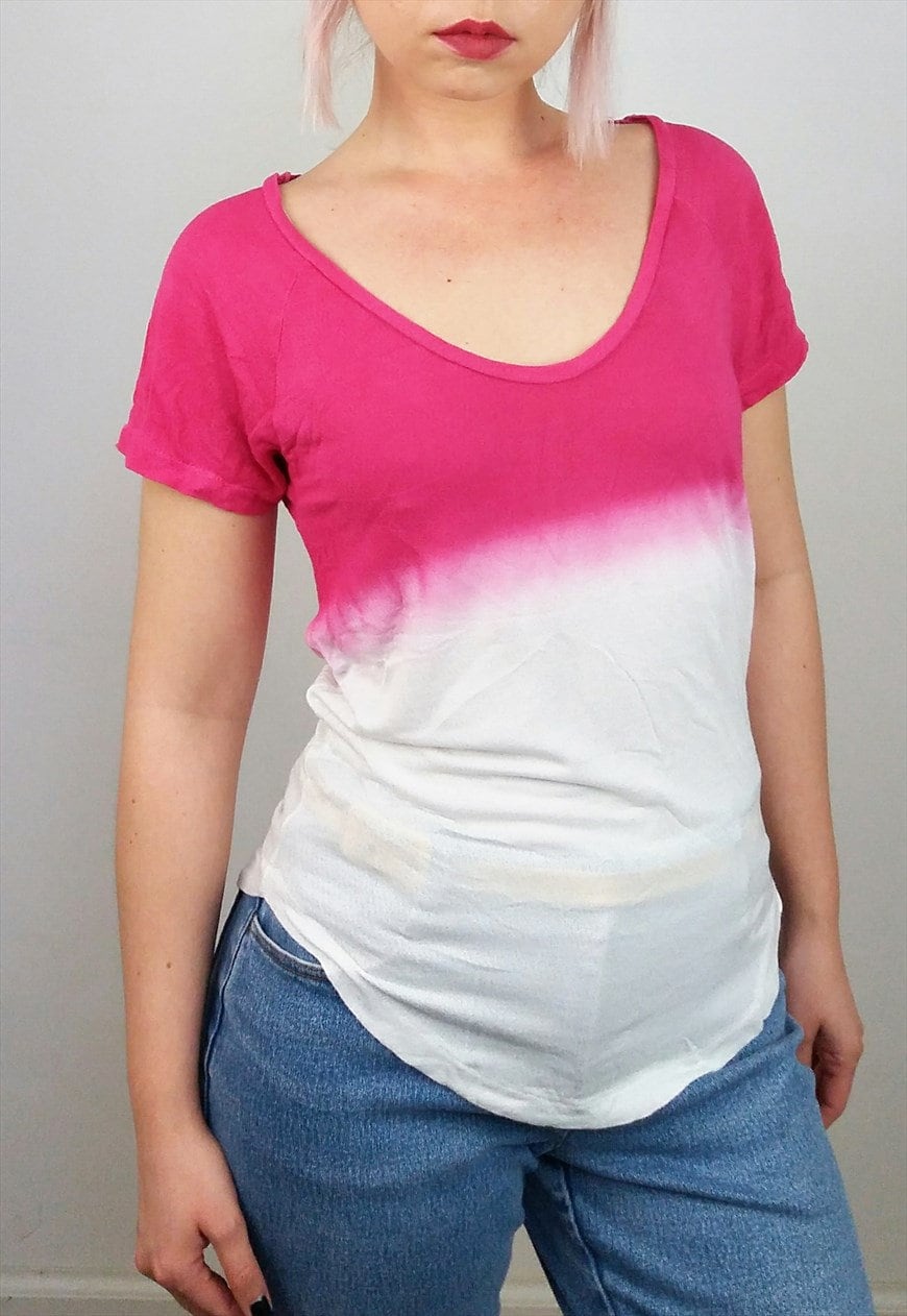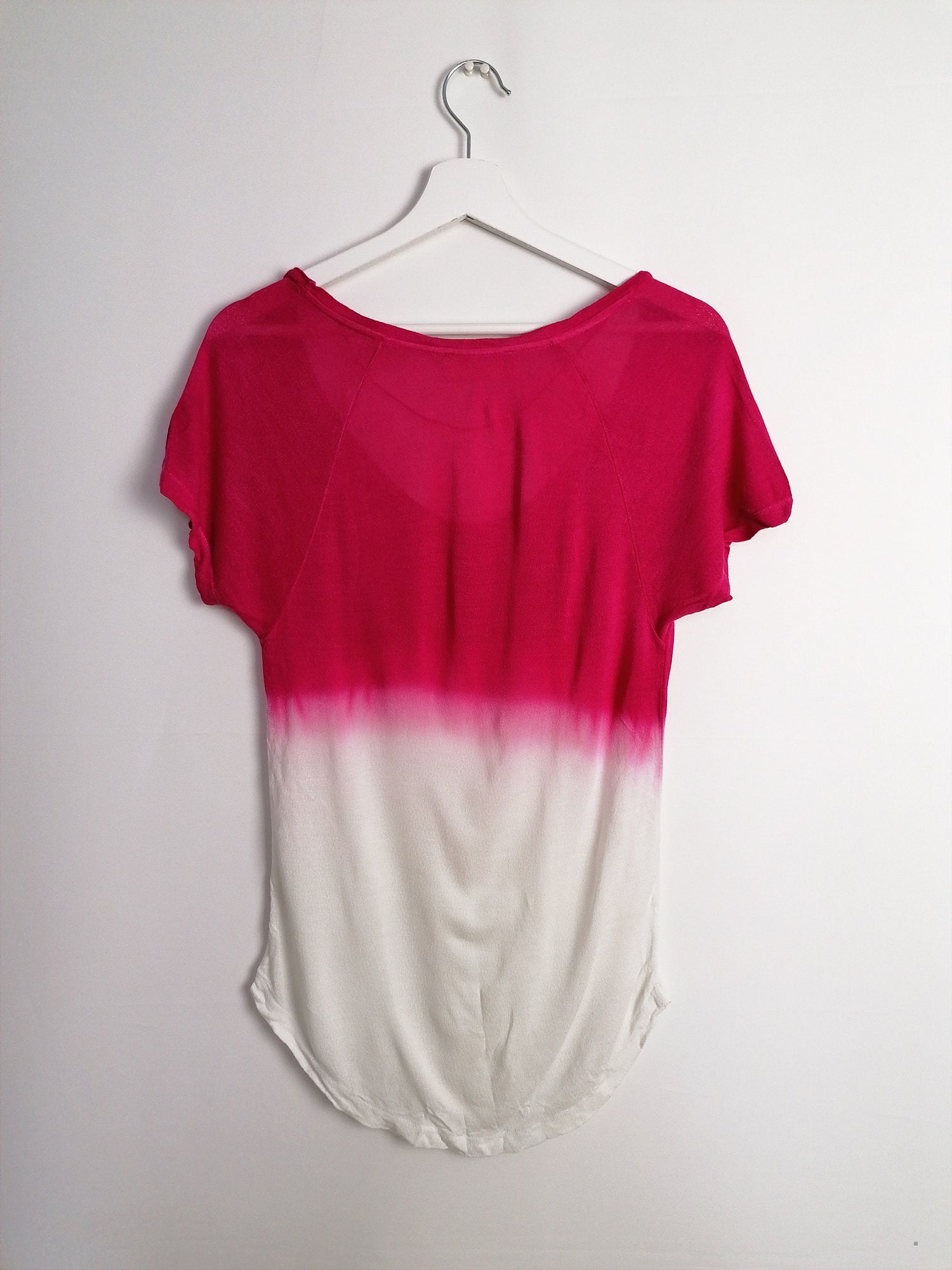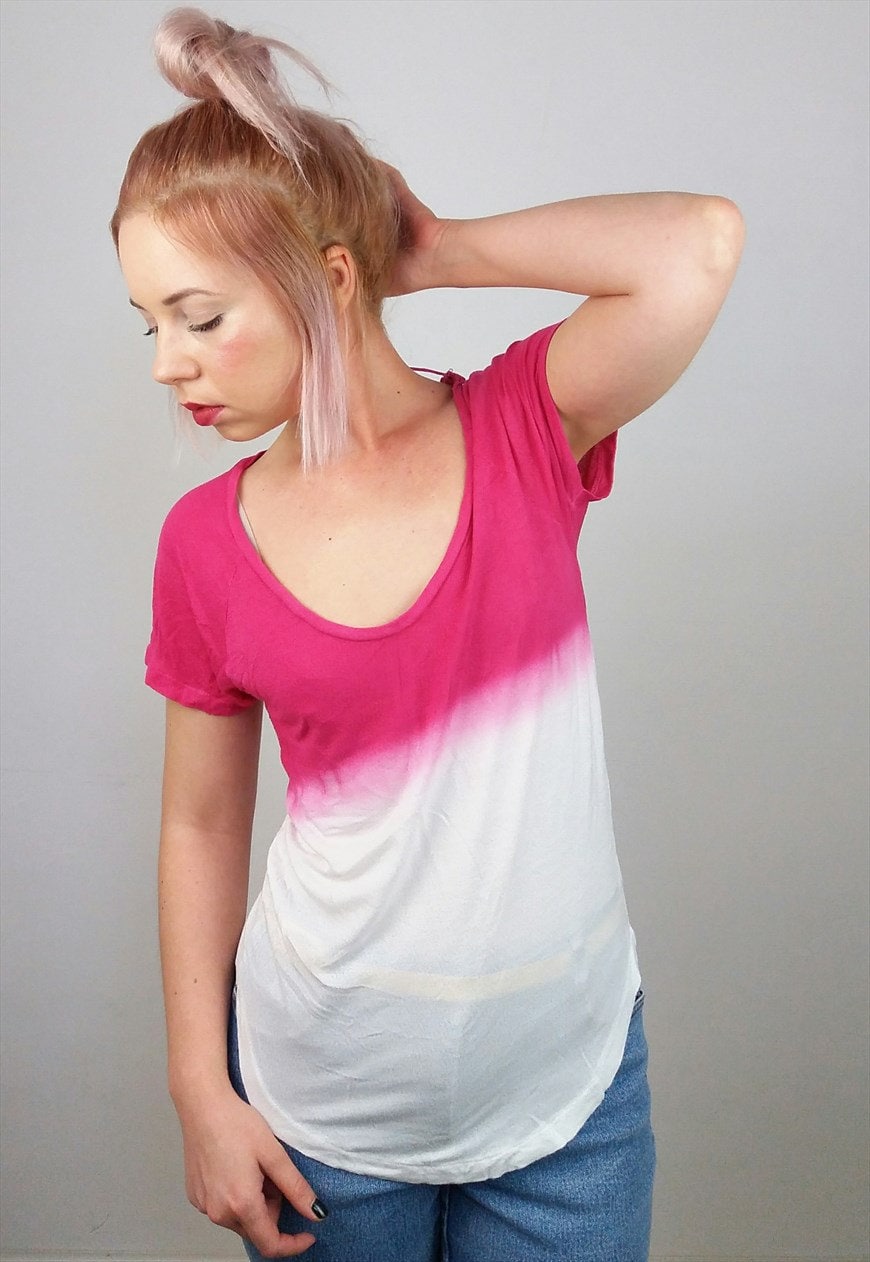 Vintage loose top, softest stretch knit fabric, easy and light, beautiful ombre pink on white, slightly see-through, large boat neck.