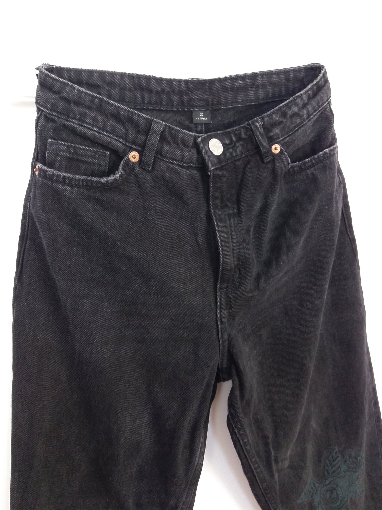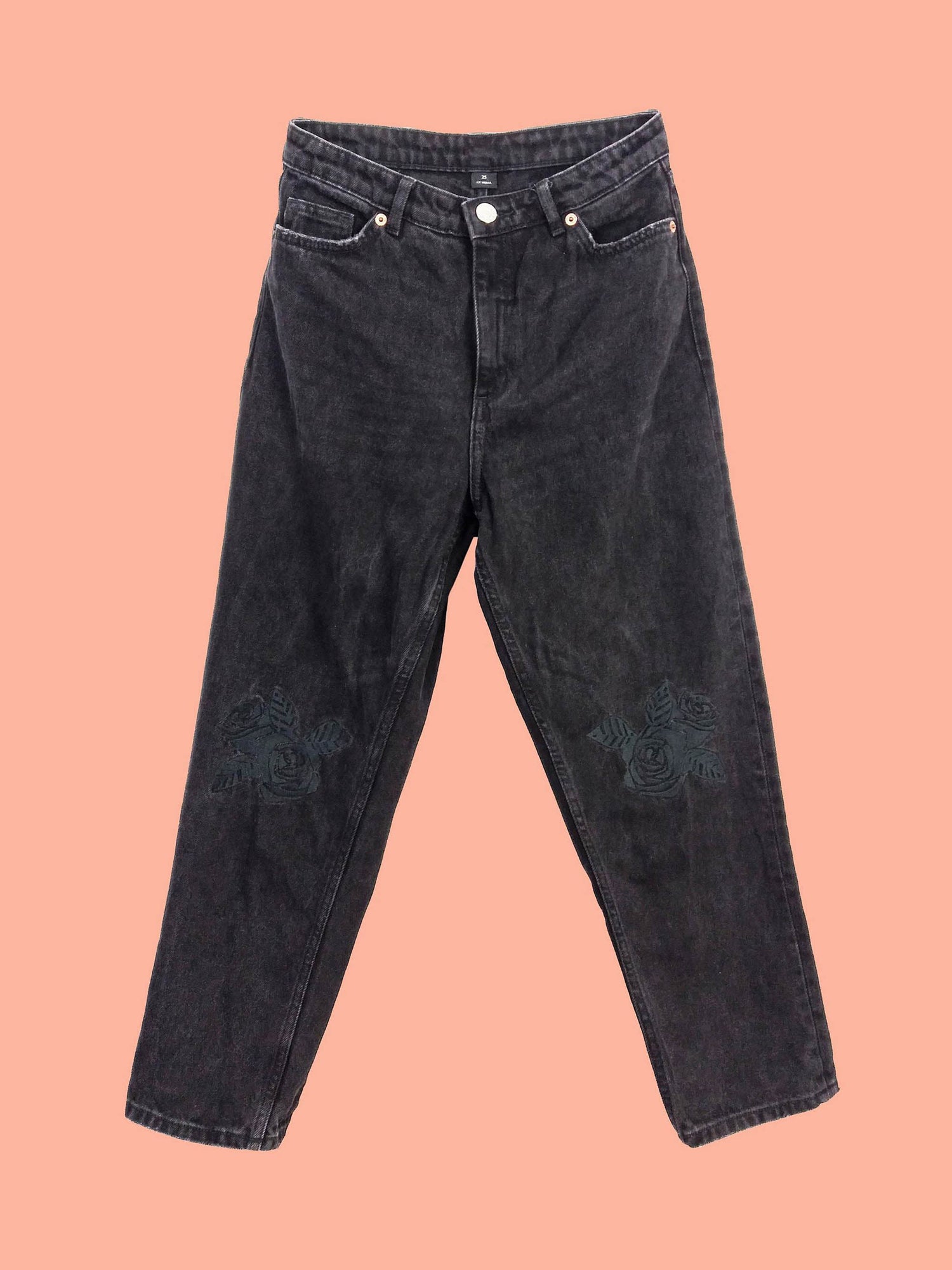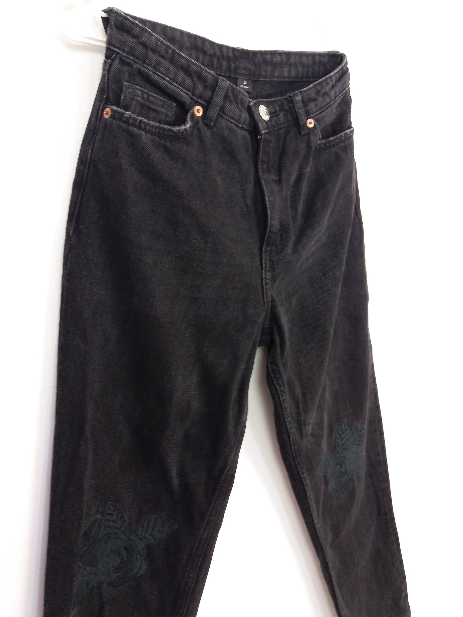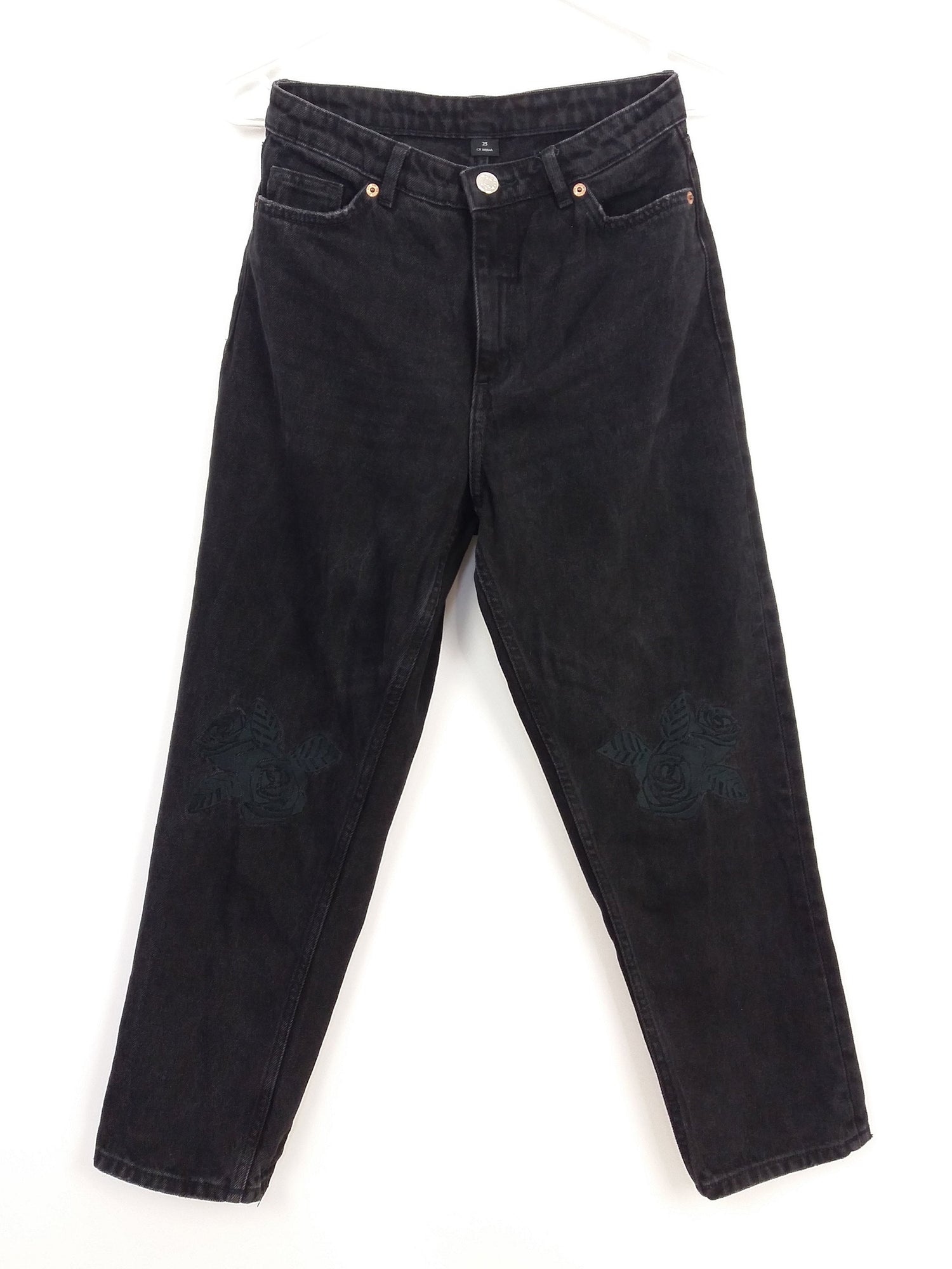 MONKI High Waist Black Mom Jeans Flower Embroidery Patch ~ size 25 - XS-S