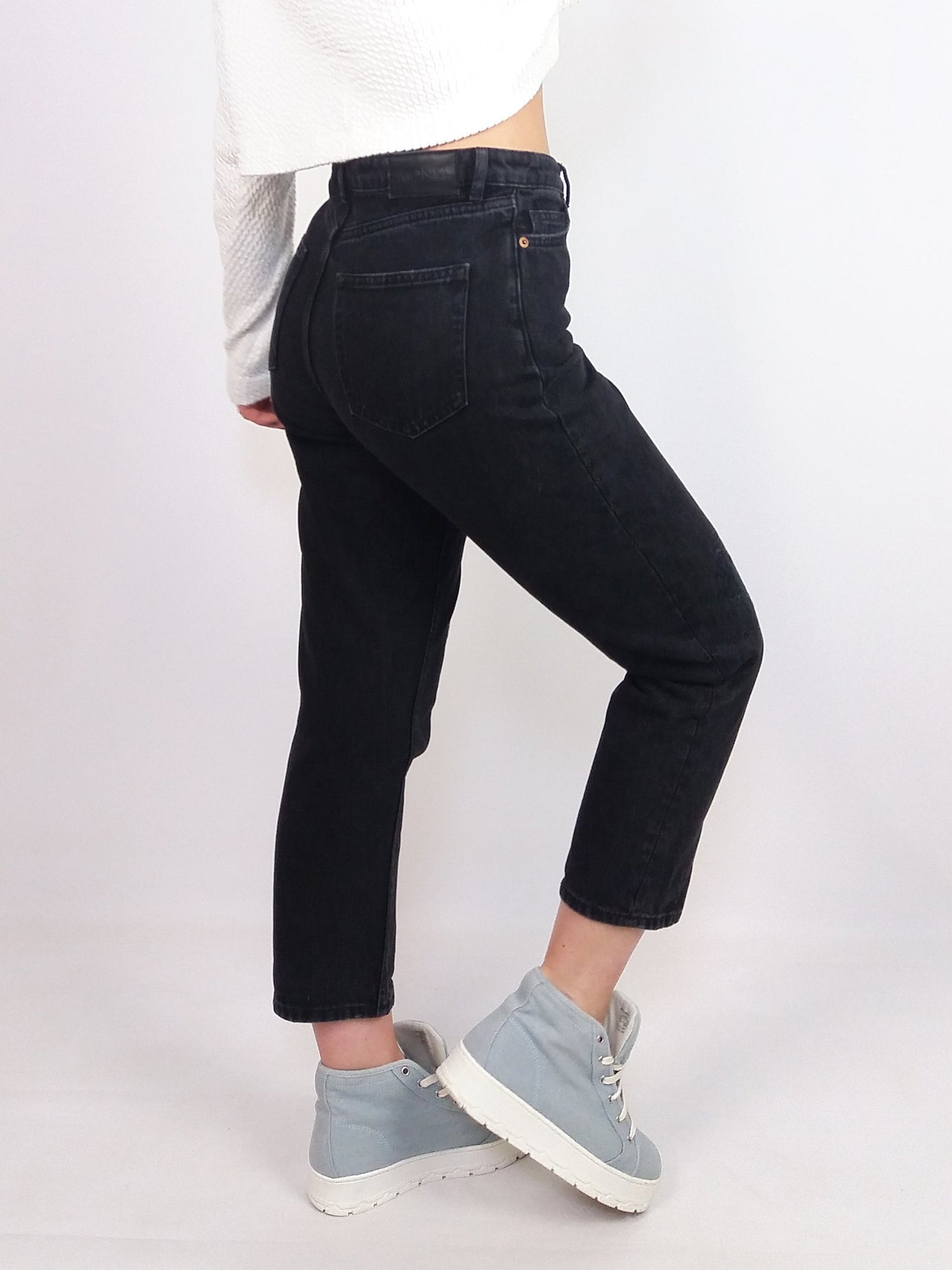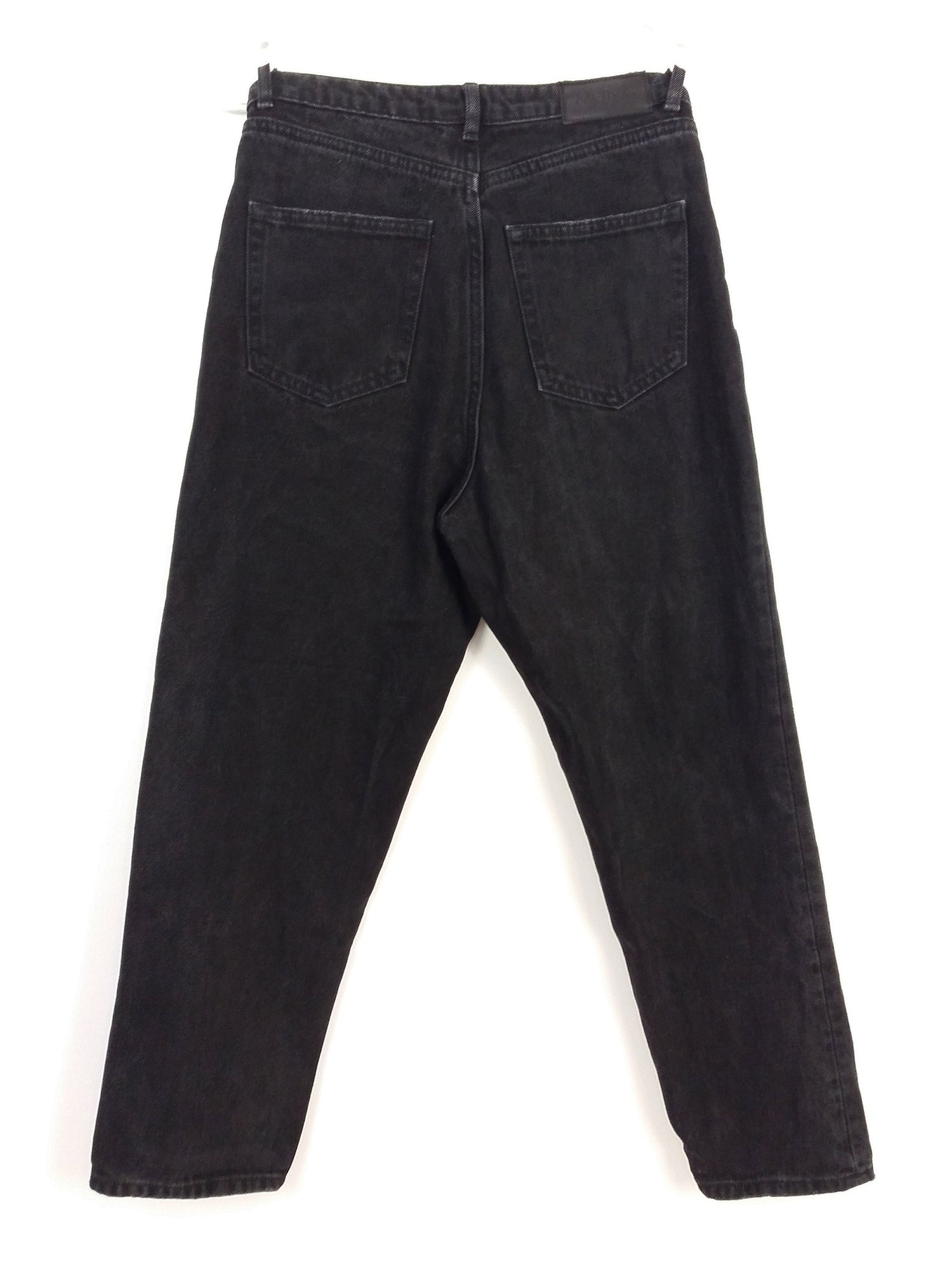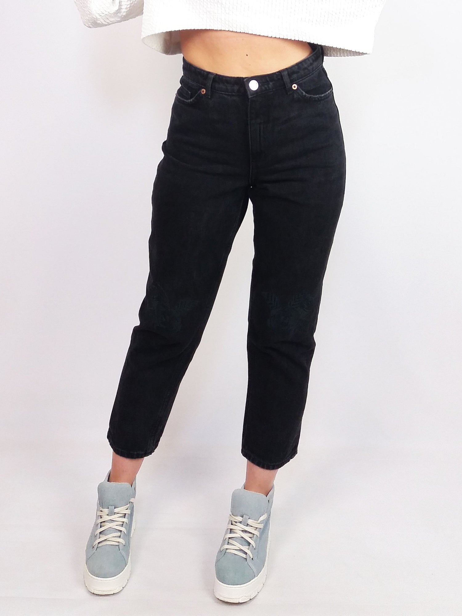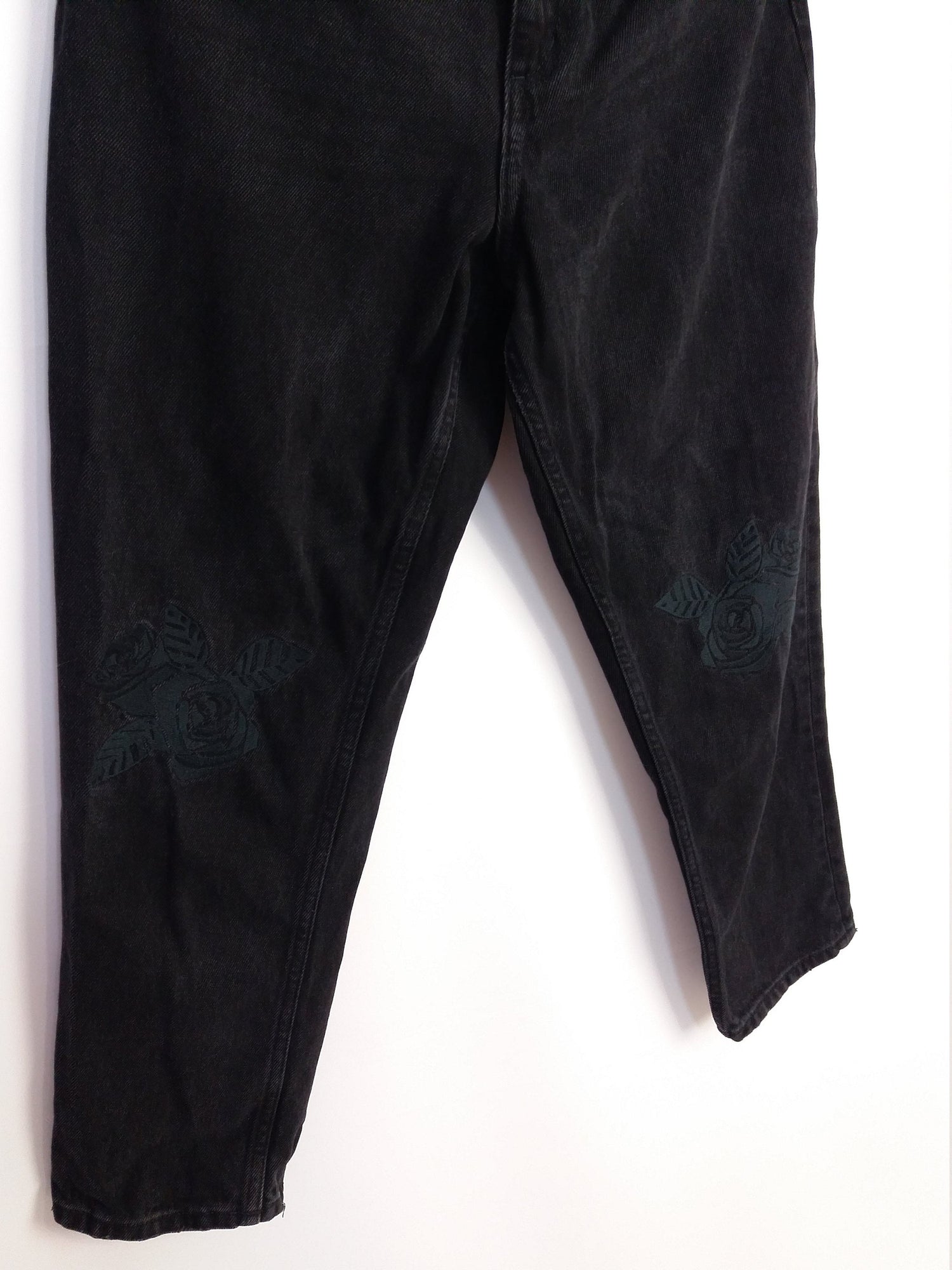 Amazing Monki black mom-jeans with black rose patches on the knees. High waist, tapered.