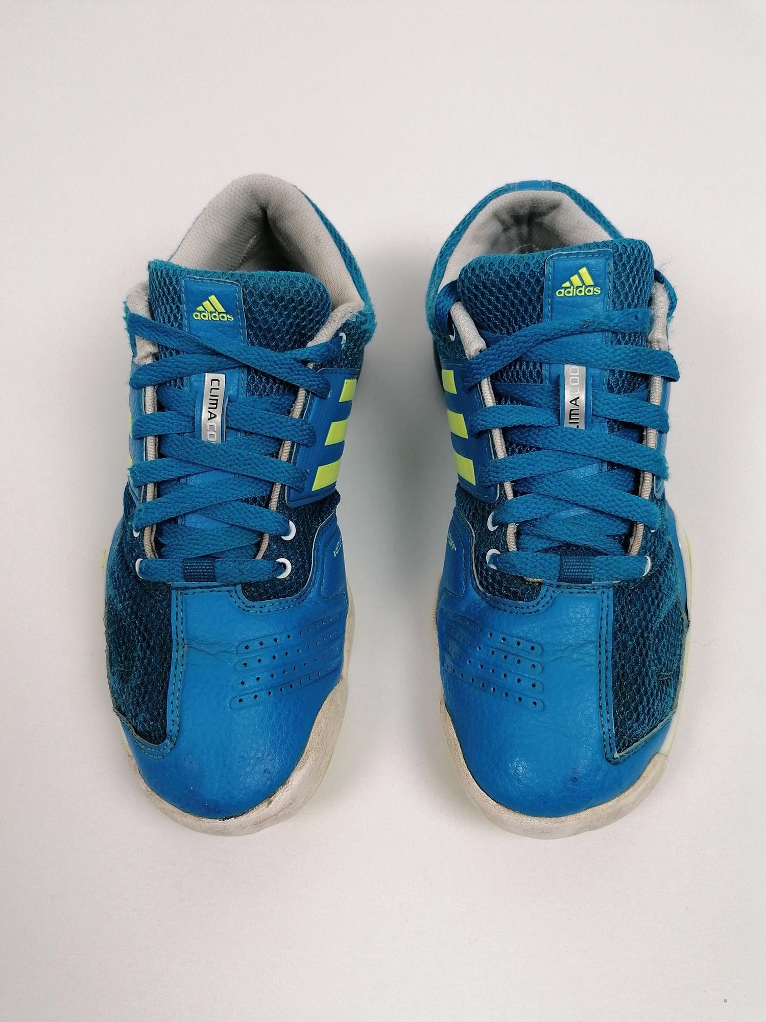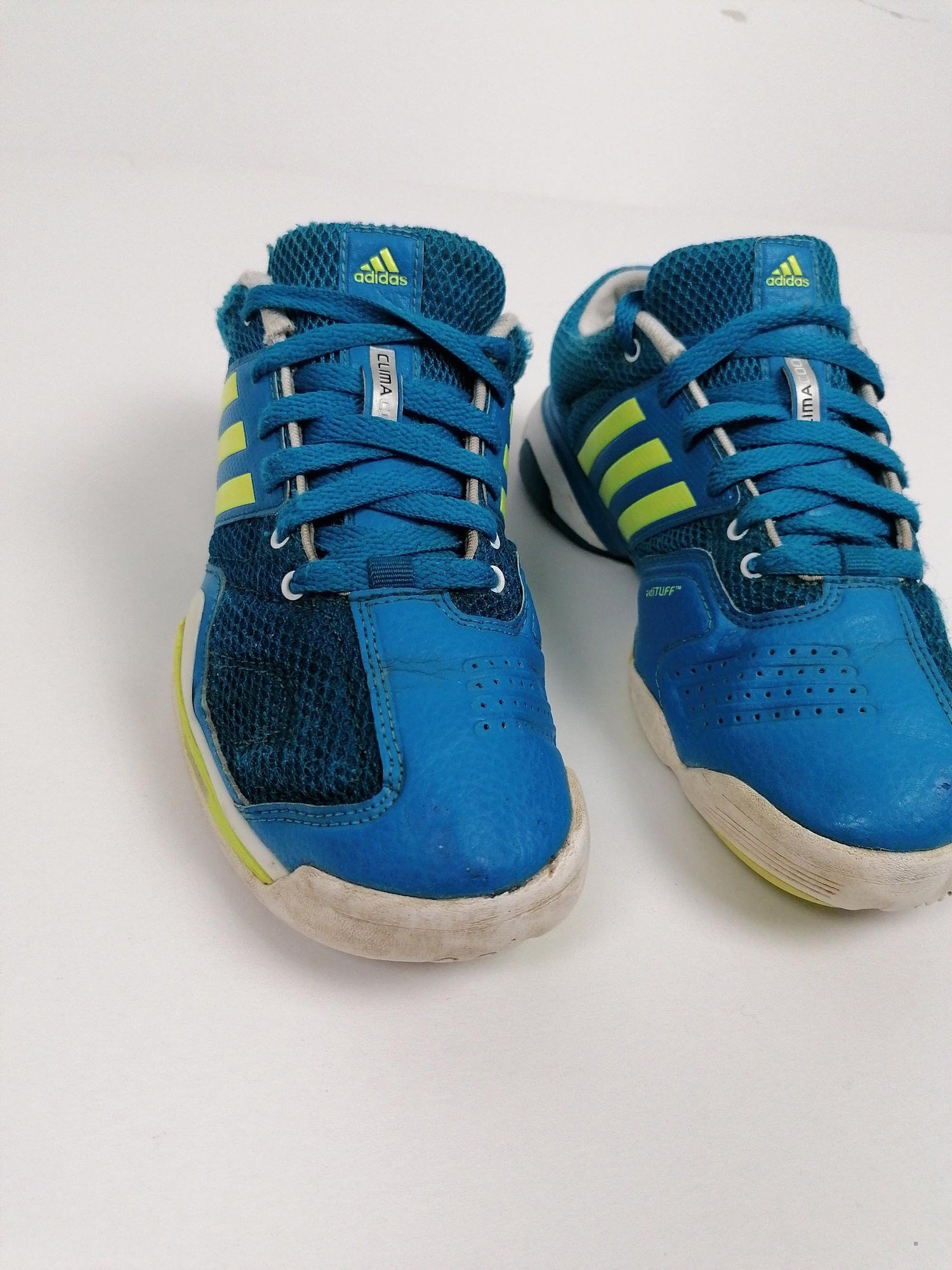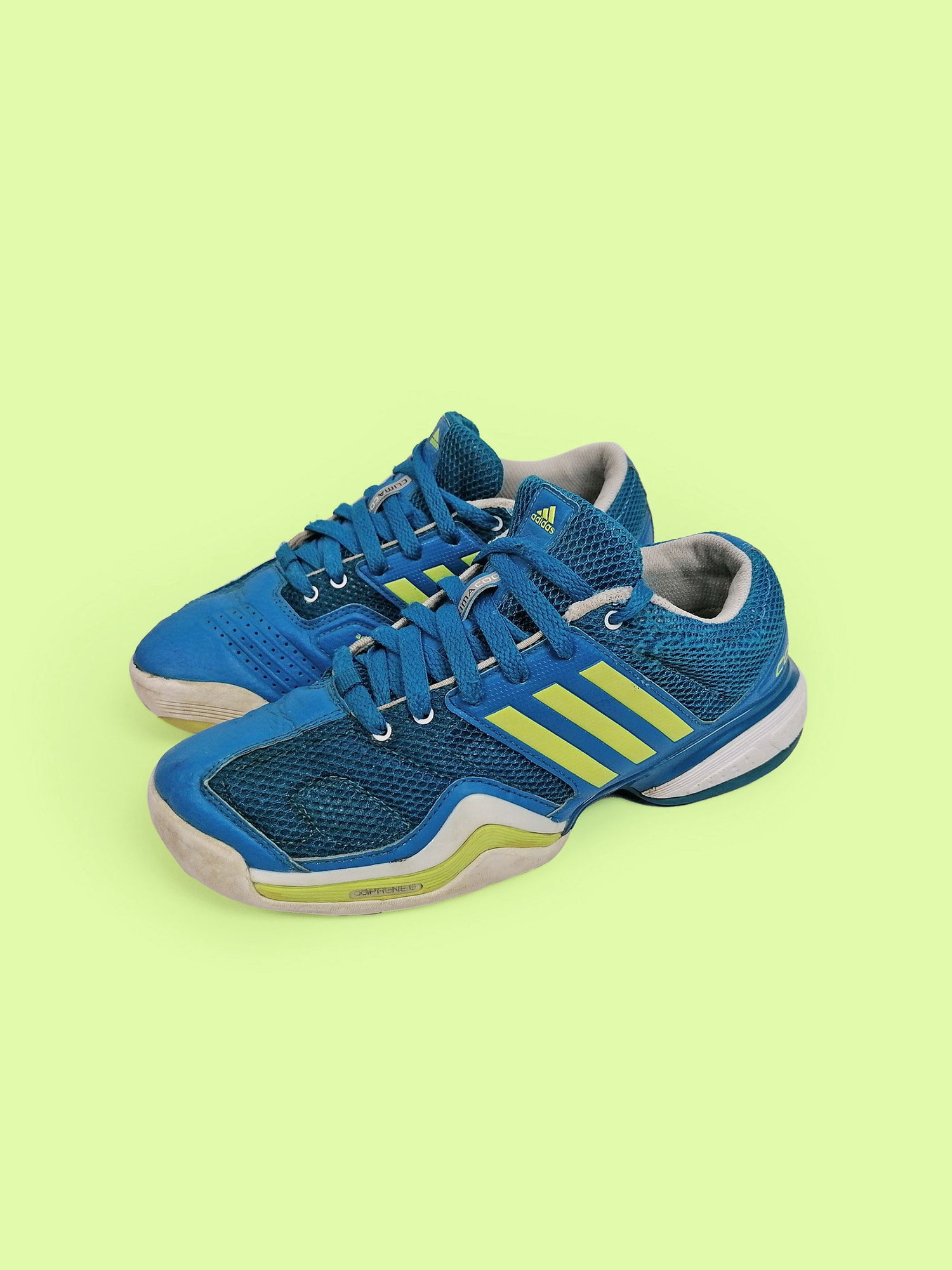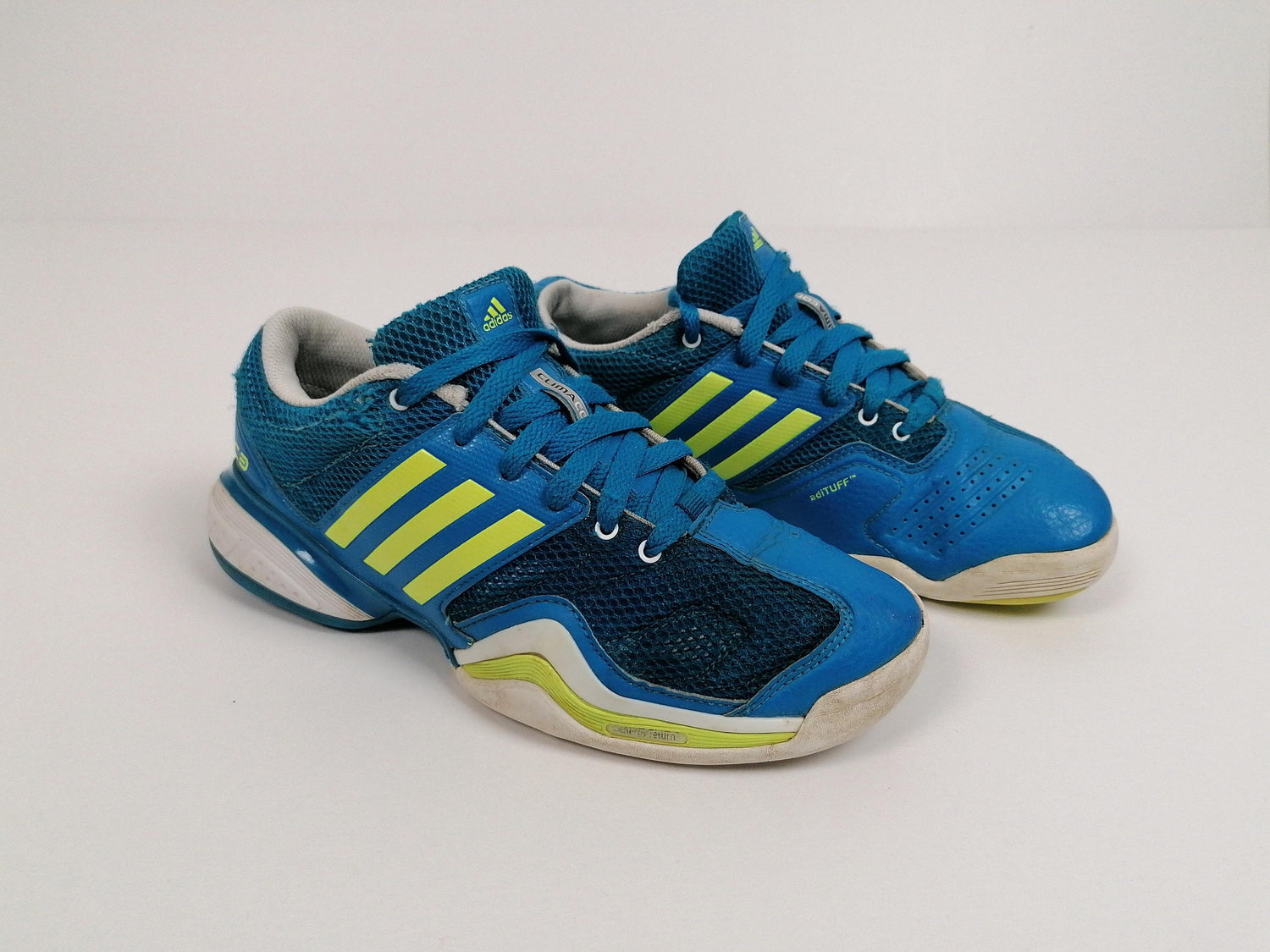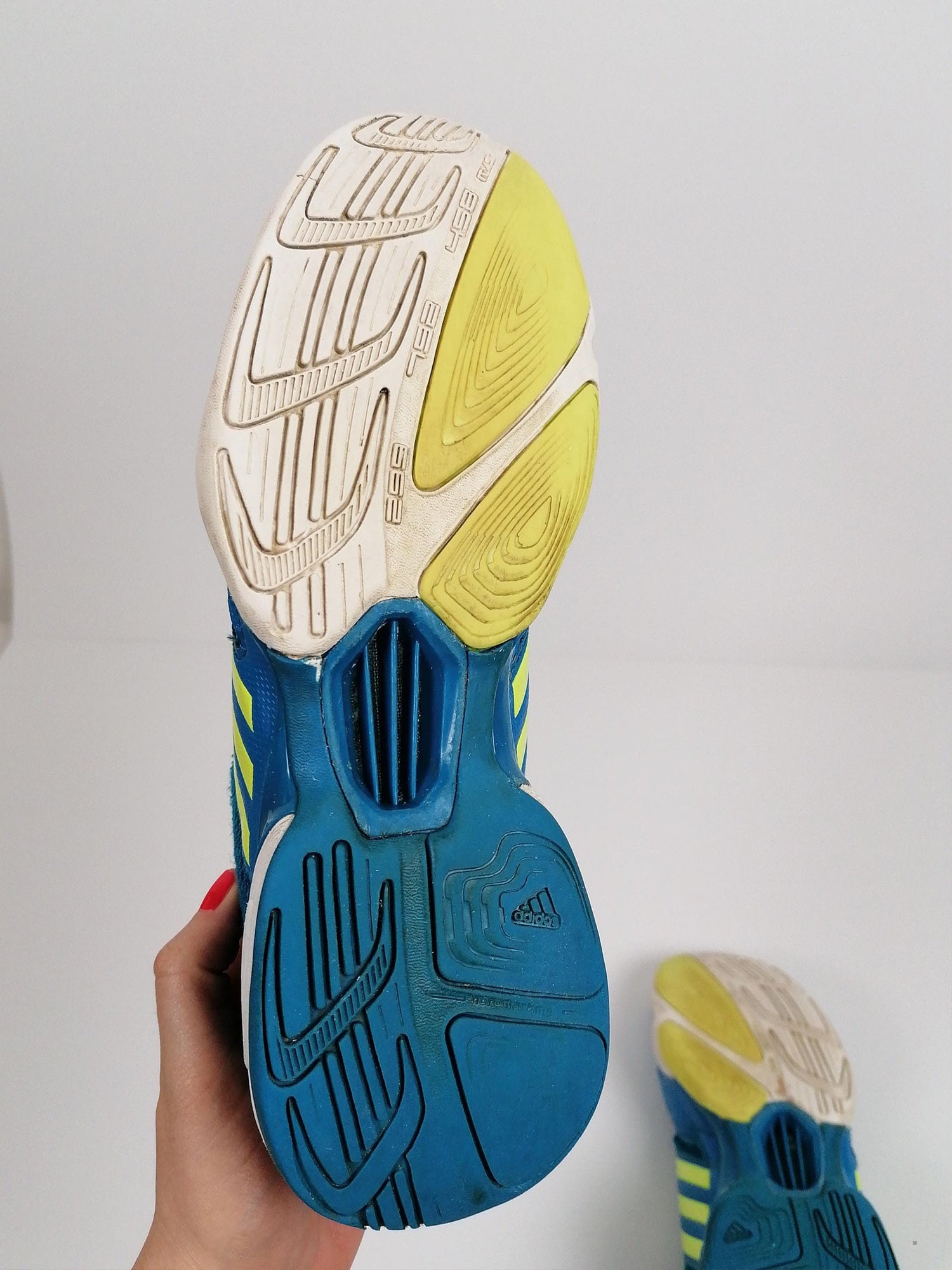 Vintage 2011 Adidas Adituff running/tennis sneakers, blue with fluo yellow-green stripes.
