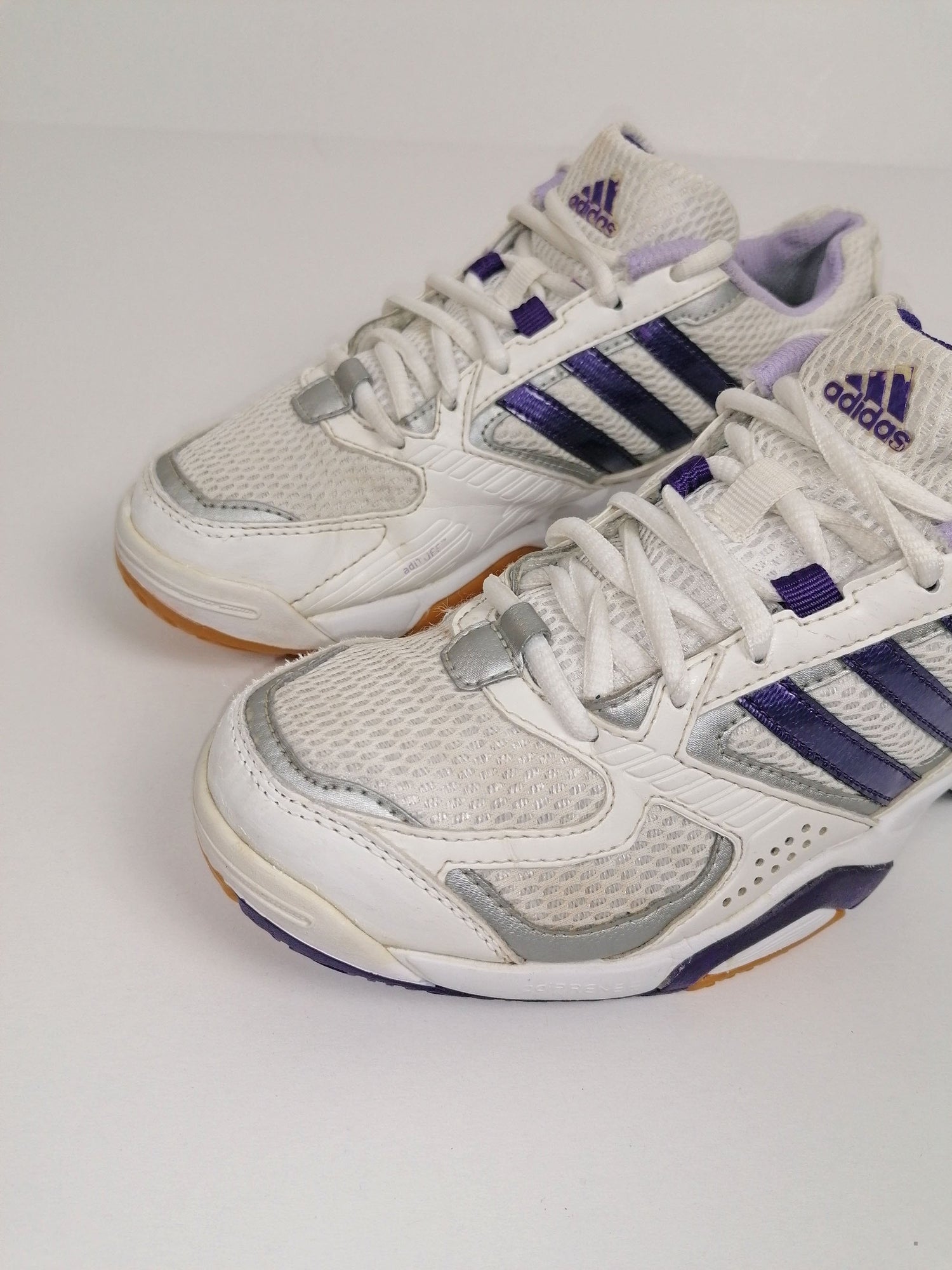 Vintage 2011 Adidas Adituff running/tennis sneakers, white shiny purple stripes.