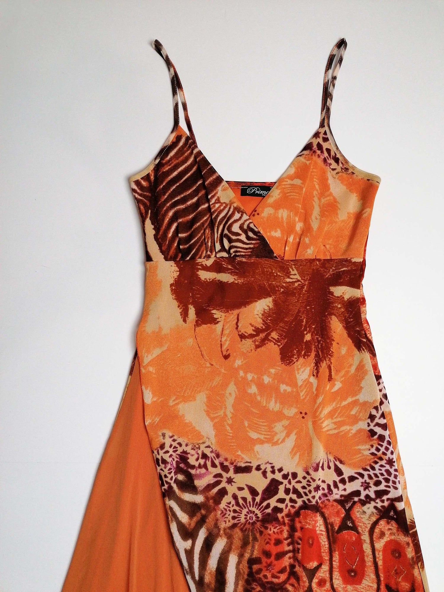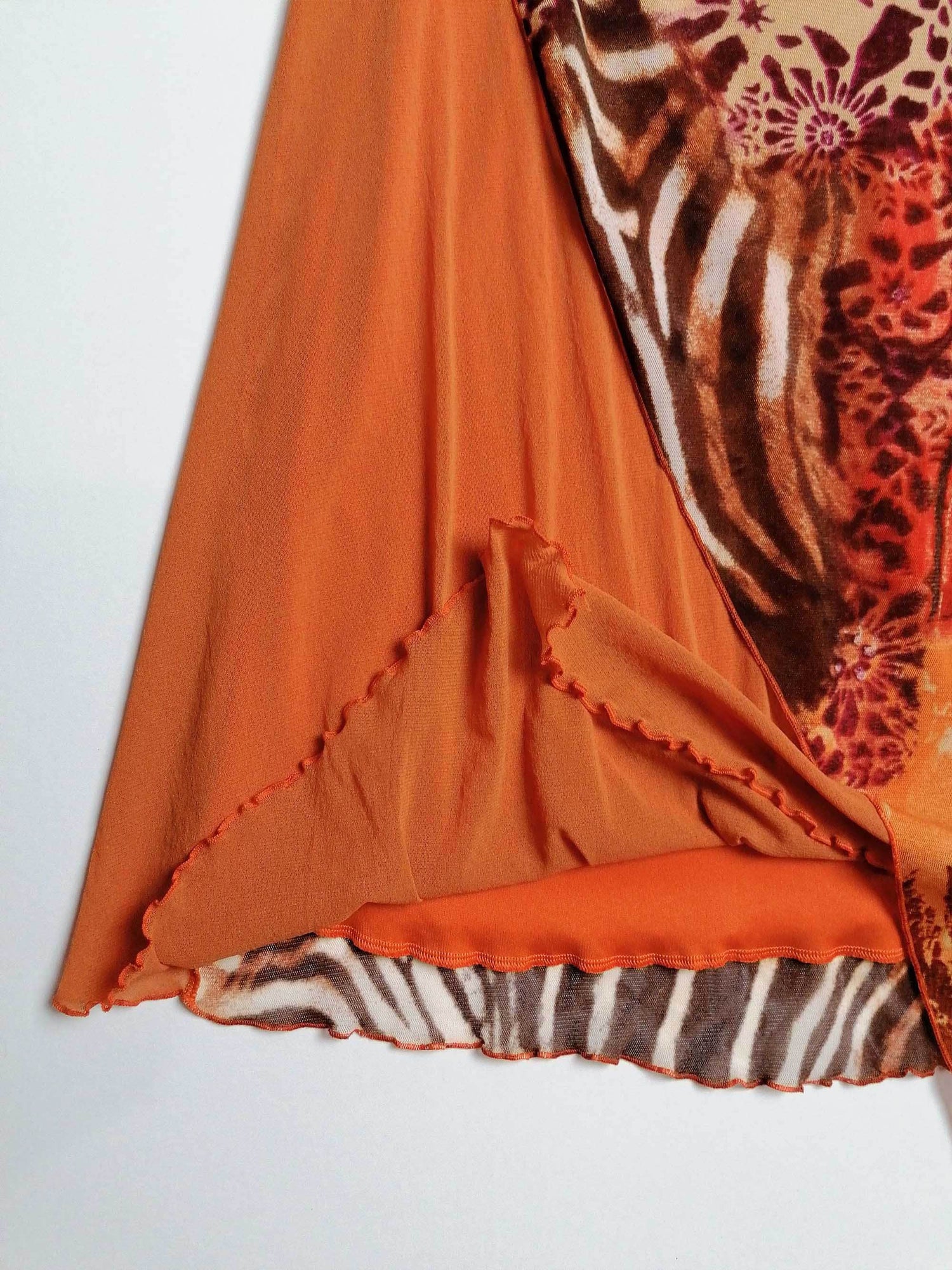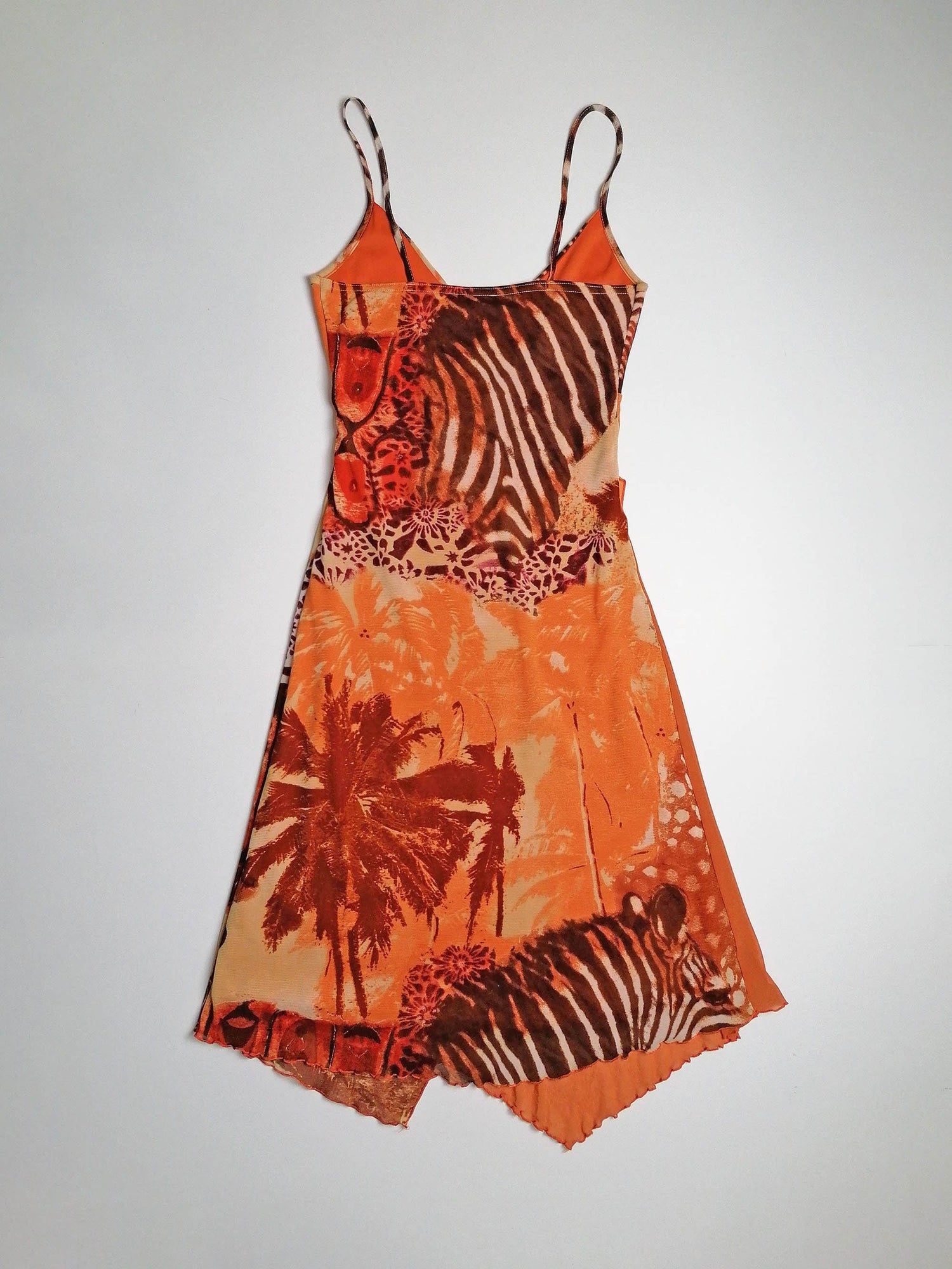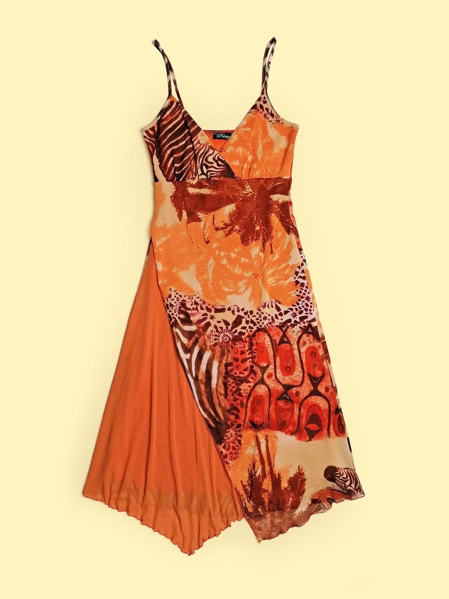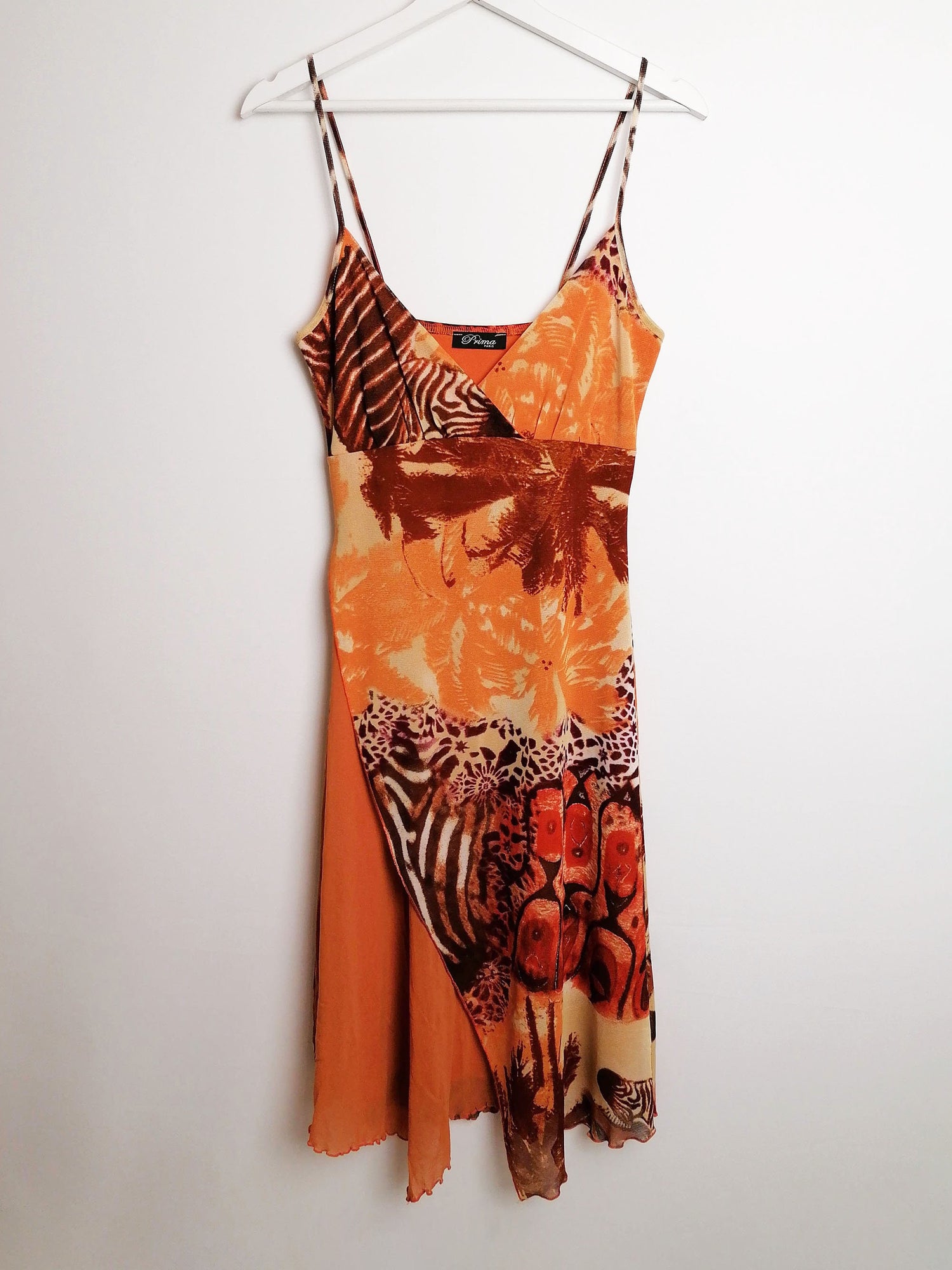 Vintage Y2K Prima Paris micro-mesh dress, asymmetric bottom, double-layered. Gorgeous animal print, abstract safari scene. Has a lot of stretch.