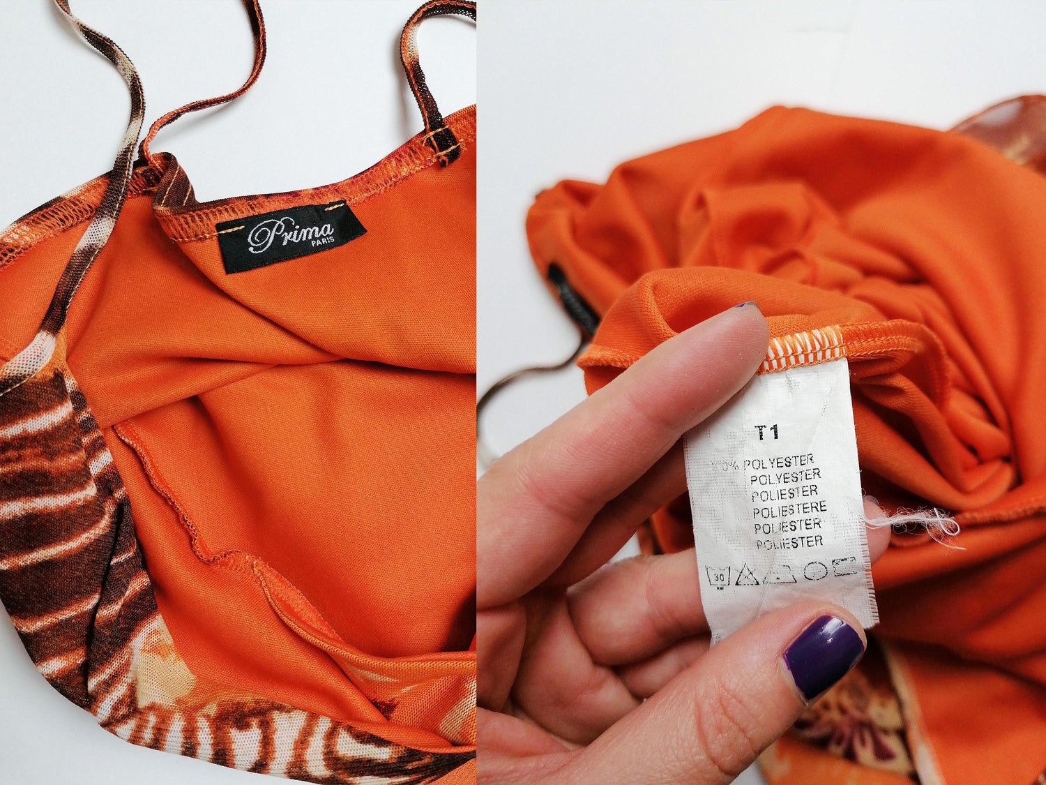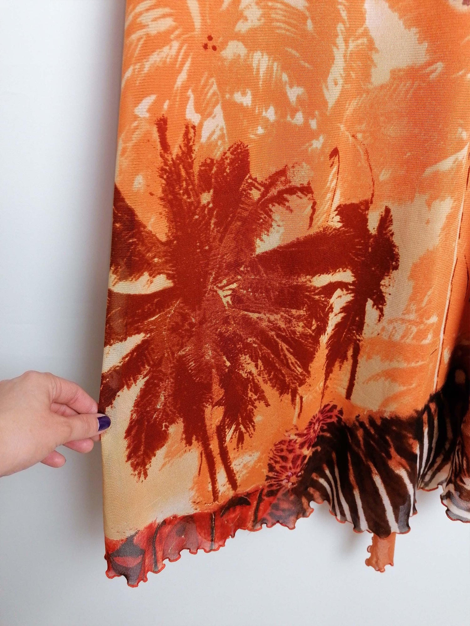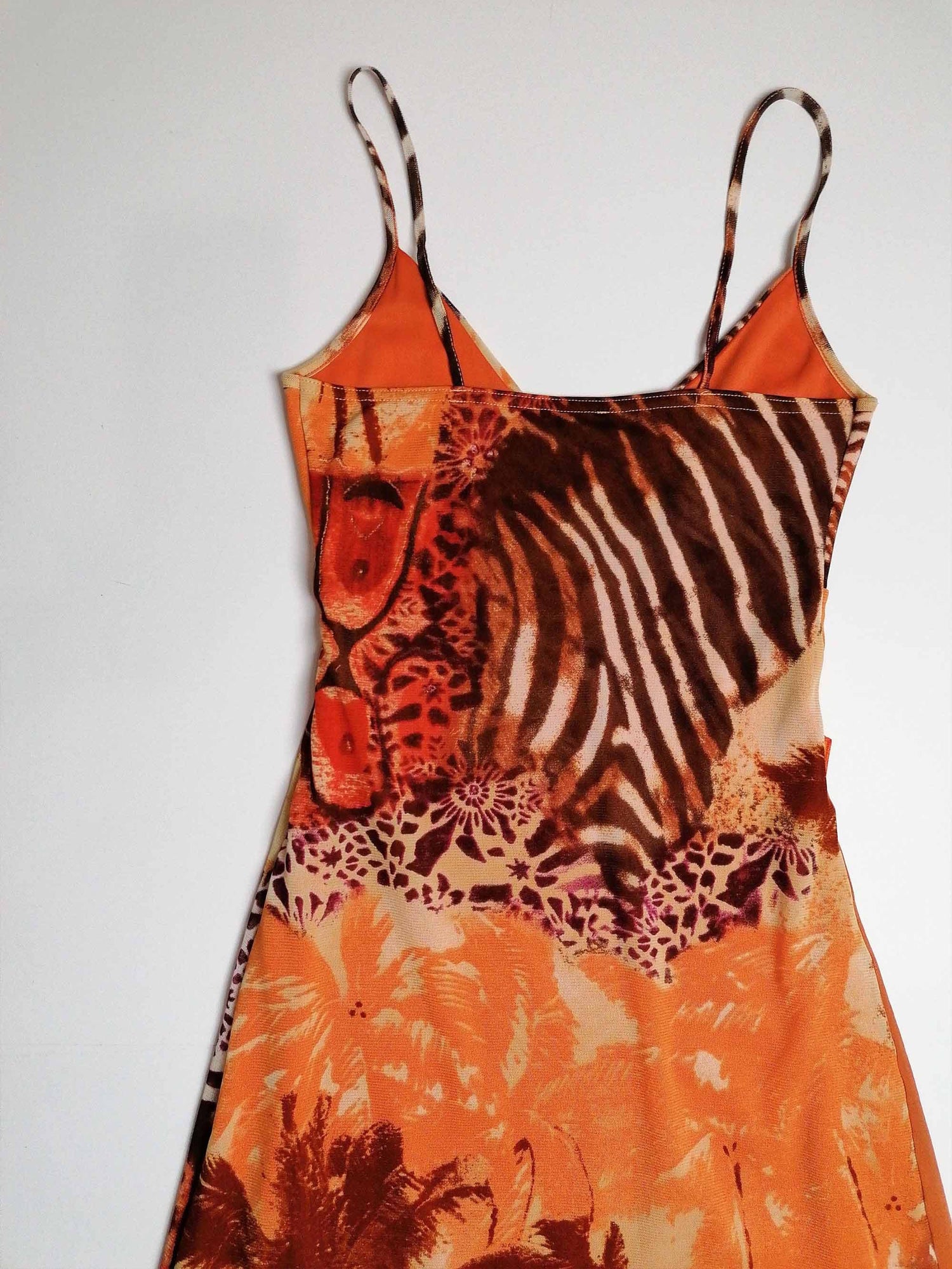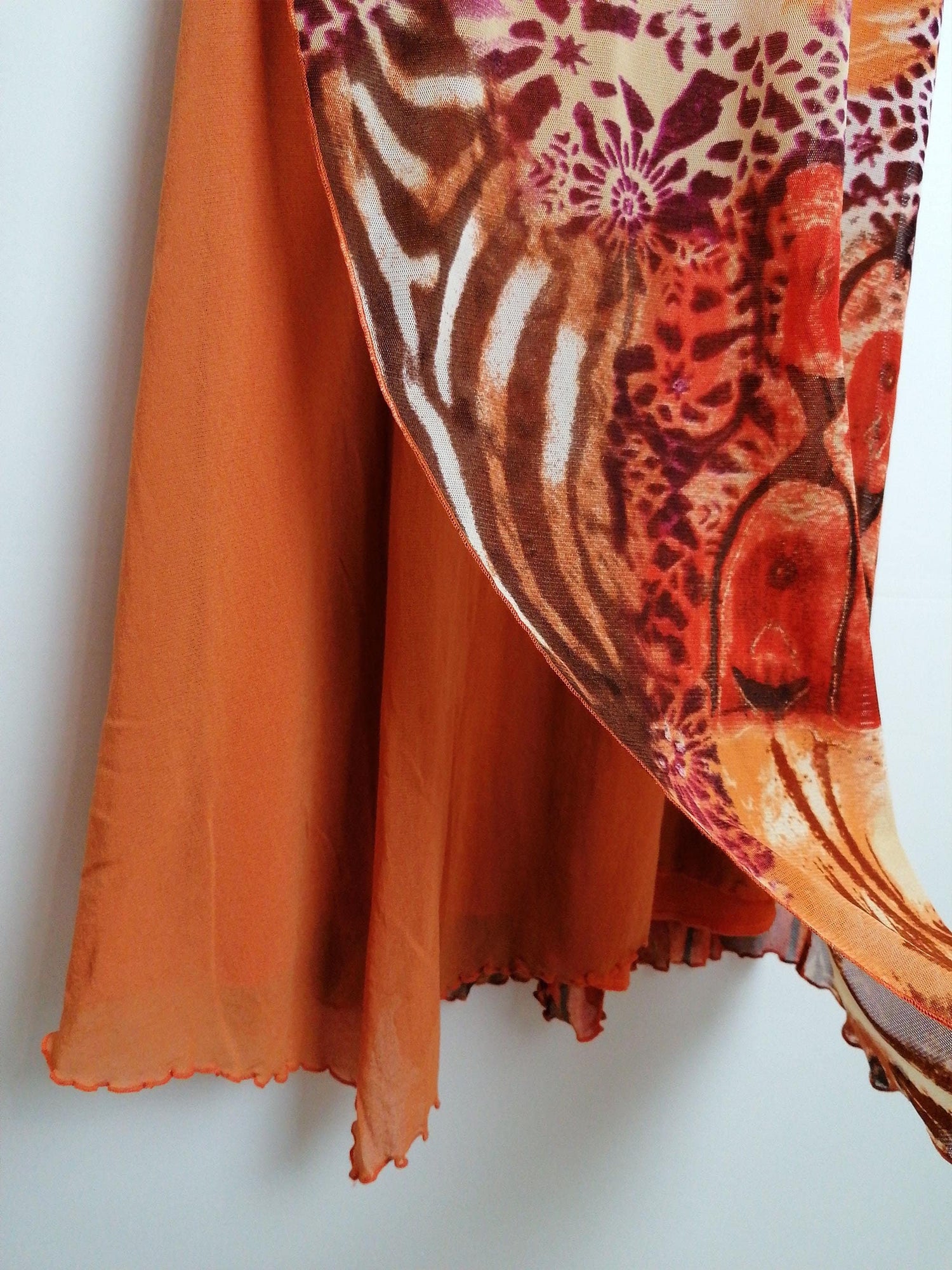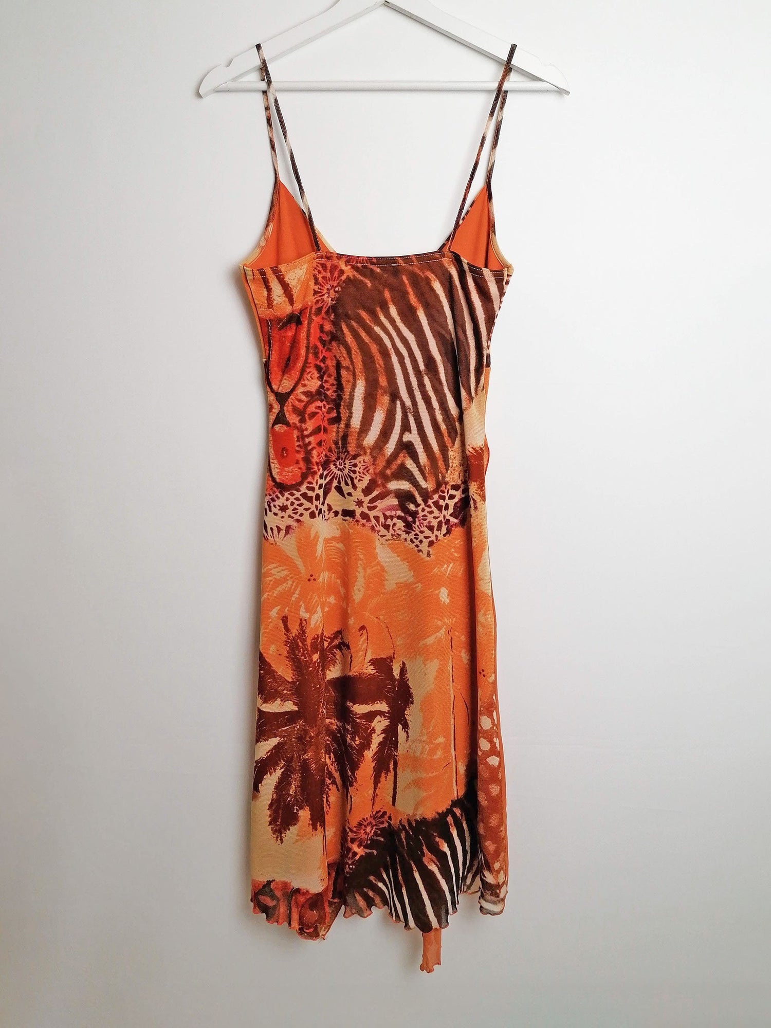 Vintage Y2K Prima Paris micro-mesh dress, asymmetric bottom, double-layered. Gorgeous animal print, abstract safari scene. Has a lot of stretch.