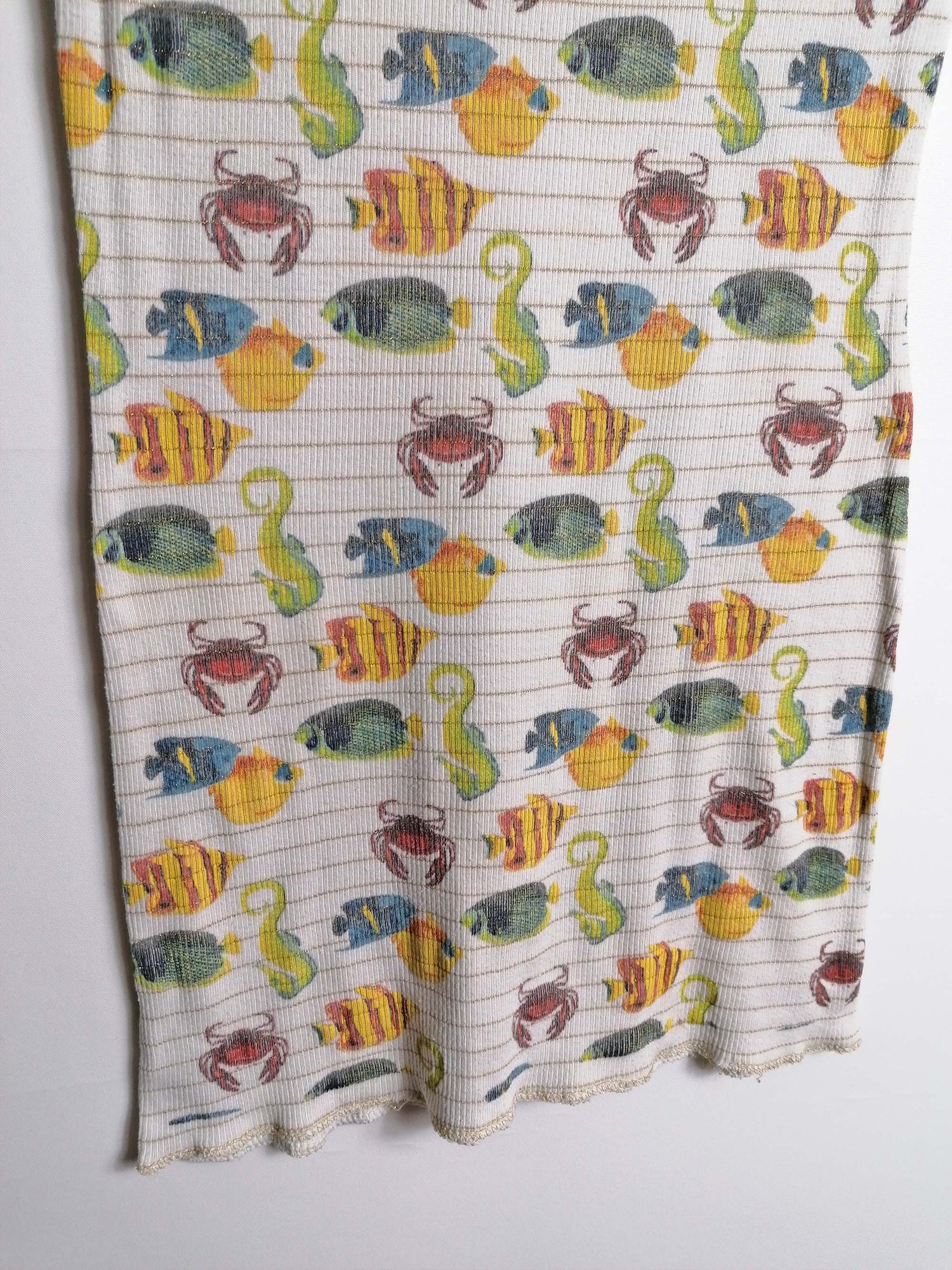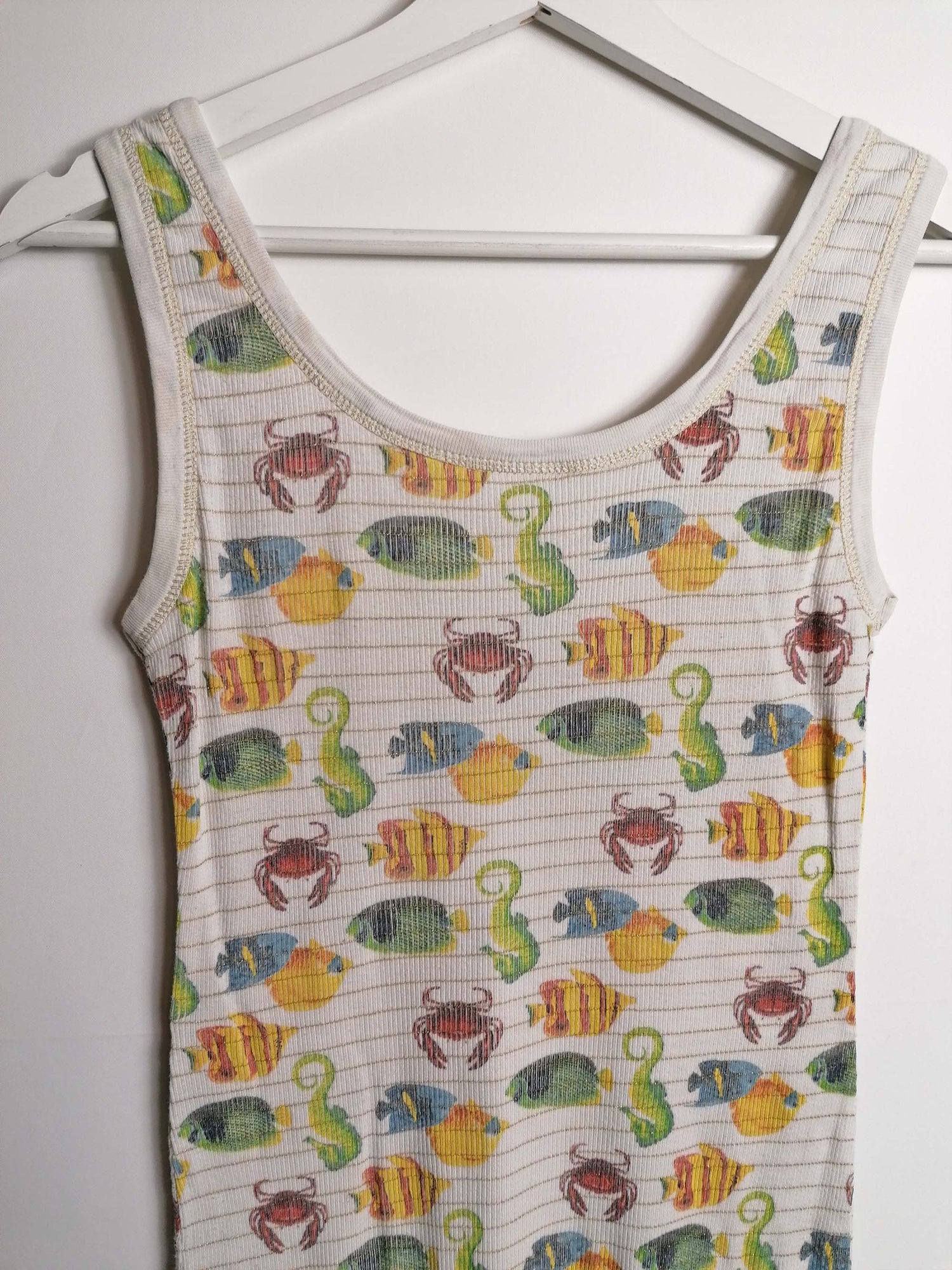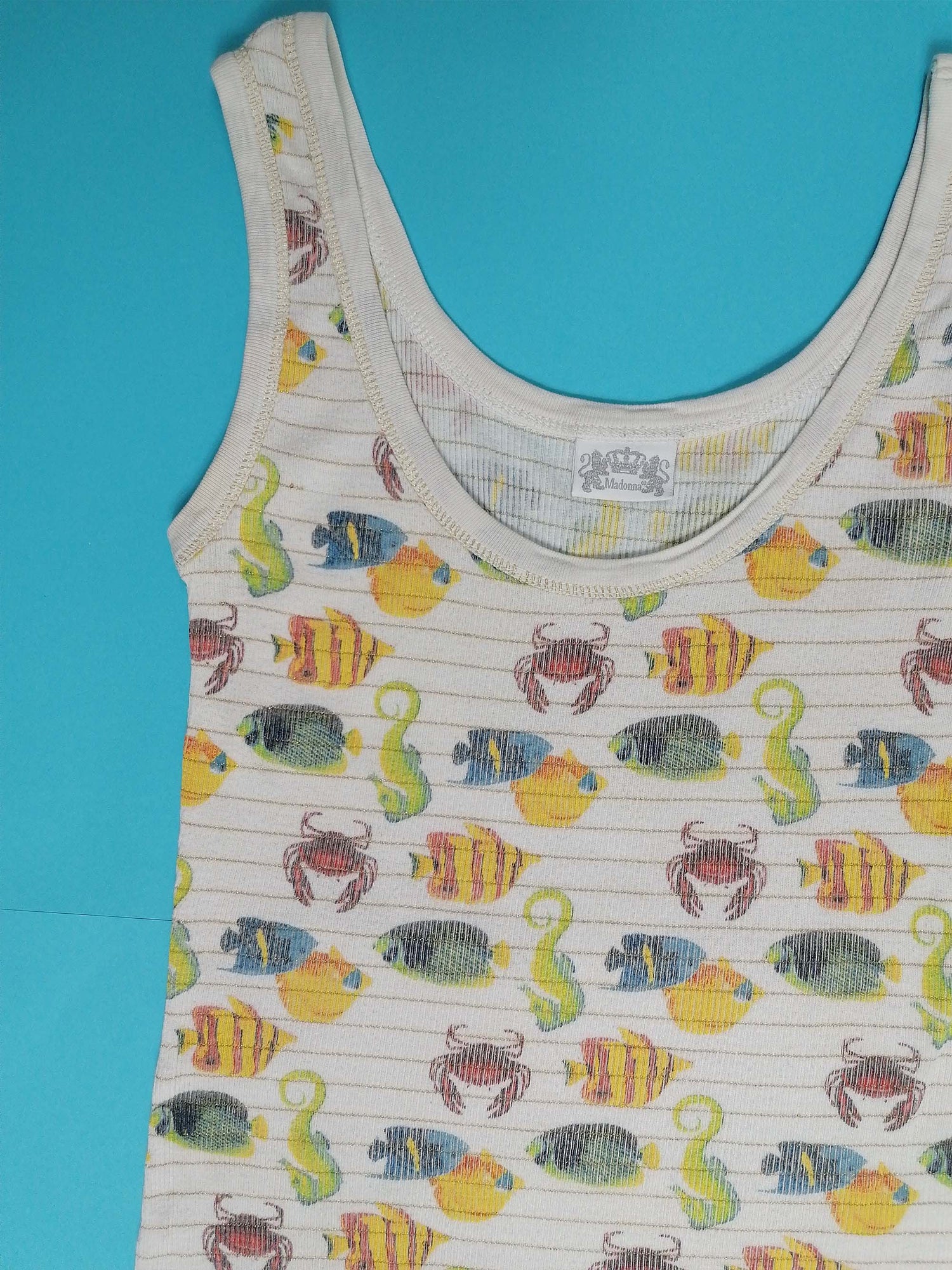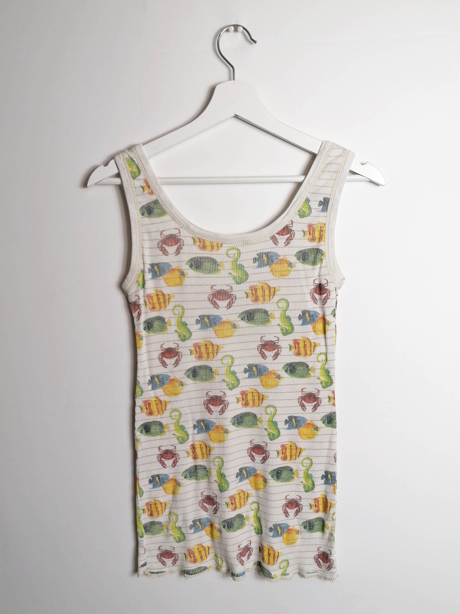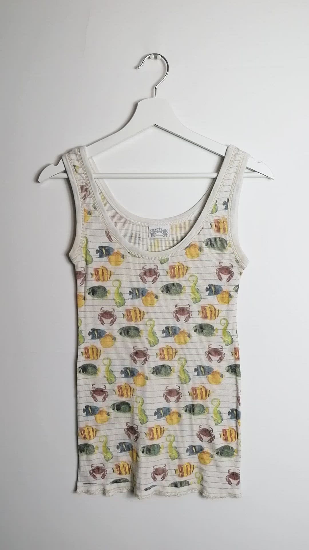 Very cute ribbed cotton tank top, off-white, tropical fish print with gold thread.