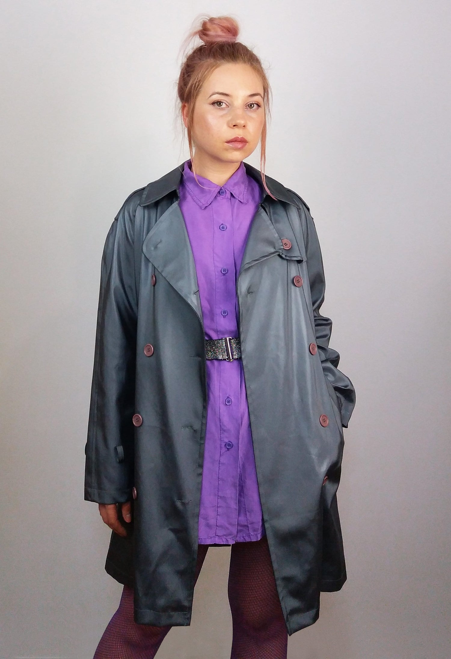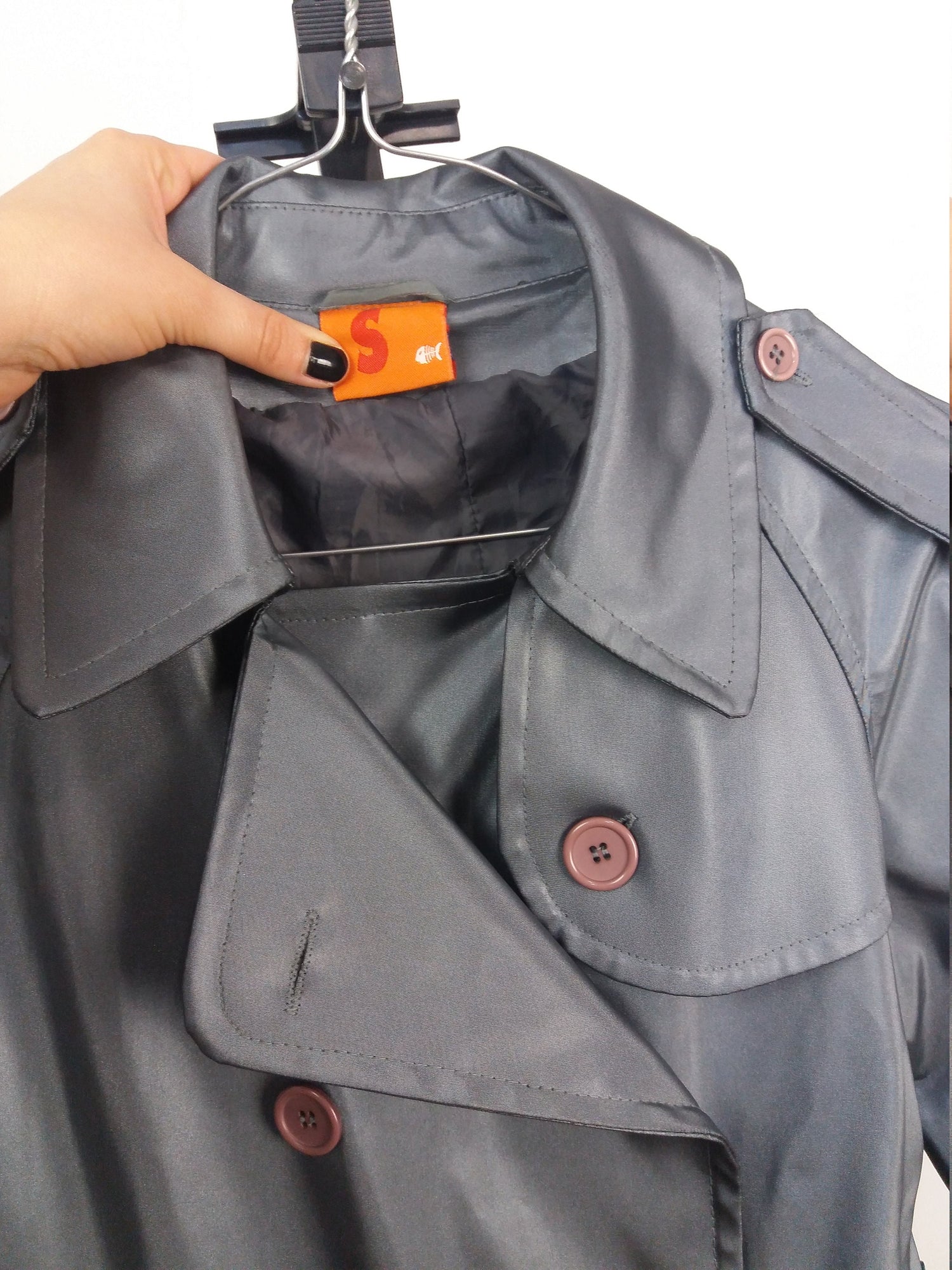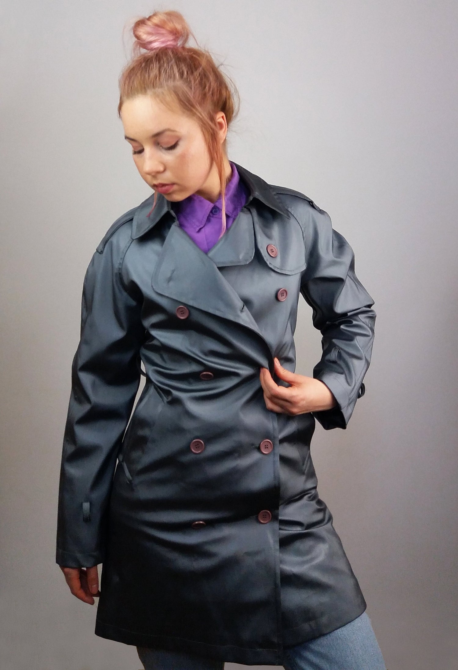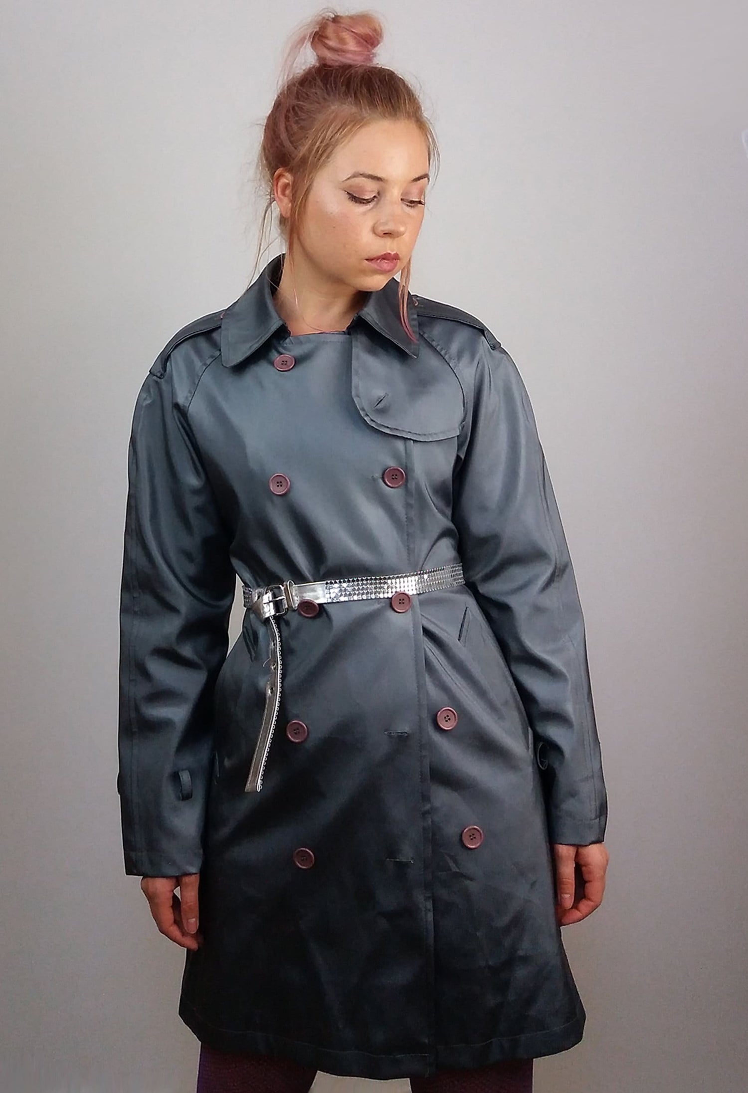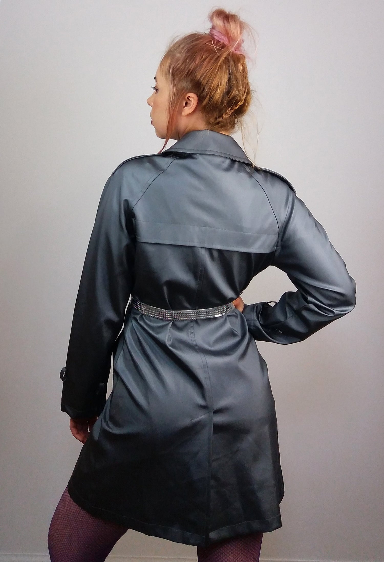 Gorgeous trench-coat, gunpowder-blue shiny texture. Versatile item. Has belt loops, but no belt. Belt pictured is not included.